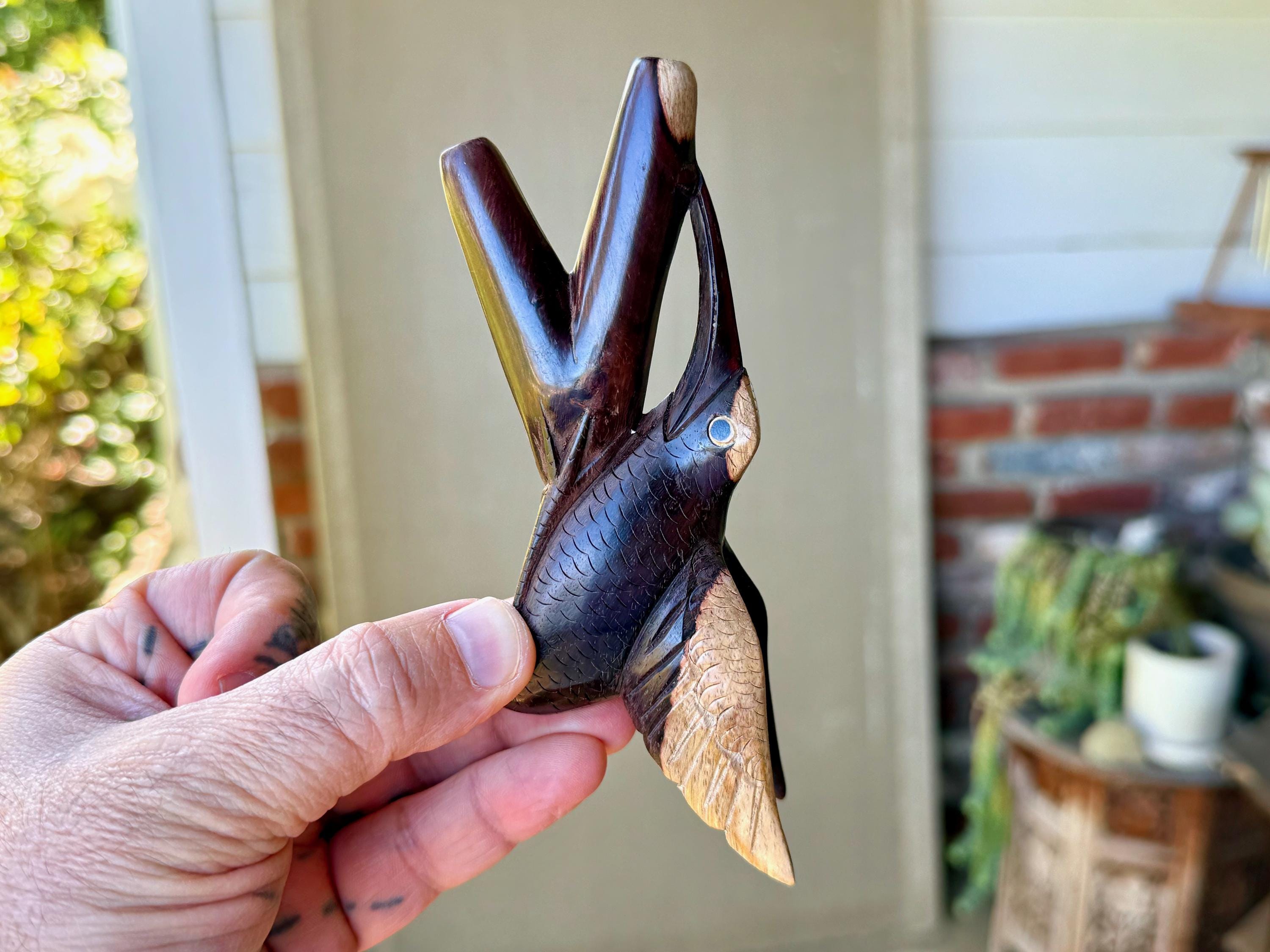 One of our favorite designs, this is an elegant and majestic carving with exquisite detail. Each "feather" is carved by hand! We also love the natural two-tone coloring of this tropical wood, it's gorgeous! A sublime medicine tool!