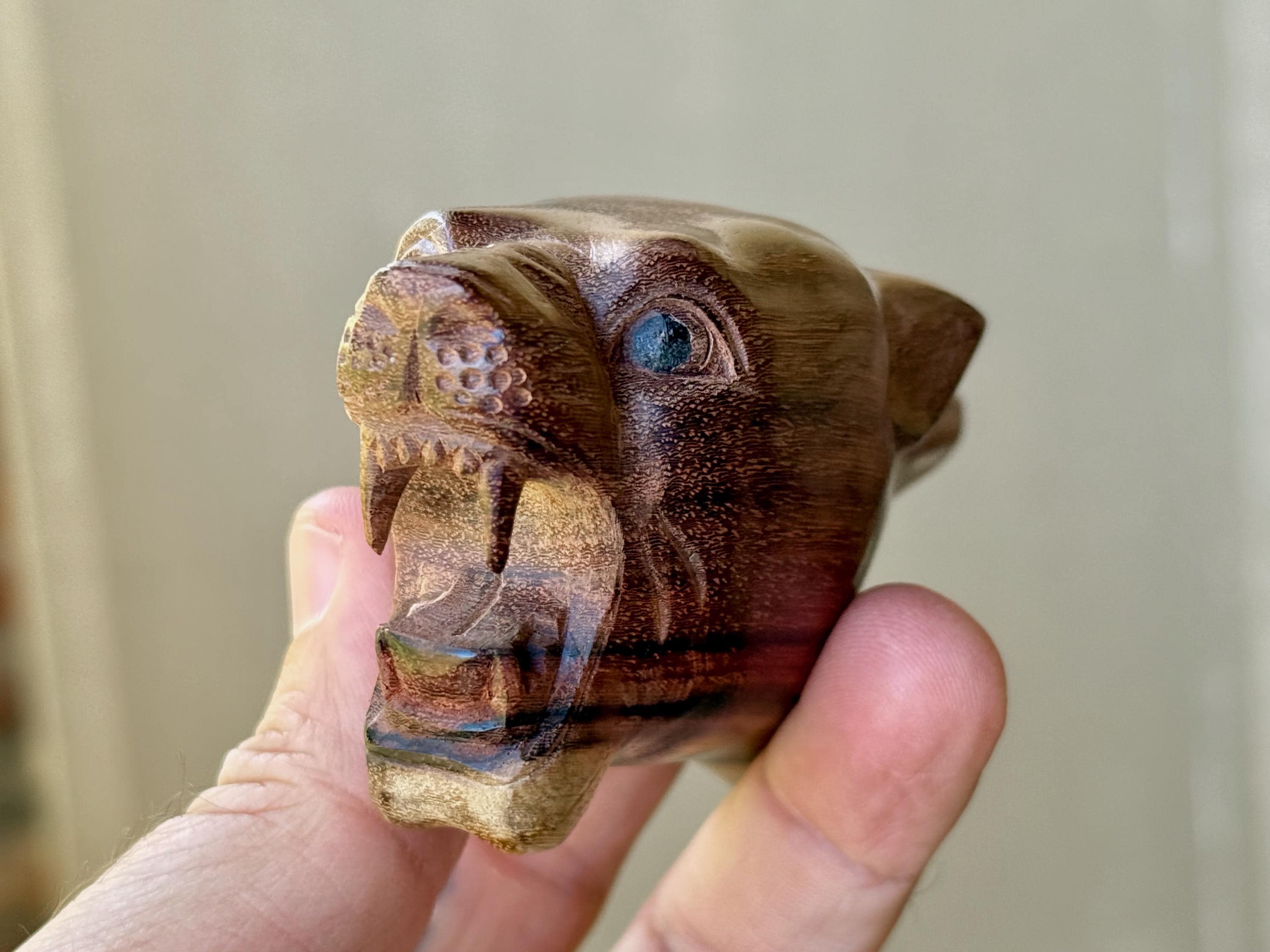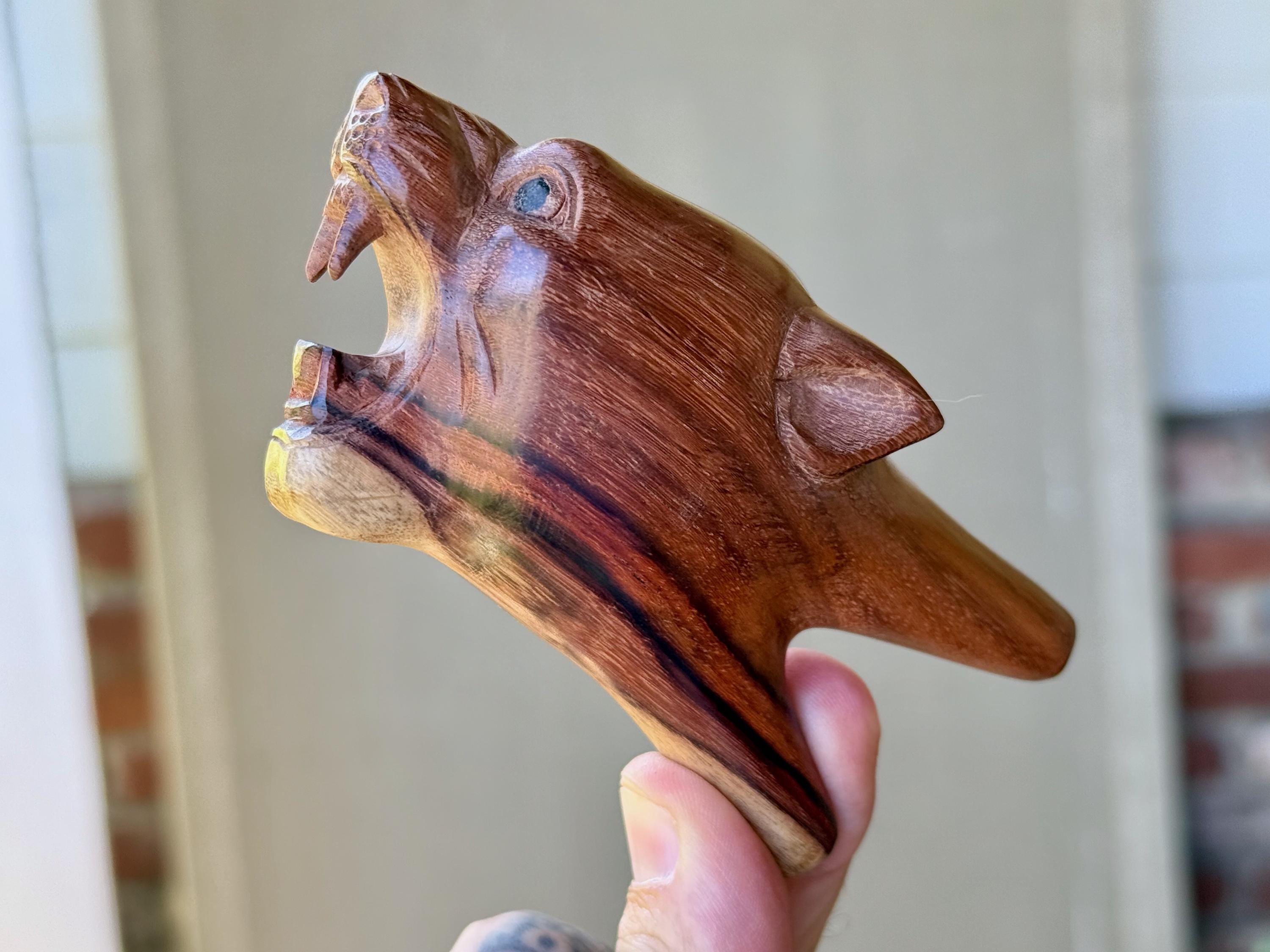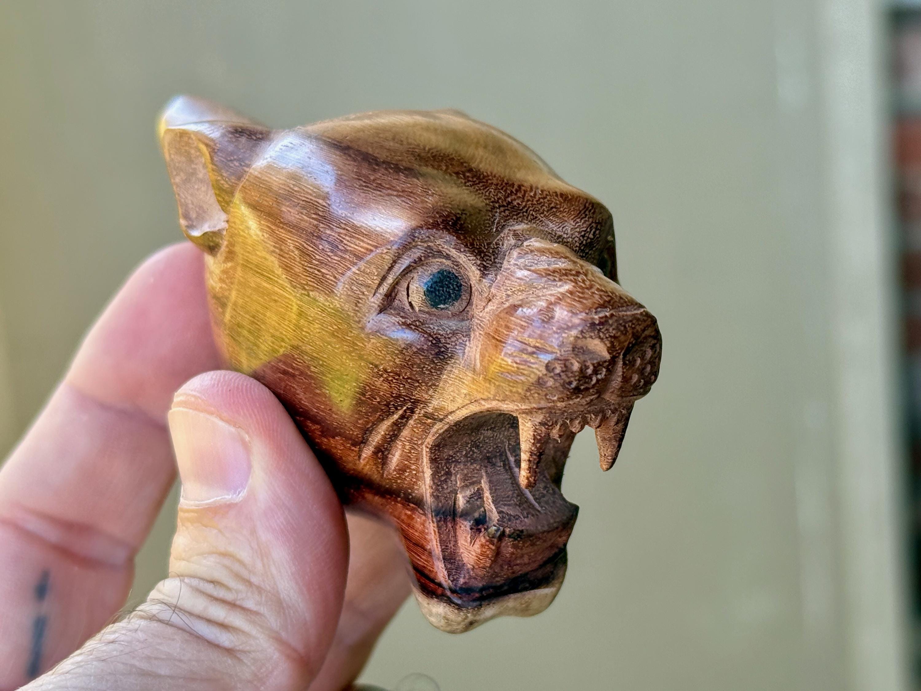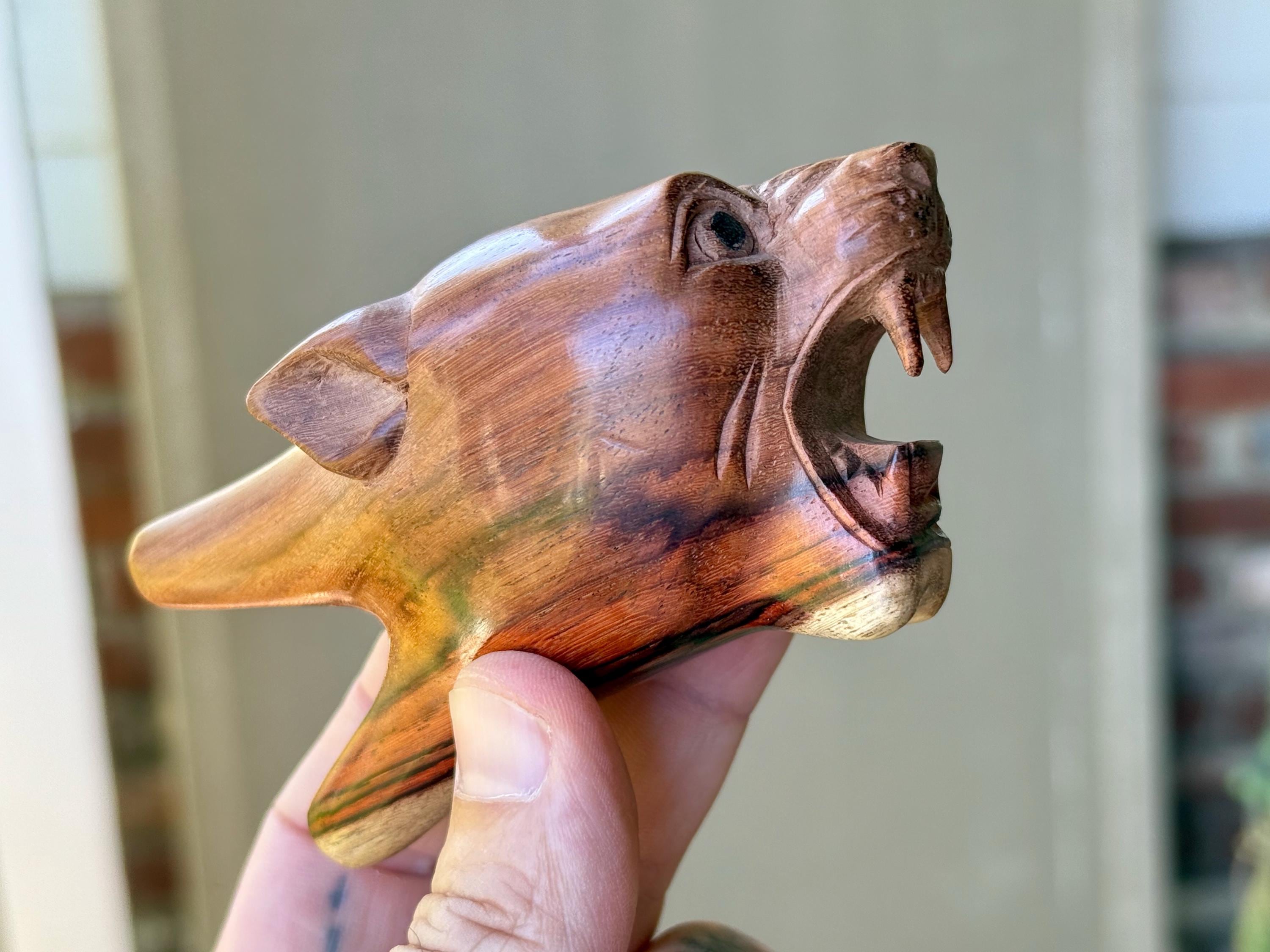 A masterful work of art, this powerful Jaguar (or Panther, Puma...) is beautifully carved from a single block of dark Tropical Hardwood, with some lighter areas on the bottom. Gorgeous grain and natural hue to this wood! A beautifully crafted and powerfully functional work of art.