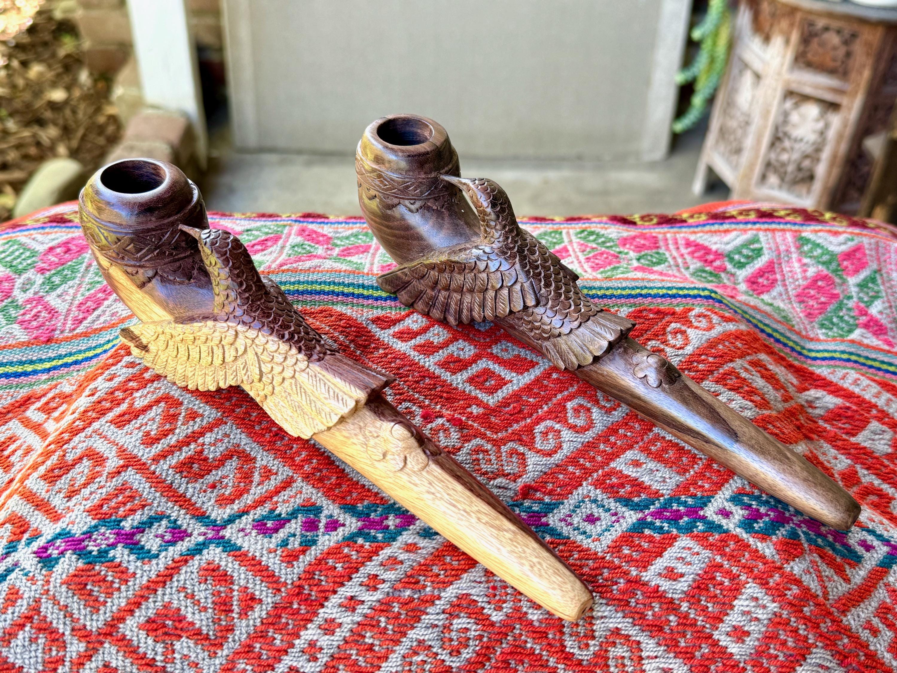 Our most beloved animal ally, the Hummingbird is depicted here with wings outstretched, perched atop these handsome tobacco pipes. The level of craftsmanship is impressive, with such attention to detail (each feather is hand carved!). Beautiful and powerful tools for shamanic ceremony.