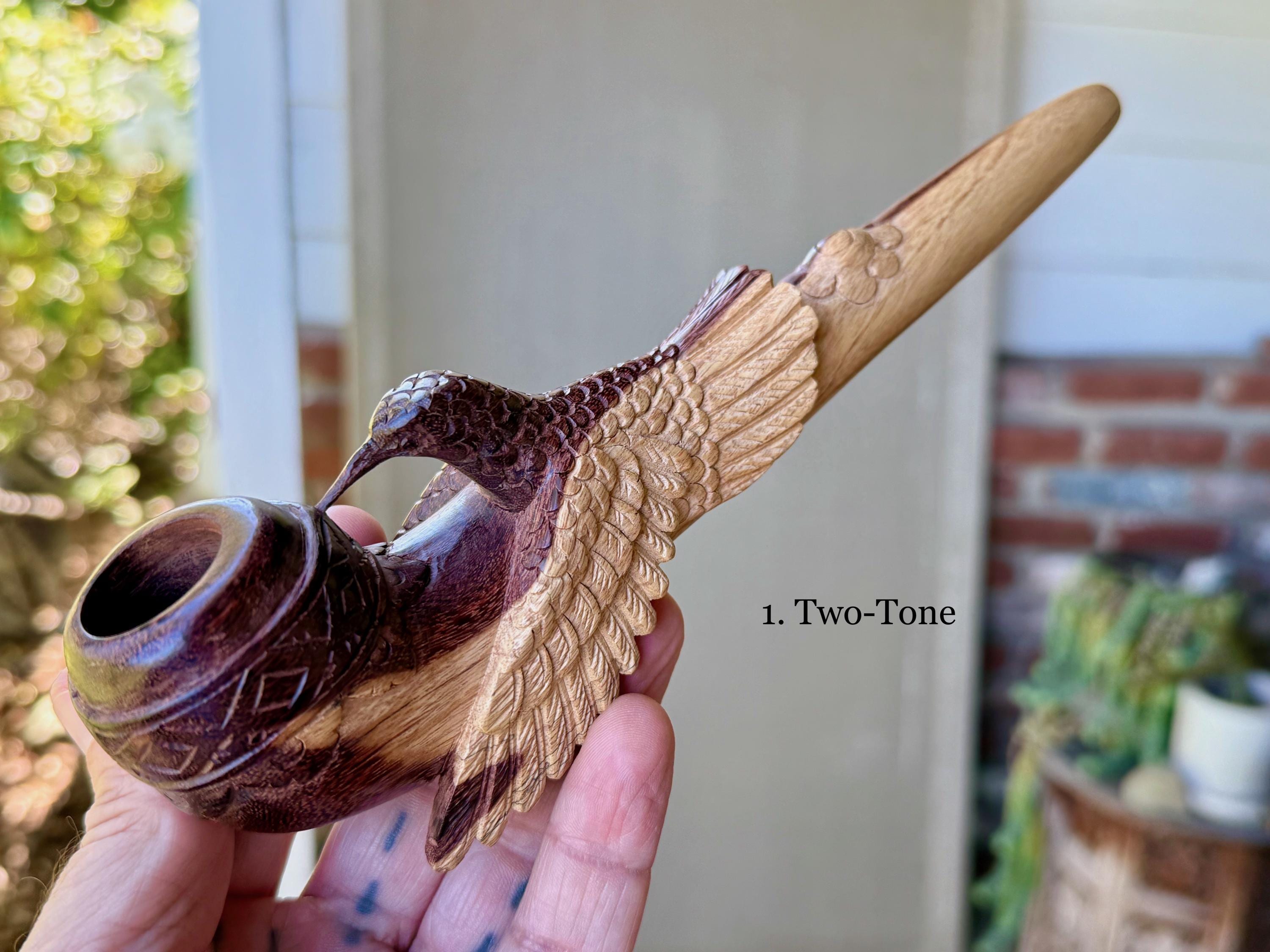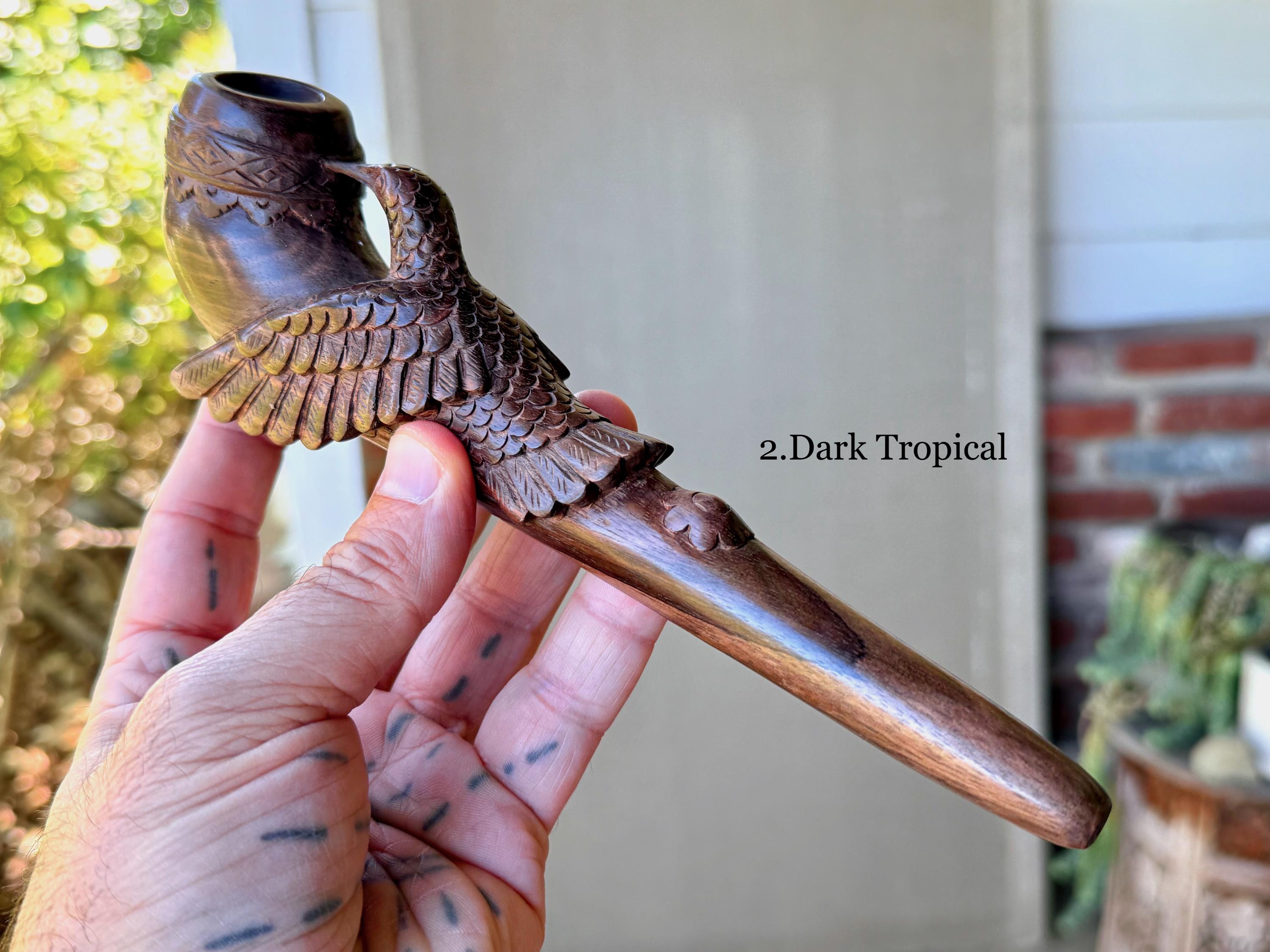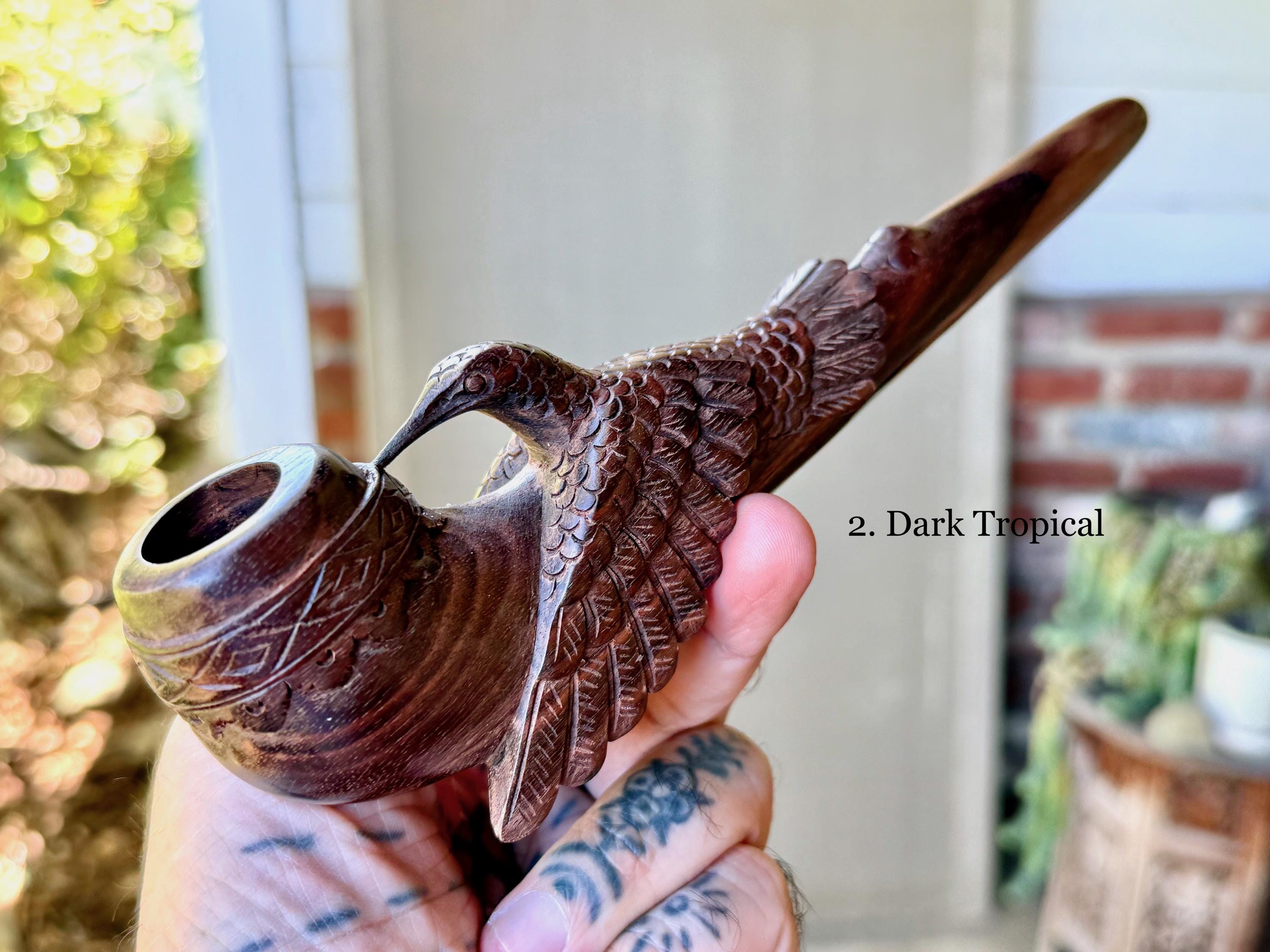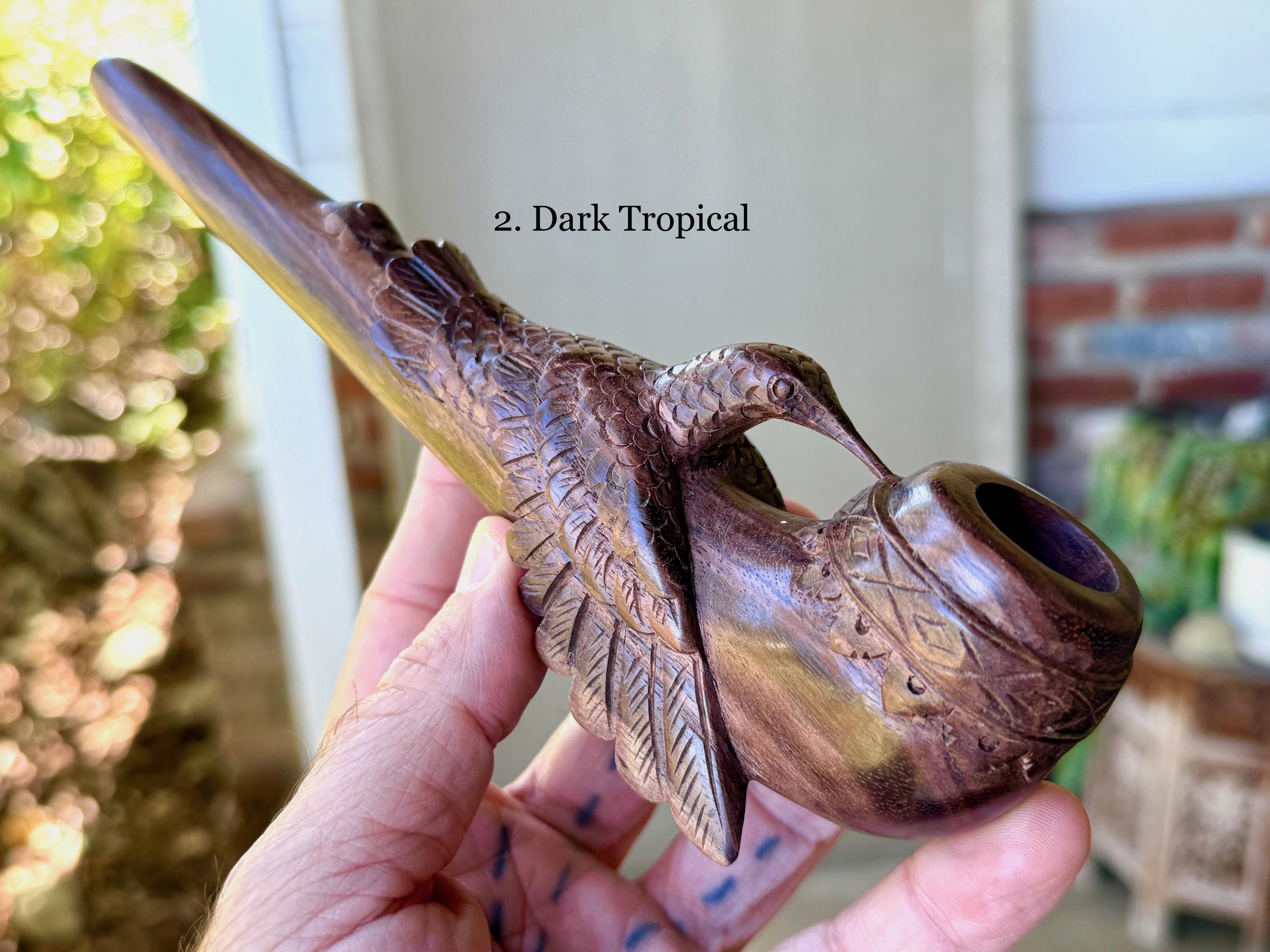 These glorious Hummingbird Pipes for tobacco and mapacho were hand carved from natural tropical hardwoods. These pipes are intended for use in shamanic healing ceremonies or for other energy healing applications. Each selection is numbered, simply select your preference from the dropdown menu.