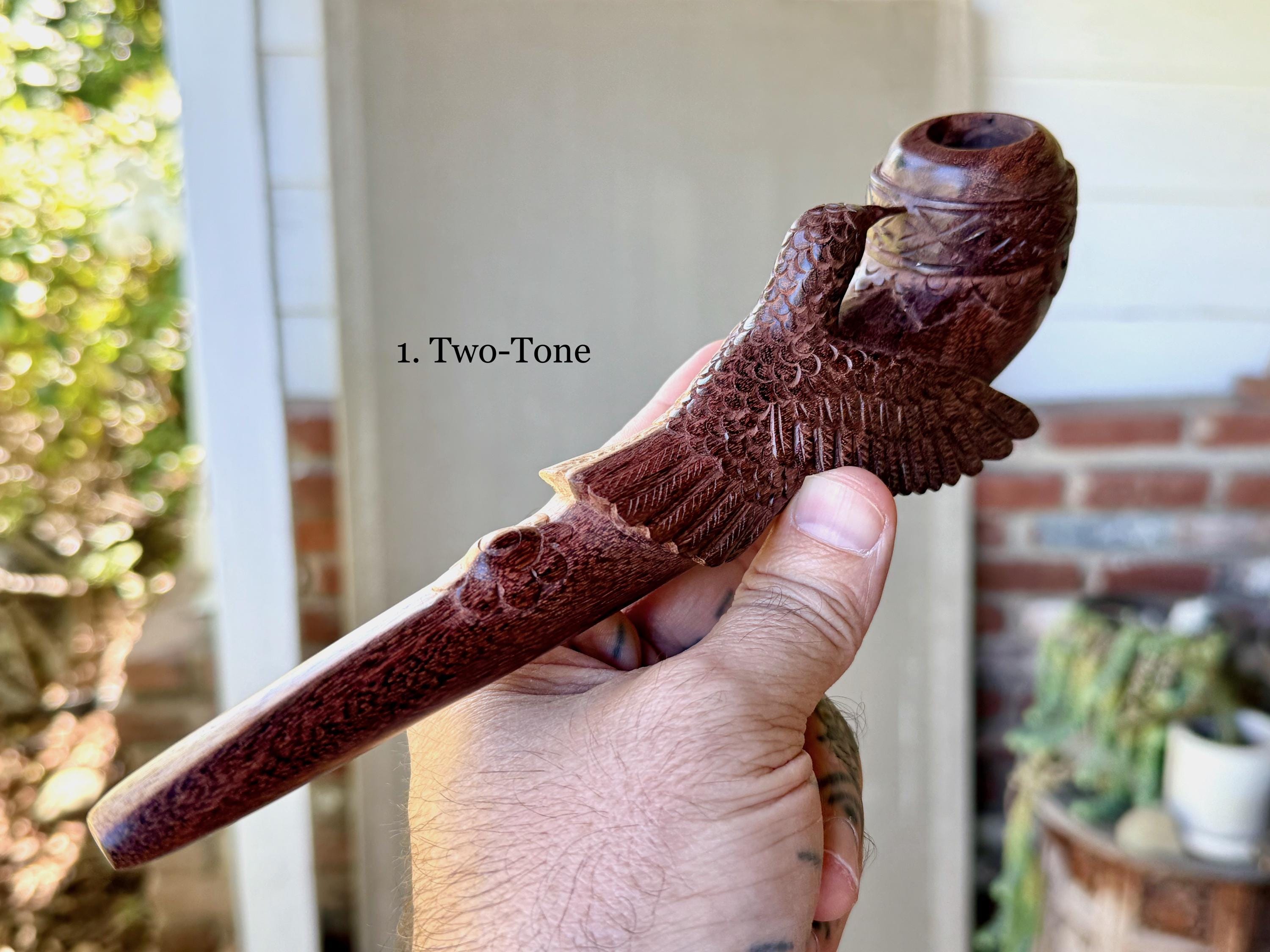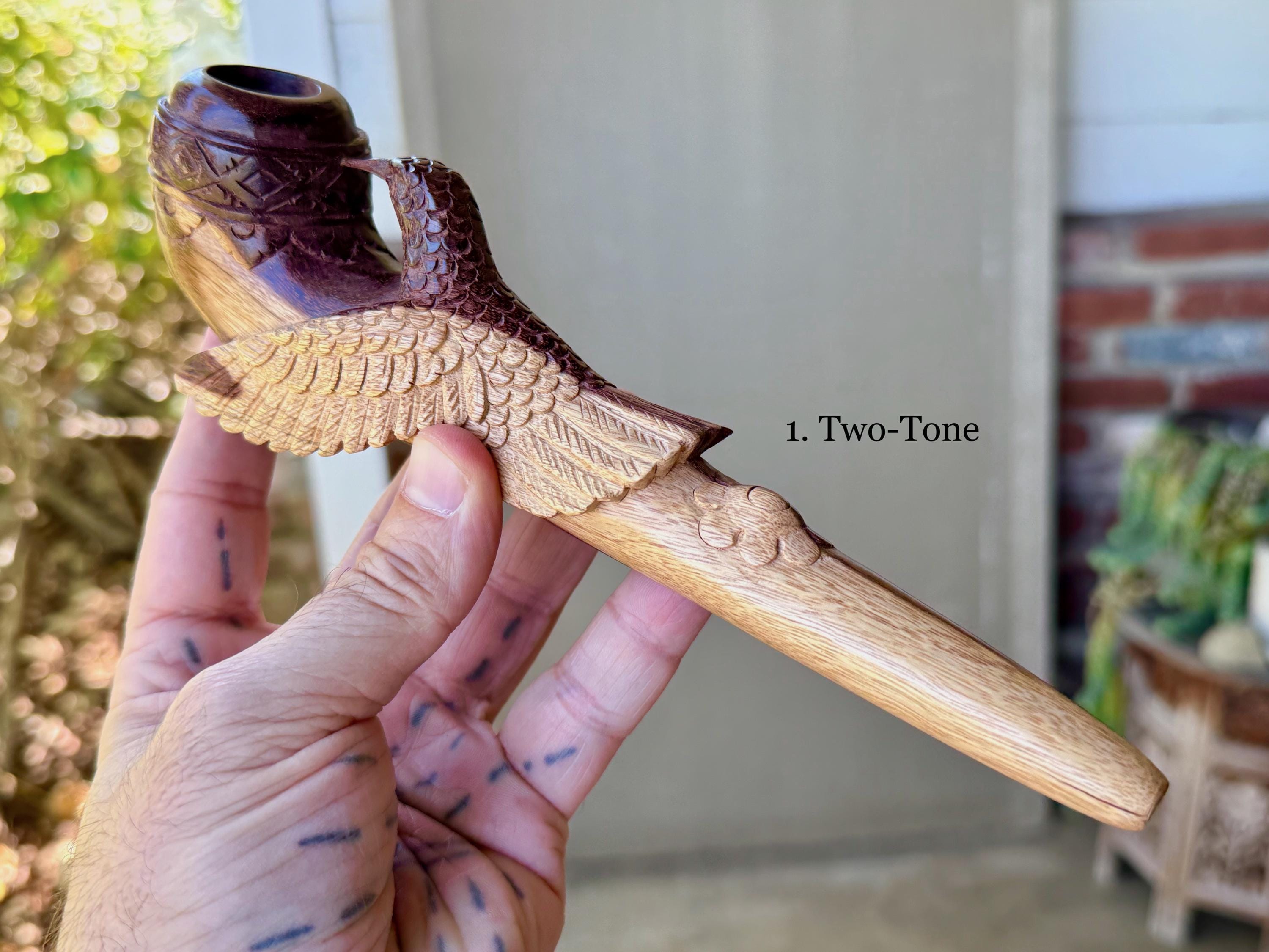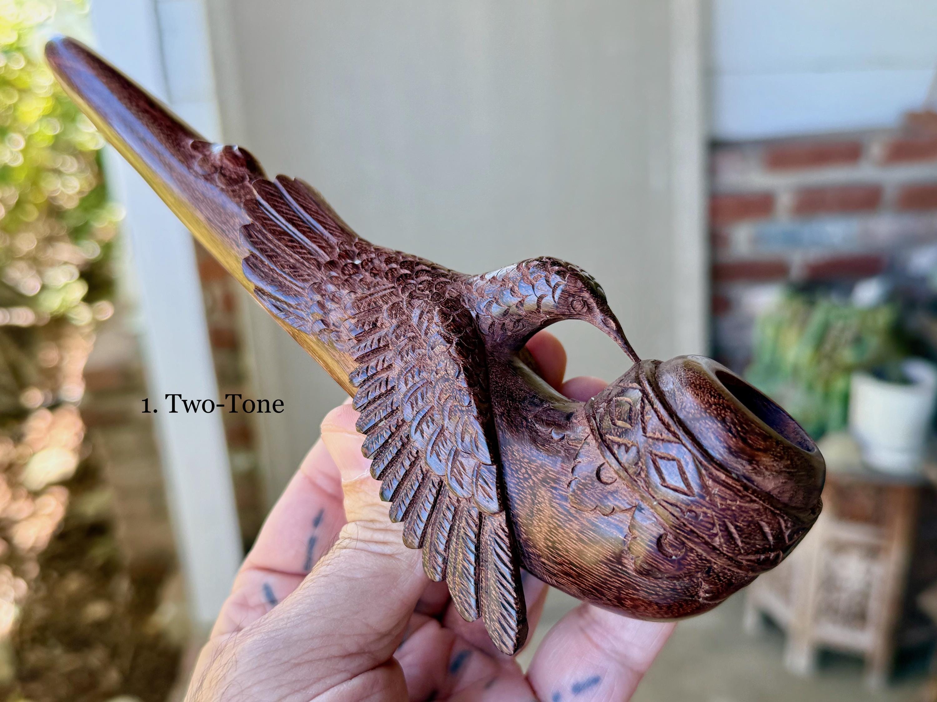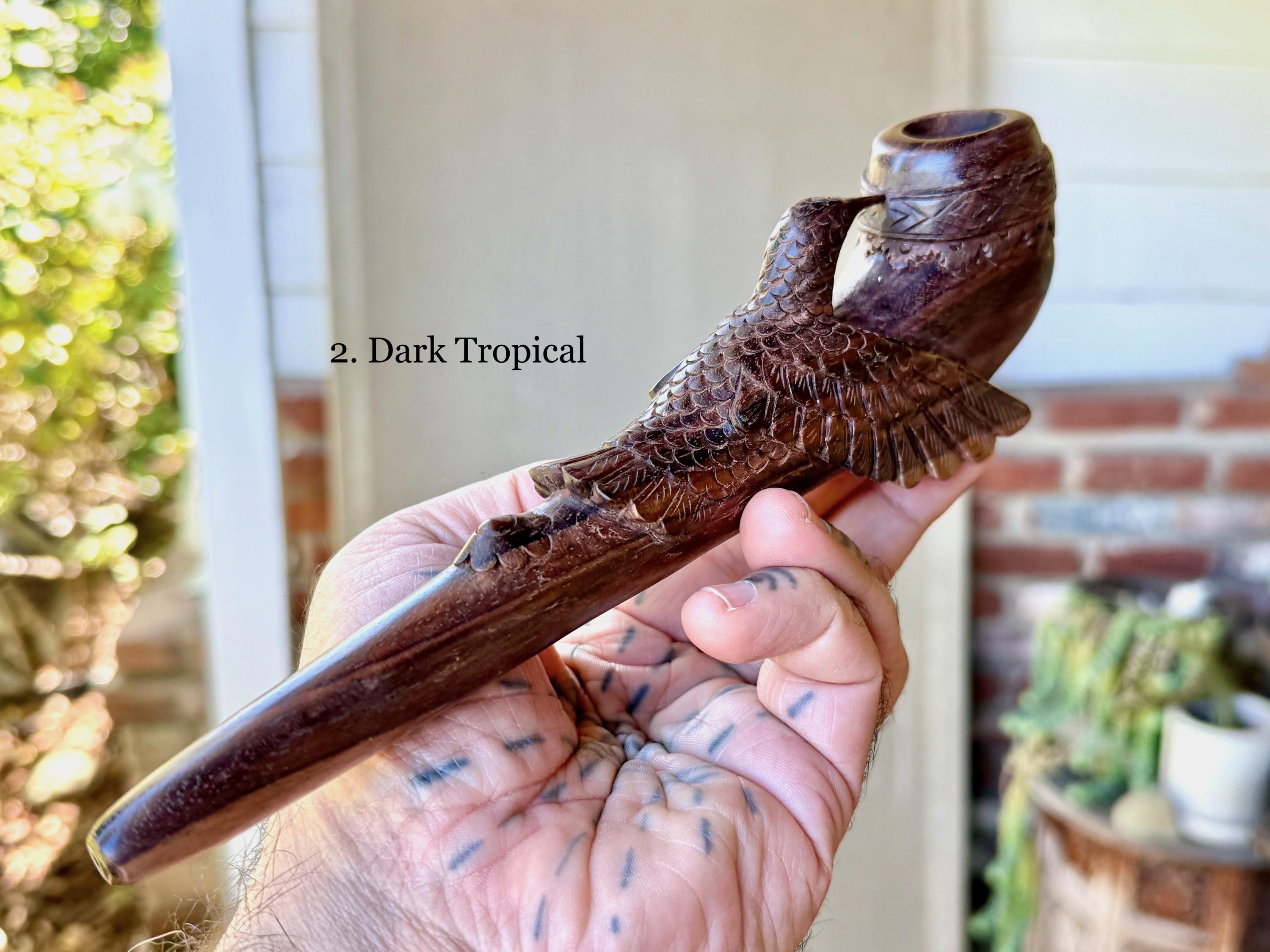 These glorious Hummingbird Pipes for tobacco and mapacho were hand carved from natural tropical hardwoods. These pipes are intended for use in shamanic healing ceremonies or for other energy healing applications. Each selection is numbered, simply select your preference from the dropdown menu.