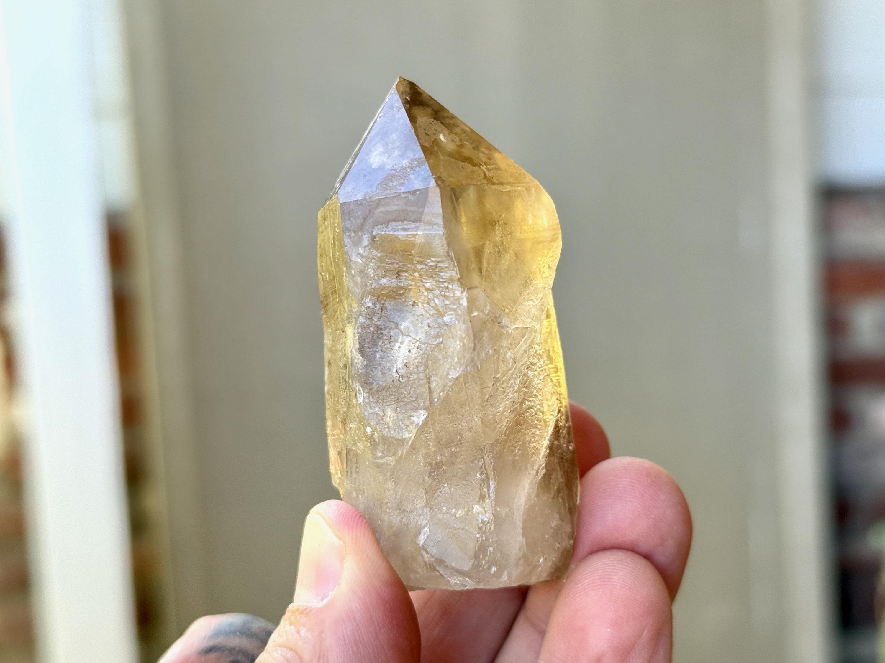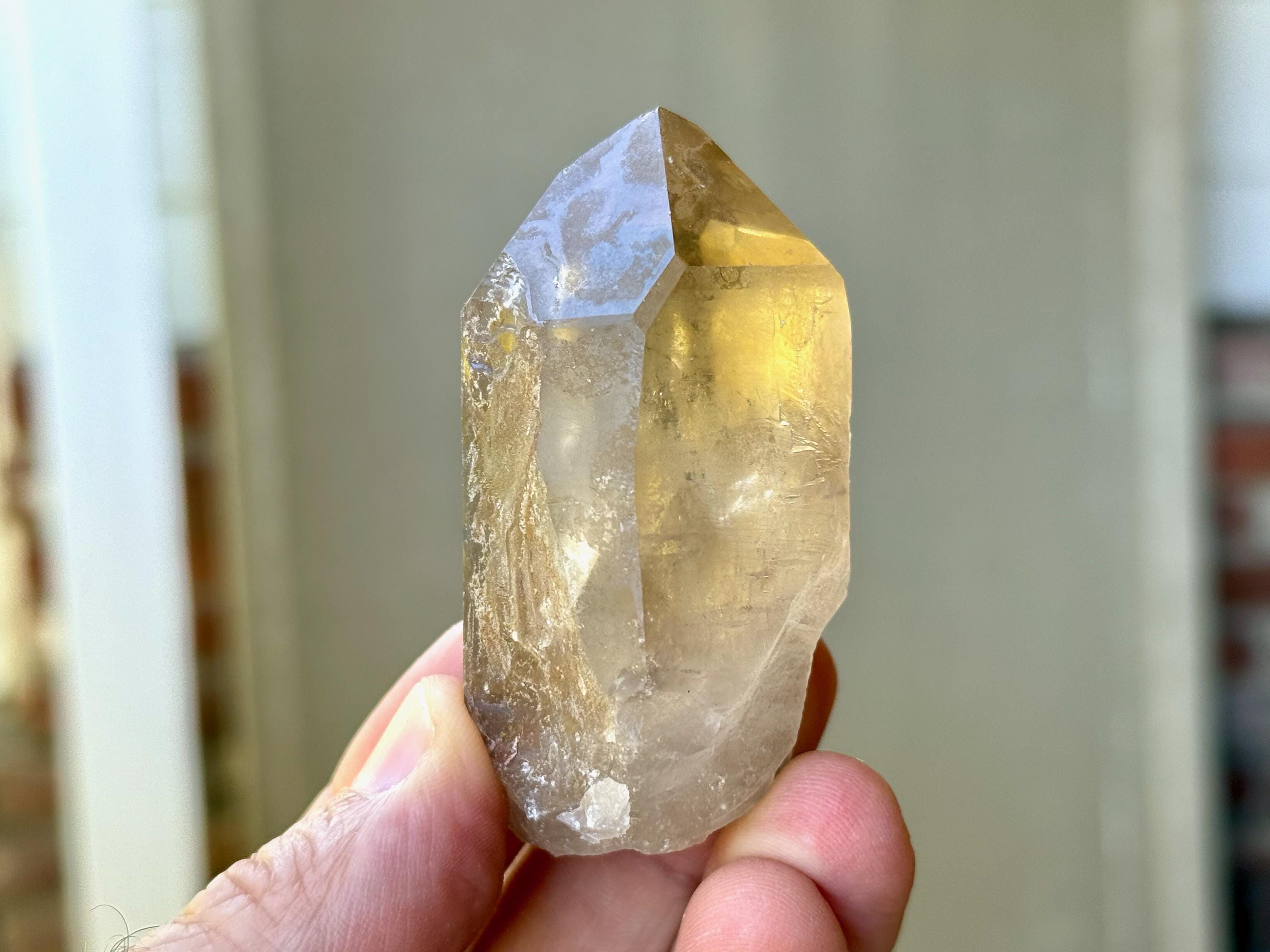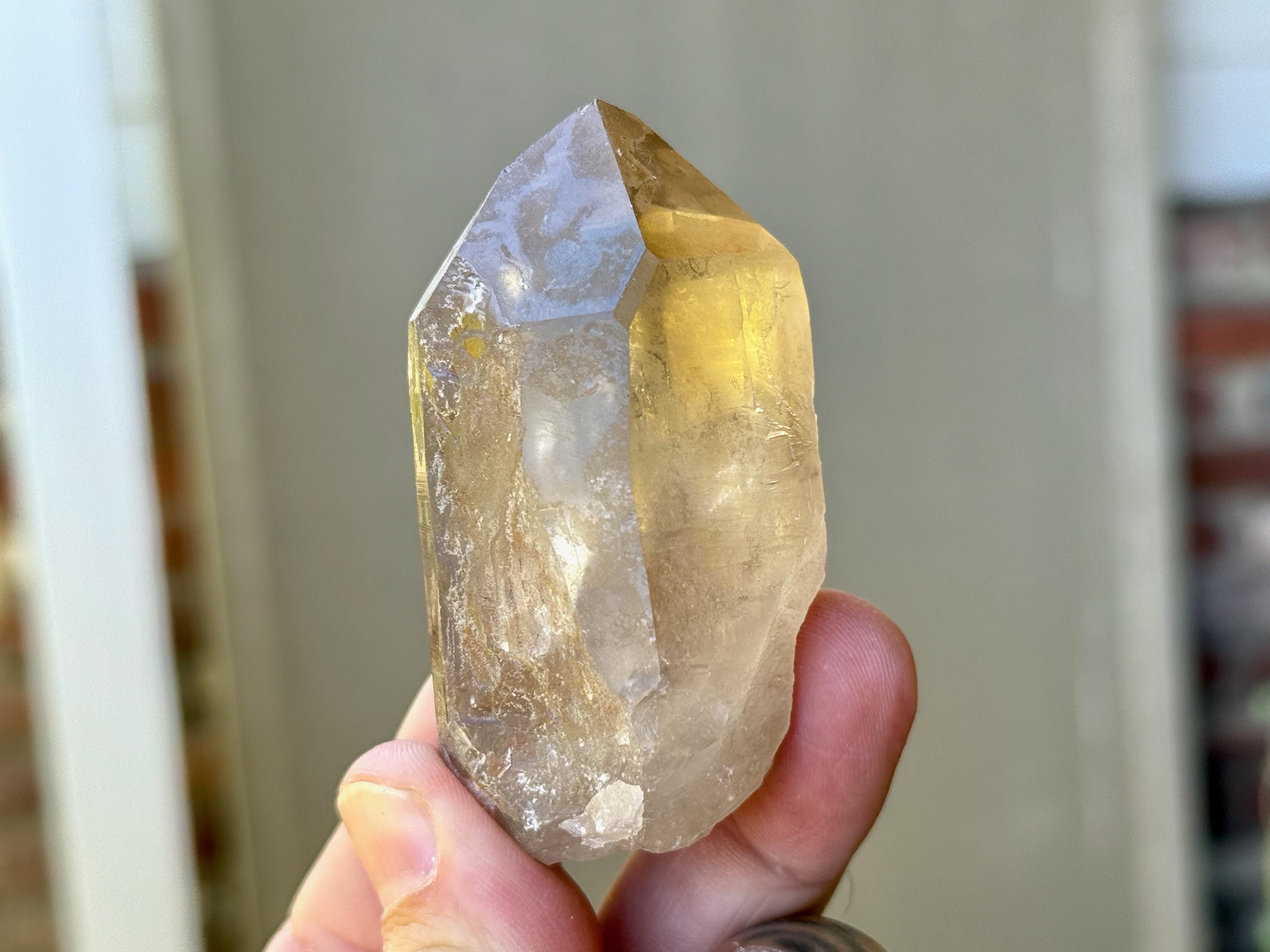 Brilliant luster and a vibrant golden hue with mildly smokiness to this beautiful, natural Citrine from Aracuai! This crystal possesses wonderful clarity and a traditional "point" formation.