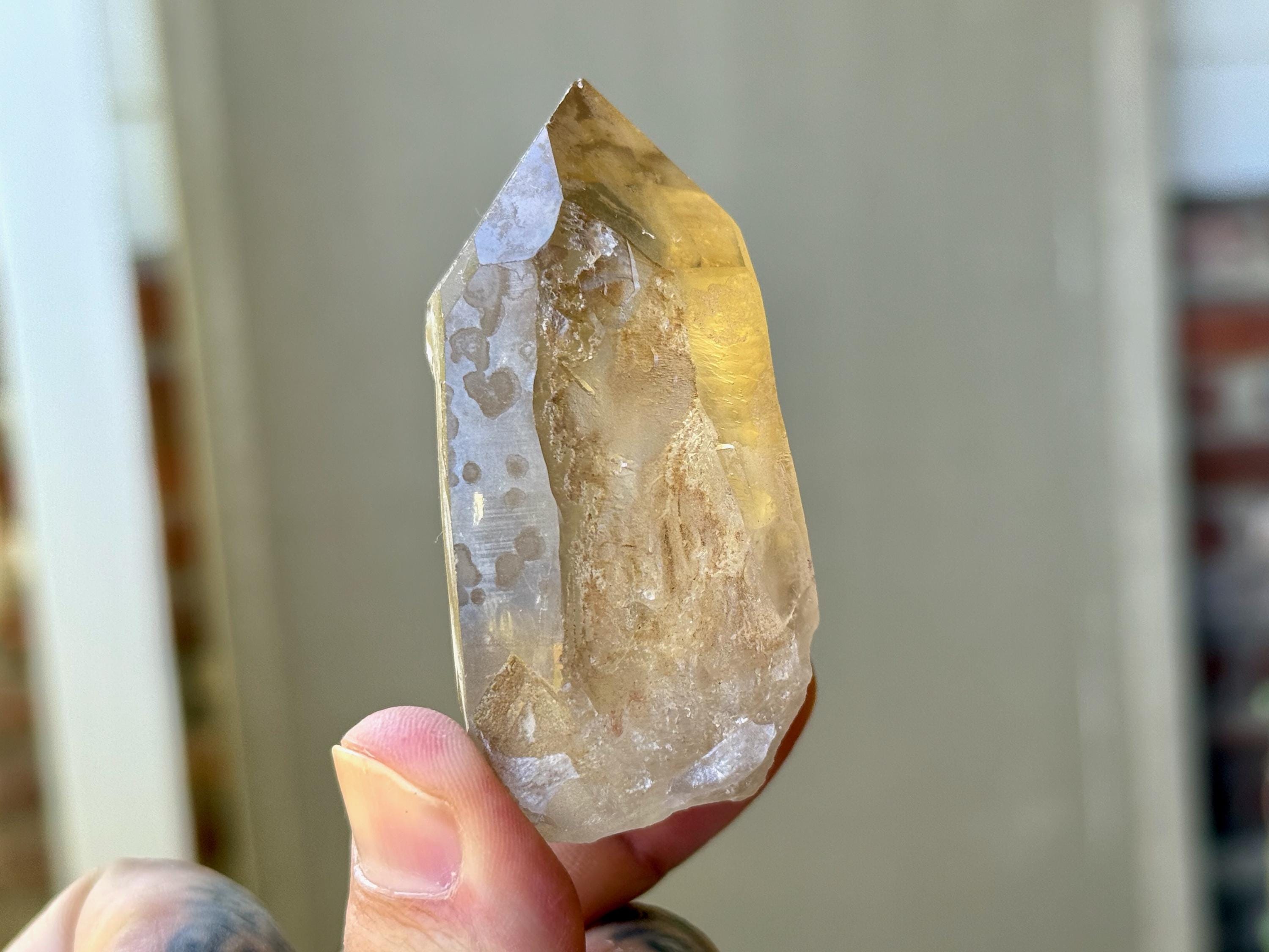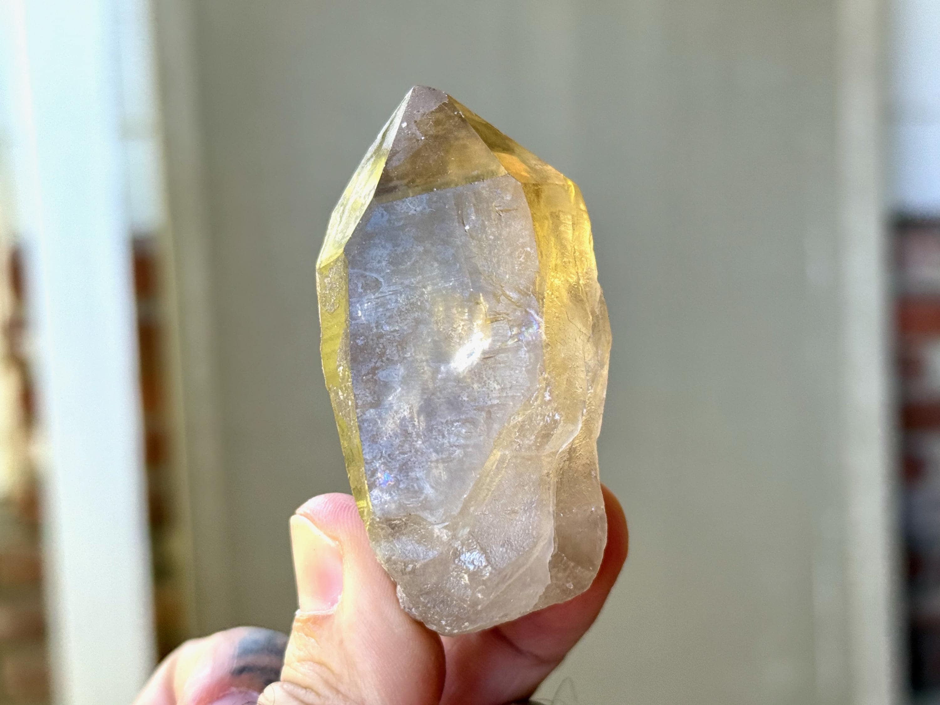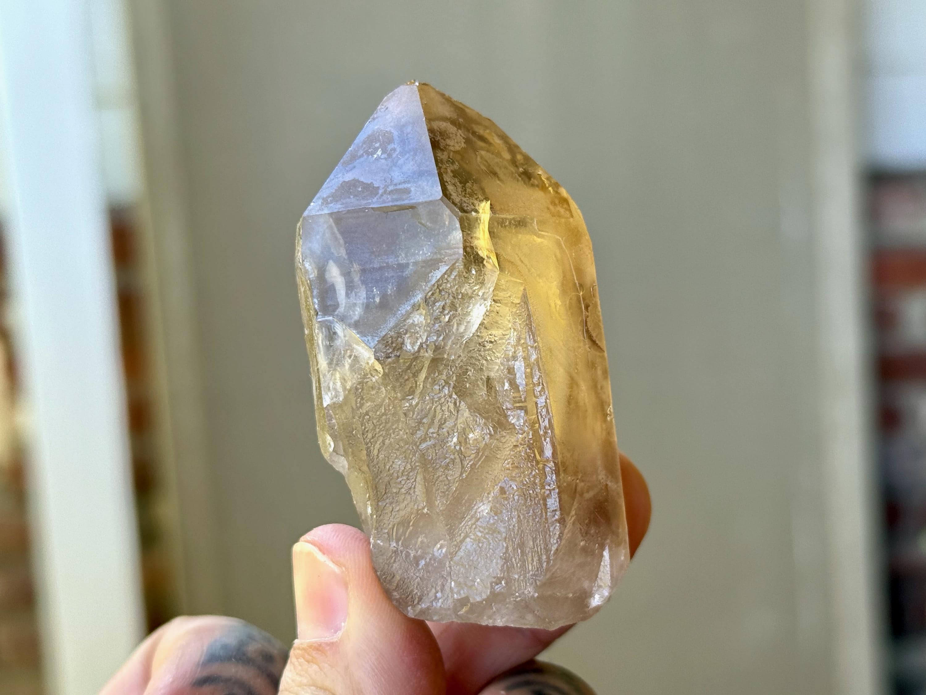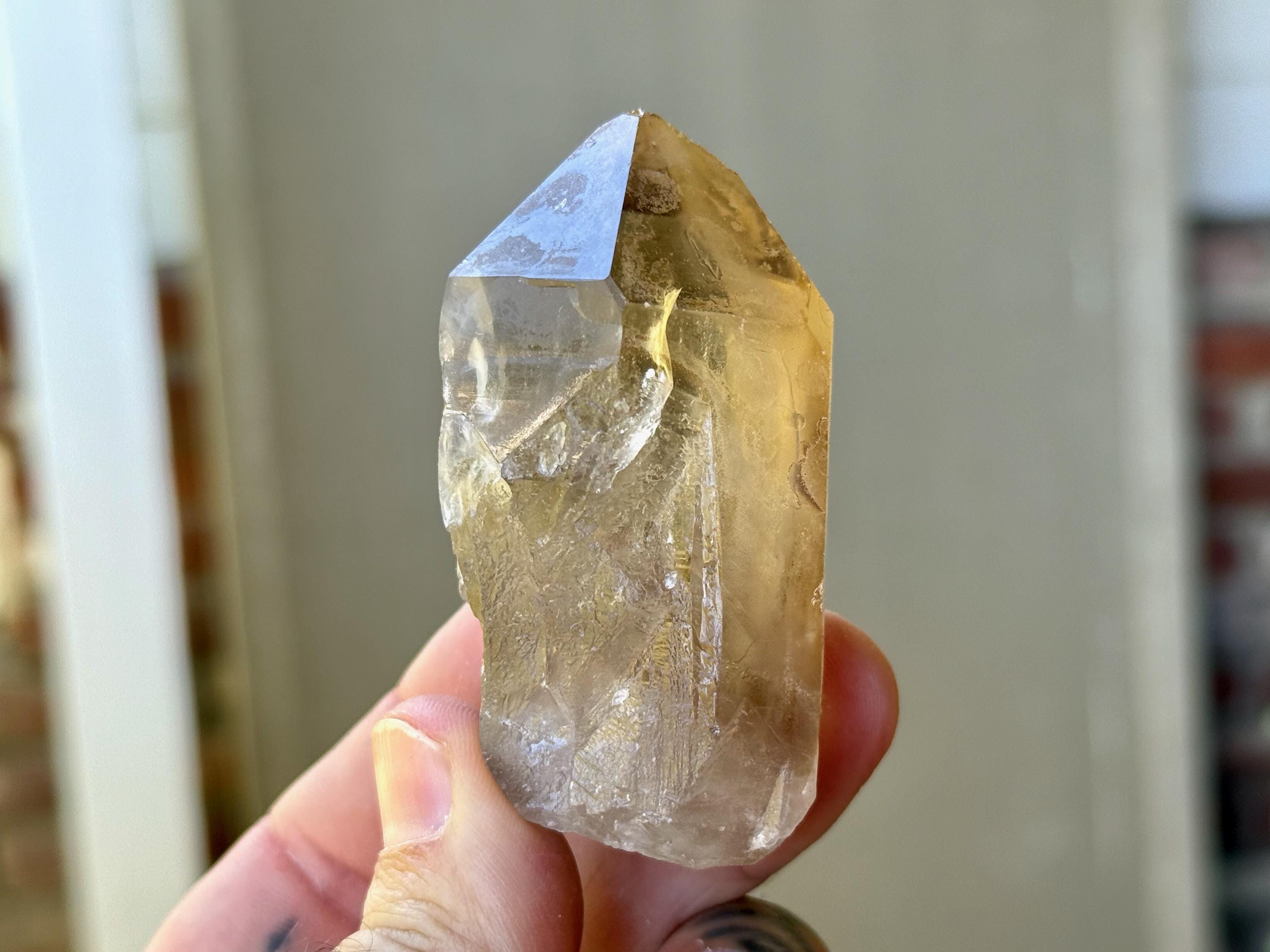 Brilliant luster and a vibrant golden hue with mildly smokiness to this beautiful, natural Citrine from Aracuai! This crystal possesses wonderful clarity and a traditional "point" formation.