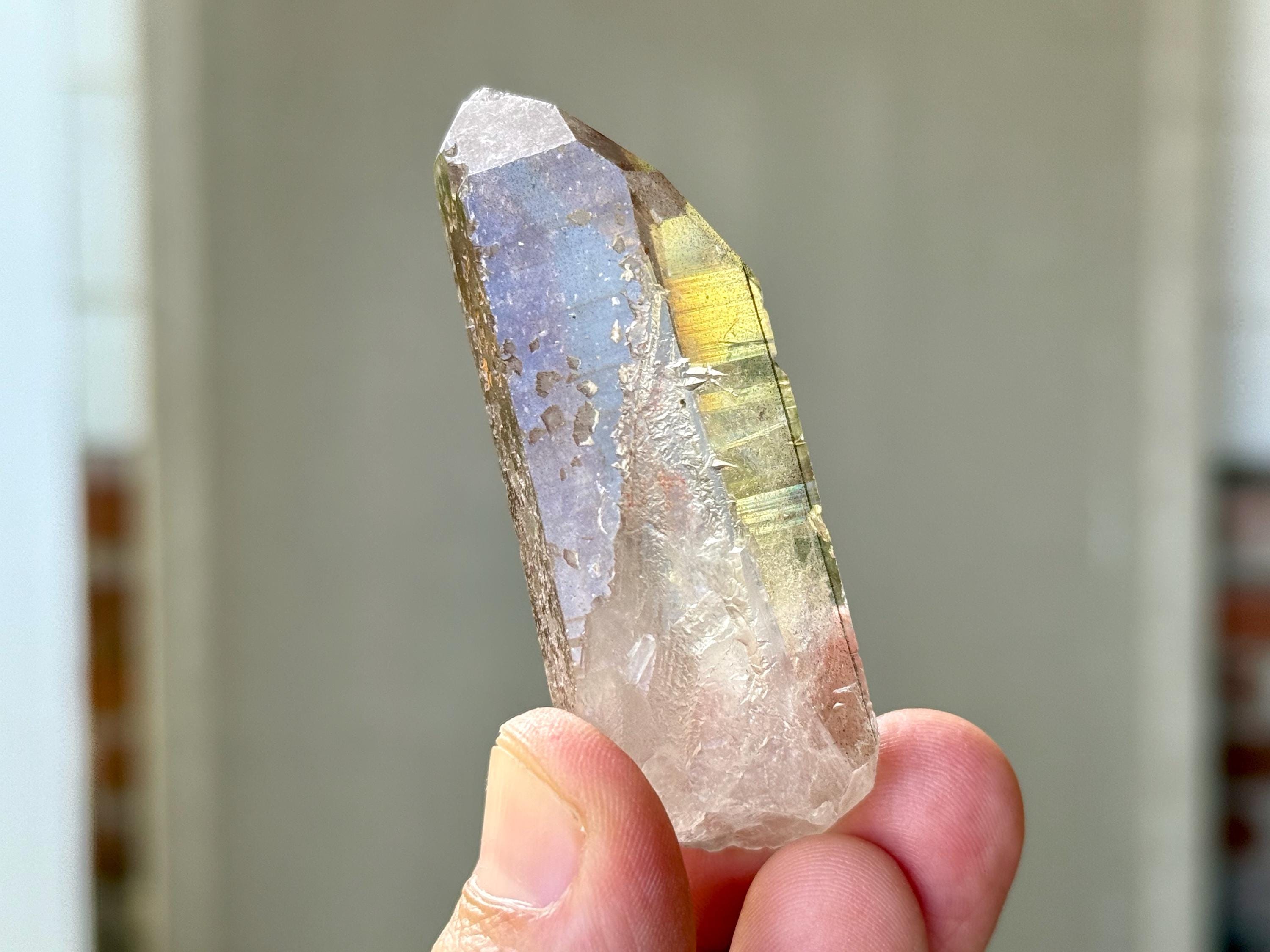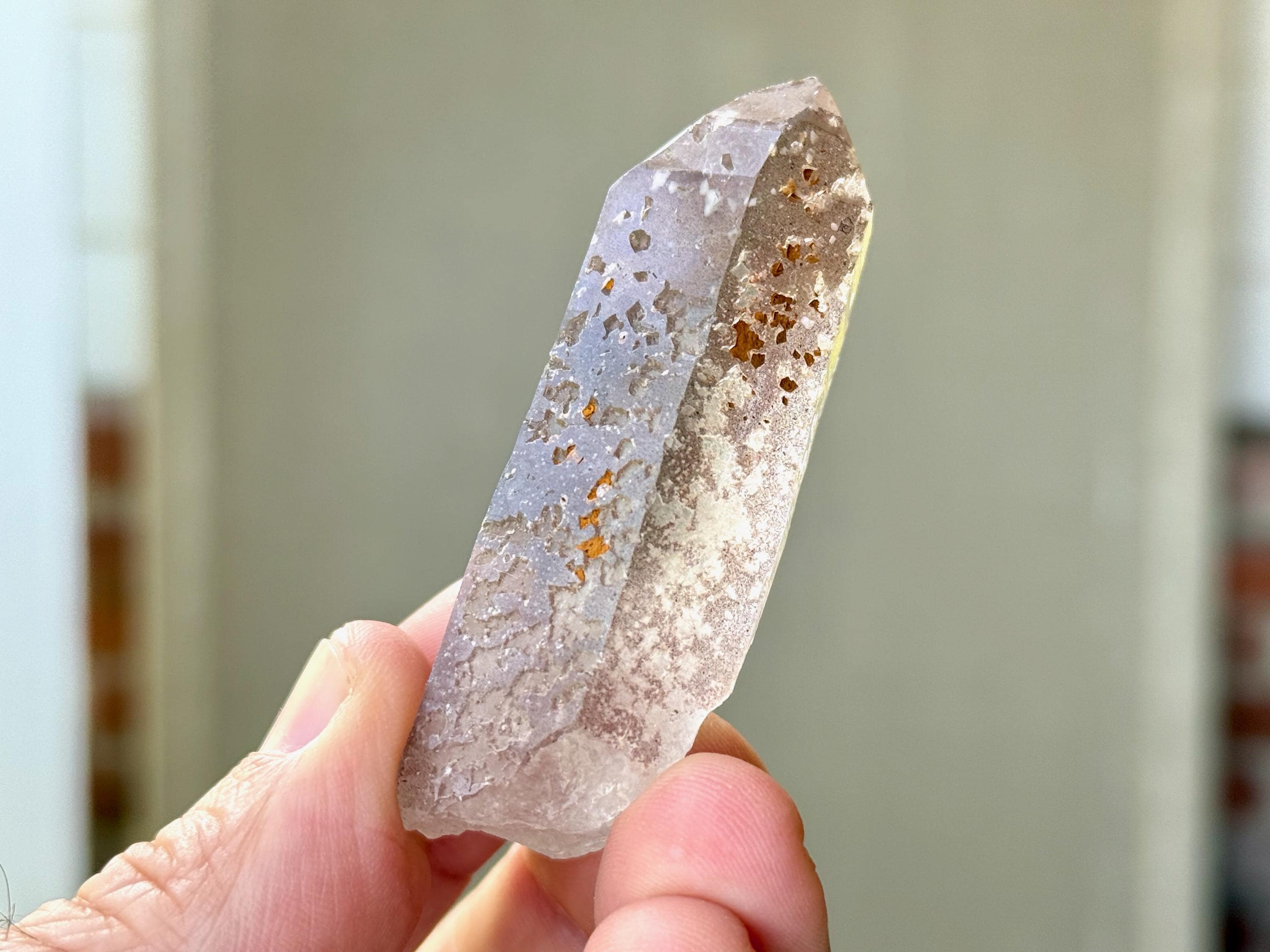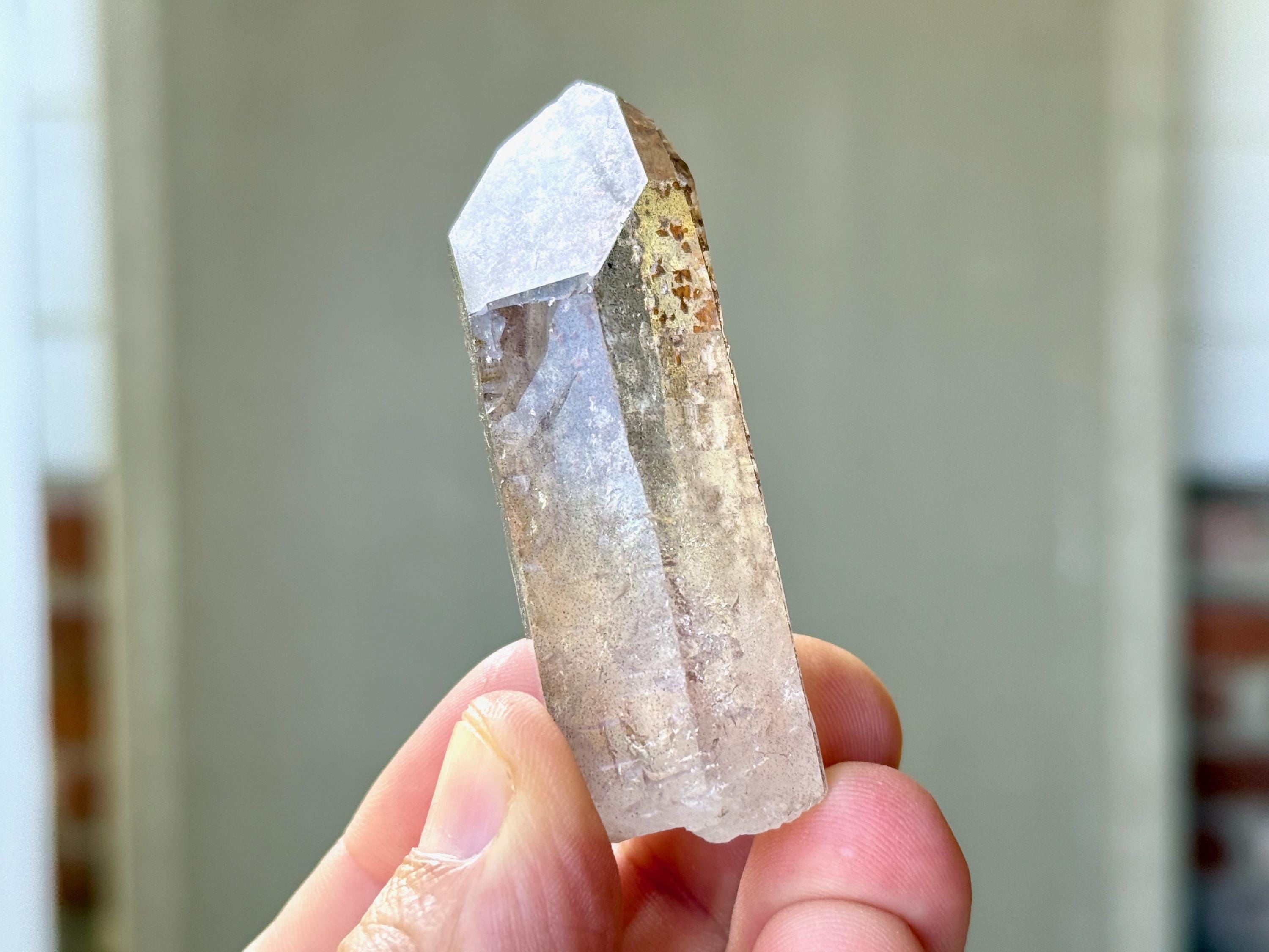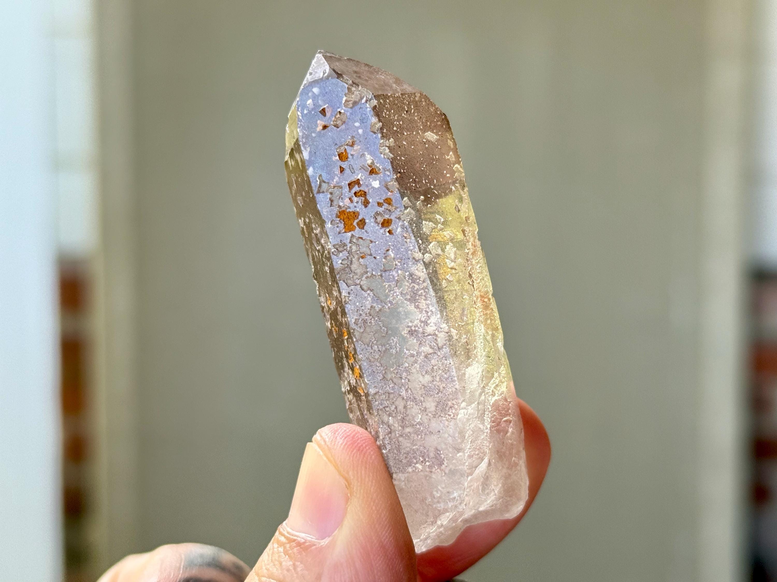 Water-clear clarity and glassy luster to this Hematite Quartz crystal with mild, dark red inclusions of Hematite on the backside. We love the pockmarks on the back, which show where more mineral inclusions had once been included and since dissolved. Excellent termination and outstanding quality to this one!
