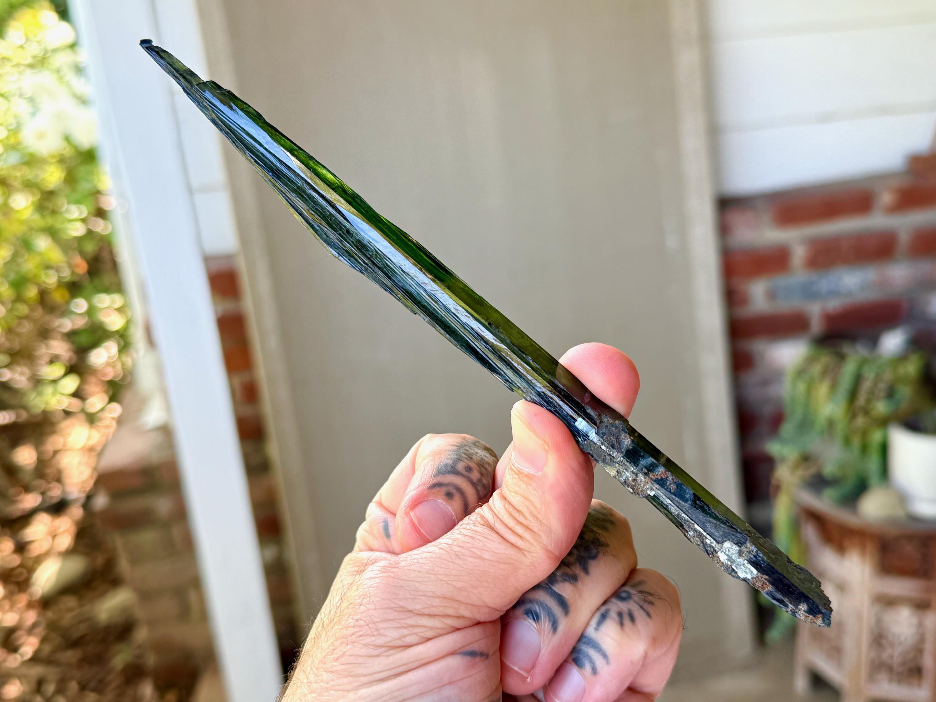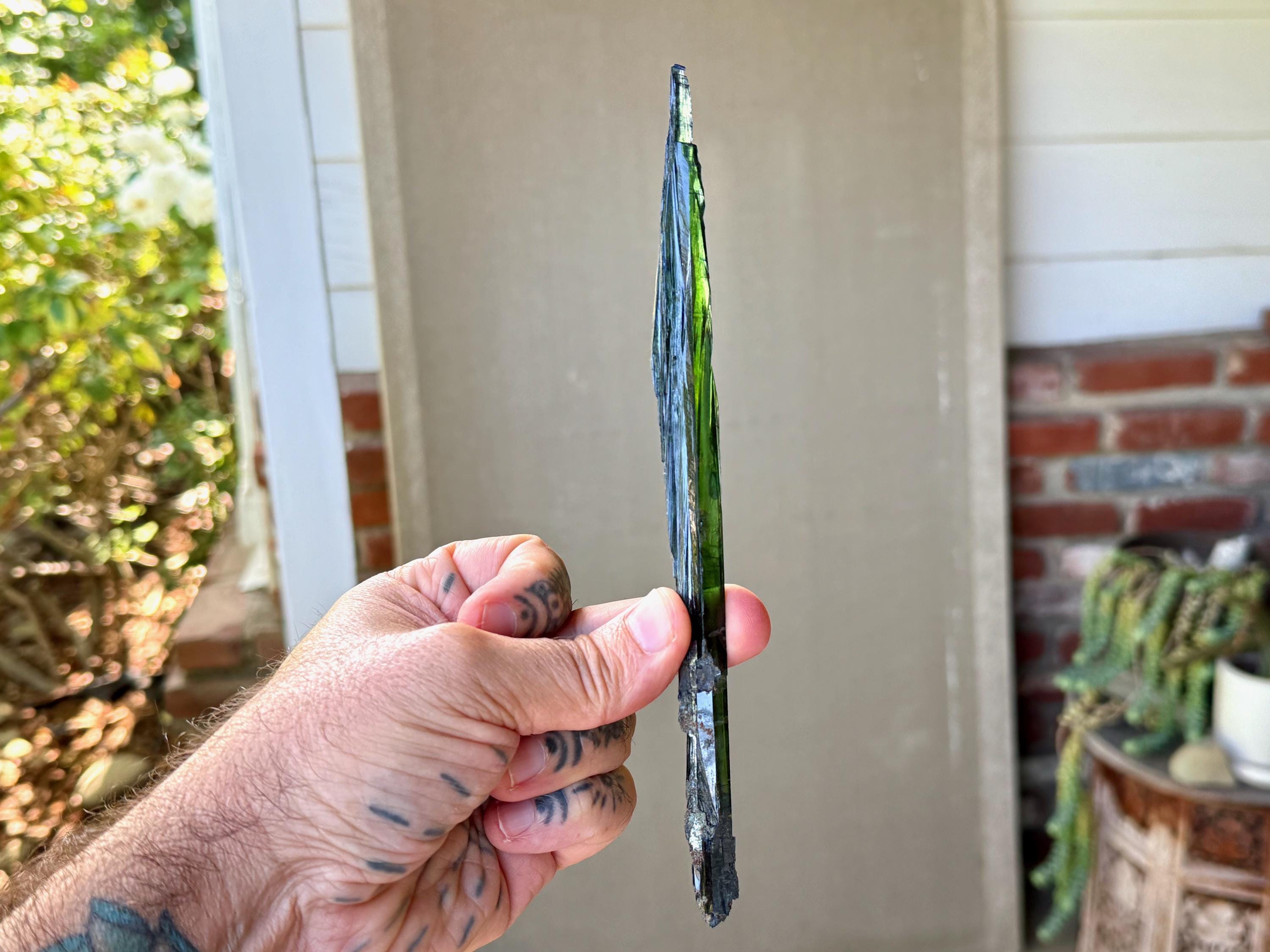 Vivianite gets its dark, emerald green hue (sometimes with tinges of blue) from the oxidation of iron phosphate. It has the unique characteristic of often growing on decaying plant and animal matter, and those interested in morbid facts might be interested to know that it has even been known to be found growing on decomposing bodies (!). In the metaphysical world, however, Vivianite is an incredible powerful Heart Chakra crystal (detailed at the end of this listing).