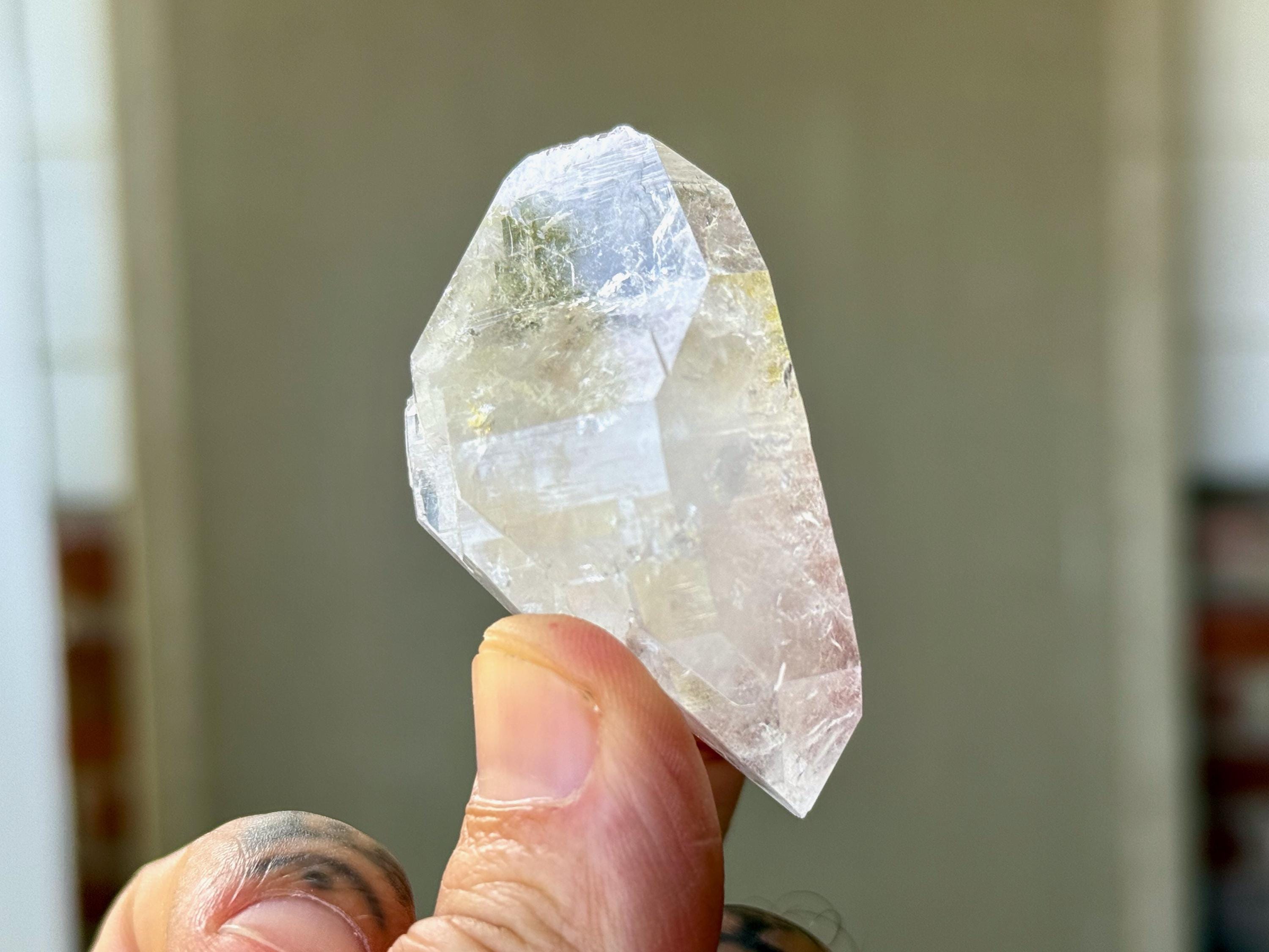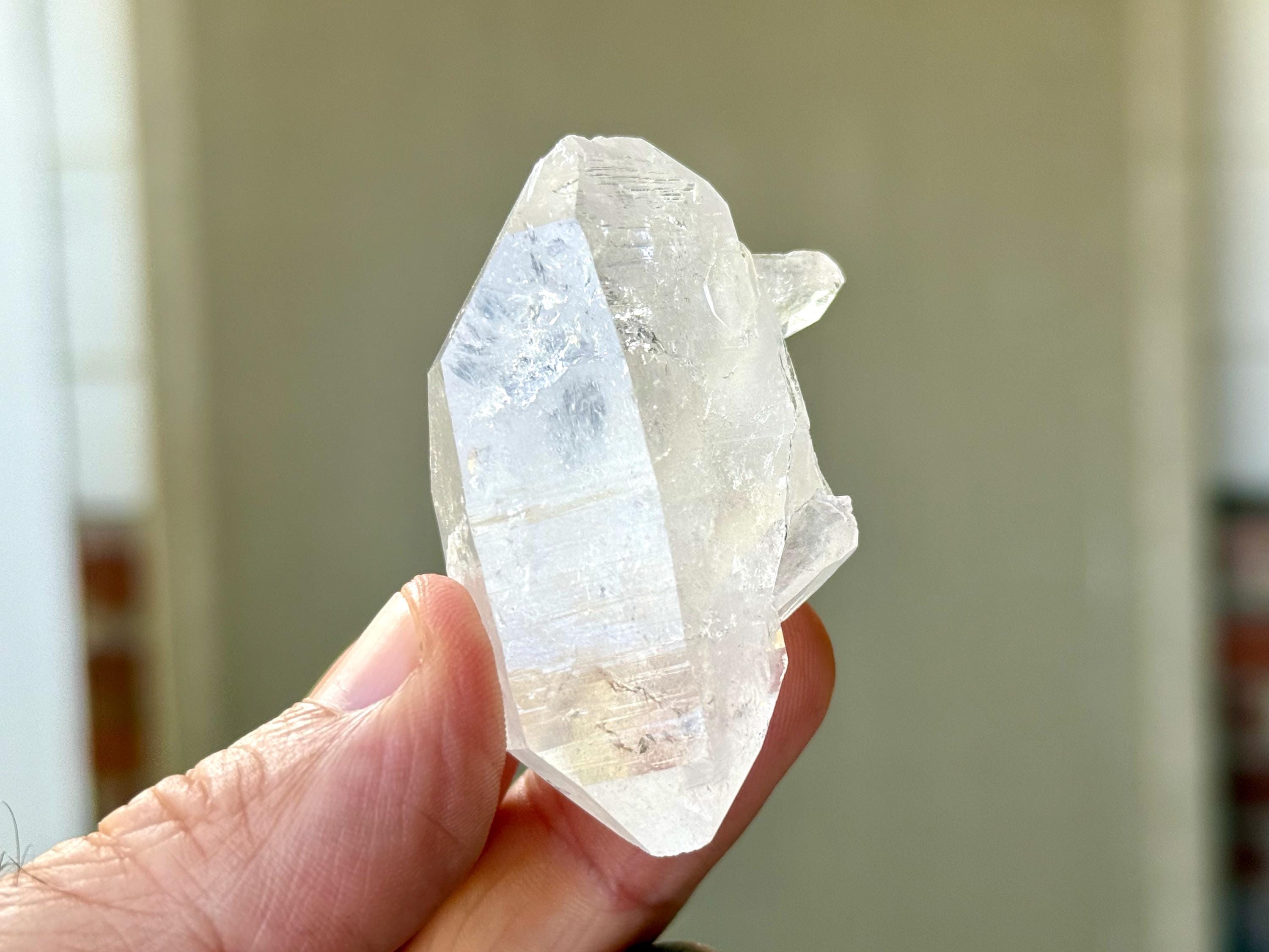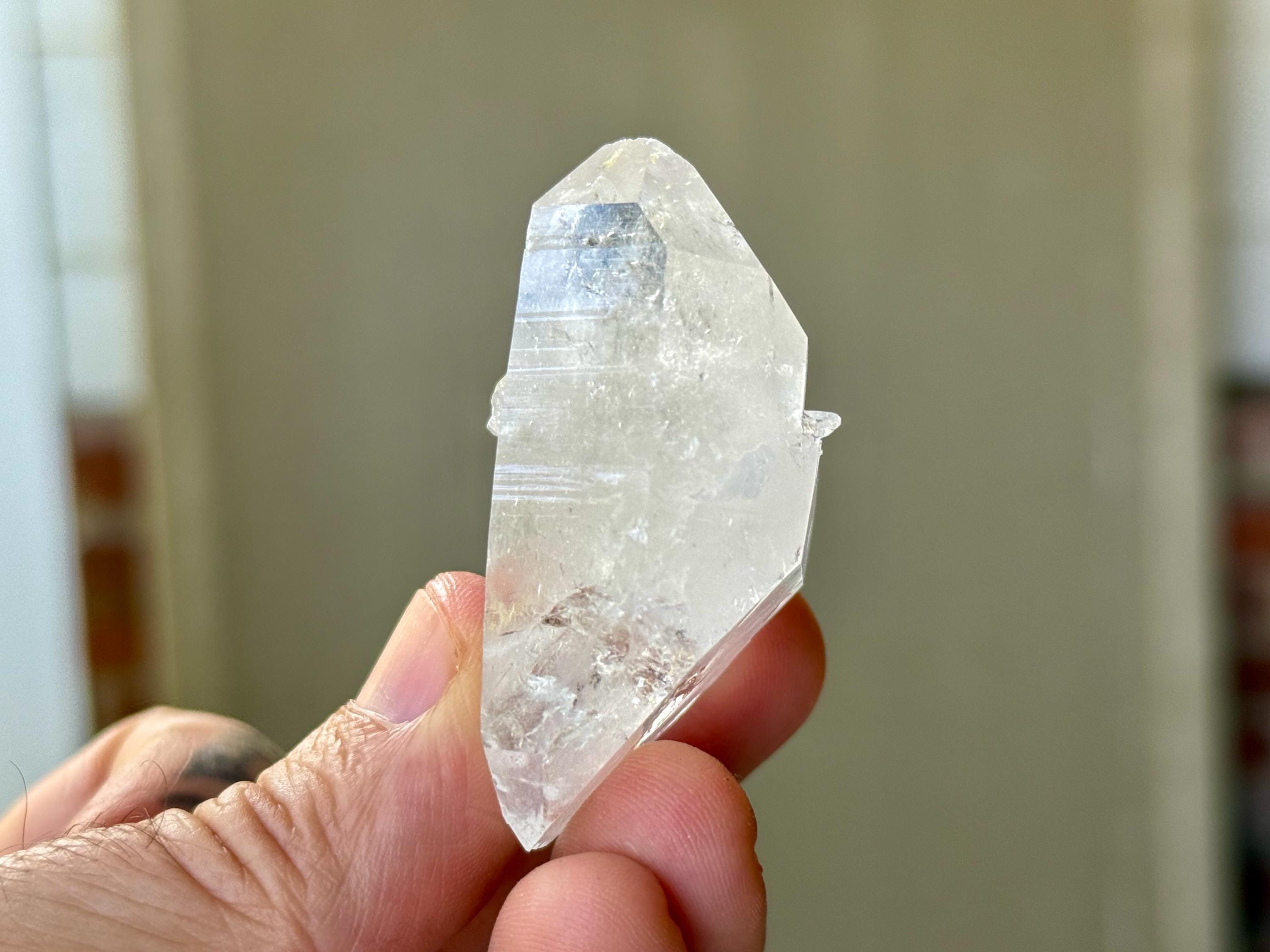 Brilliant luster to this Lemurian Quartz crystal with a bit of an ethereal quality to it. This crystal possesses water clear clarity with some wispy white growth in the center. It is a beautiful Double Terminated formation, with "true" main facets on both the top and base. Excellent terminations as well!