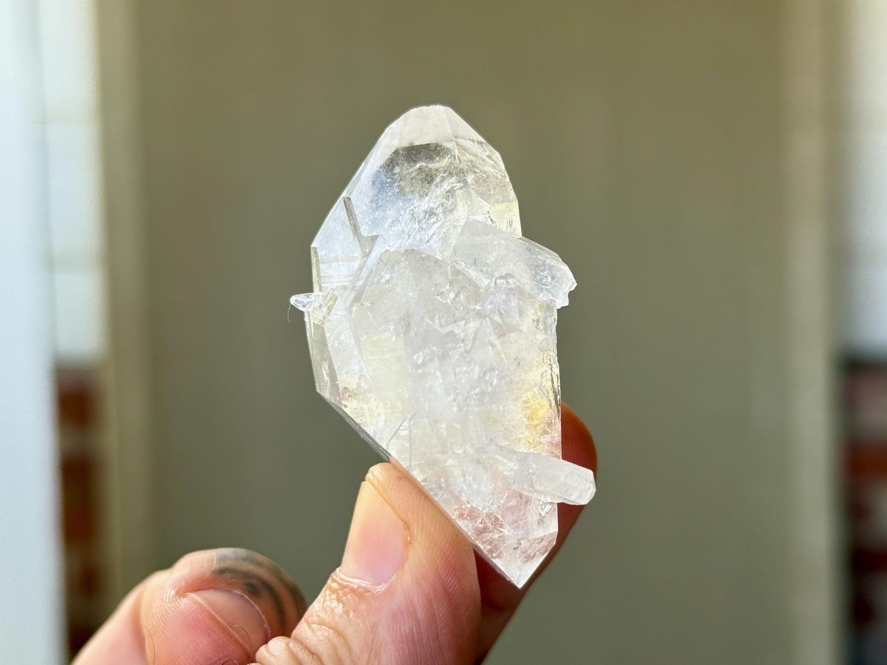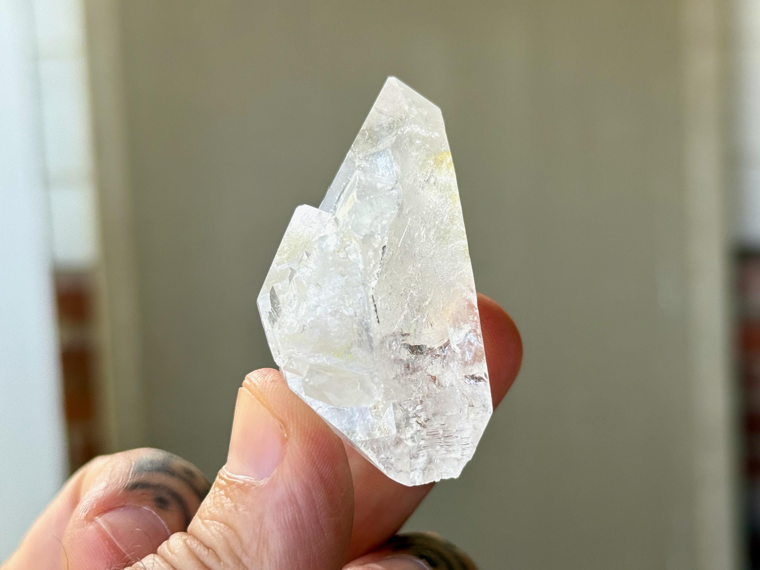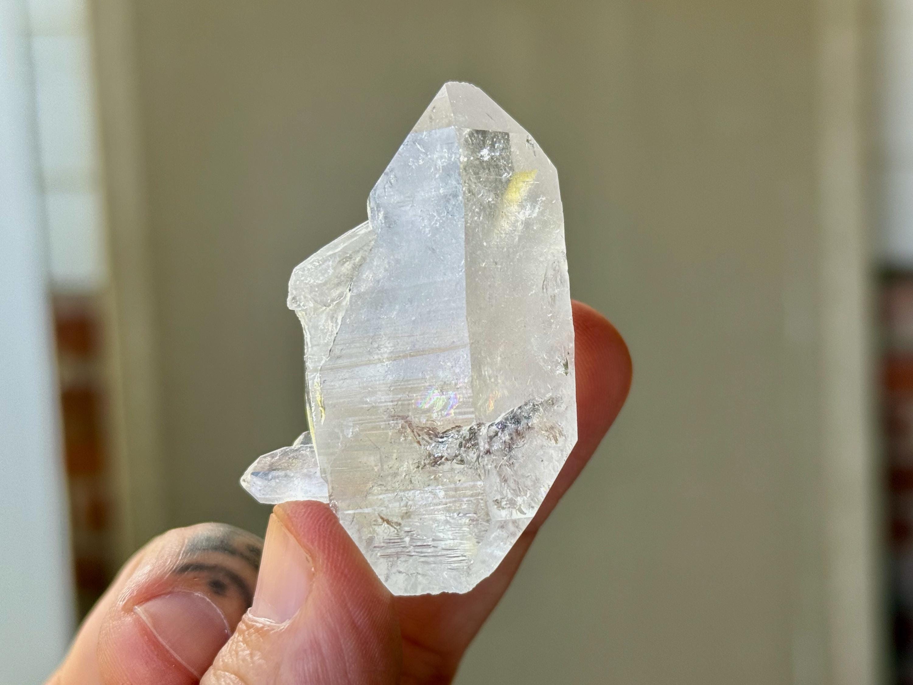 Brilliant luster to this Lemurian Quartz crystal with a bit of an ethereal quality to it. This crystal possesses water clear clarity with some wispy white growth in the center. It is a beautiful Double Terminated formation, with "true" main facets on both the top and base. Excellent terminations as well!