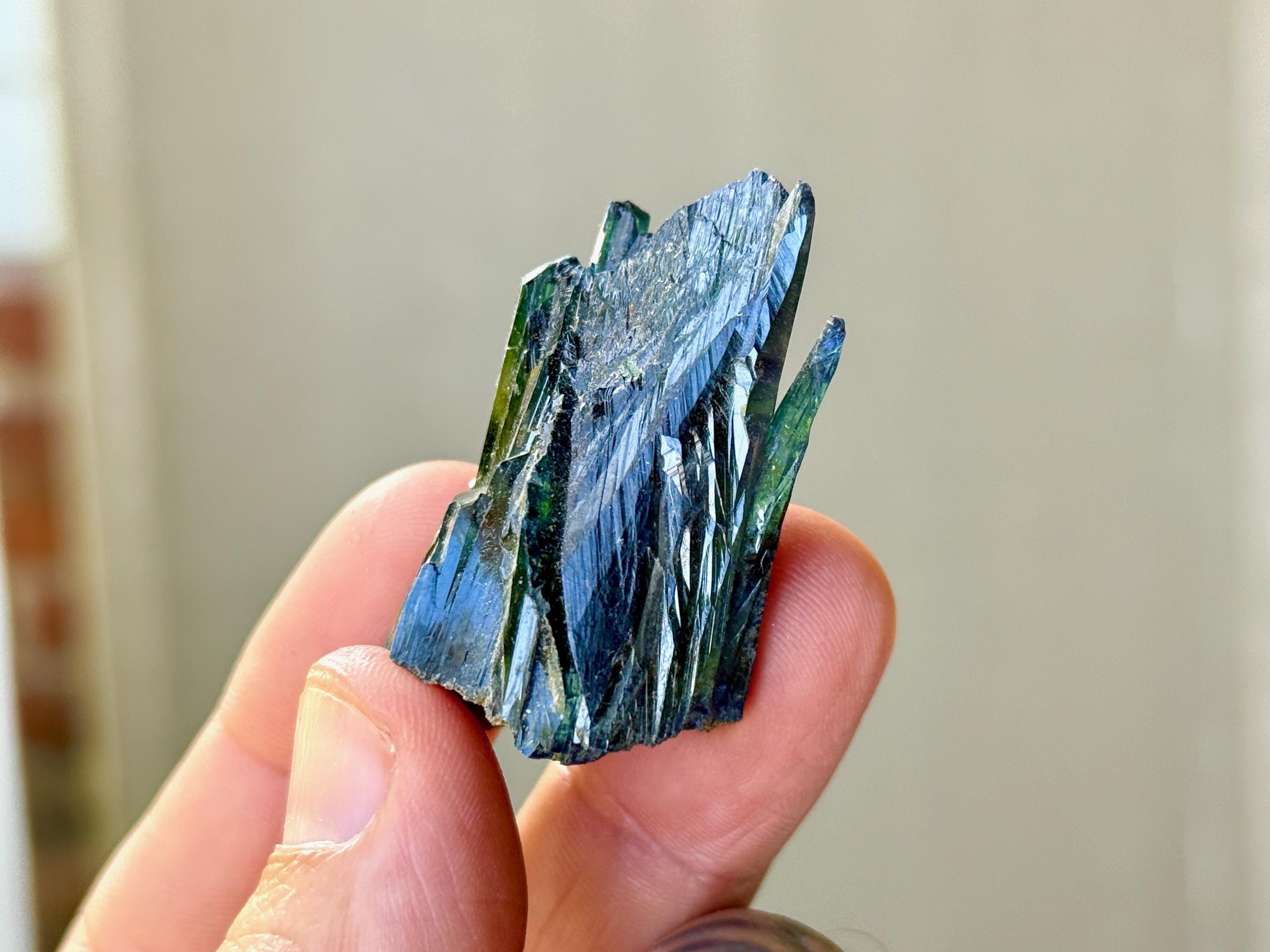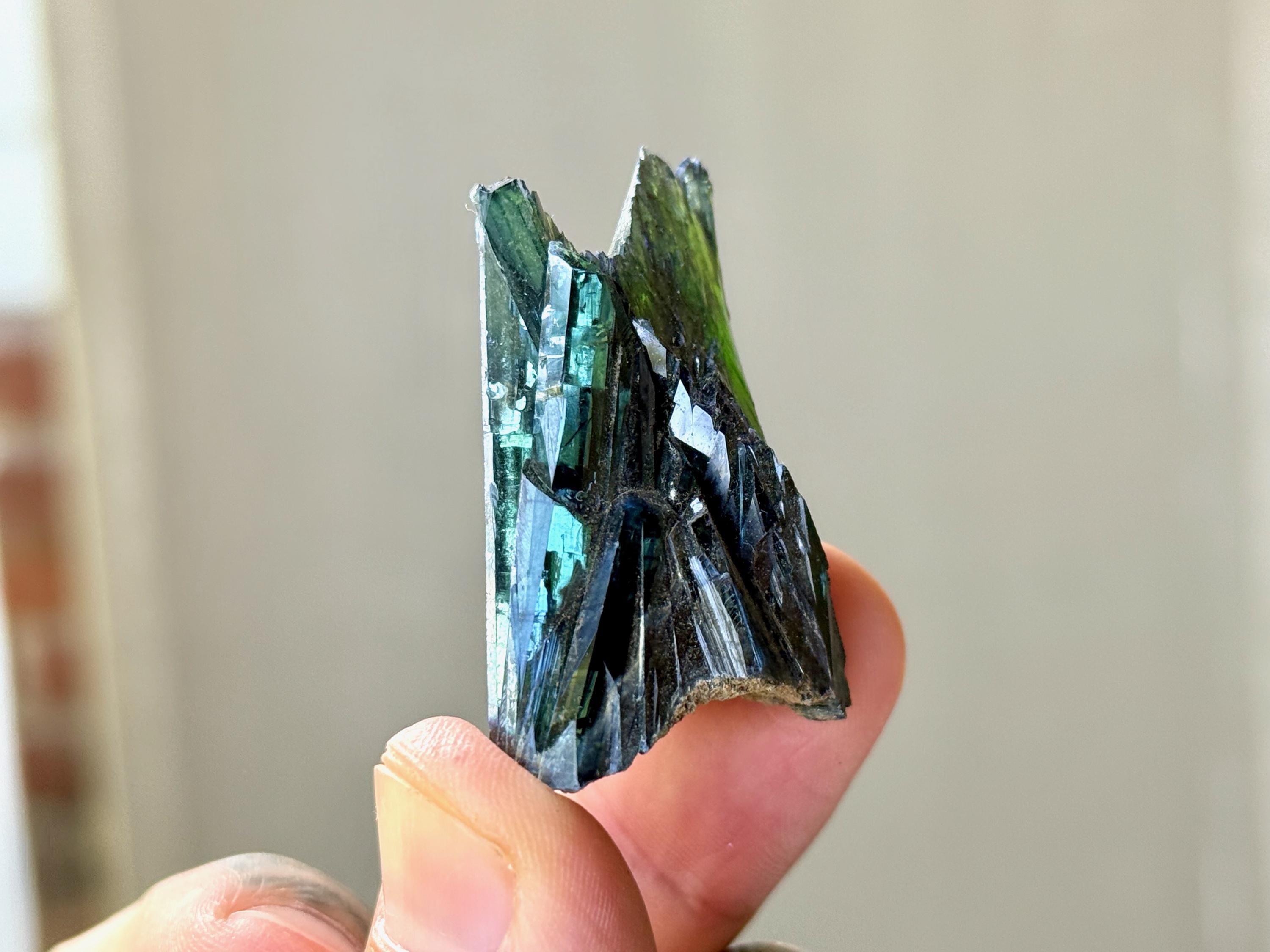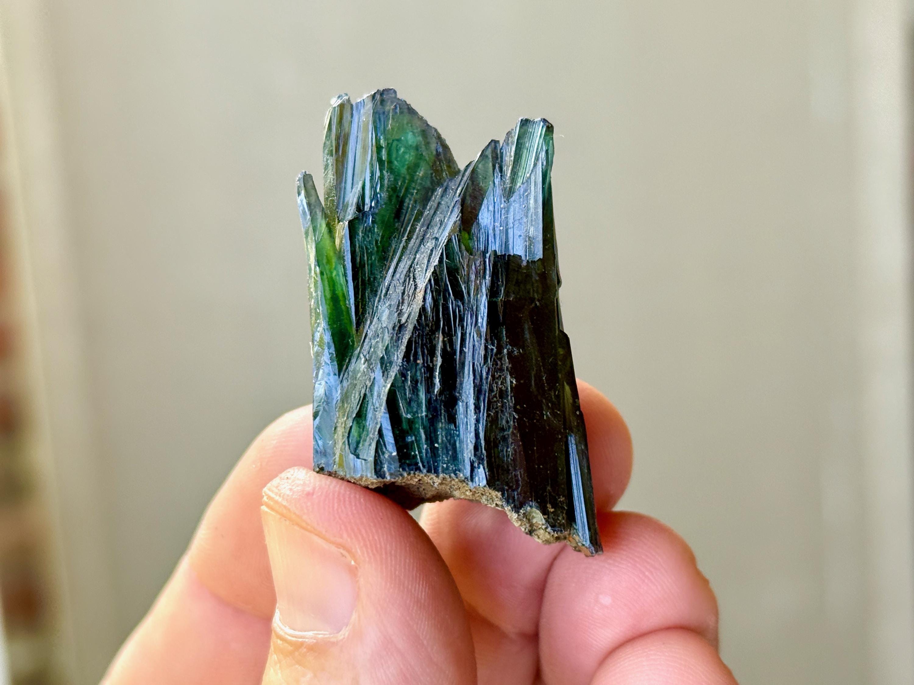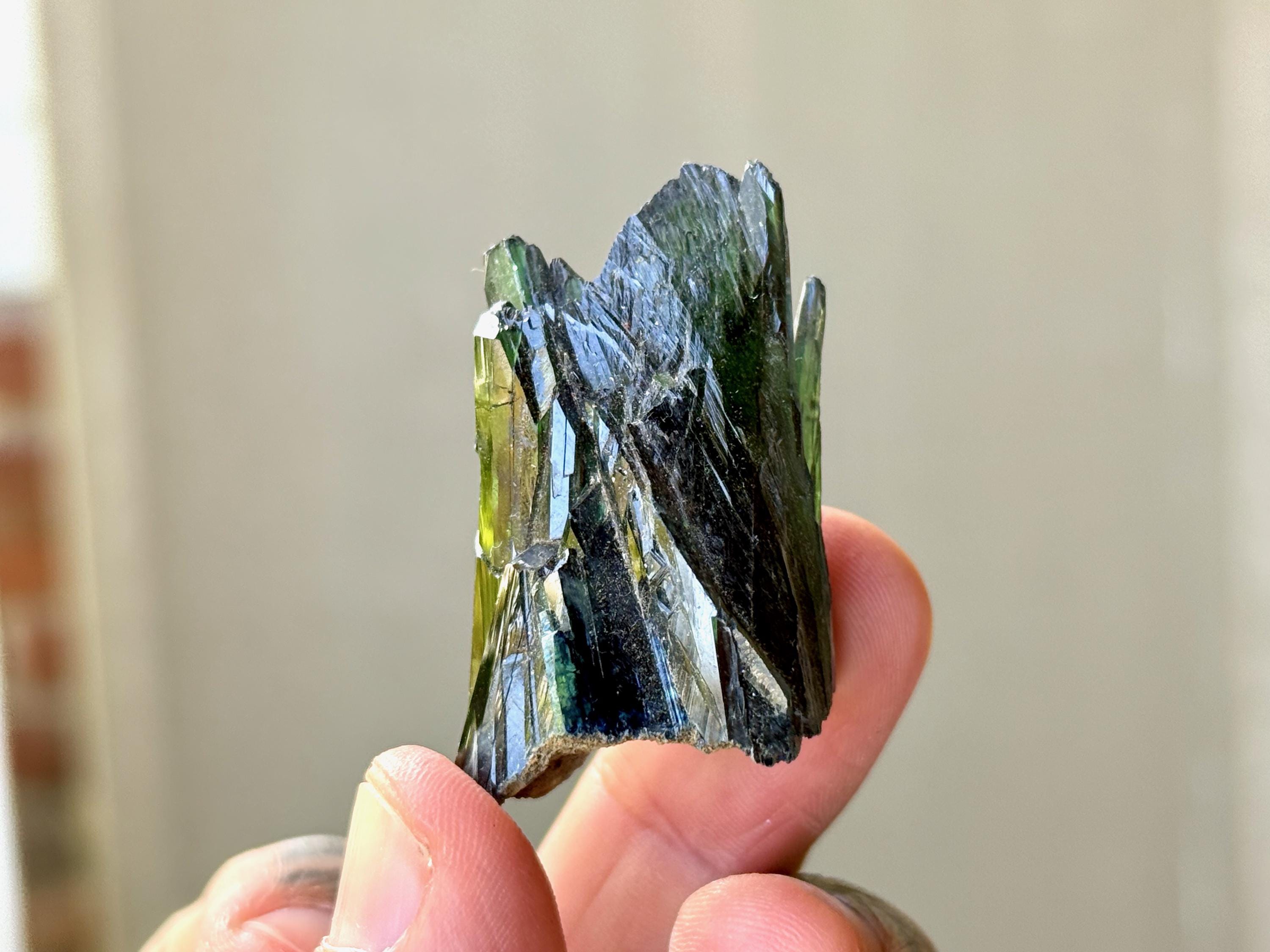 Gorgeous luster to this enchanting Vivianite crystal in a natural formation! When backlit, we can see the brilliant colors of green and even blue (at the tips) come to life! (Photos 1, 3-7). This crystal is nearly ALL Vivianite, with just a small amount of matrix at the base. It's a very stable formation with excellent terminations. Superb!