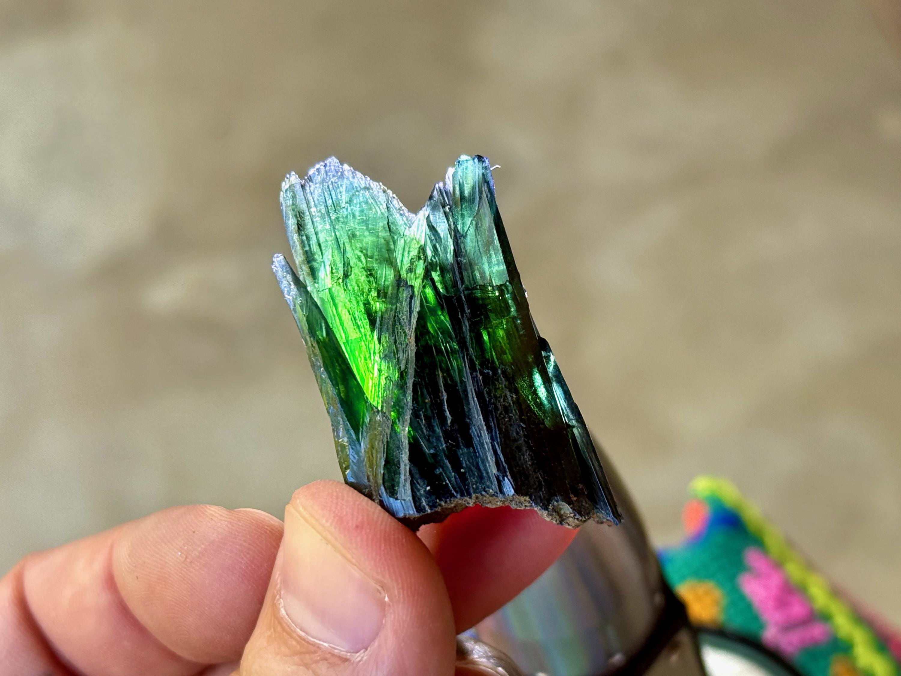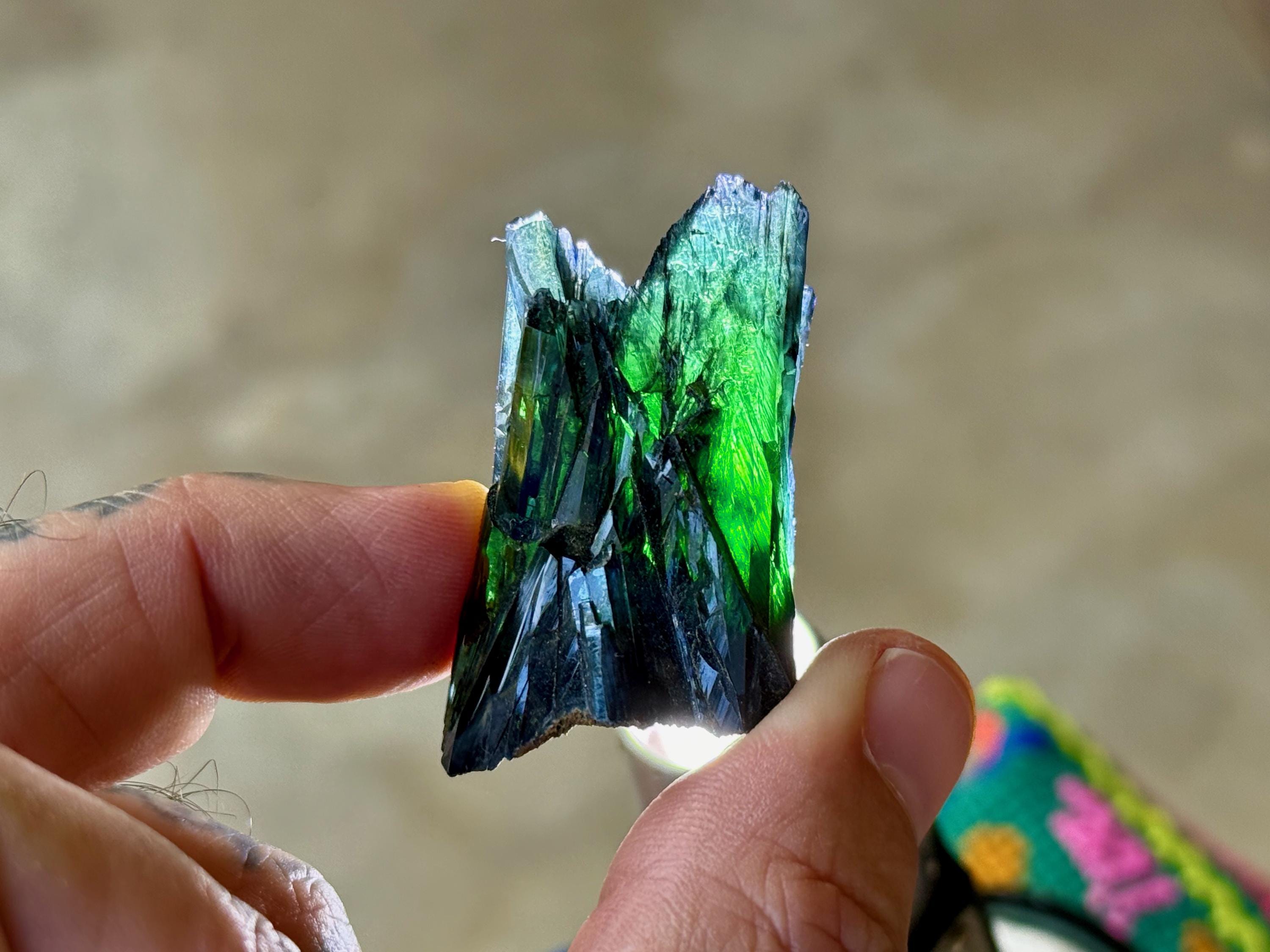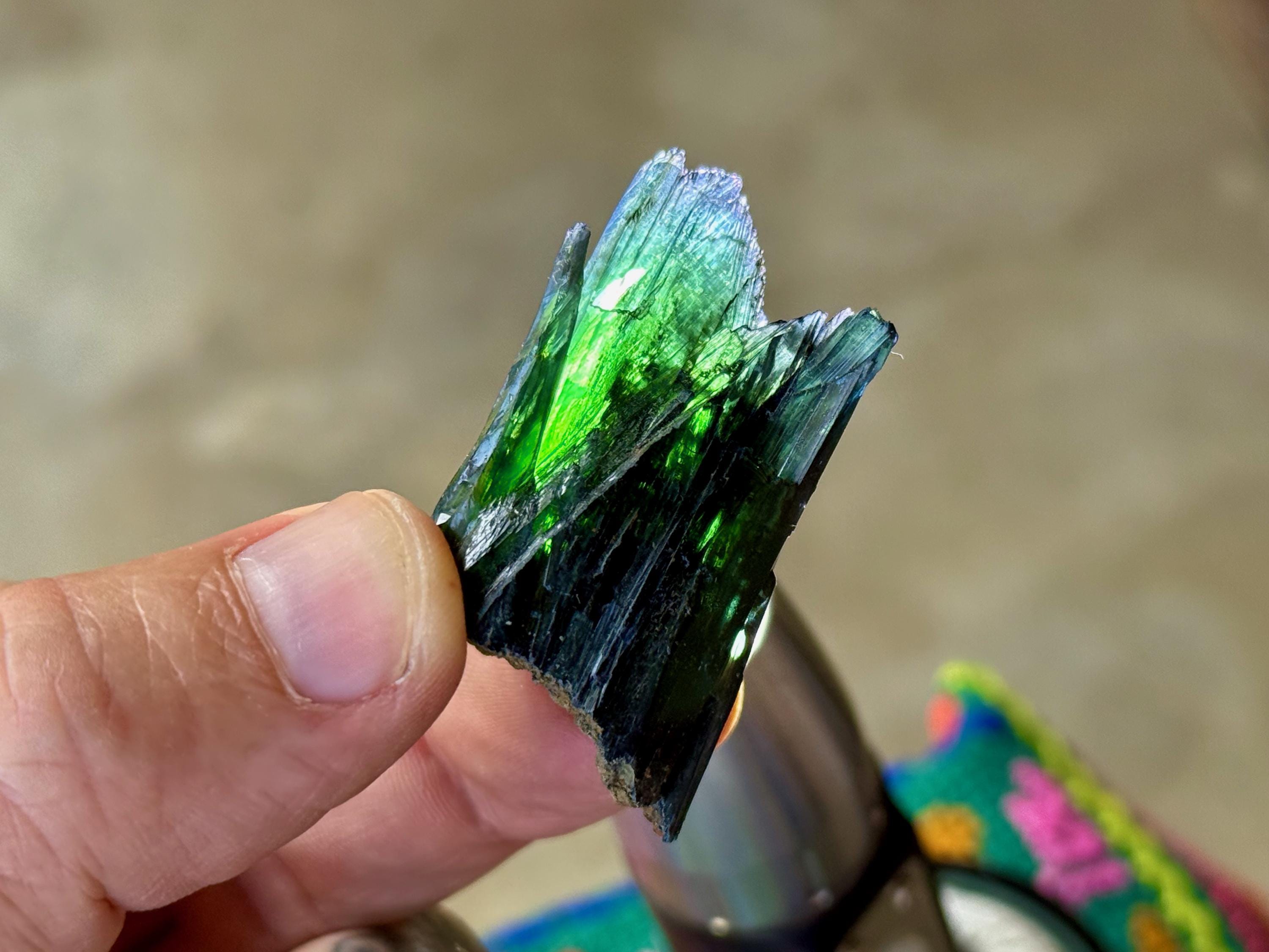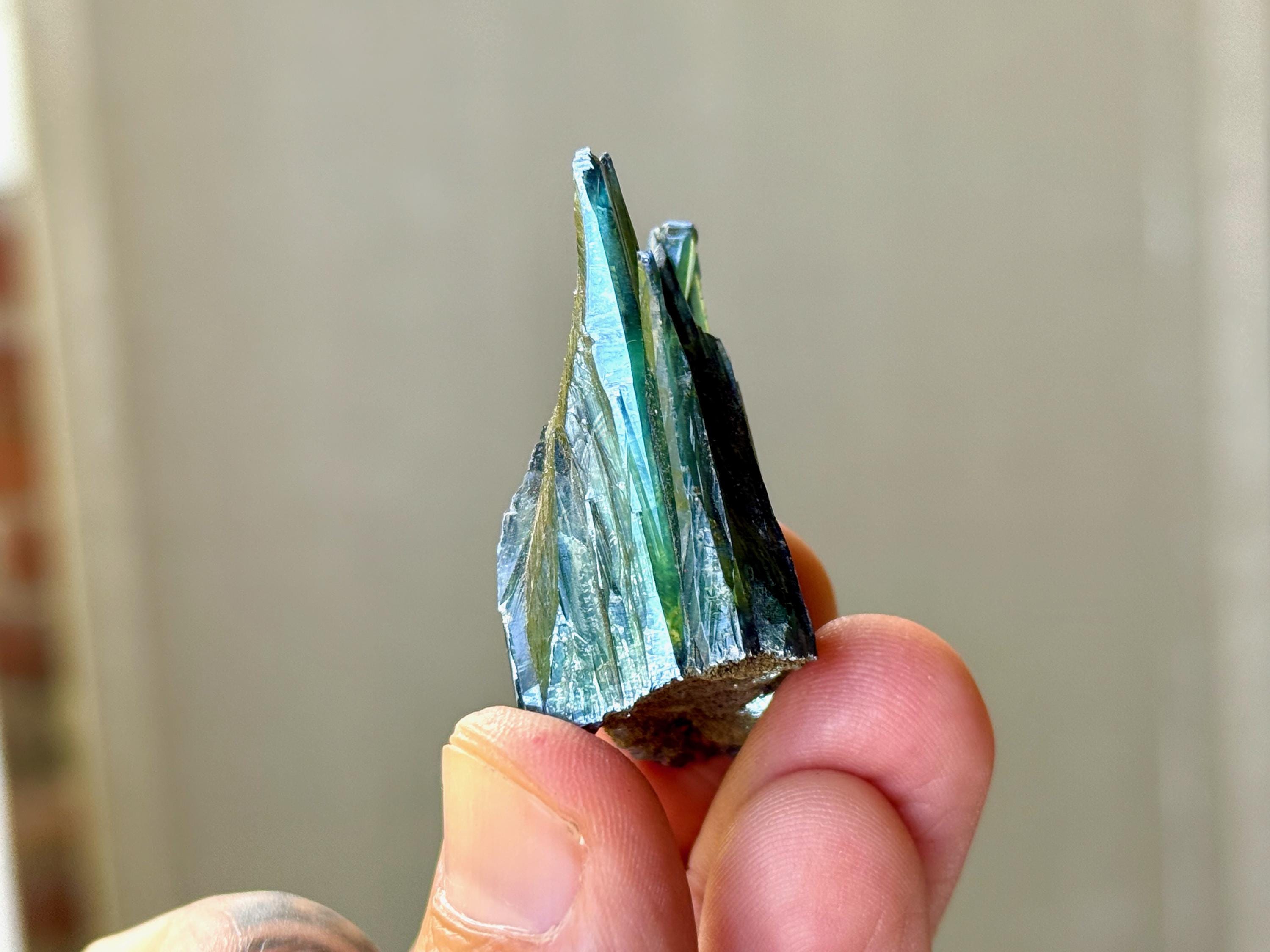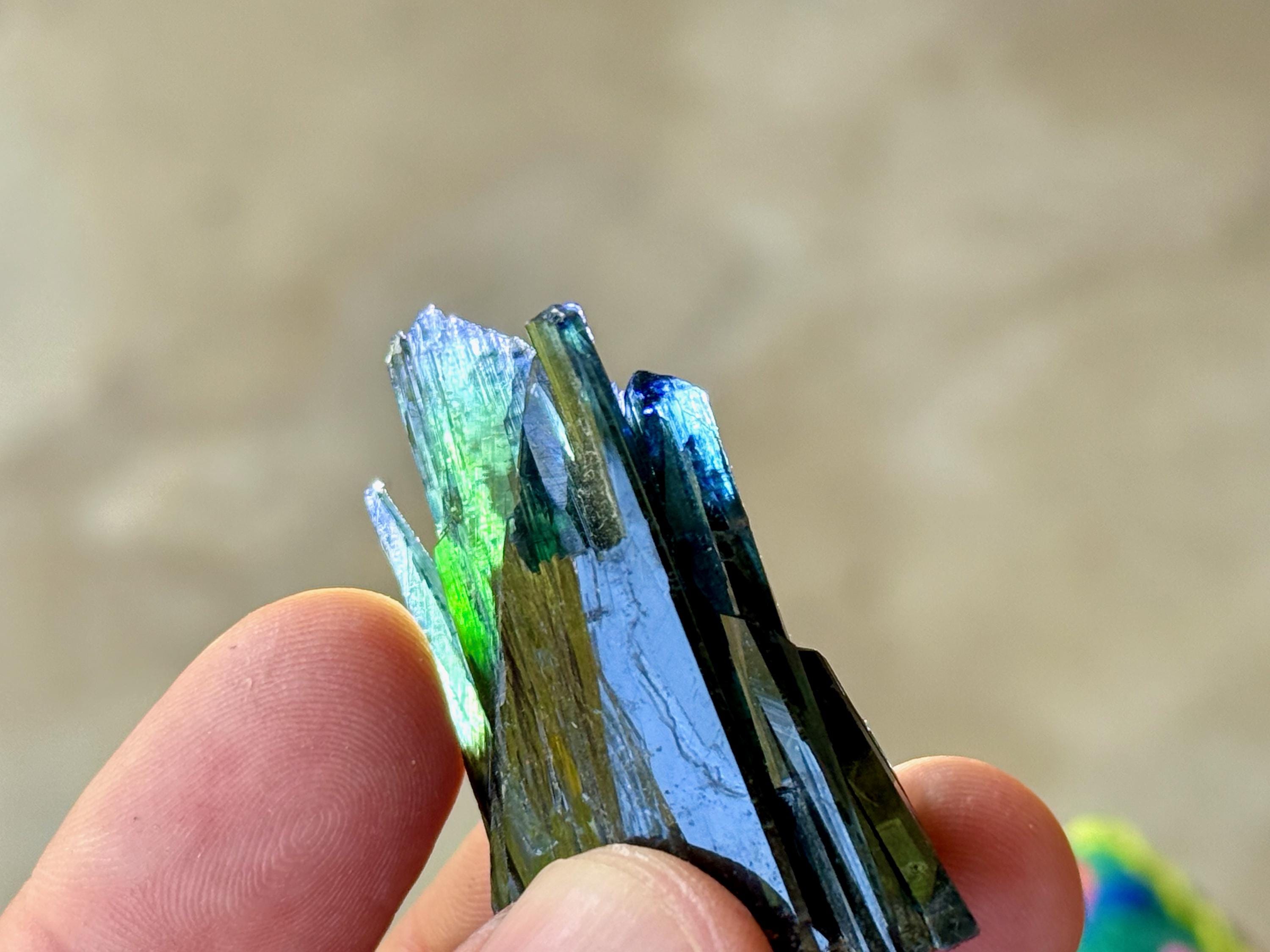 Gorgeous luster to this enchanting Vivianite crystal in a natural formation! When backlit, we can see the brilliant colors of green and even blue (at the tips) come to life! (Photos 1, 3-7). This crystal is nearly ALL Vivianite, with just a small amount of matrix at the base. It's a very stable formation with excellent terminations. Superb!
