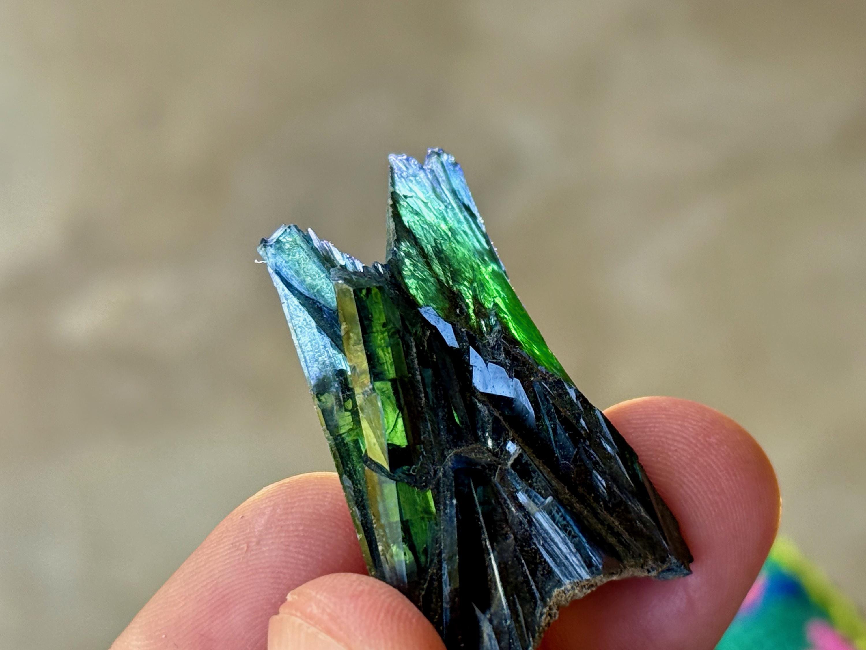 Vivianite gets its dark, emerald green hue (sometimes with tinges of blue) from the oxidation of iron phosphate. It has the unique characteristic of often growing on decaying plant and animal matter, and those interested in morbid facts might be interested to know that it has even been known to be found growing on decomposing bodies (!). In the metaphysical world, however, Vivianite is an incredible powerful Heart Chakra crystal (detailed at the end of this listing).