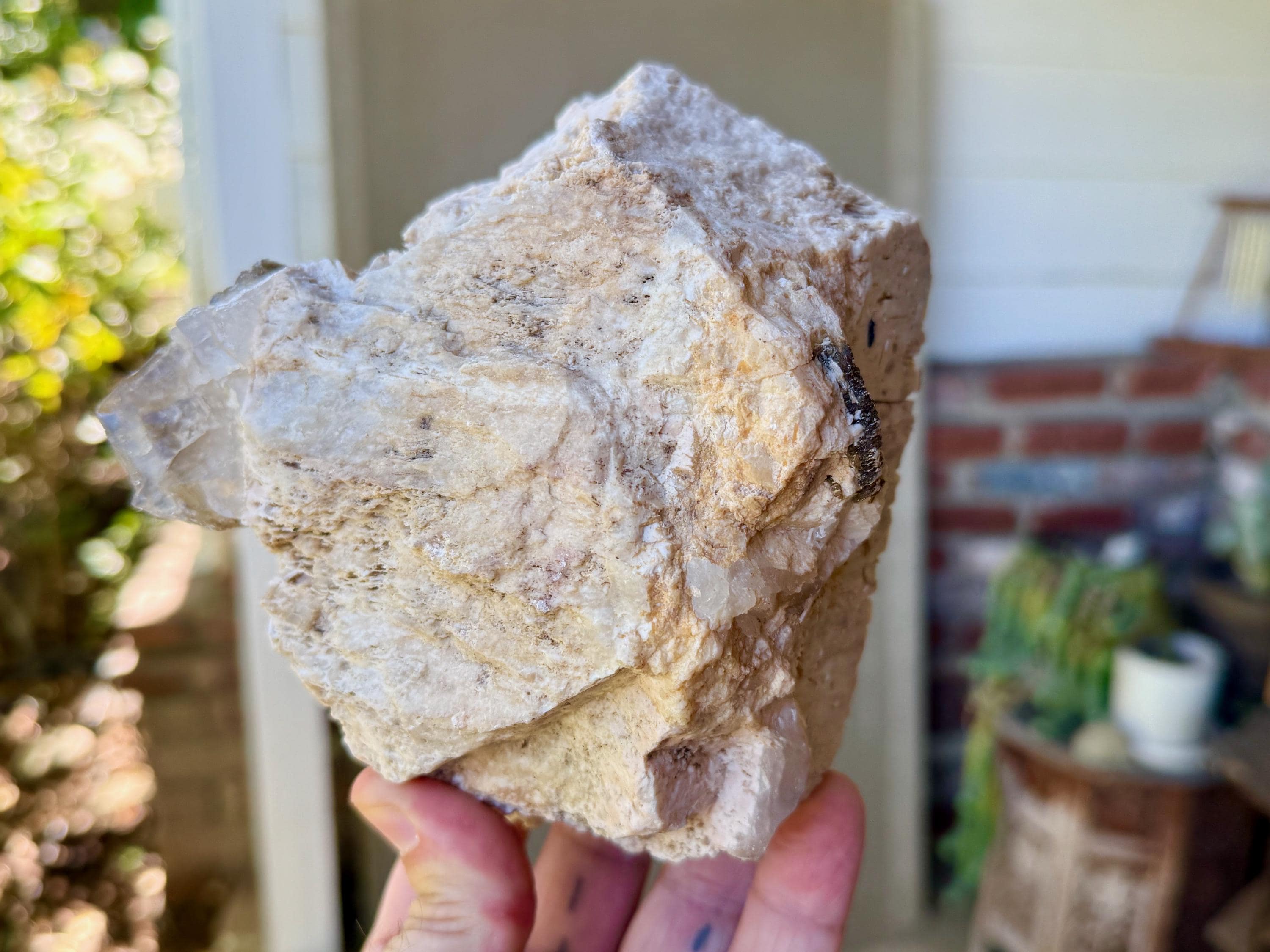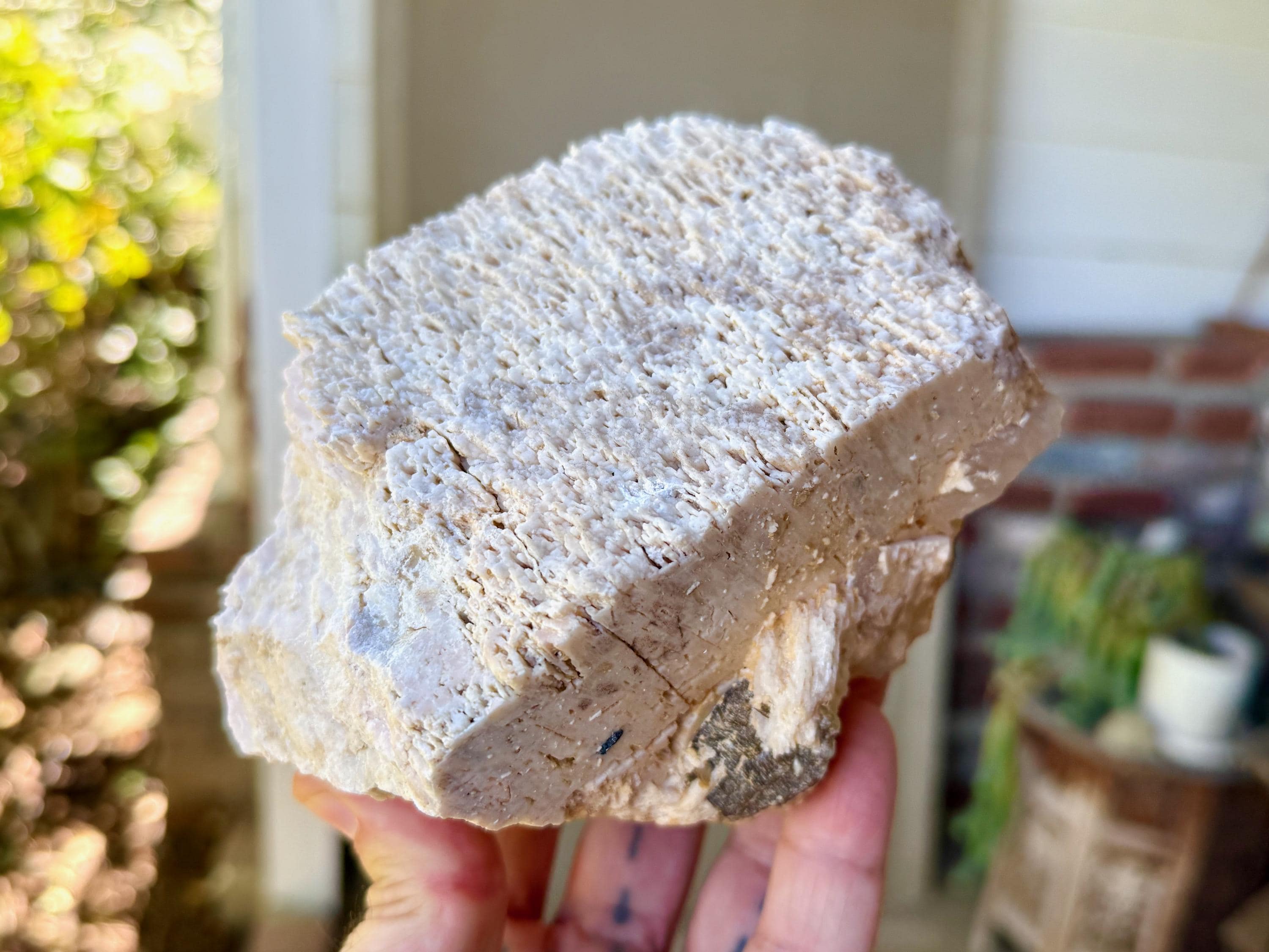 This Feldspar is a cubic formation with lovely coral-like textures and impressions on some sides, and smooth surfaces on the opposing ones. It has the *slightest* tinge of pinkish hue, but is mostly white in color.
