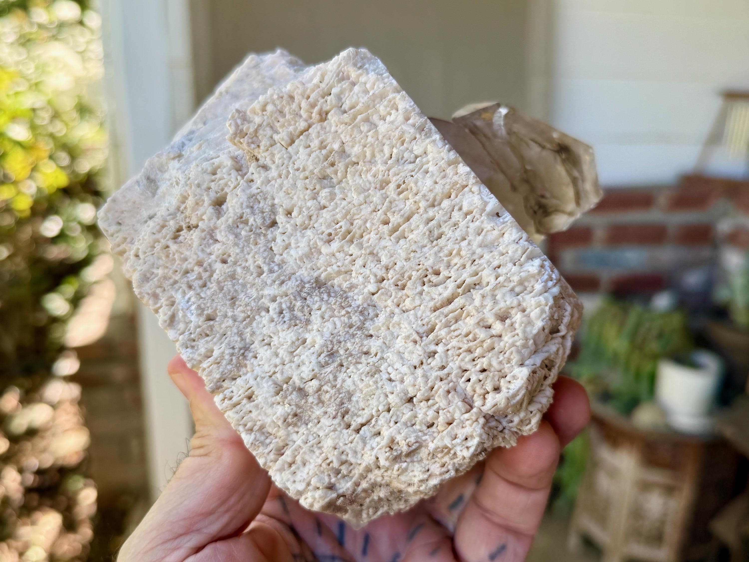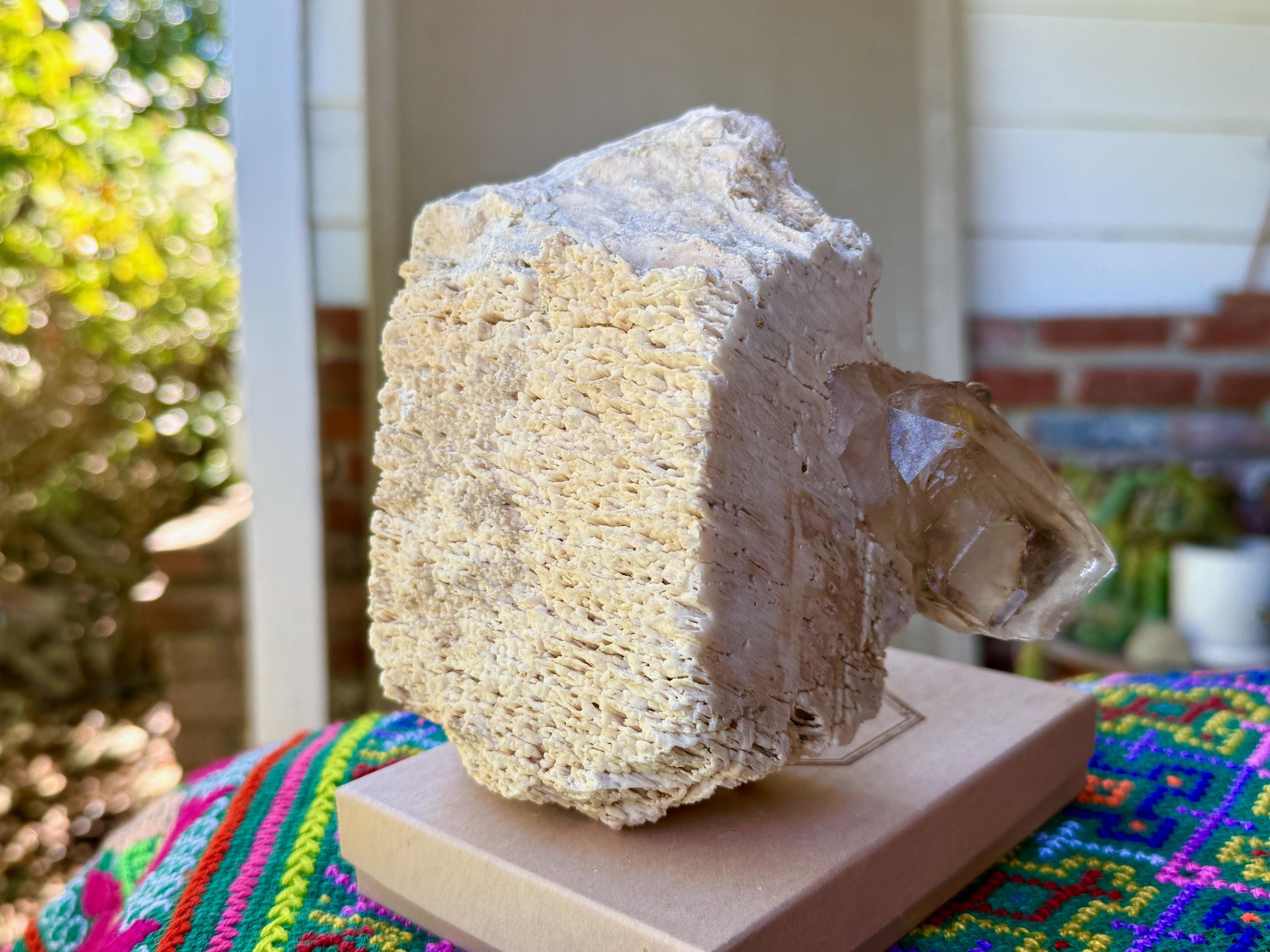 A spectacular and very aesthetic natural formation, this giant Feldspar crystal with Smoky Quartz is a gentle giant, commanding power and presence. This is an entirely natural formation, exactly as found in the Earth. Metaphysically, we love the combination of grounding energies here, with both Feldspar and Smoky Quartz.