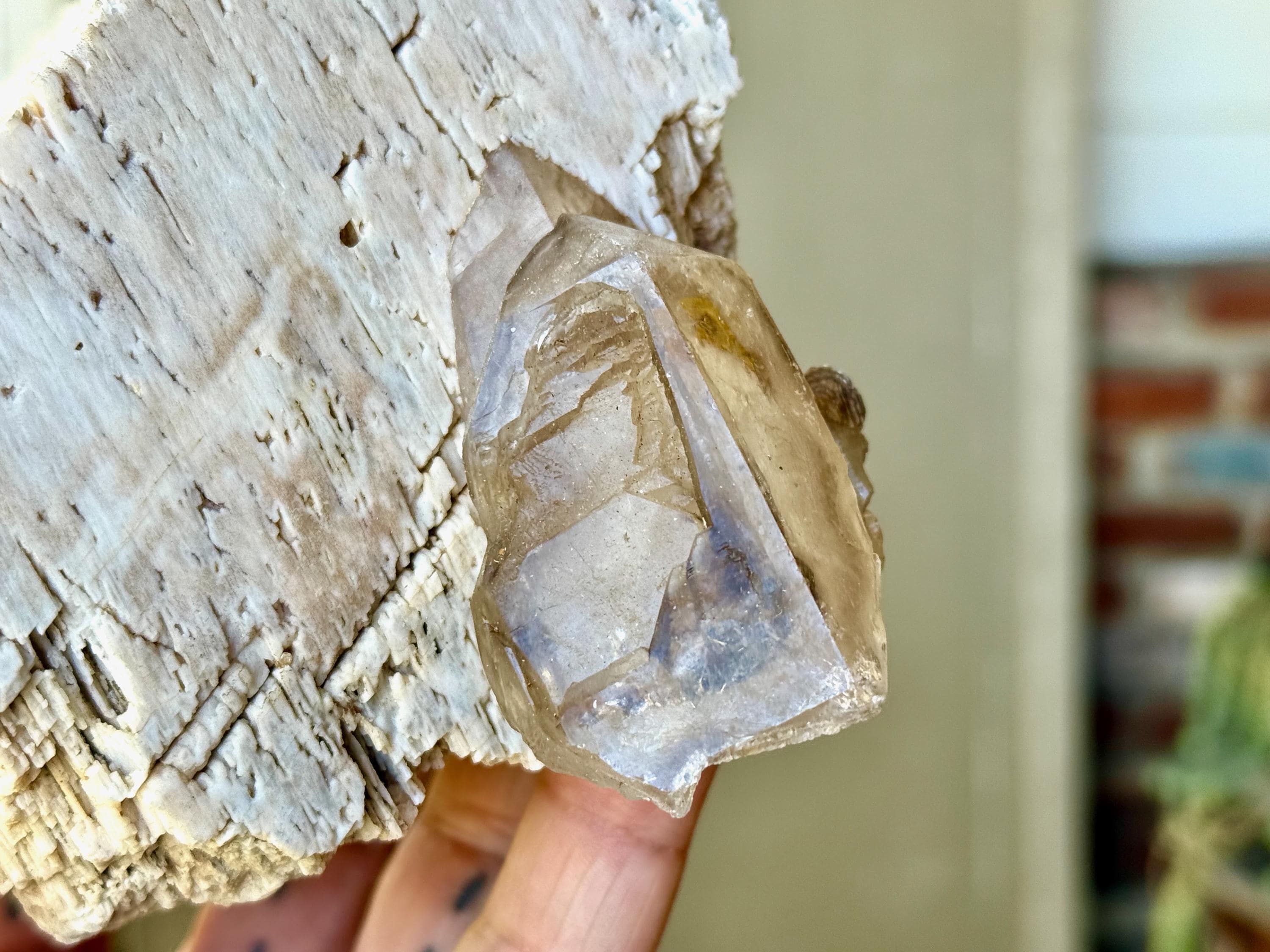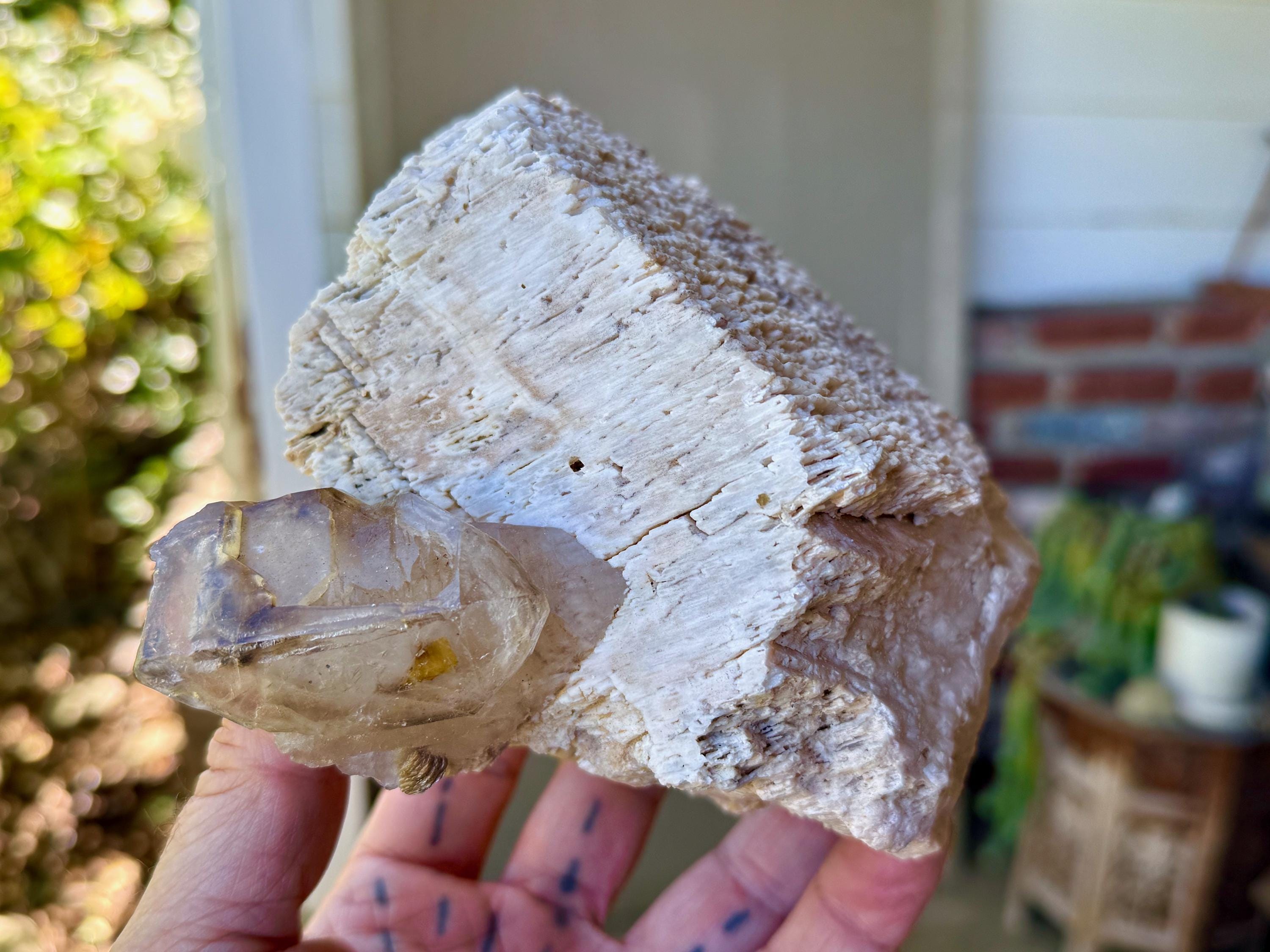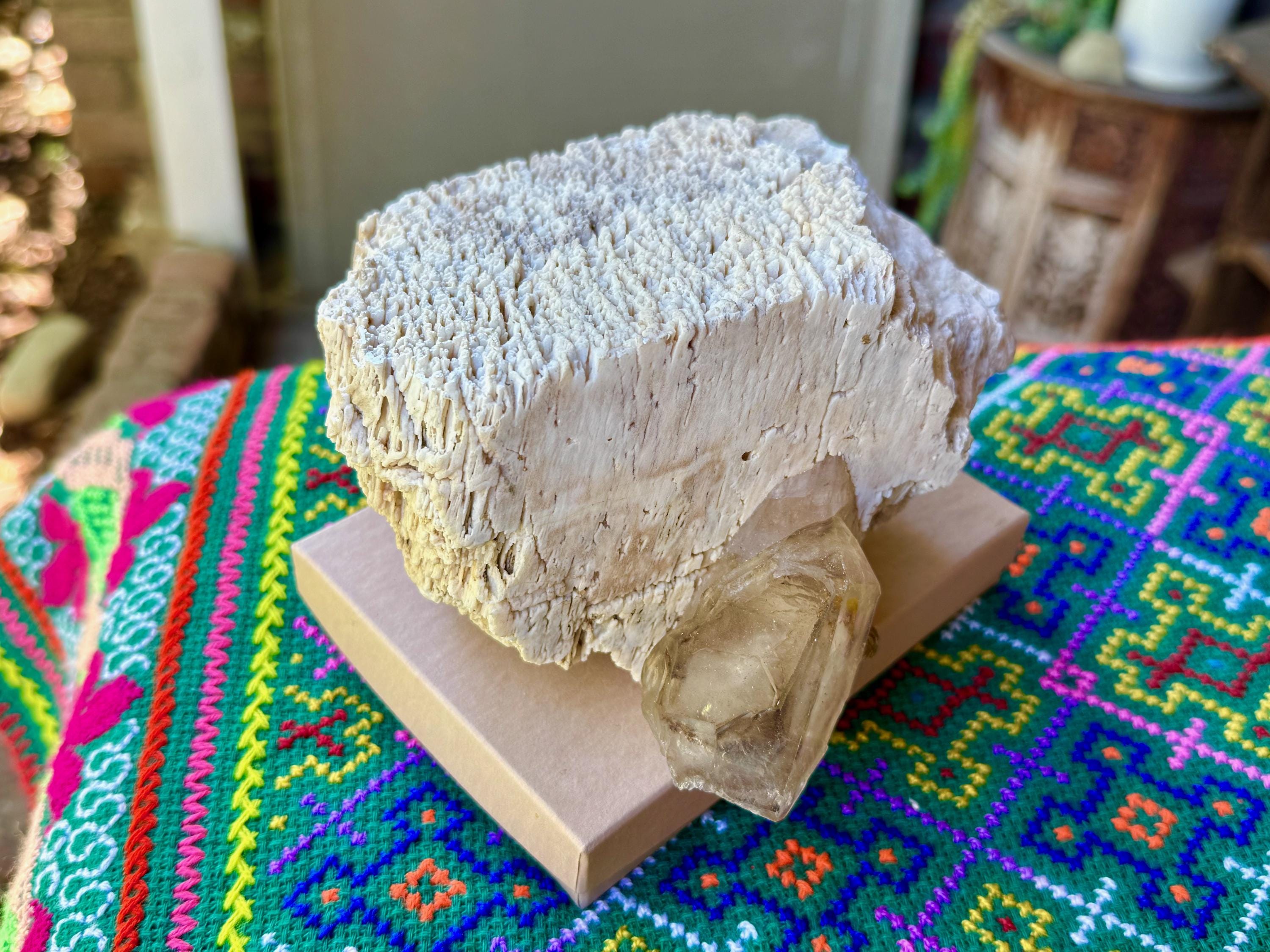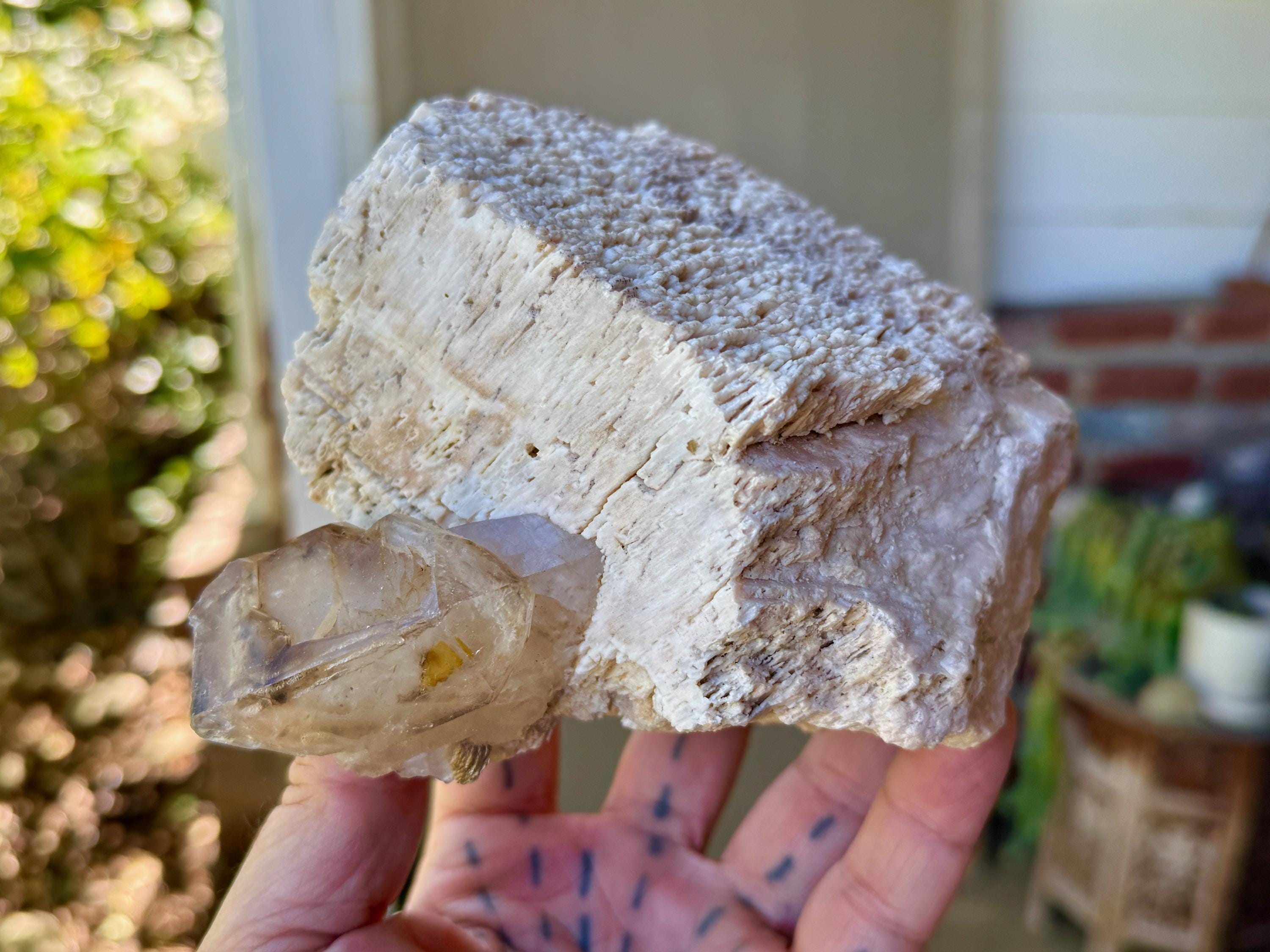 Embedded into one side is a lustrous Smoky Quartz point, in a bit of an Elestial formation.