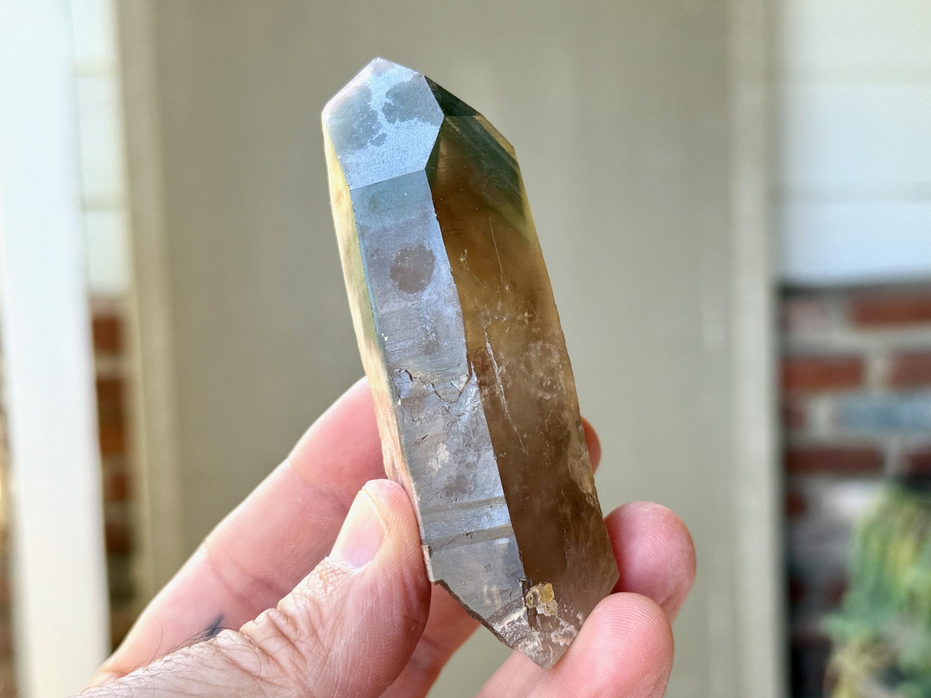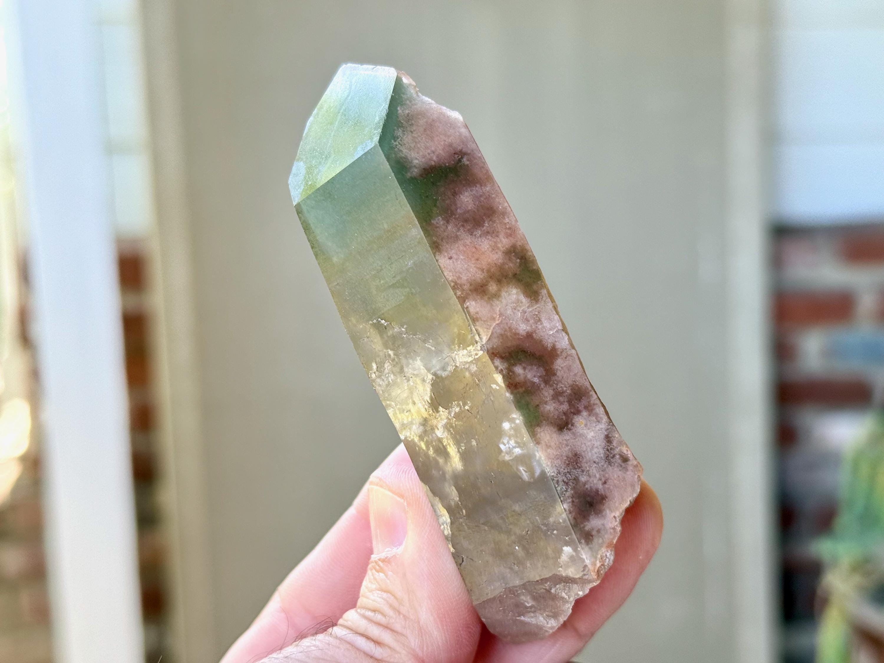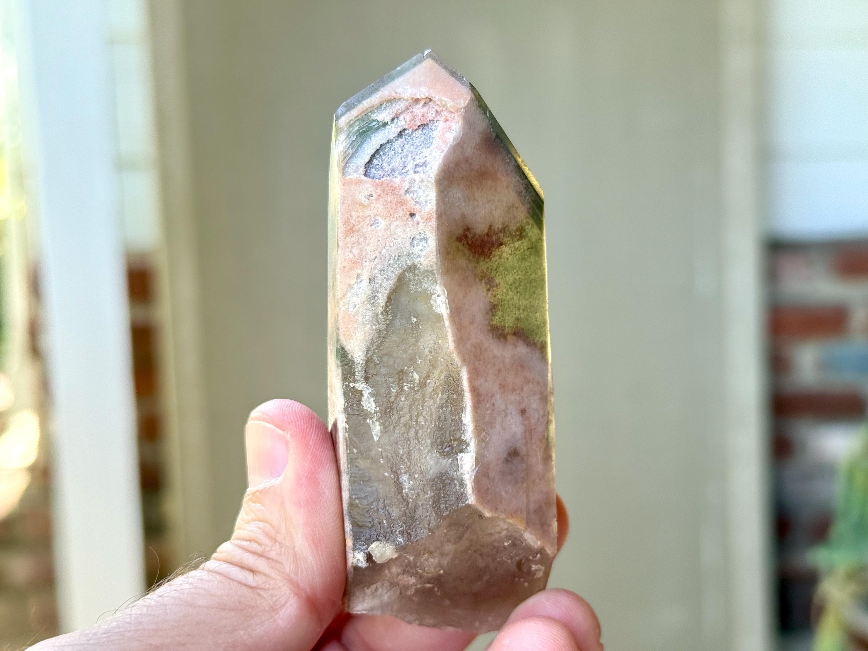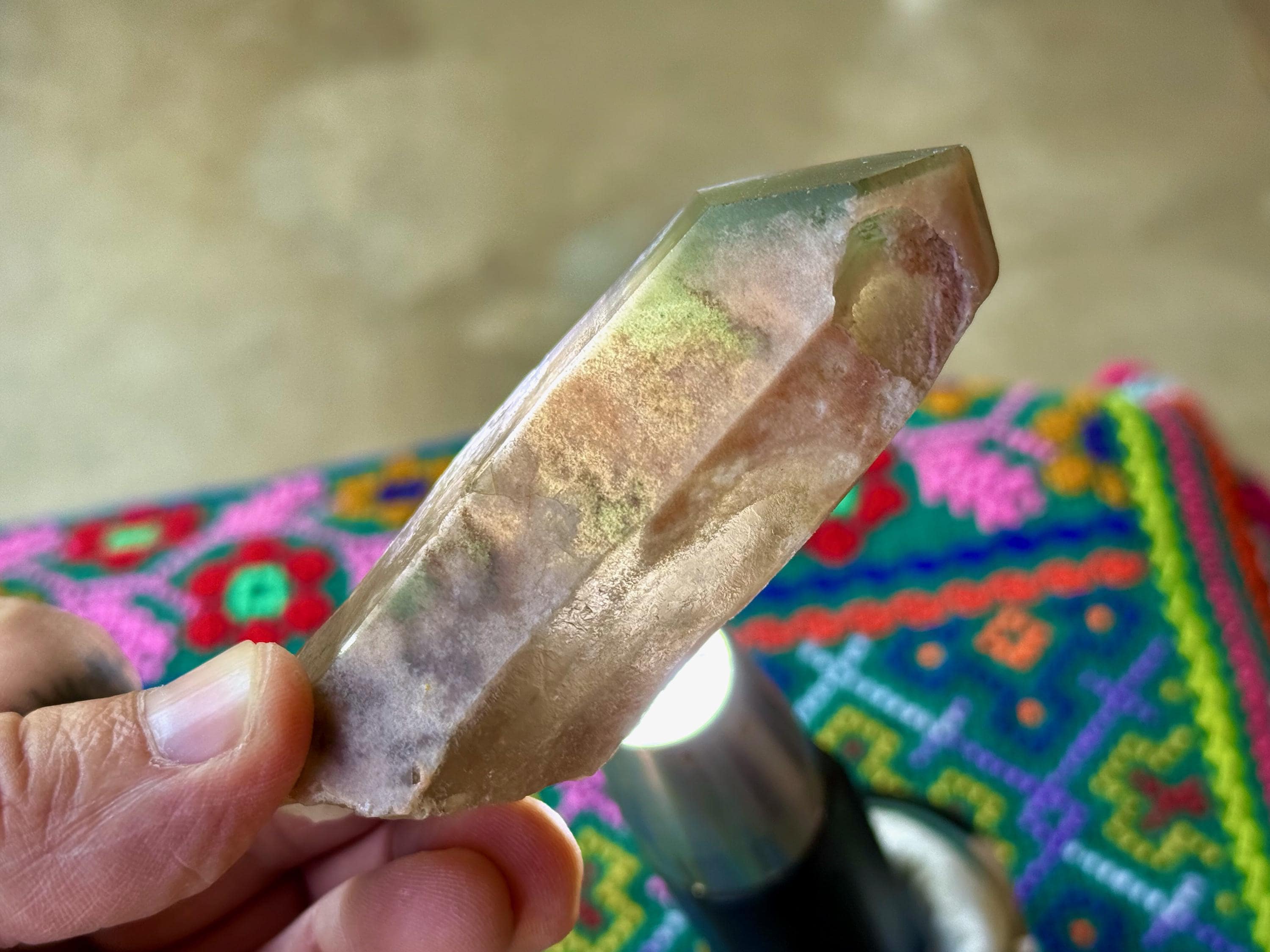 A beautiful combination of colors and inclusions on this stunning Green Chlorite Phantom Quartz with Pink Lodolite inclusions! This crystal features an elongated formation and exhibits a rich smoky hue and wonderful clarity. It's this clarity at the main facet area that allows us to enjoy the layered, pyramidal Green Chlorite phantoms within.