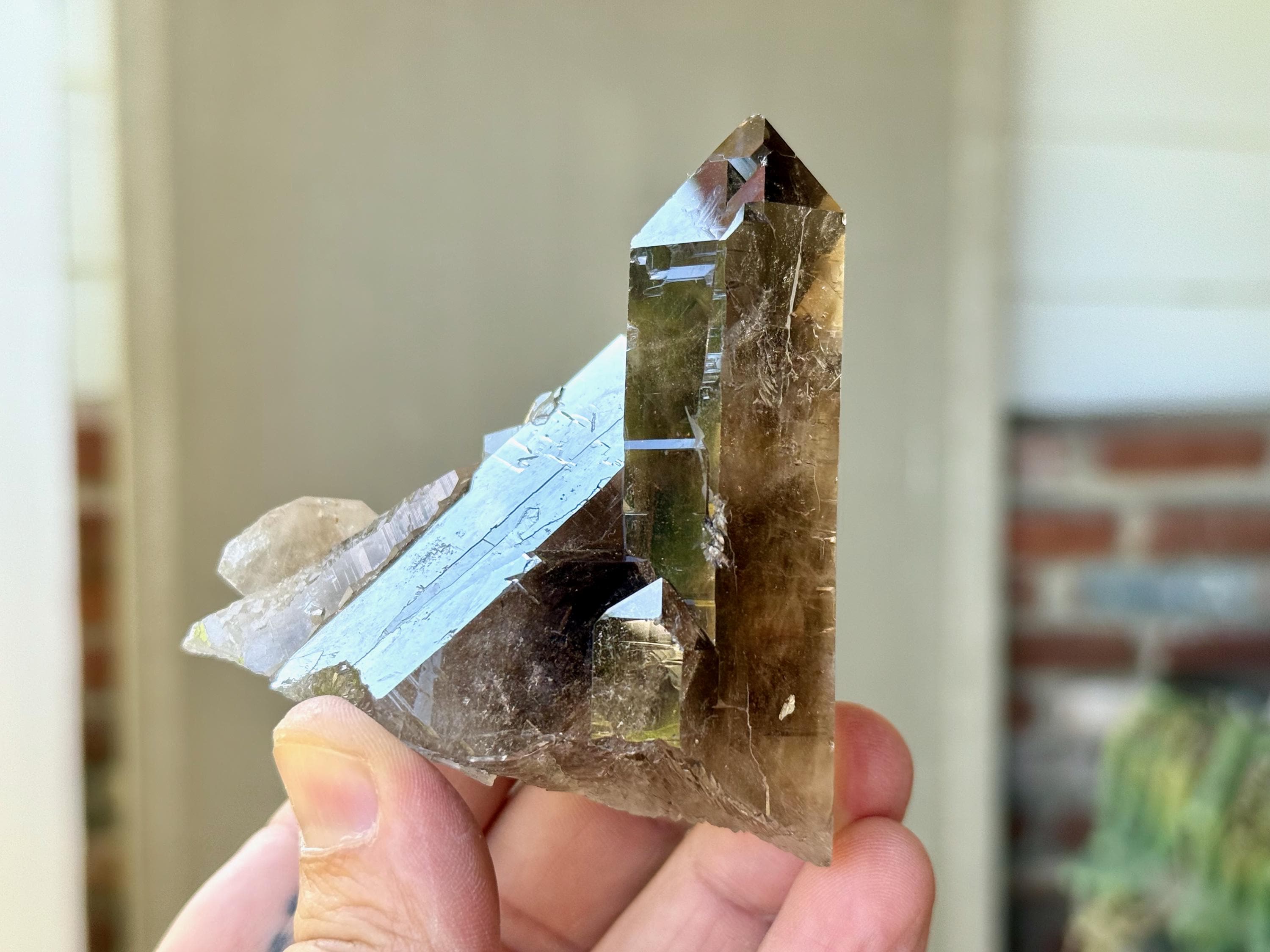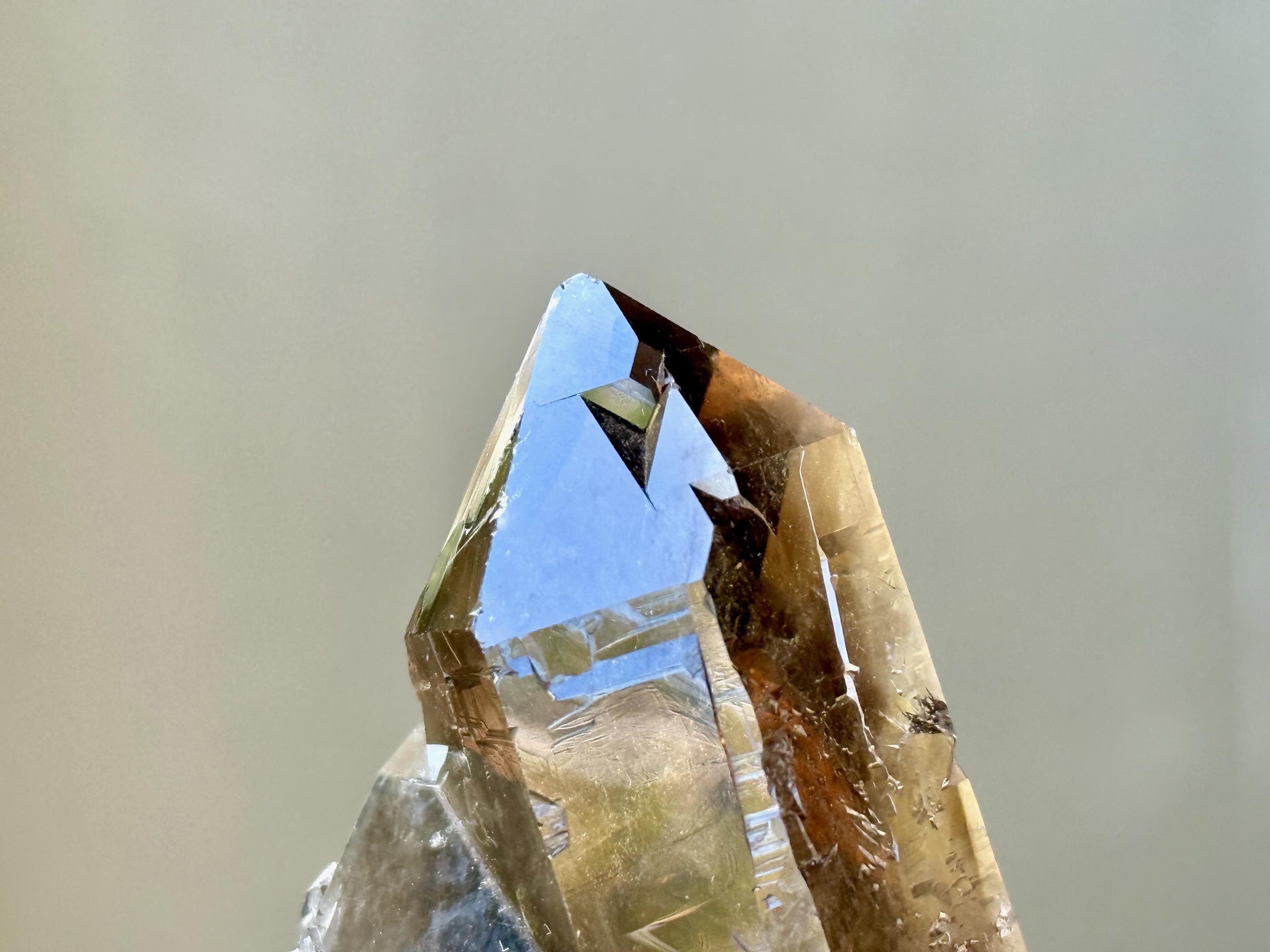 Brilliant luster and a rich smoky hue to this elegant Smoky Cathedral Quartz from Diamantina! This crystal possesses a glassy, vitreous complexion with mild cathedral textures on its sides. On the main facet, we see a deep trigonic imprint (Photo 3). And when backlit, we can see just how beautifully this piece lights up (Photos 9-10).