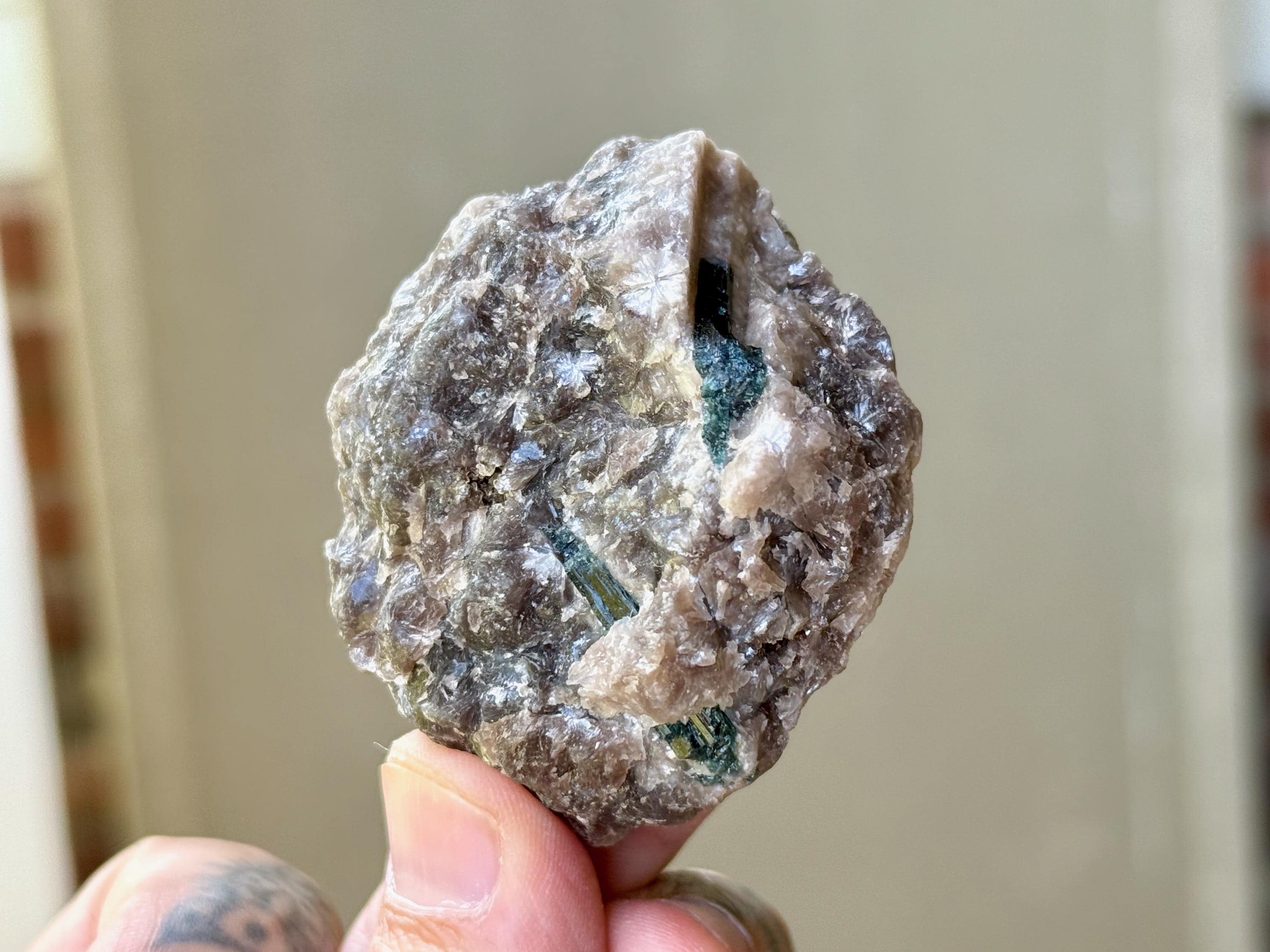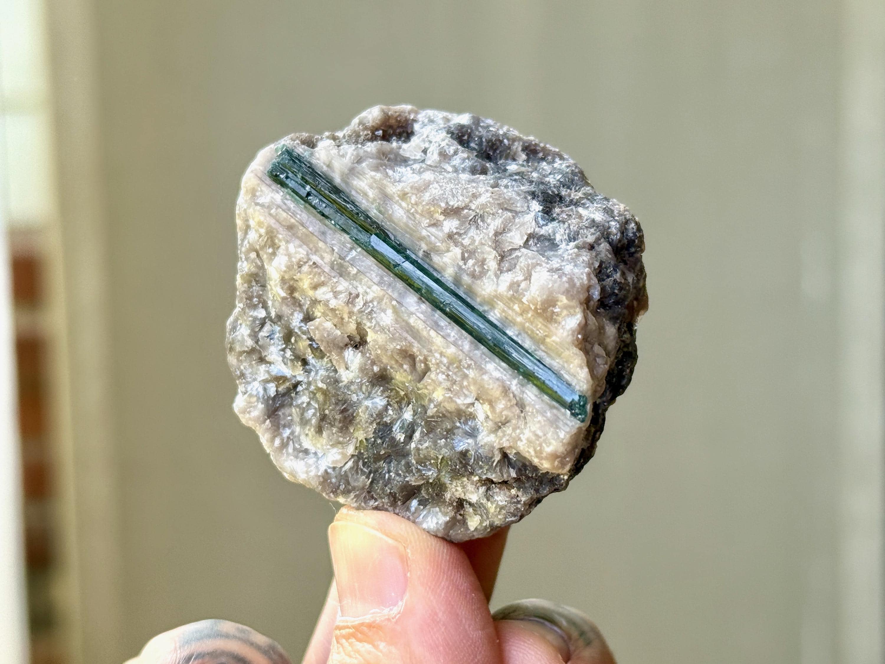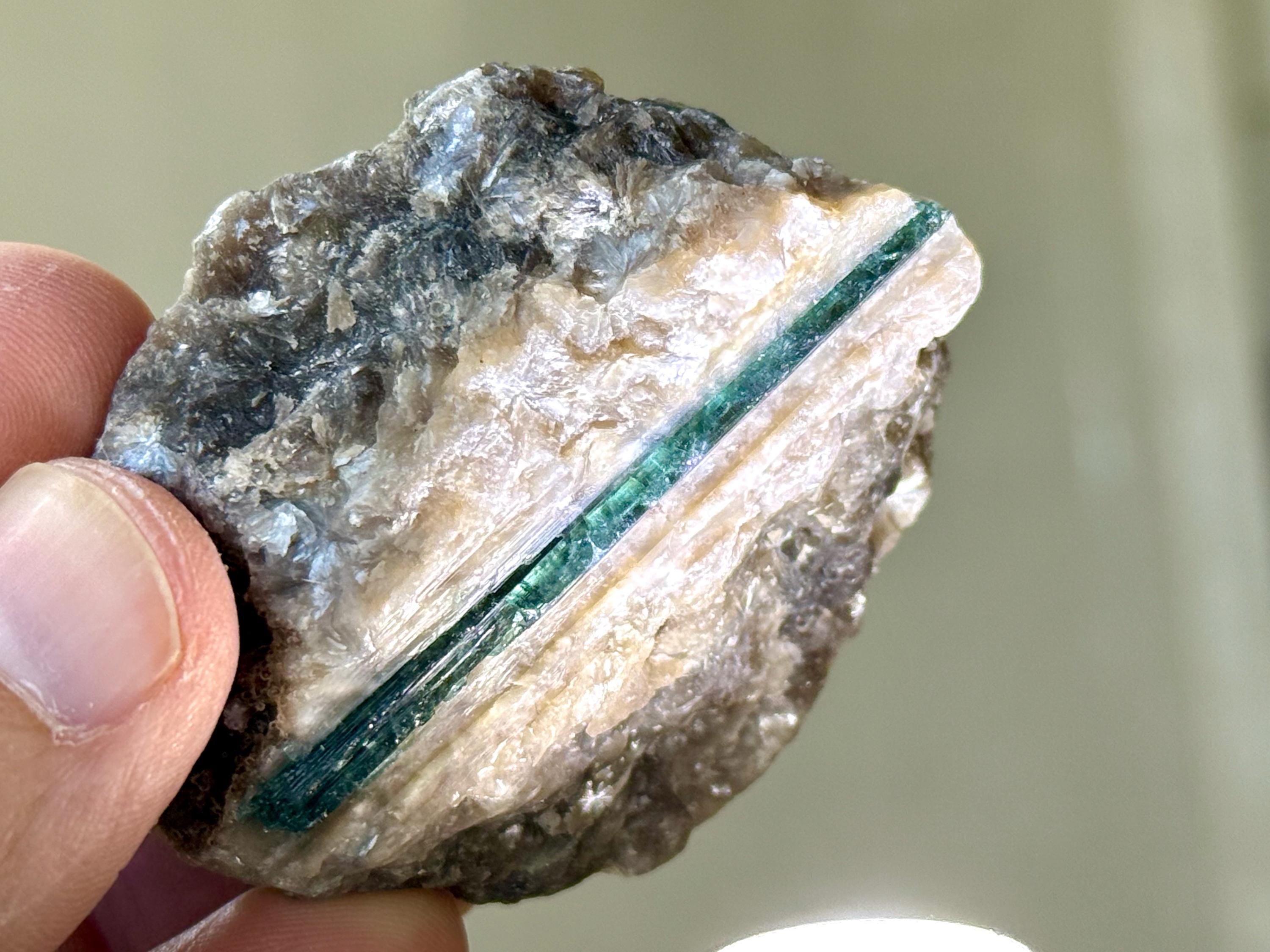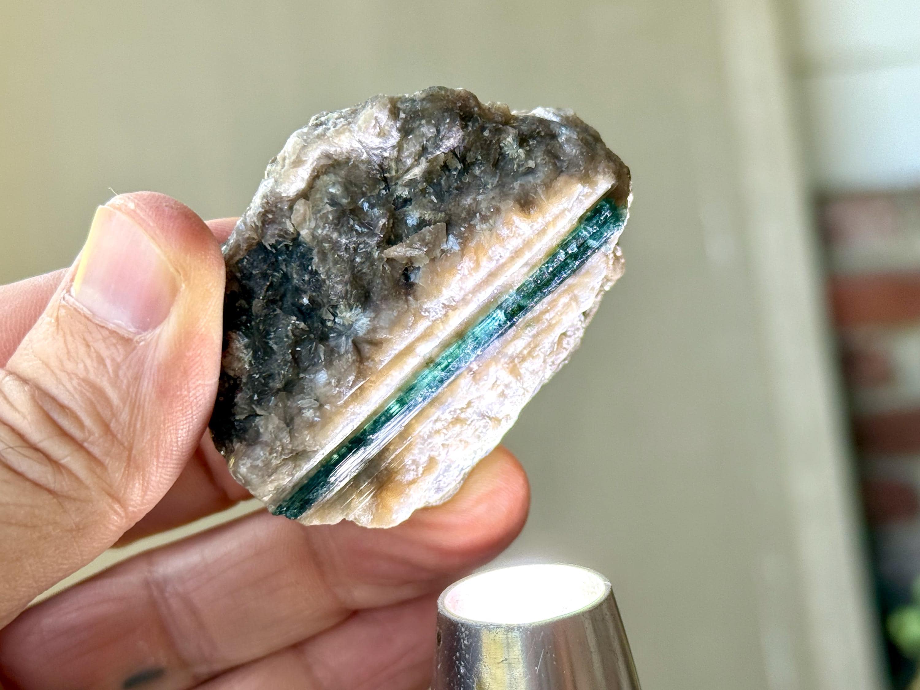This is a wonderful nugget of dense, dark Purple Lepidolite with a long and slender Blue-Green Tourmaline embedded within. It's so long, it runs the entire length of the crystal. It's hard to backlight, but when we shine direct light on it, we can see that its a vibrant blue-green color (Photos 2-3).