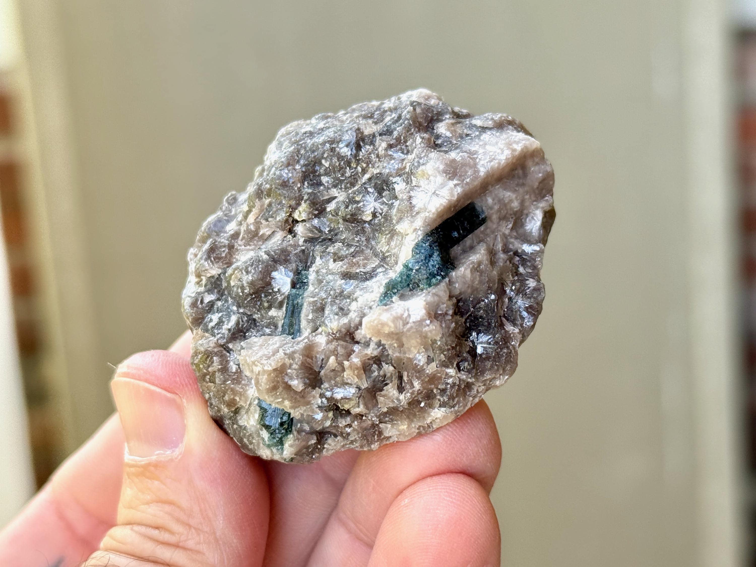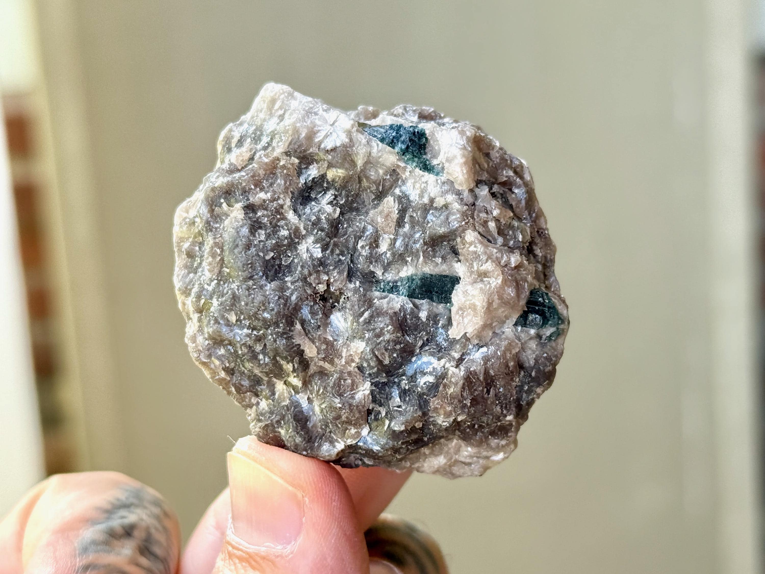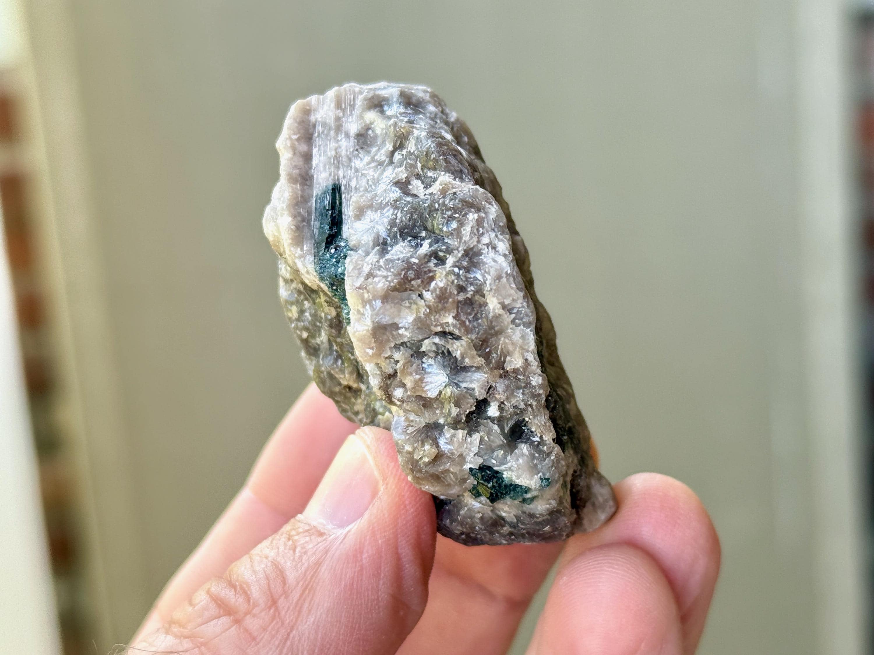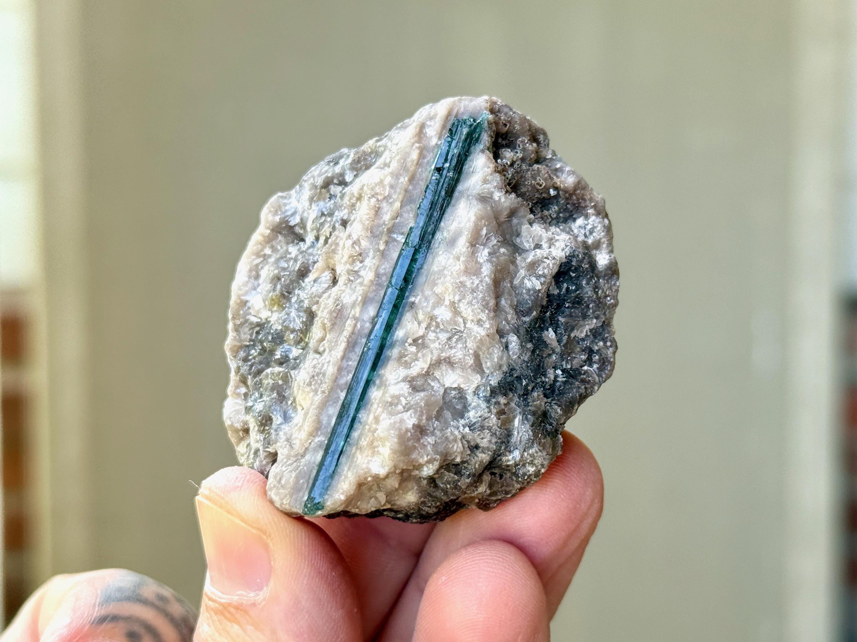 This is a wonderful nugget of dense, dark Purple Lepidolite with a long and slender Blue-Green Tourmaline embedded within. It's so long, it runs the entire length of the crystal. It's hard to backlight, but when we shine direct light on it, we can see that its a vibrant blue-green color (Photos 2-3).