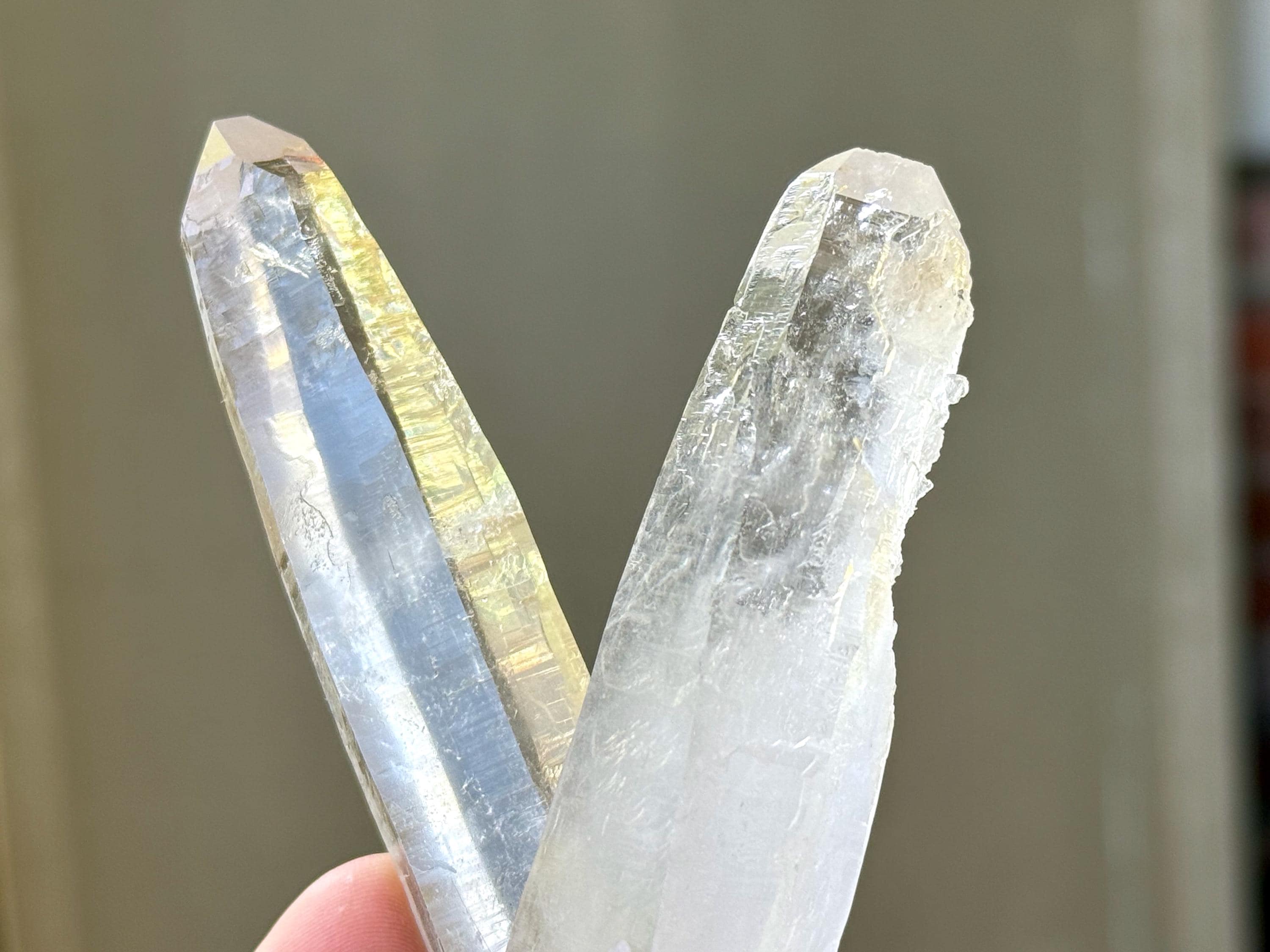 The quality of the Quartz is tremendous with such a glassy, light-bearing quality. The longer, more slender crystal is truly water-clear, while the thicker crystal has a wispy white complexion in the center. There are some mild textures on the exteriors of each one.