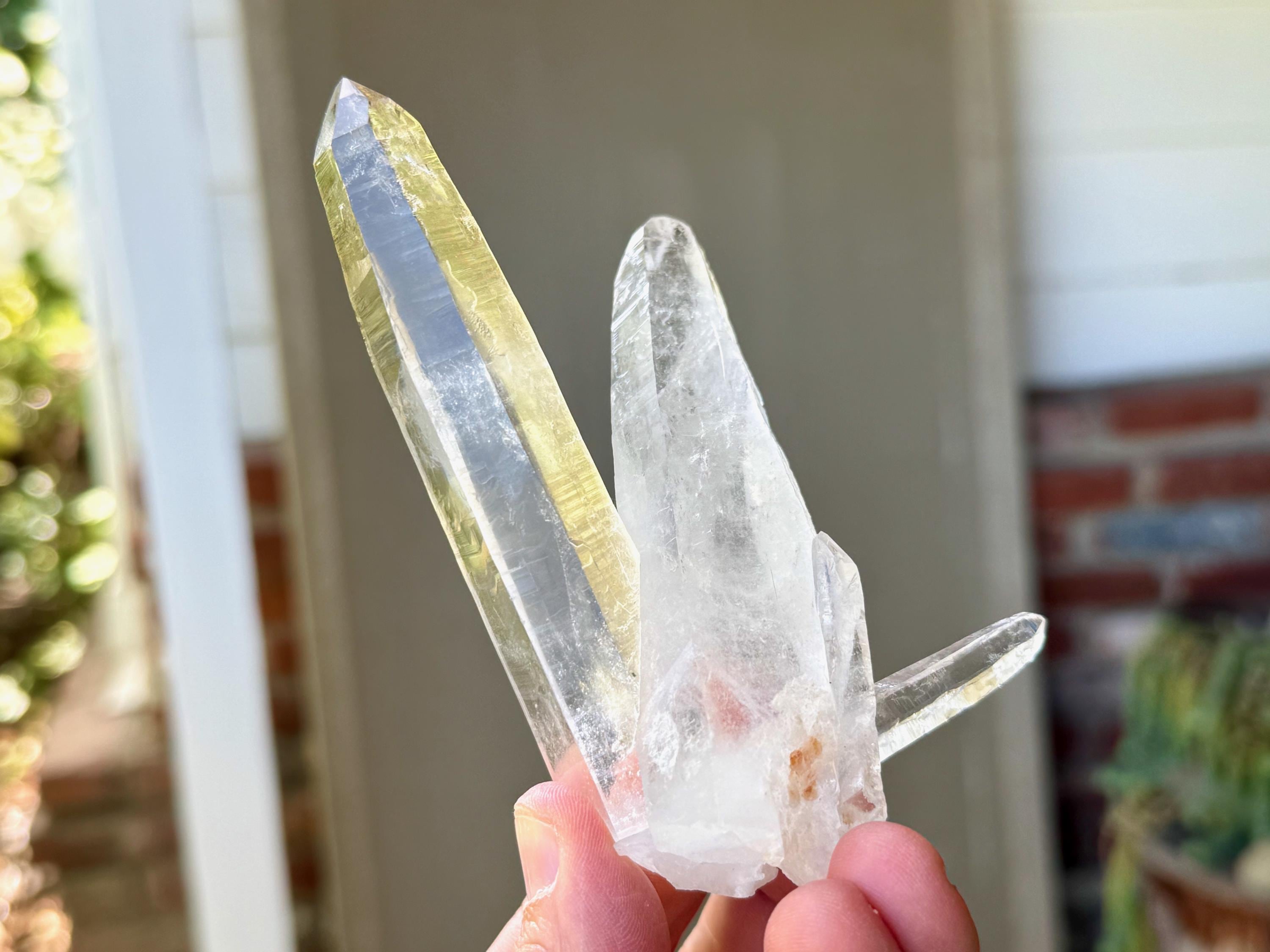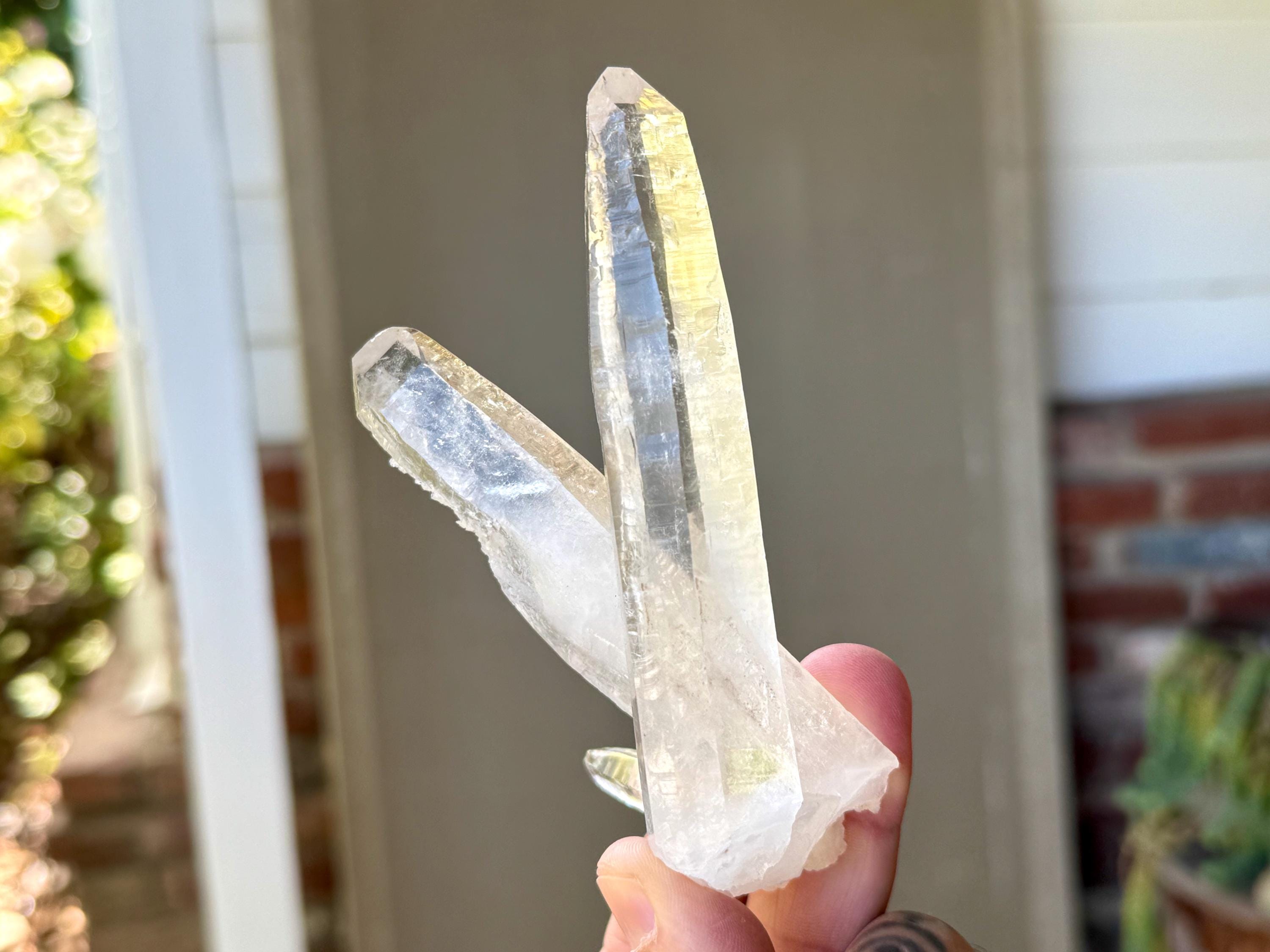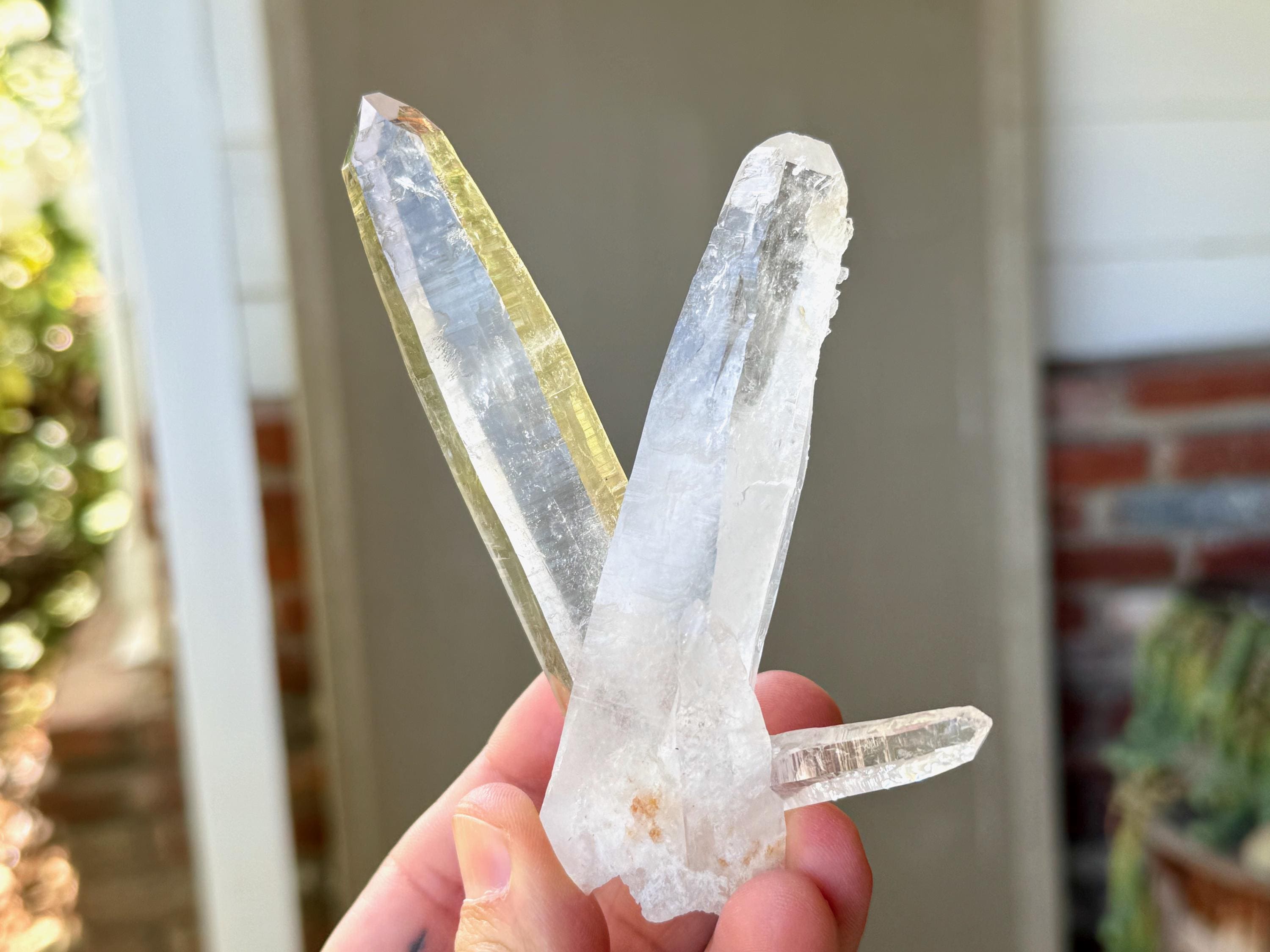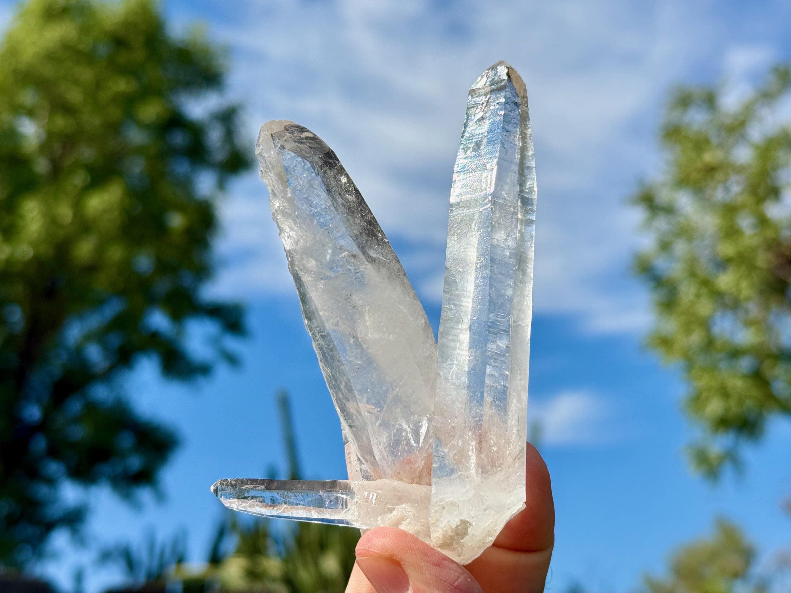 Tremendous, water-clear clarity and outstanding luster to this superb Laser Quartz crystal from Diamantina. This is a beautiful "Twin Flame" formation, with the two primary crystals growing at a "V" angle from one another (see more on this below). Attached at the base is a smaller "child" crystal. It's a wonderful familial formation!