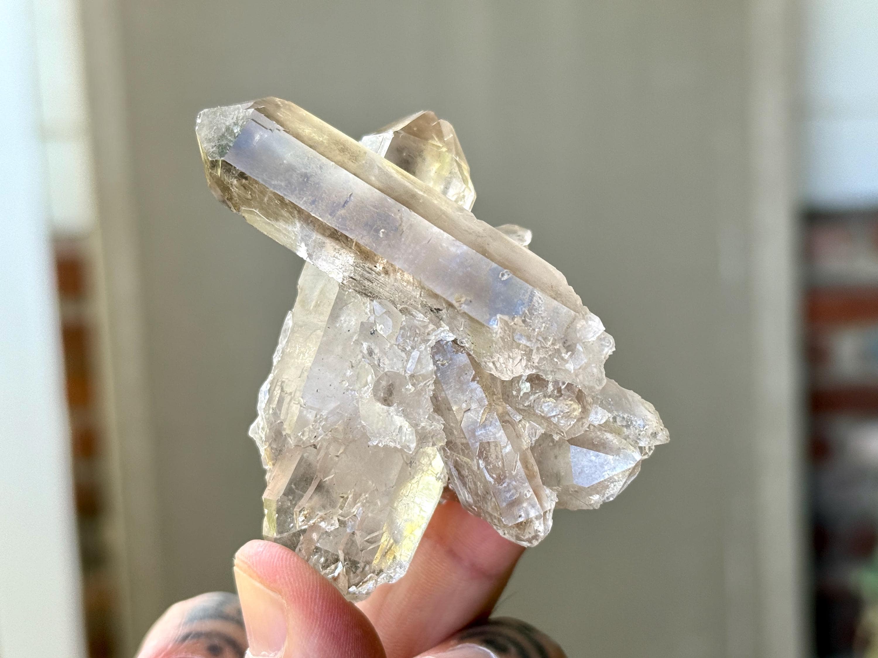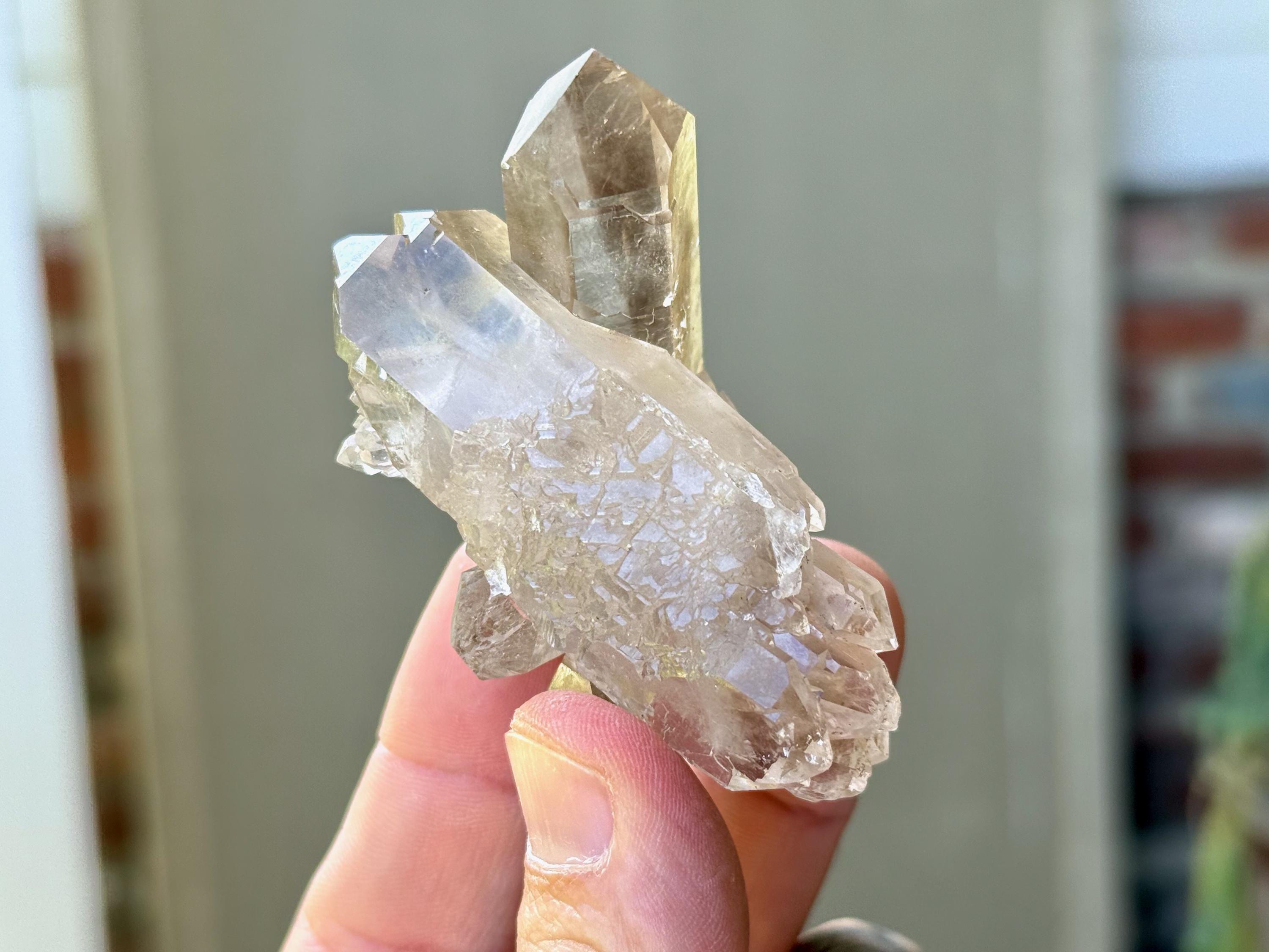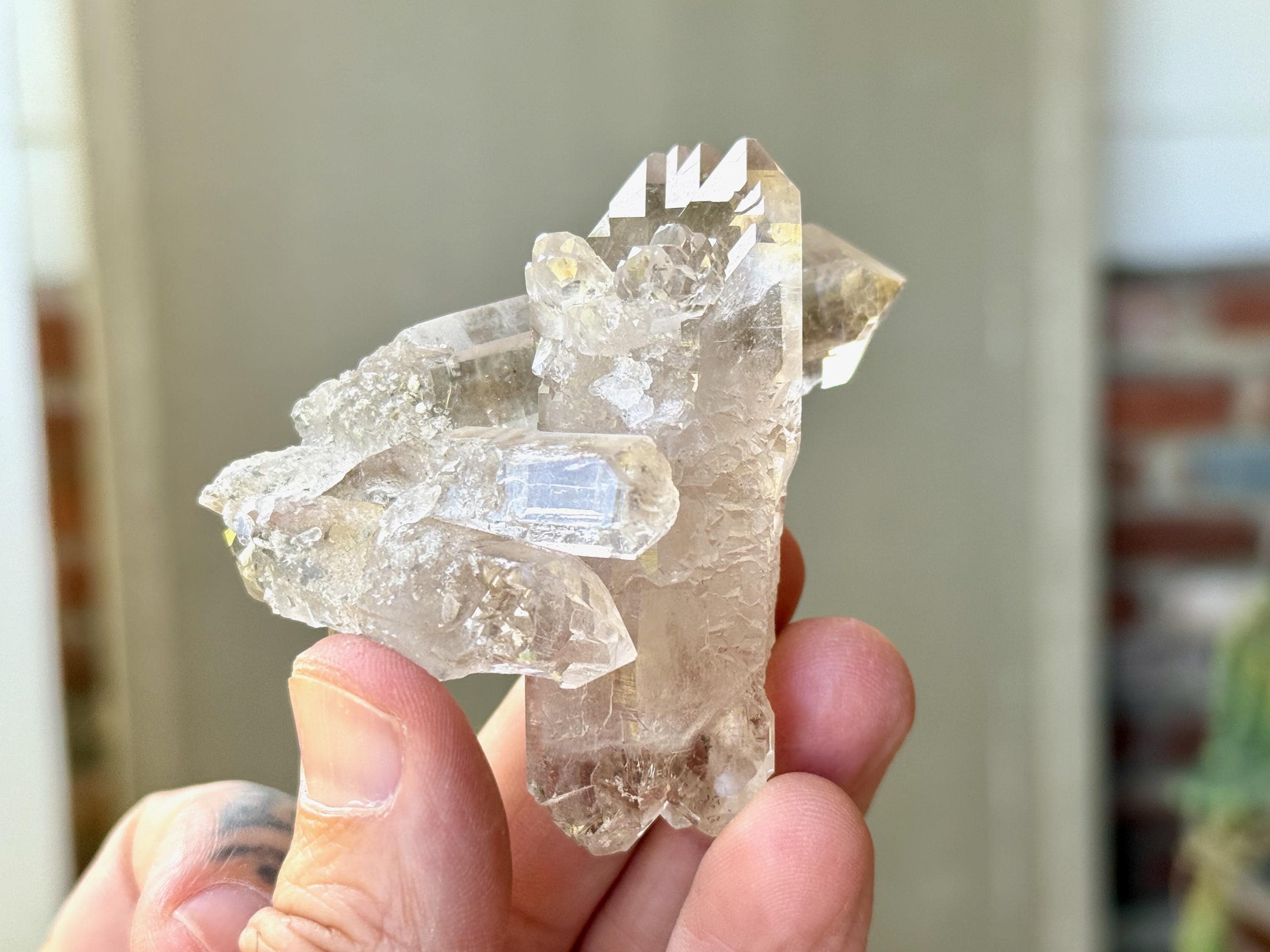 Brilliant luster, outstanding clarity and a mild smoky hue to this stunning Cathedral Quartz cluster. This is a unique formation of interlocking crystals that forms a bit of a "tripod" formation, allowing it to sit nicely on its own for display.