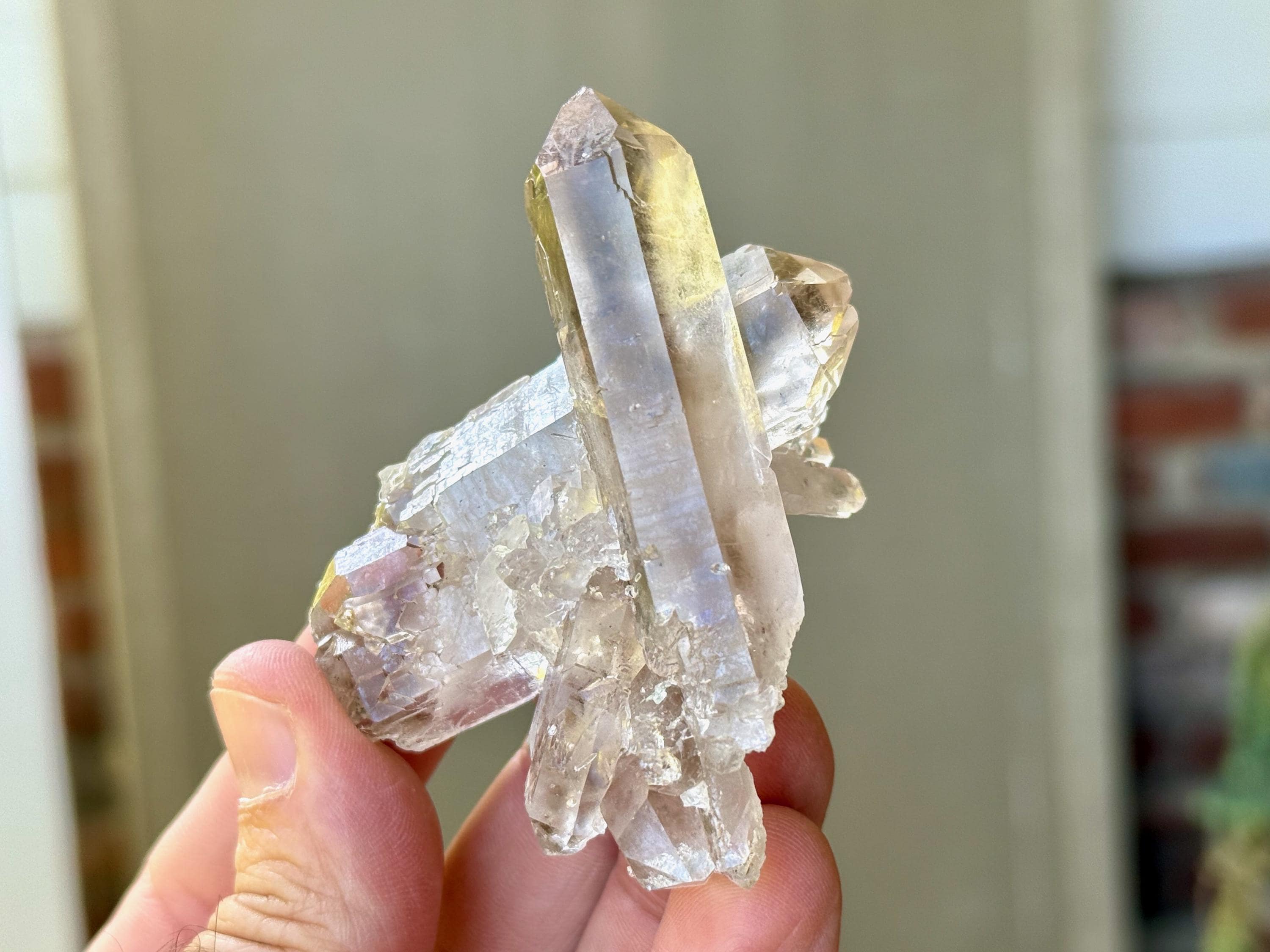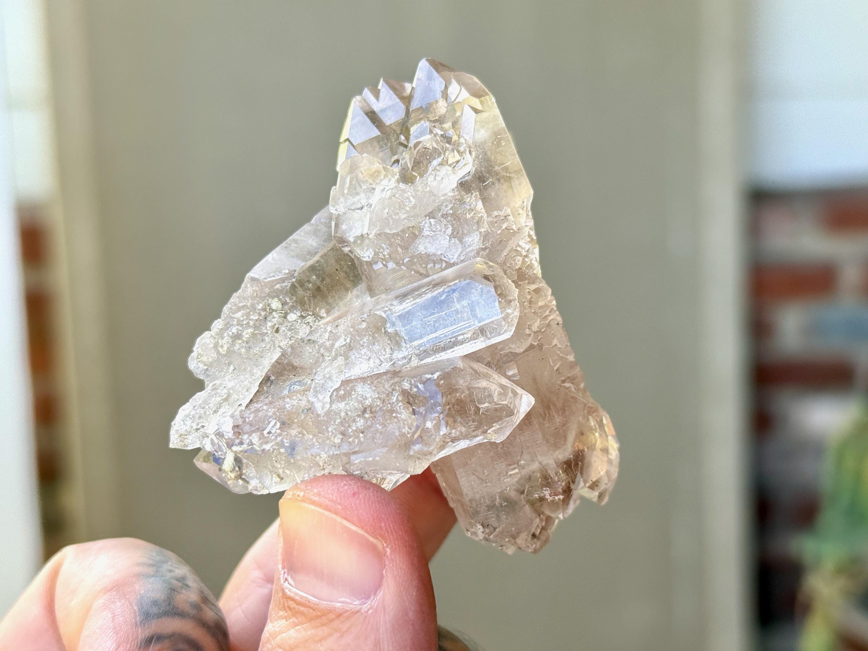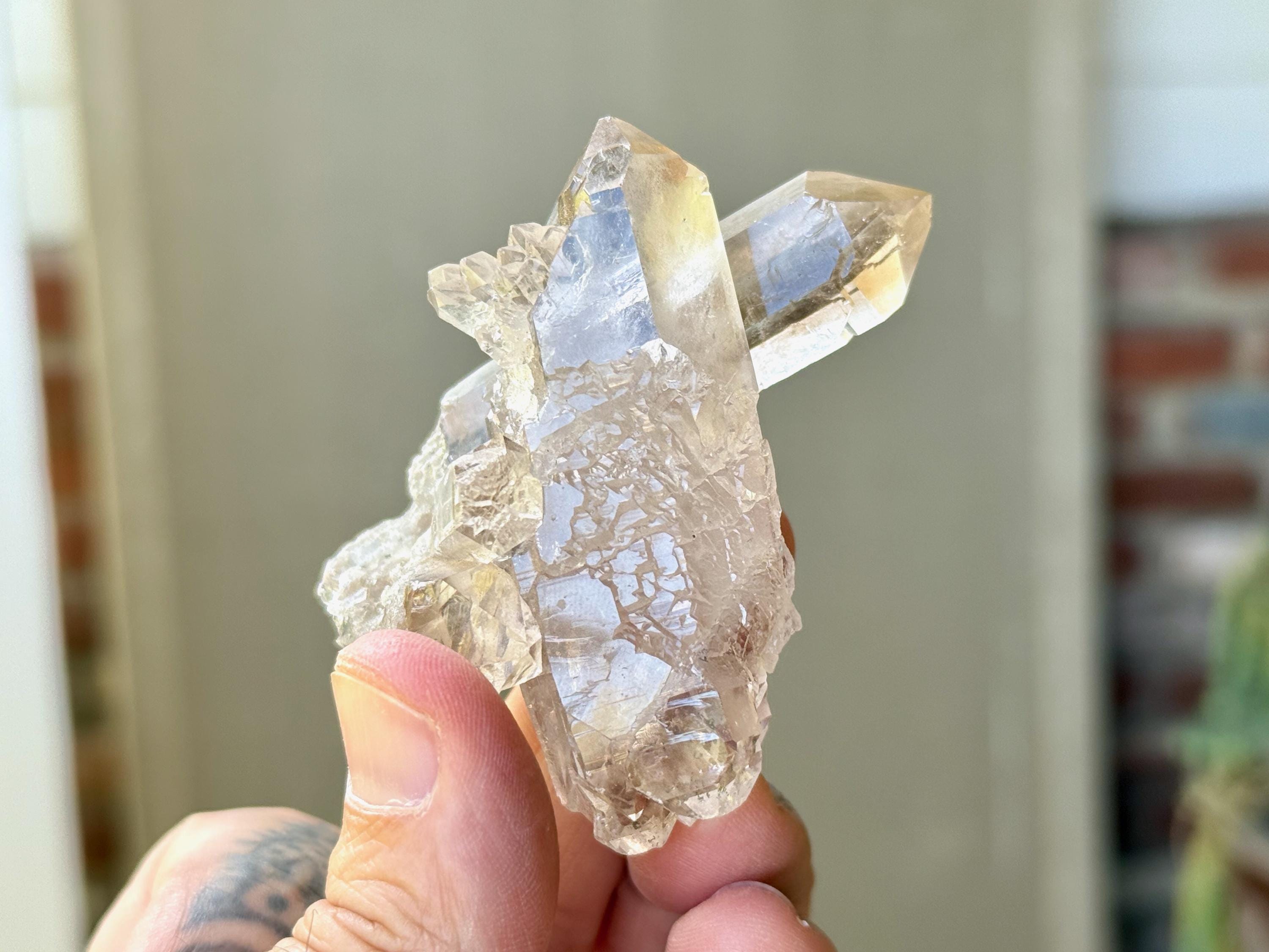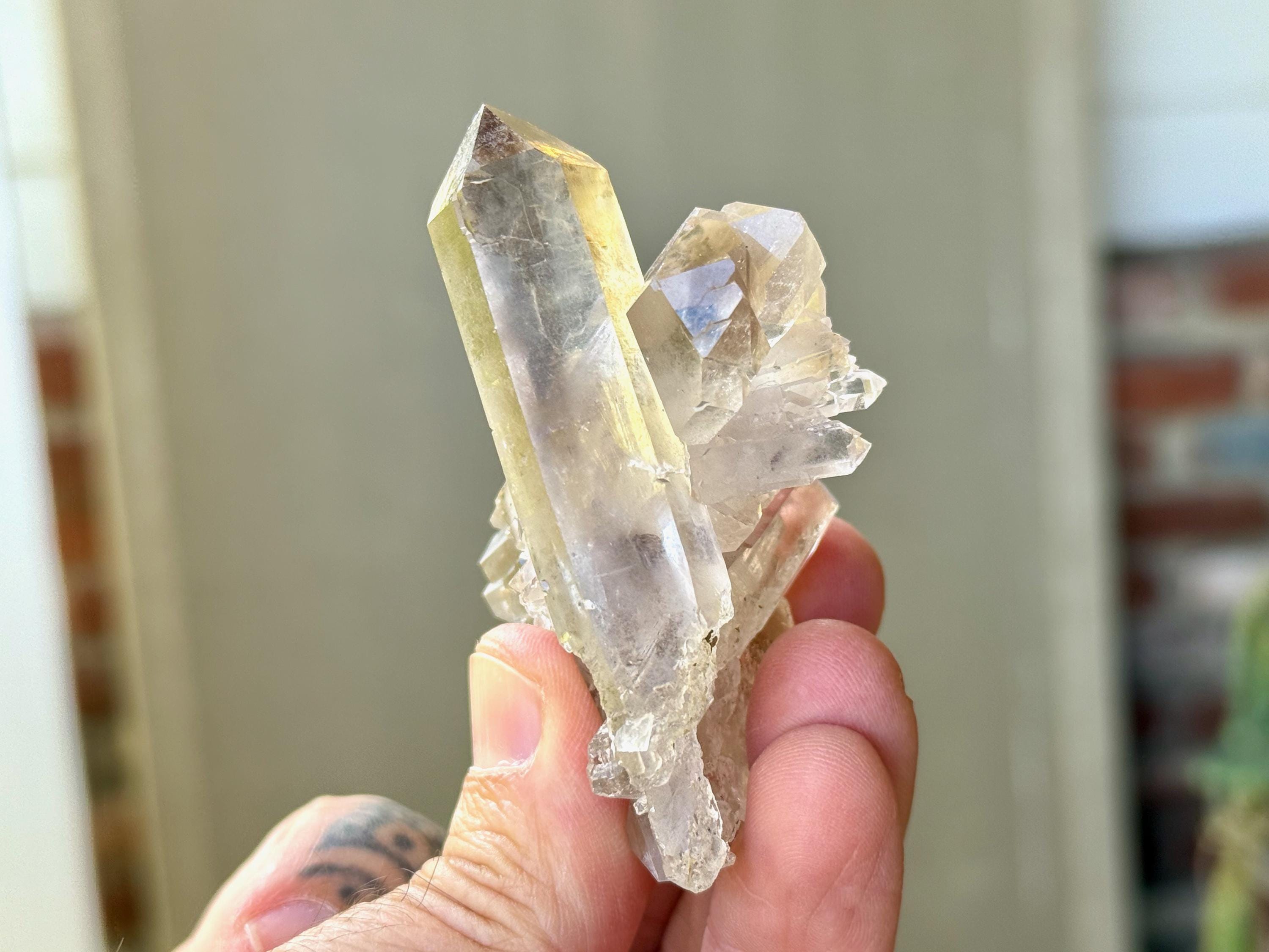Brilliant luster, outstanding clarity and a mild smoky hue to this stunning Cathedral Quartz cluster. This is a unique formation of interlocking crystals that forms a bit of a "tripod" formation, allowing it to sit nicely on its own for display.