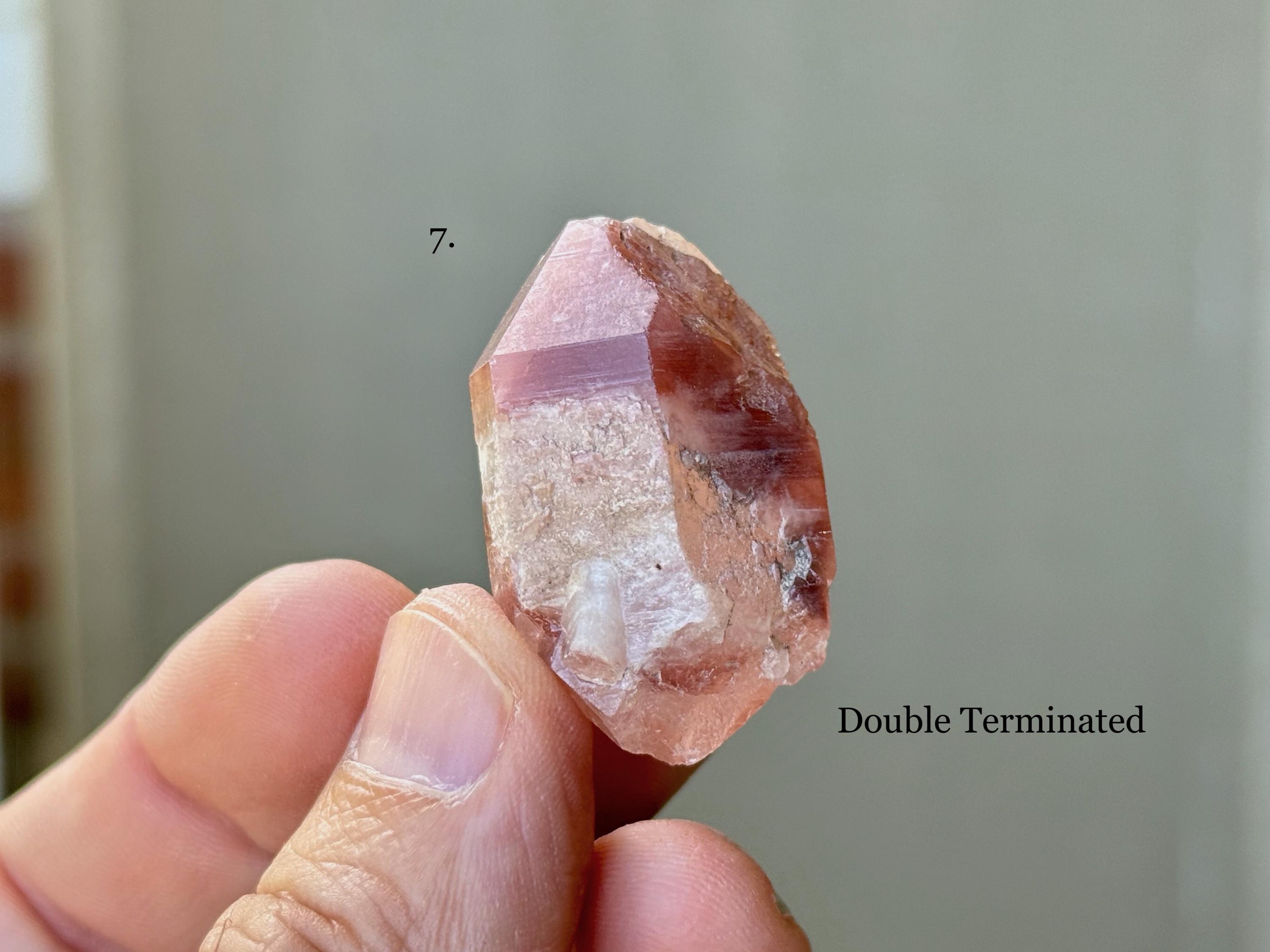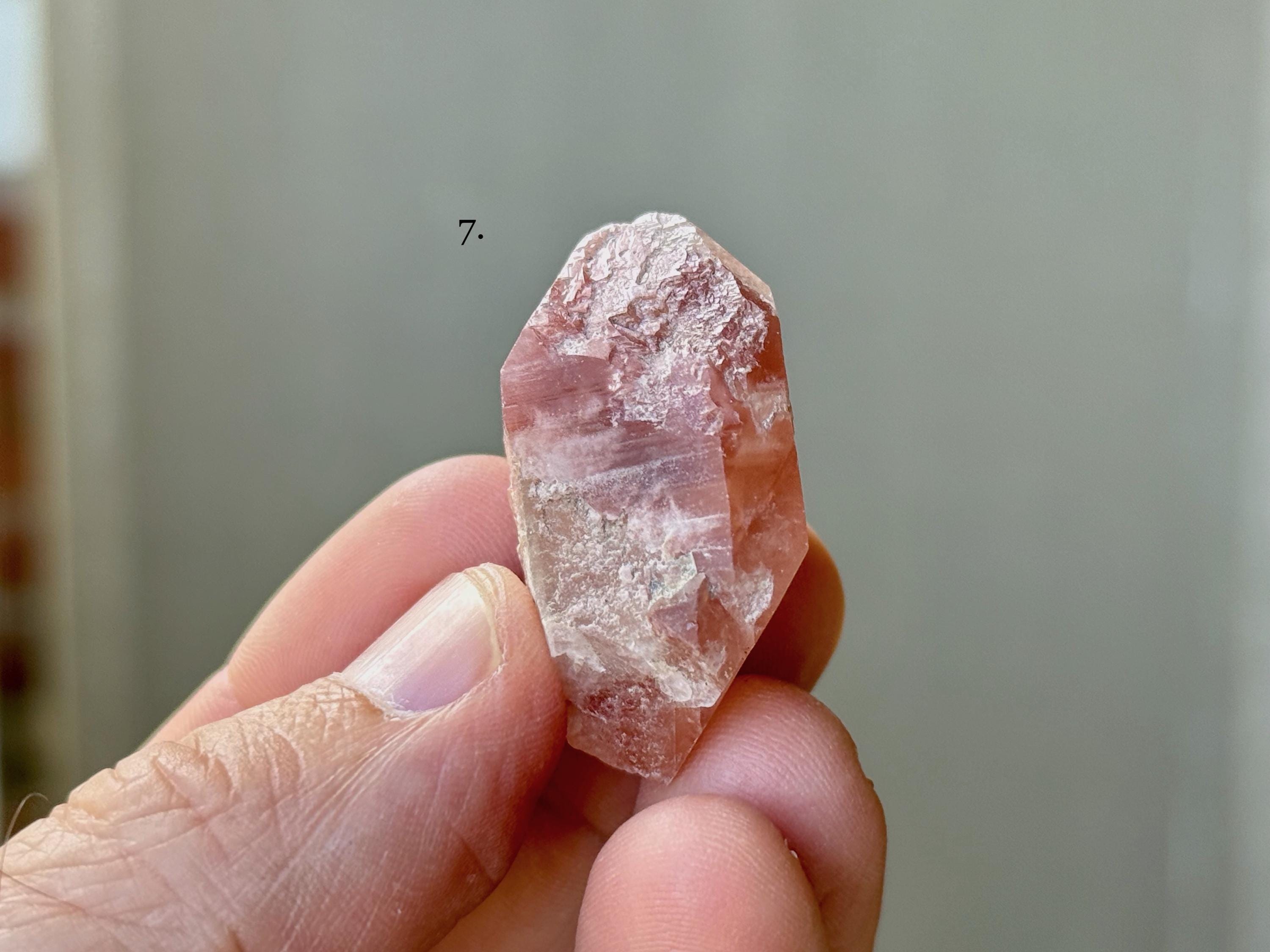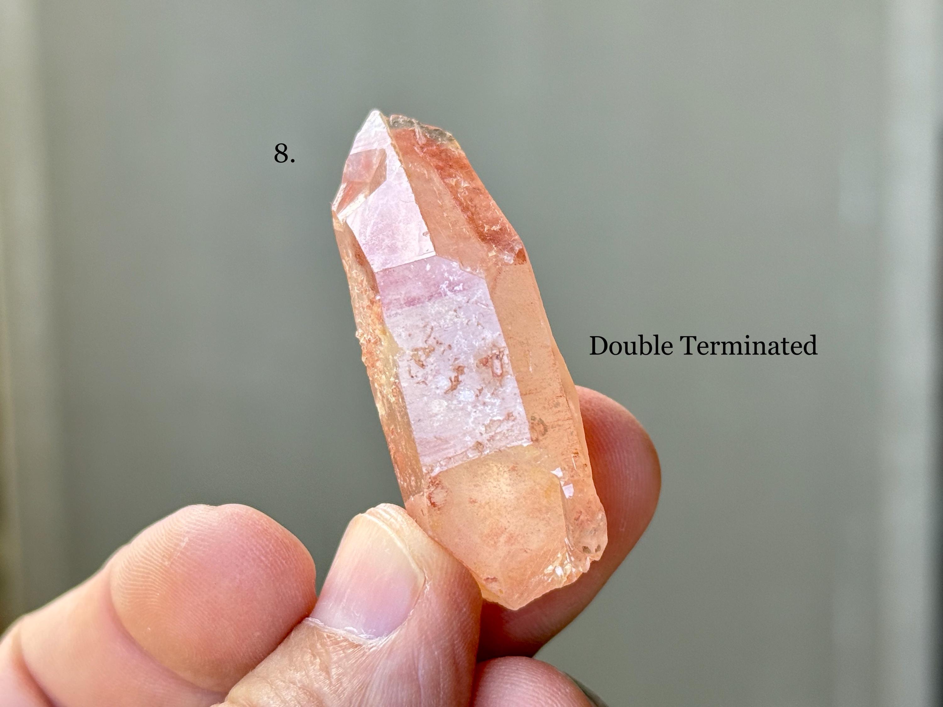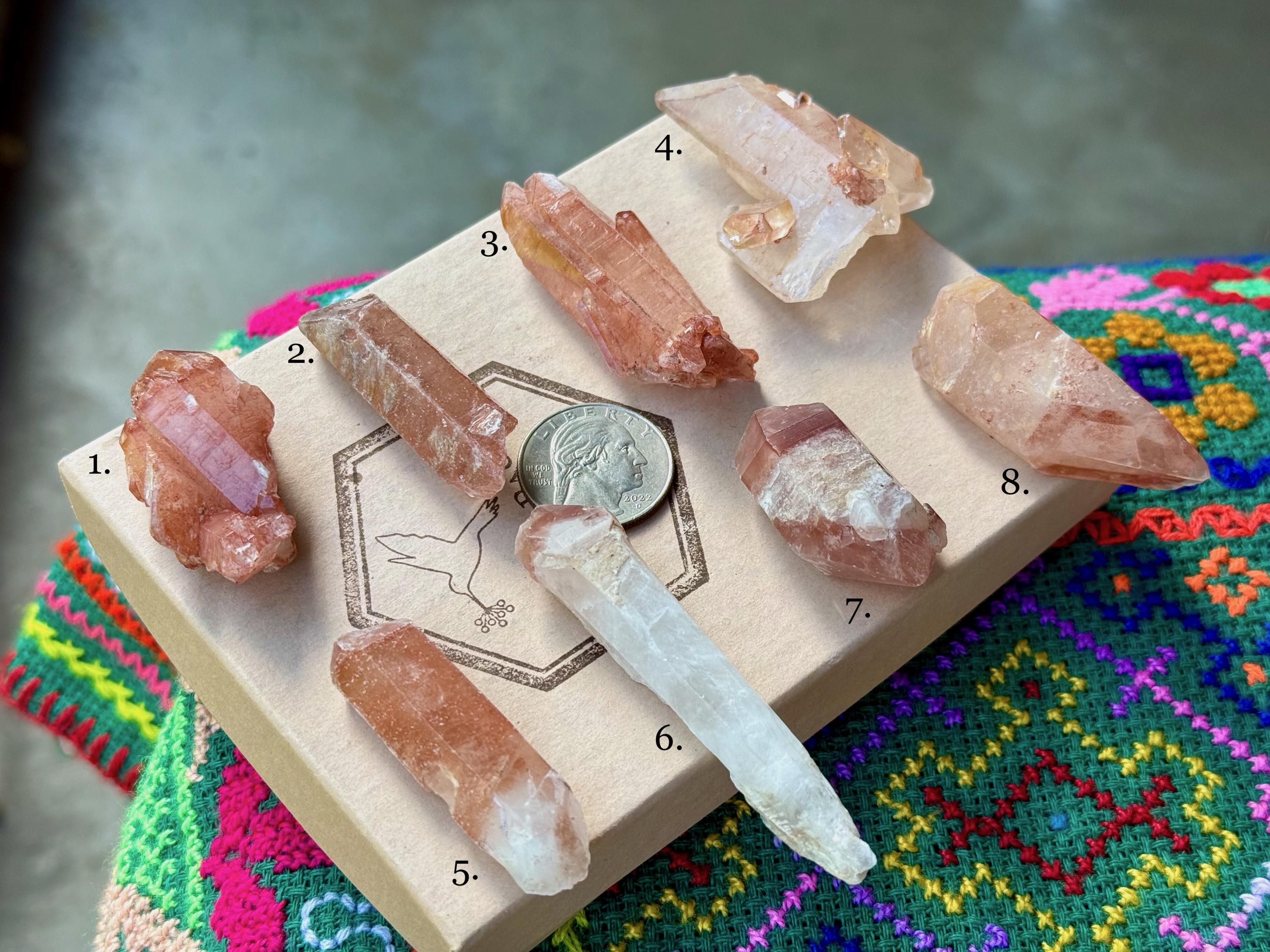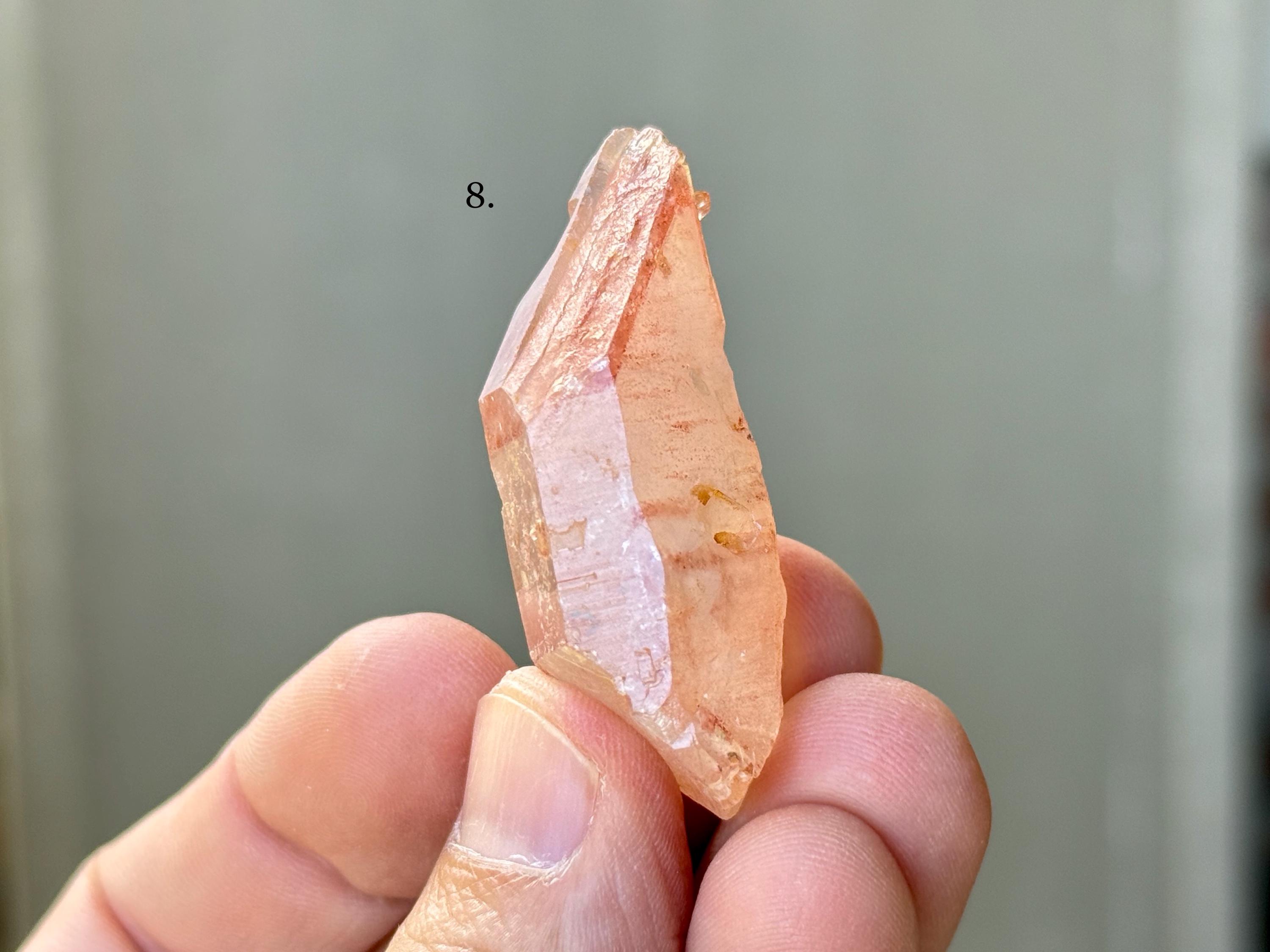 A gorgeous collection of Pink Lithium Quartz points! Simply select the crystal(s) of your preference from the dropdown menu (#1-8). The crystals are numbered in Photo 1, as well as in each subsequent photo. Each photo in the dropdown correlates to the actual crystal purchased.