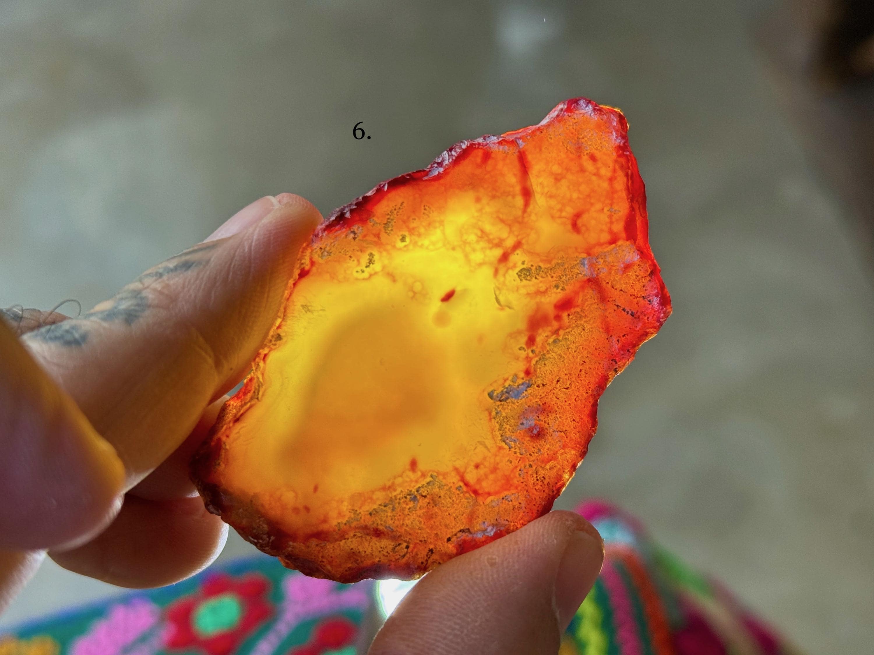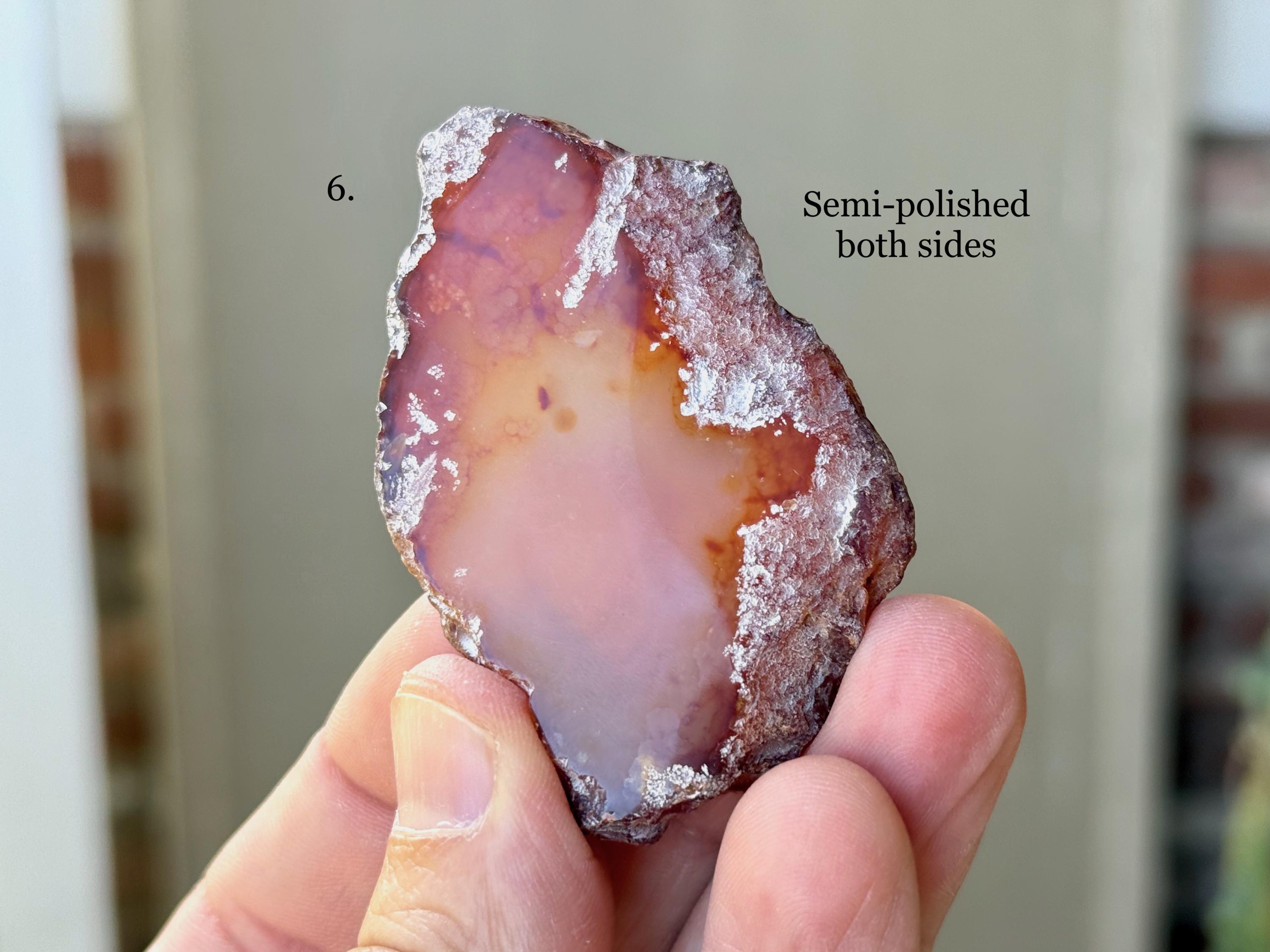 Magnificent, gradient colors to these unique Carnelian Agates with broad front sides and natural formations. Each of these crystals have been polished on their front sides with the sides and backs left natural (note: 5 & 6 are also polished on back, as indicated in photos).