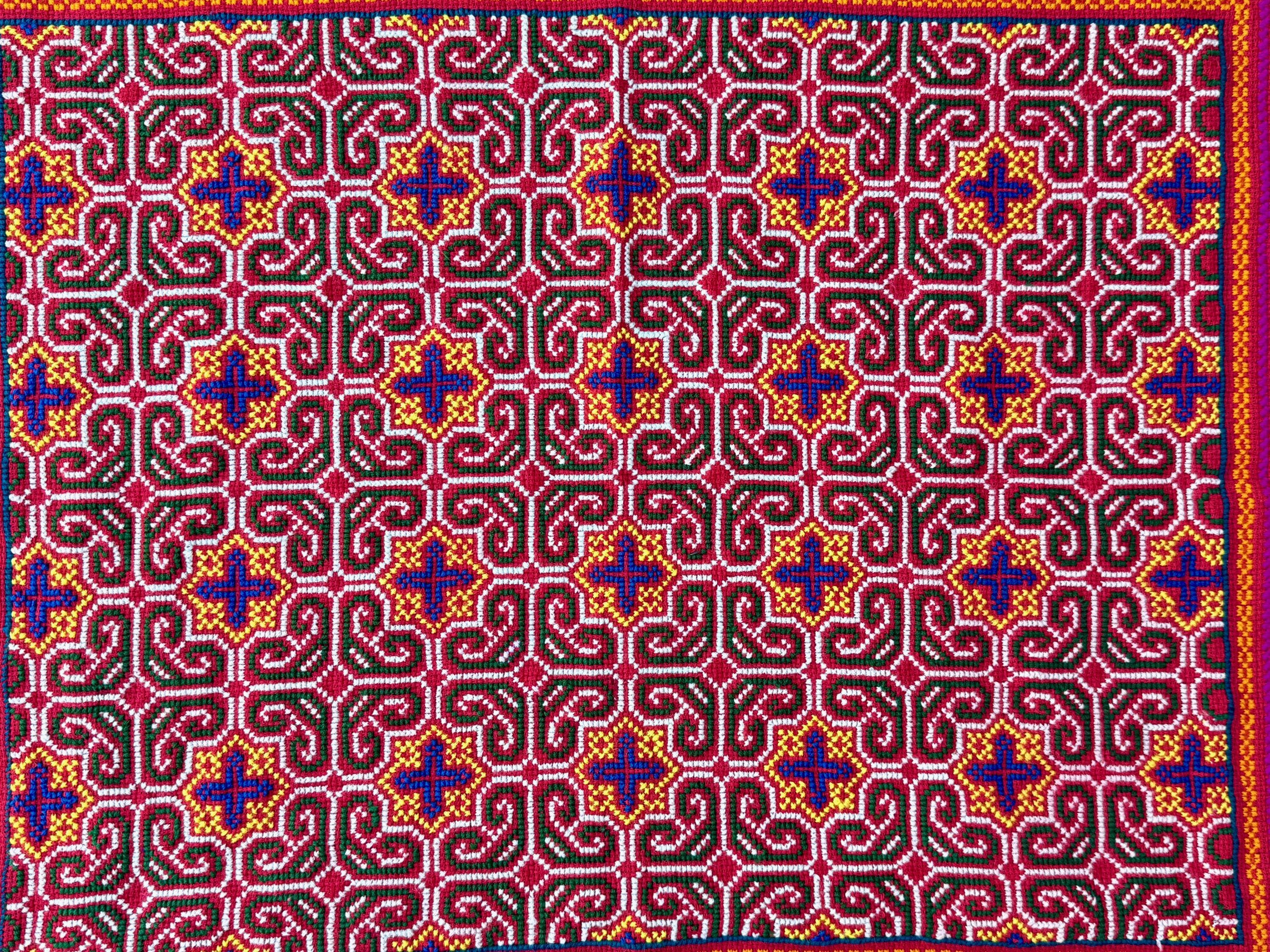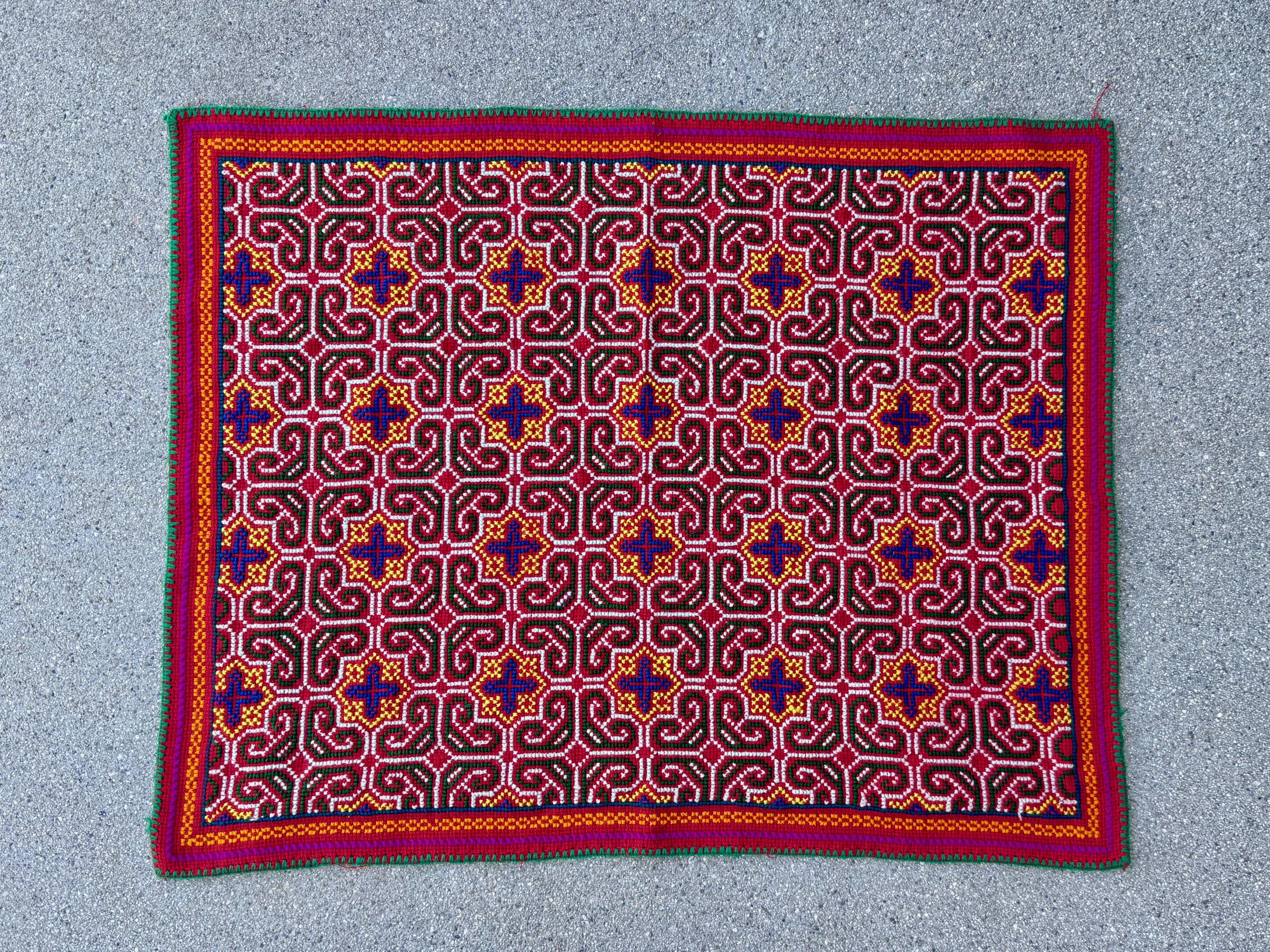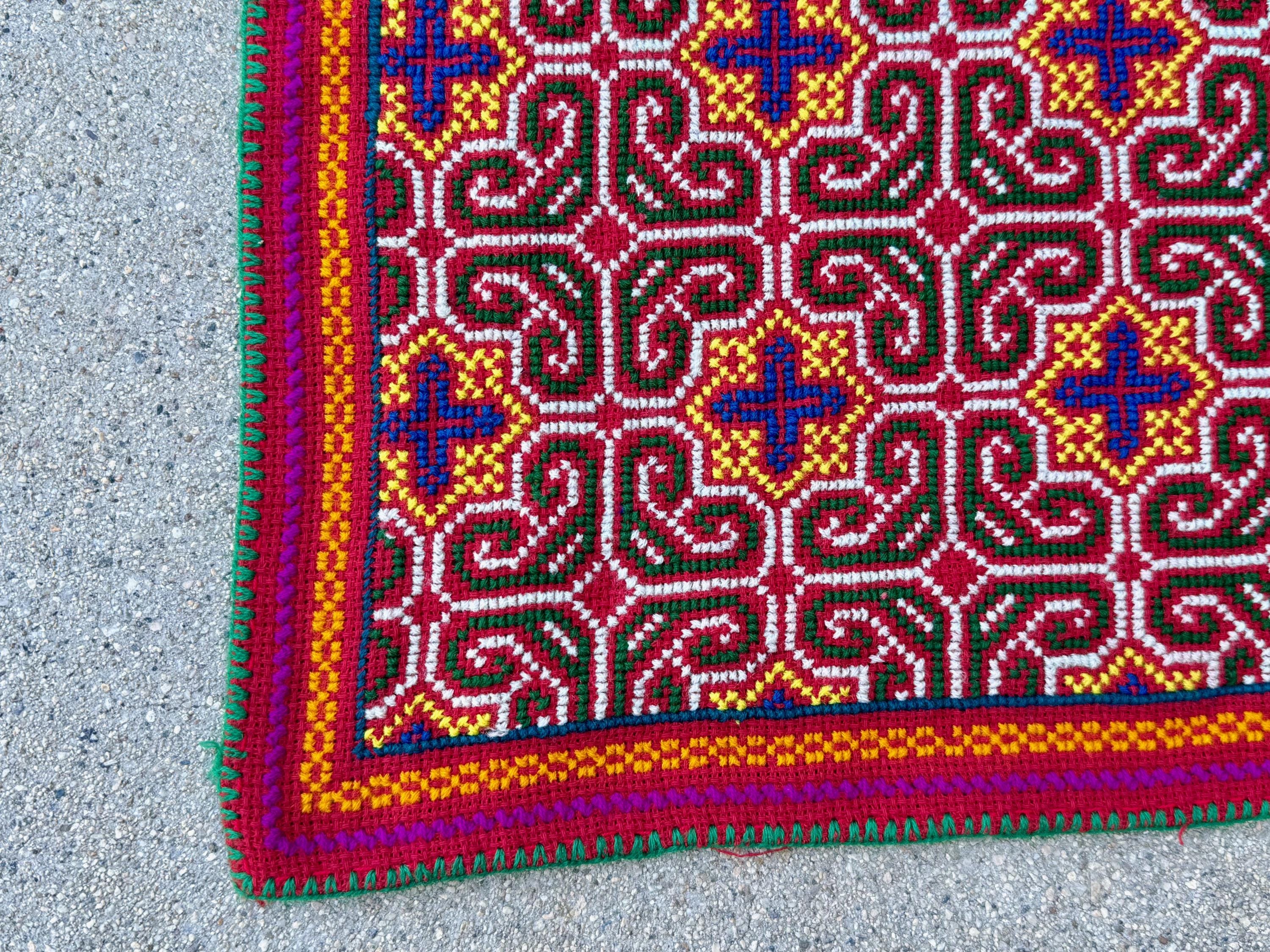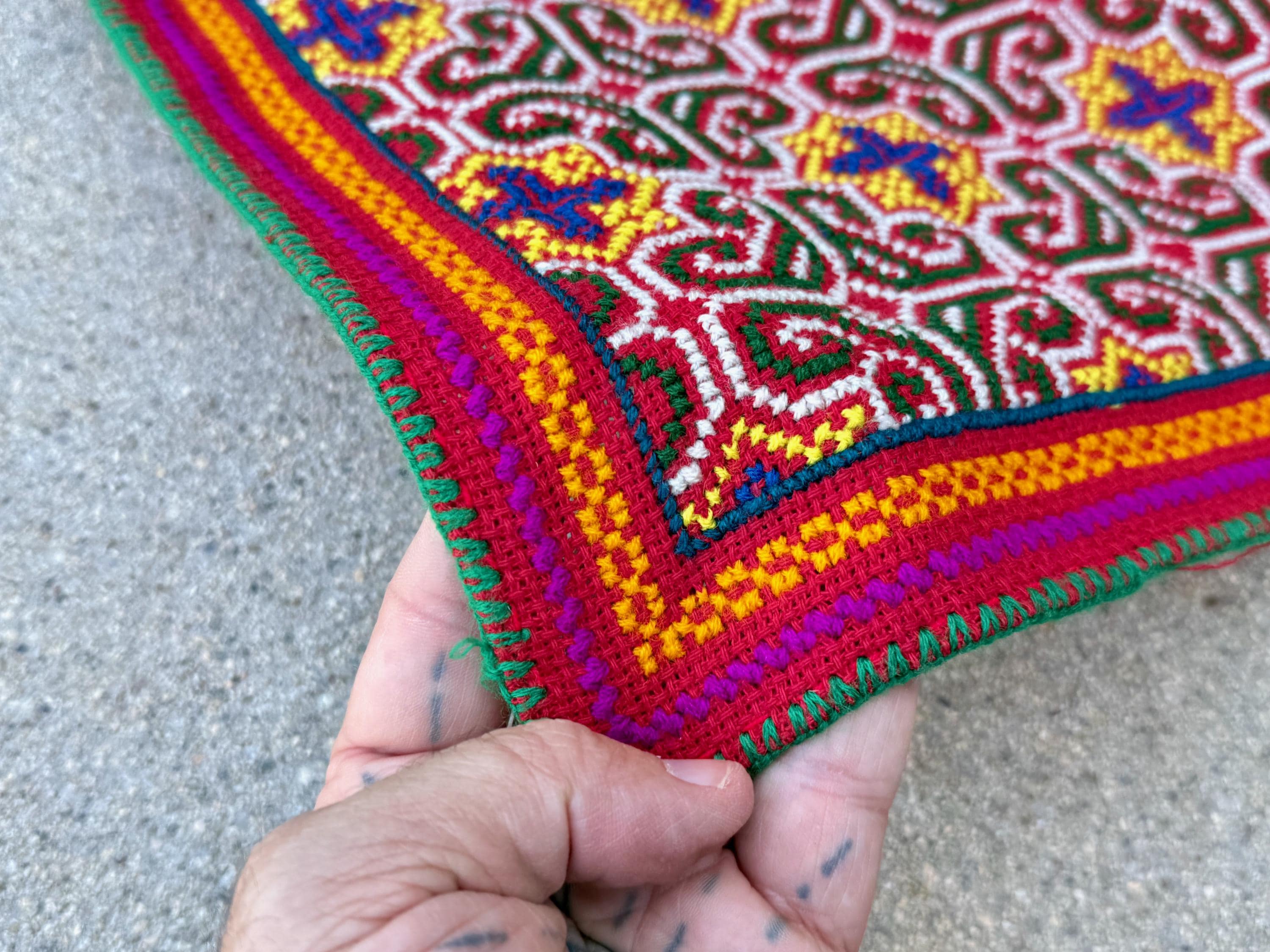 Brilliant, fiery colors to this exquisite manta cloth featuring an intricate design of "swirling" and "cross" patterning. We love the bright red background and the colorful embroidery that spans the entire piece.