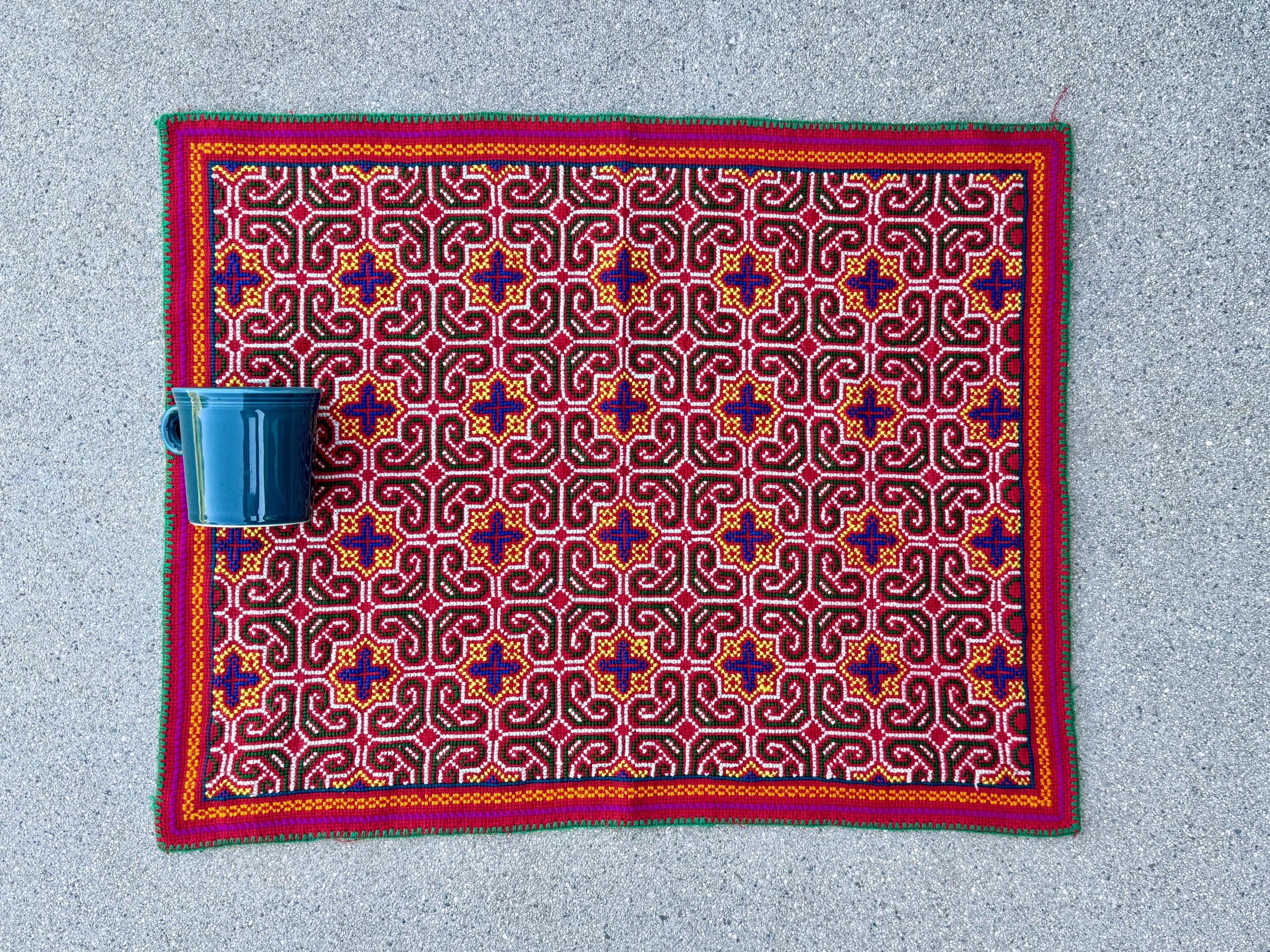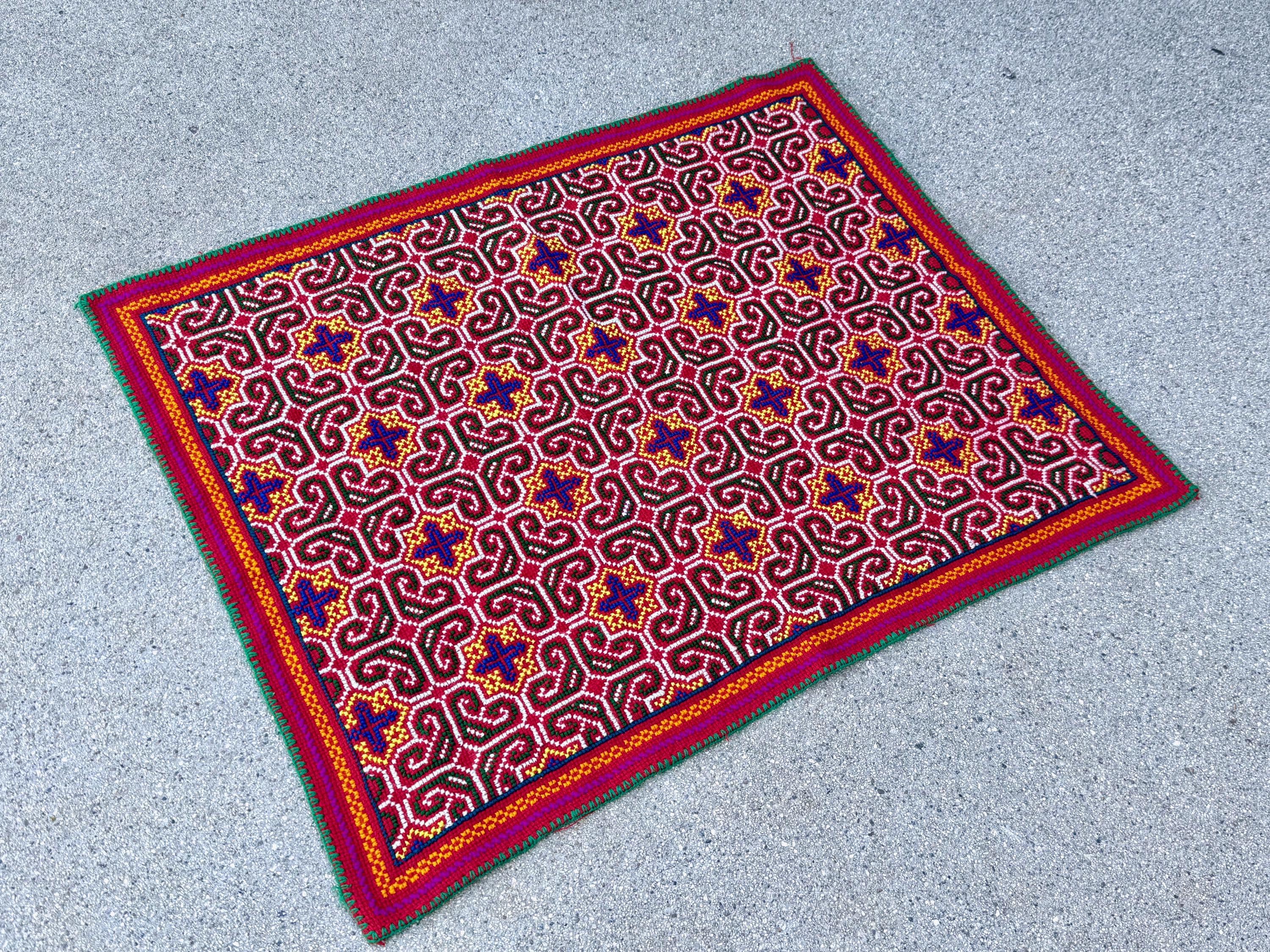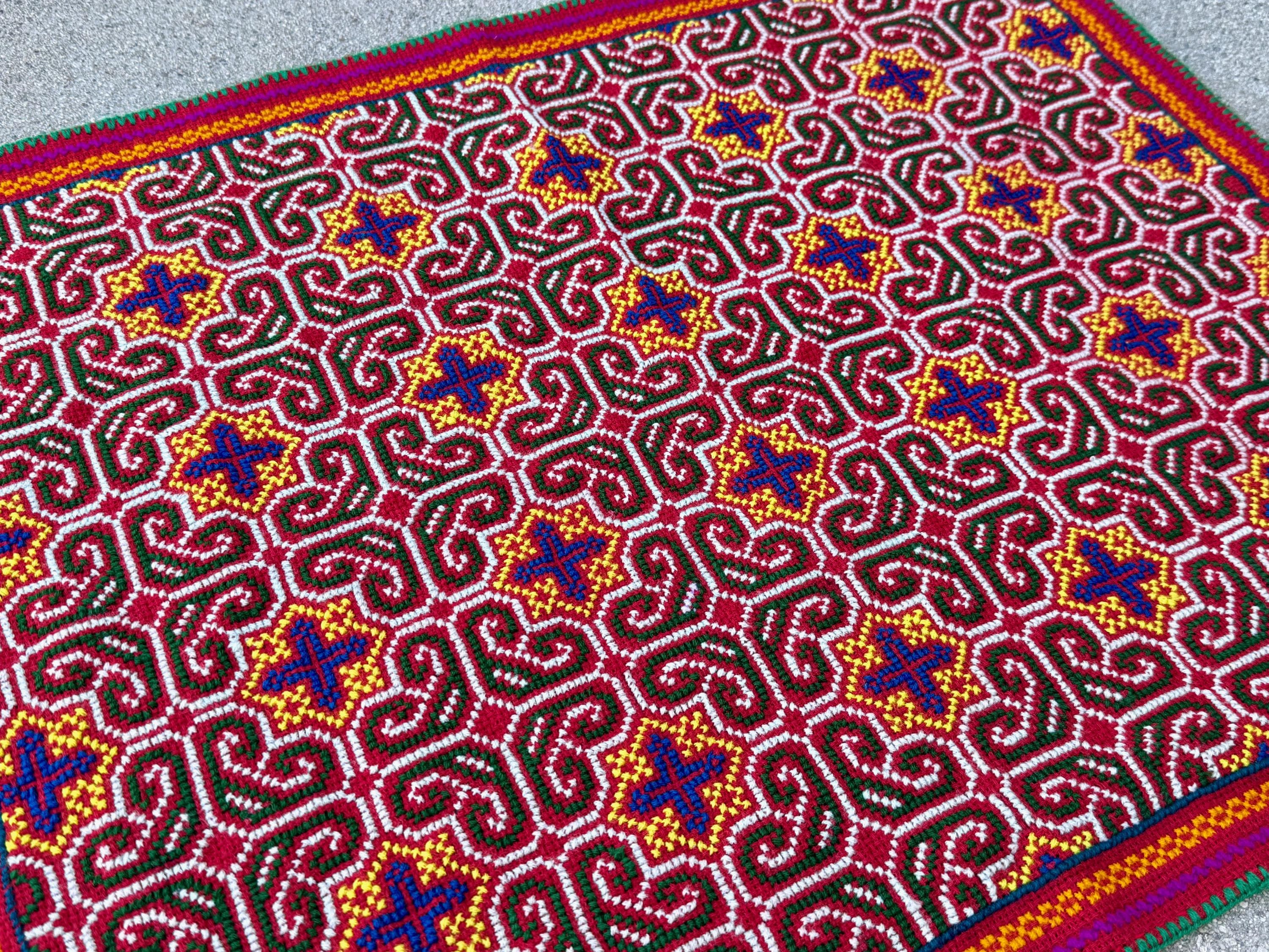 The cloth itself is a cotton base, thin but durable, unlike some of the synthetic base cloths sometimes utilized for these cloths. It's a medium size, ideal for plant medicine ceremony or home mesa. Gorgeous!