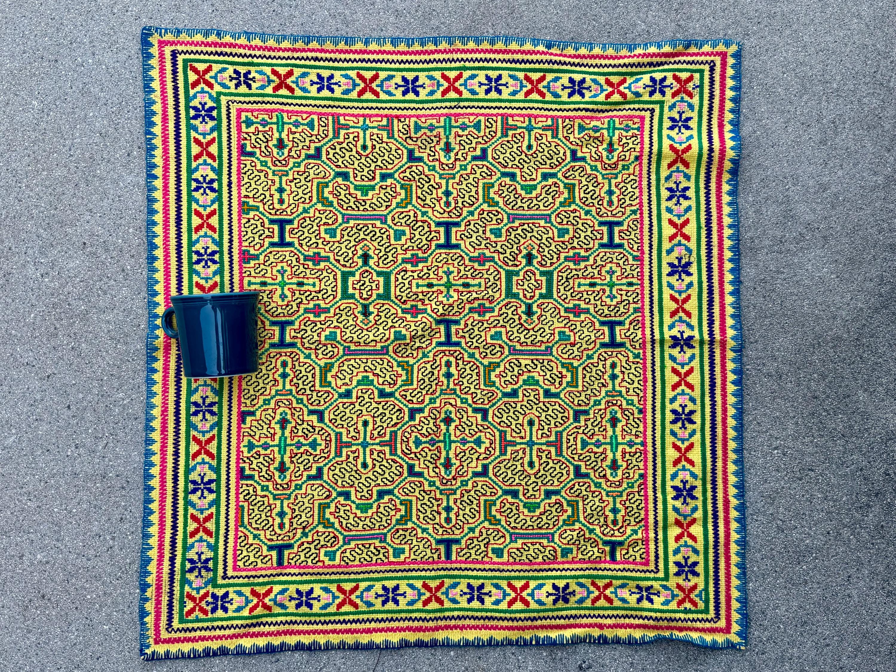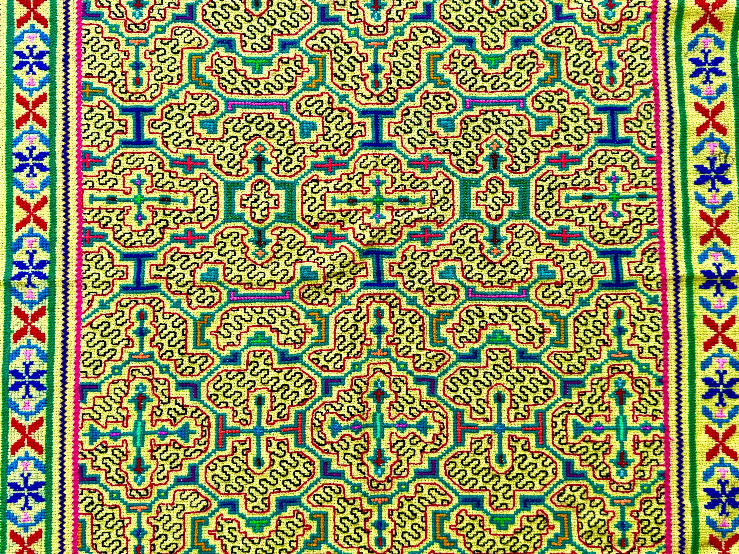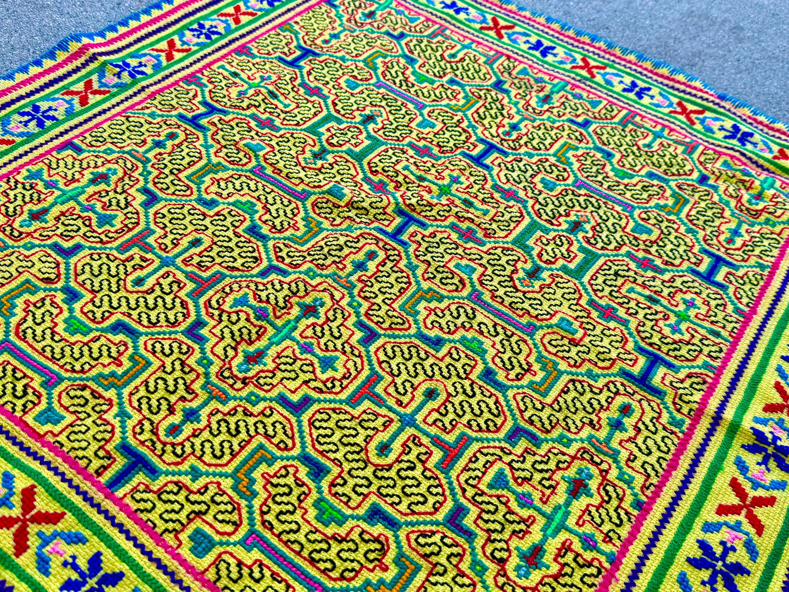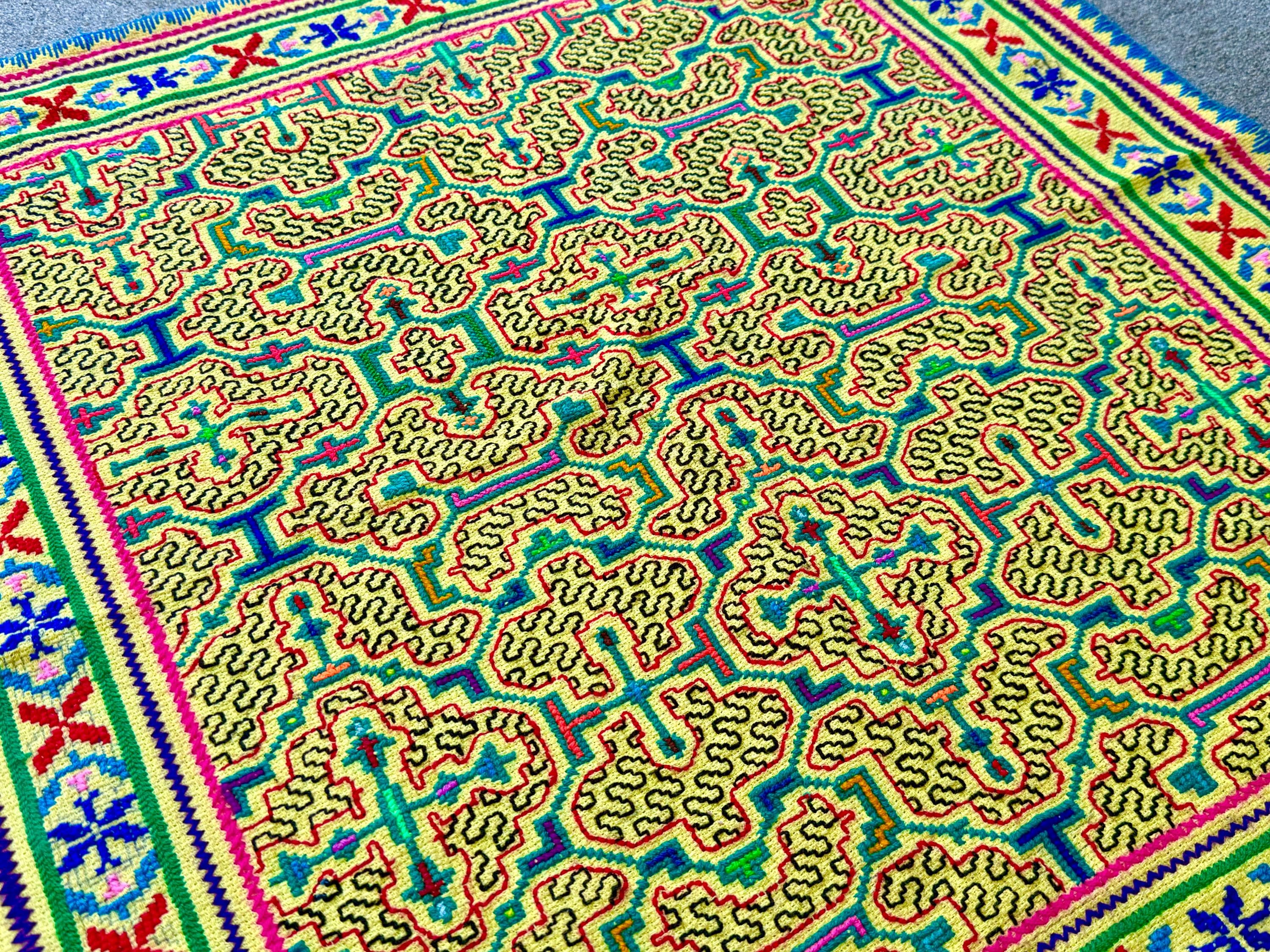 **PLEASE NOTE there are a few areas on this manta where you can see the original drawing of the pattern, done by the artist herself (see Photo 8). This is not uncommon to see with these Shipibo mantas, and for us it's a bit charming, a mark from the artist! They are not very noticeable, however, we realize some may prefer a cloth without these markings, so please be aware before purchasing.