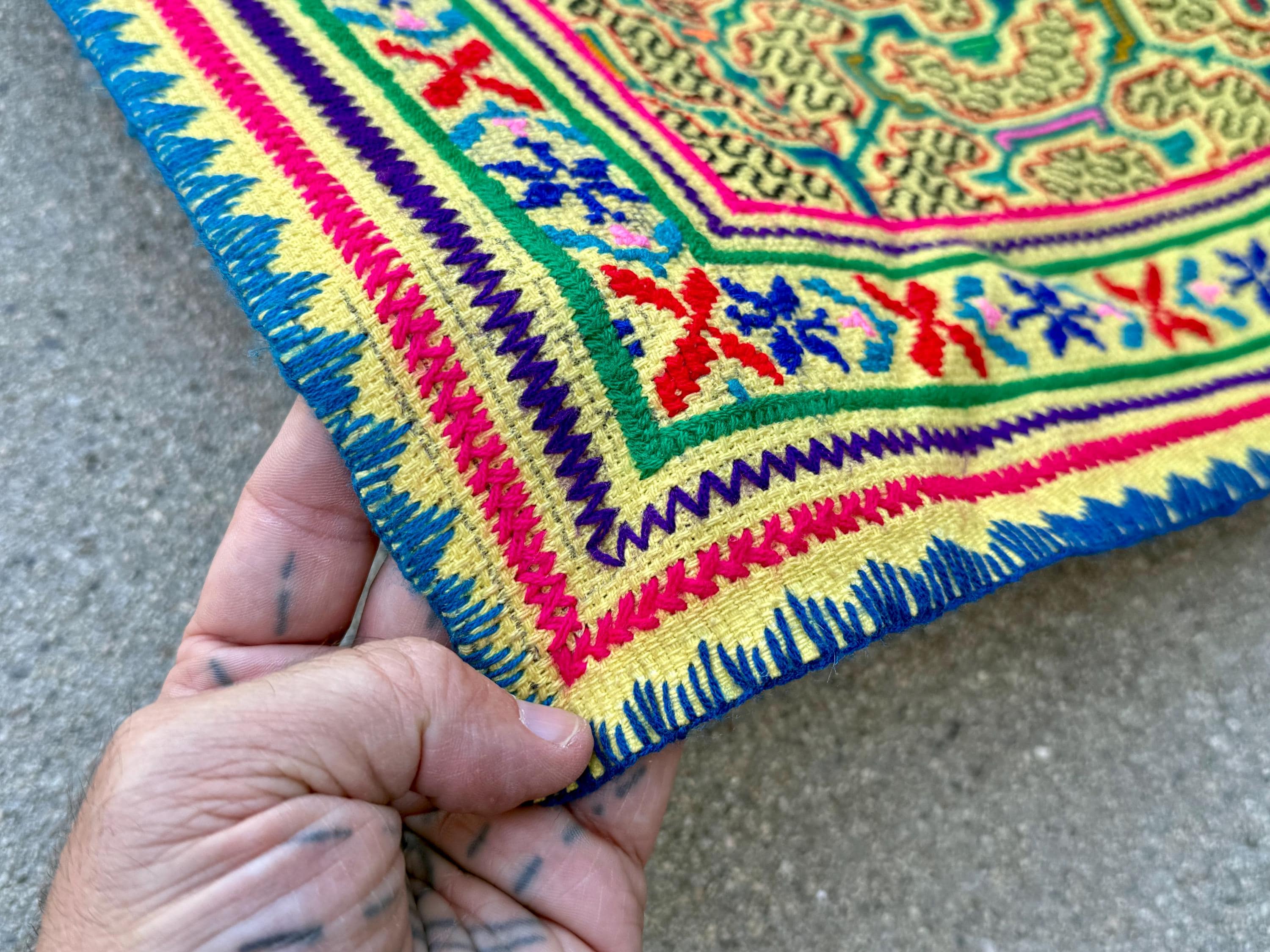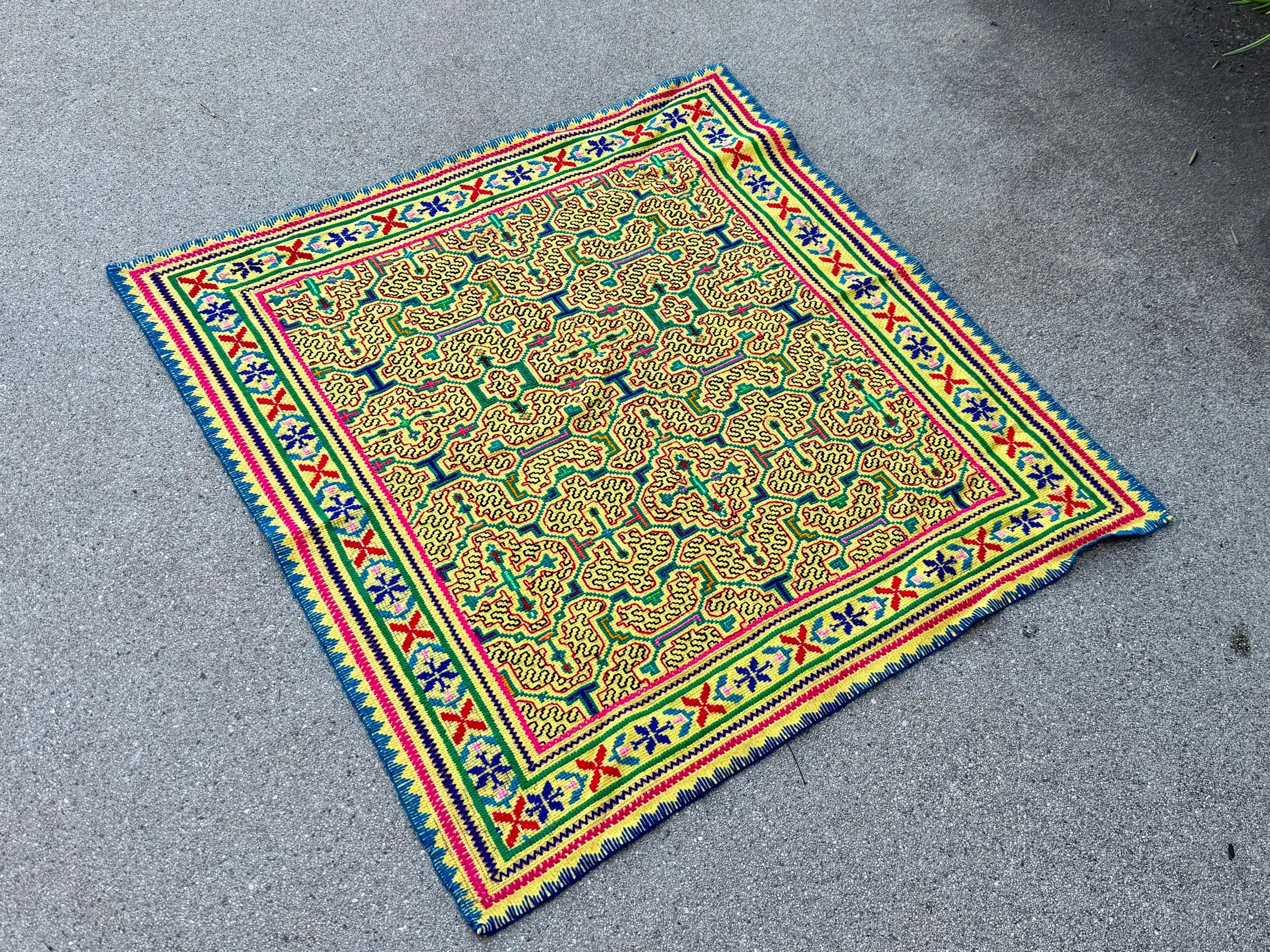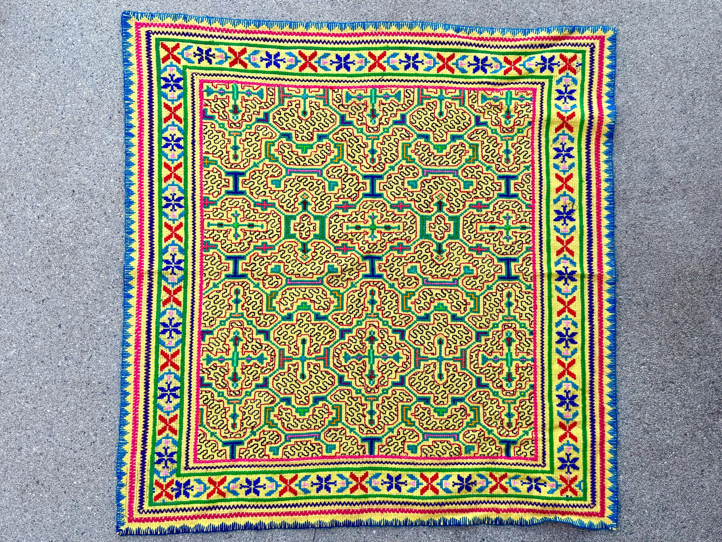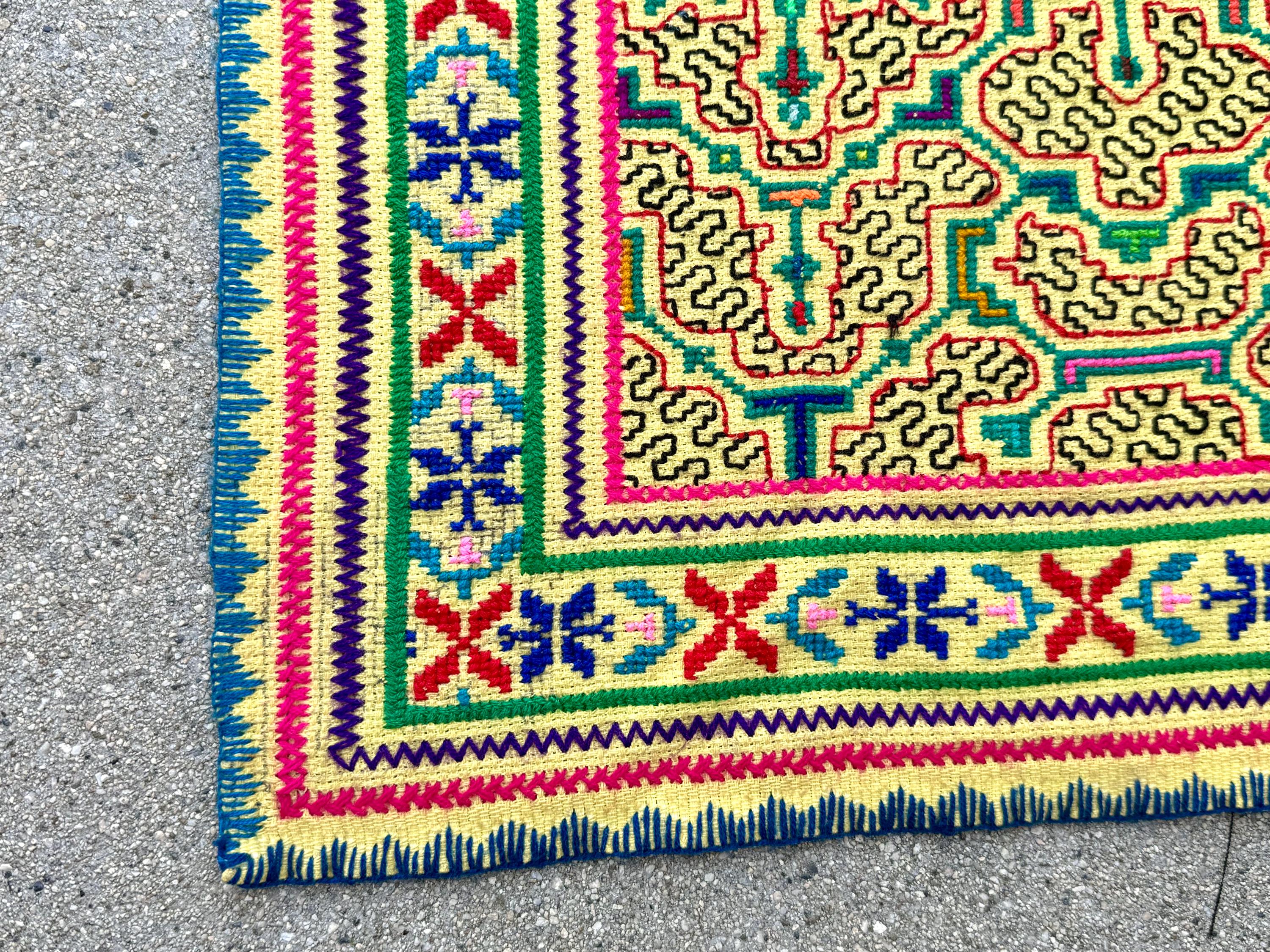 We rarely see a manta cloth with a bright yellow color such as this! So vibrant with well-executed embroidery on this magnificent manta cloth with beautiful patterns throughout. We love the center portion with its traditional "kene" patterning, and the border portion that features flower and vine.