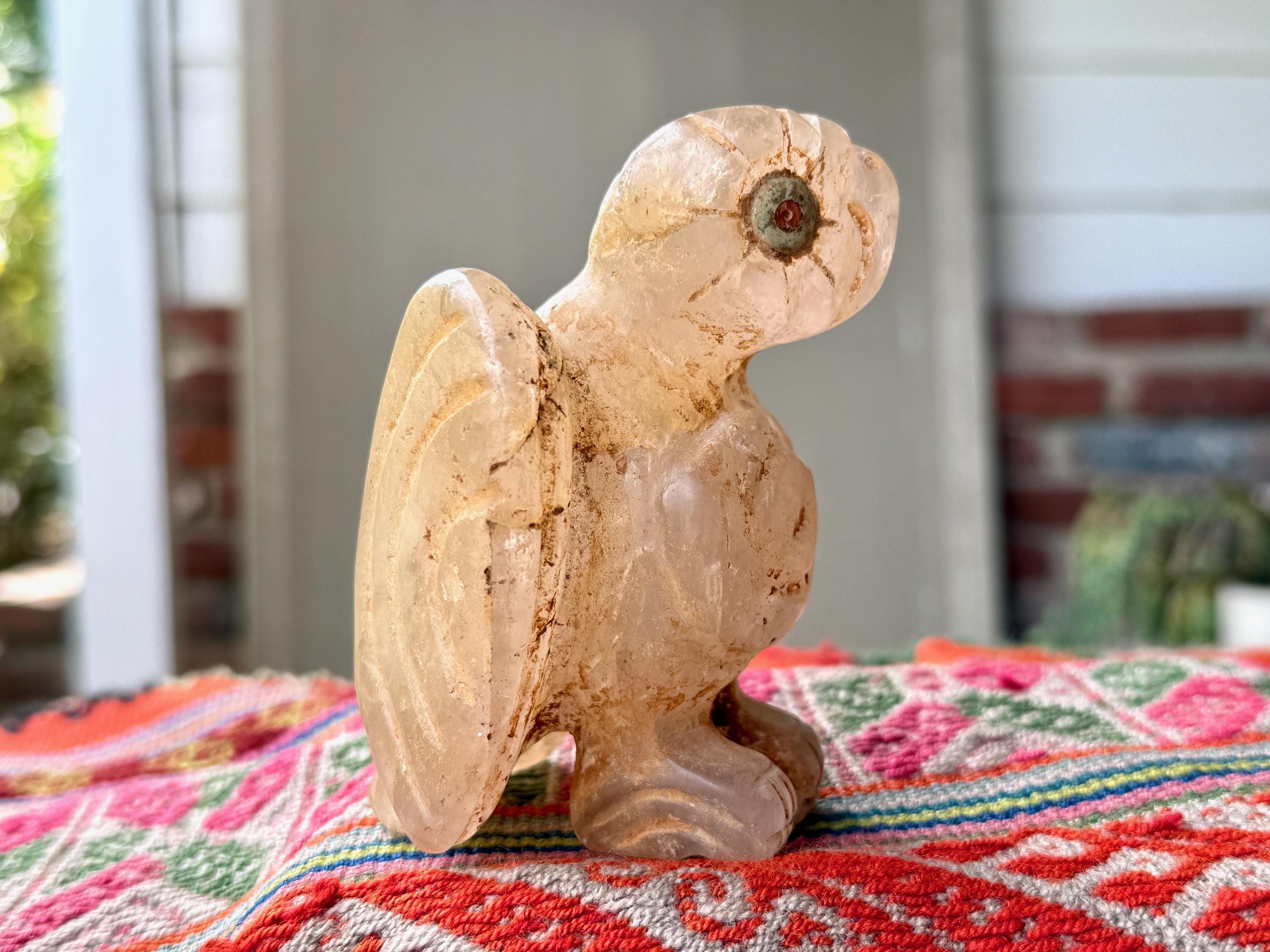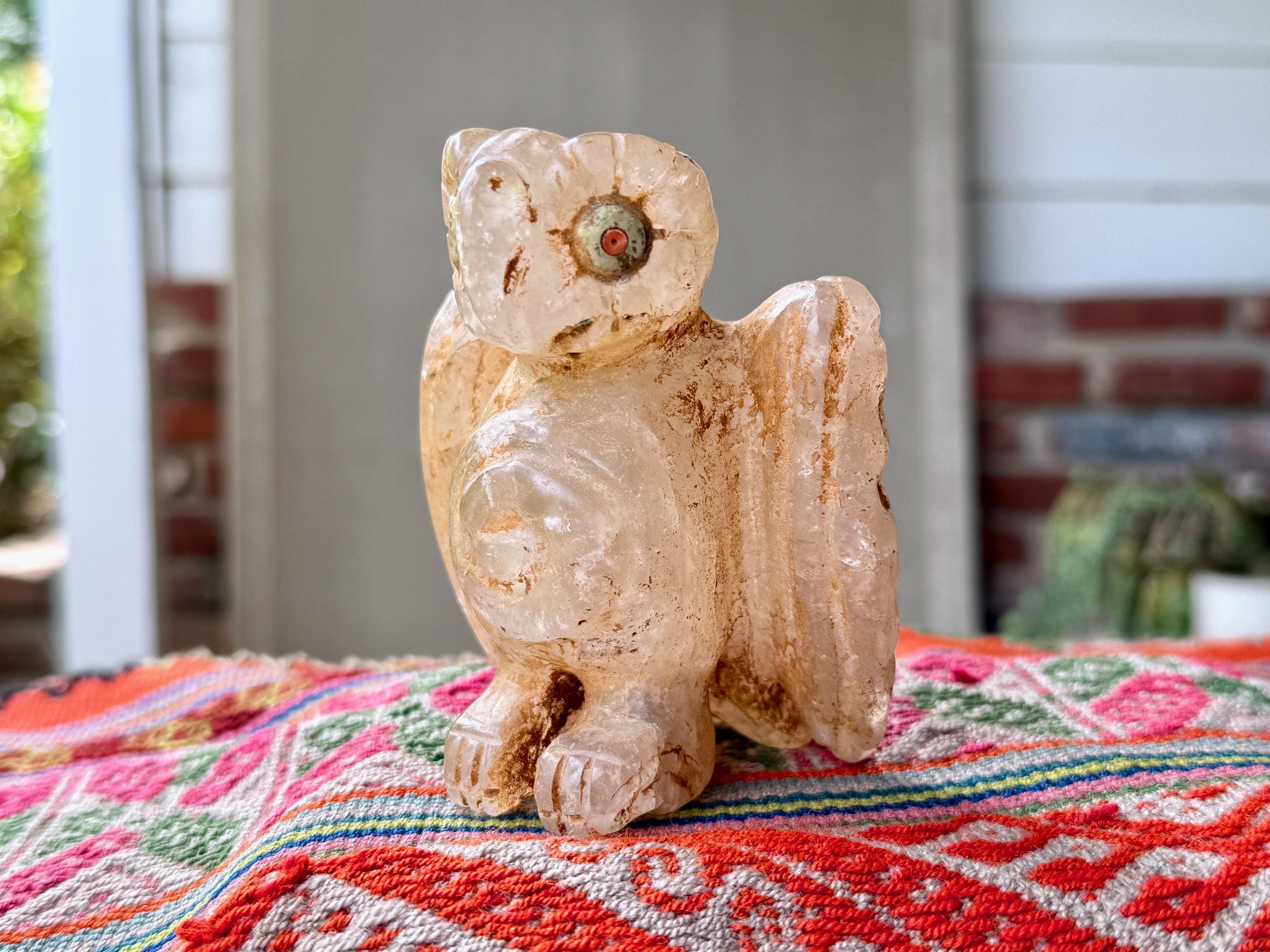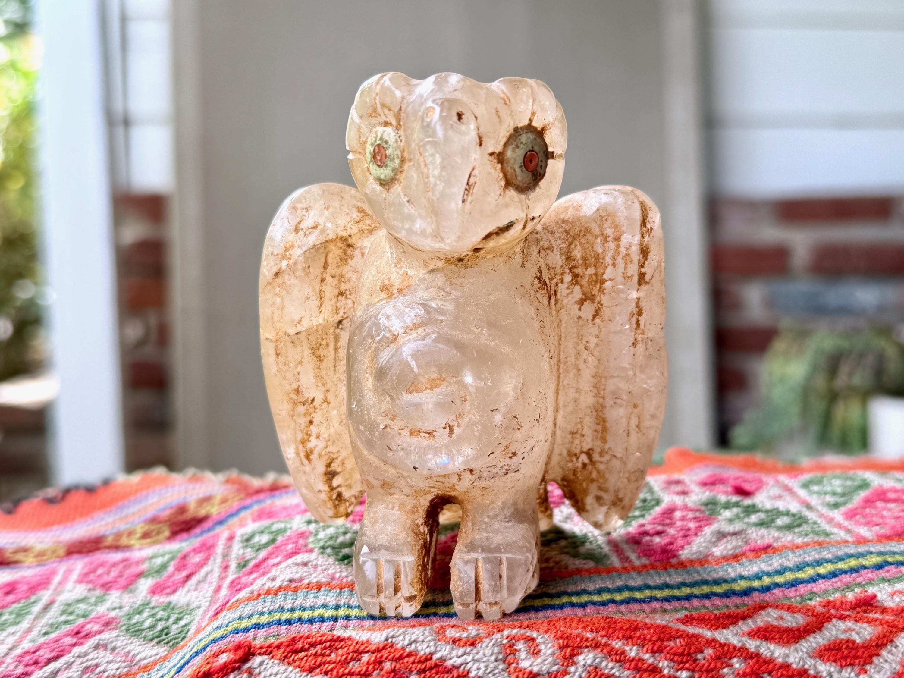 This extraordinary Owl Statue was hand carved from native Andean Quartz by Peruvian Artist Ruben Layme in Peru's Sacred Valley.