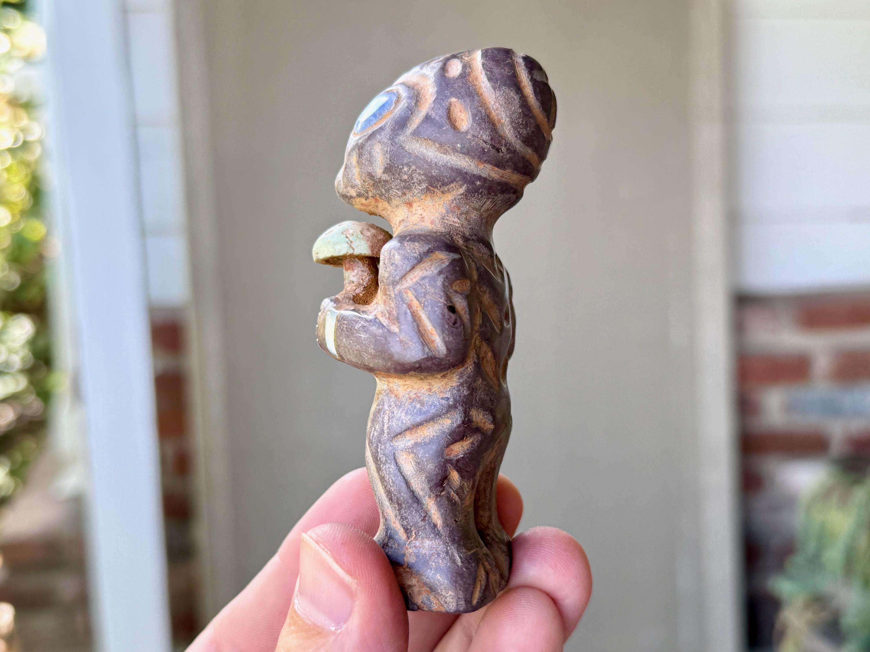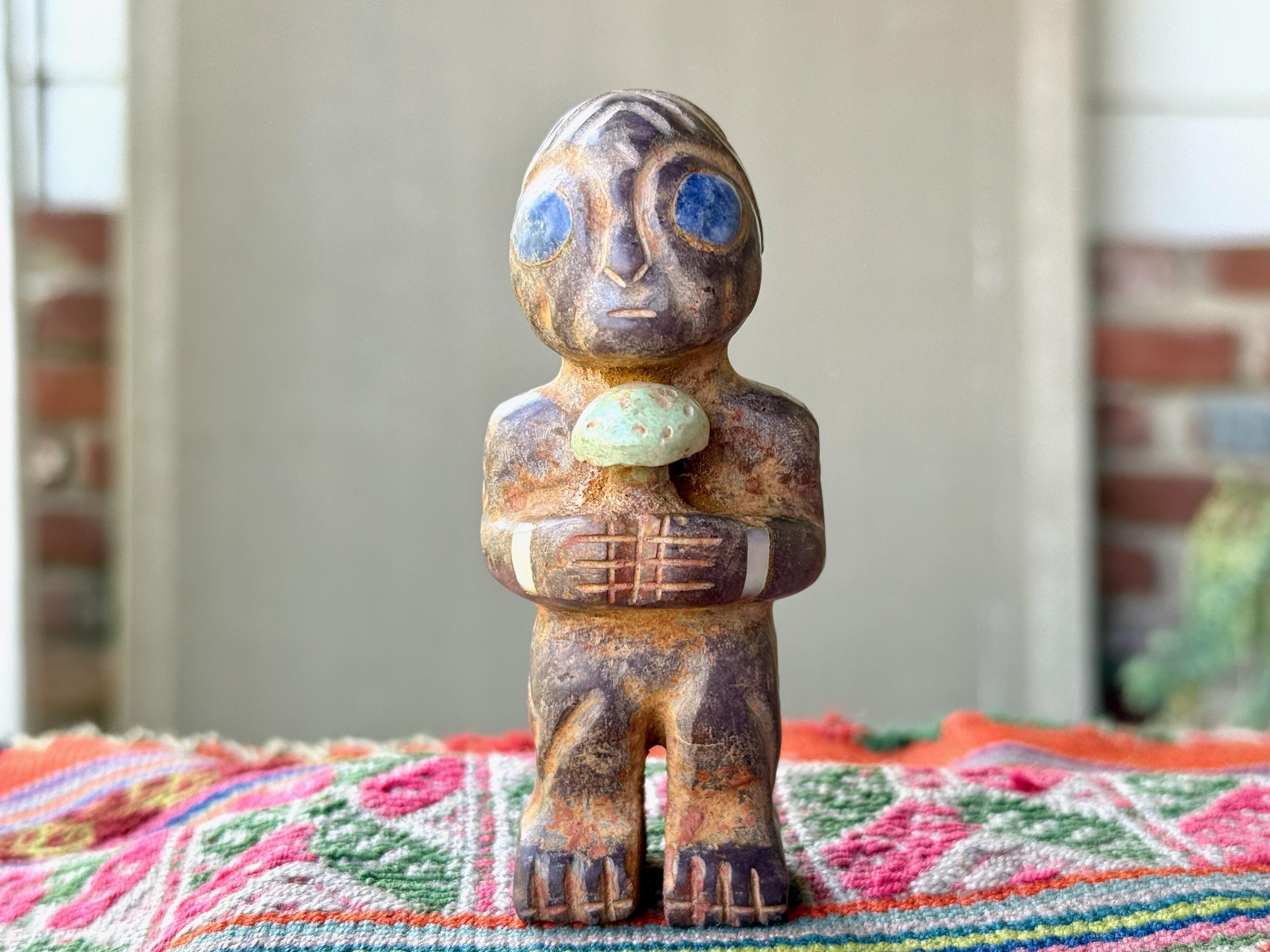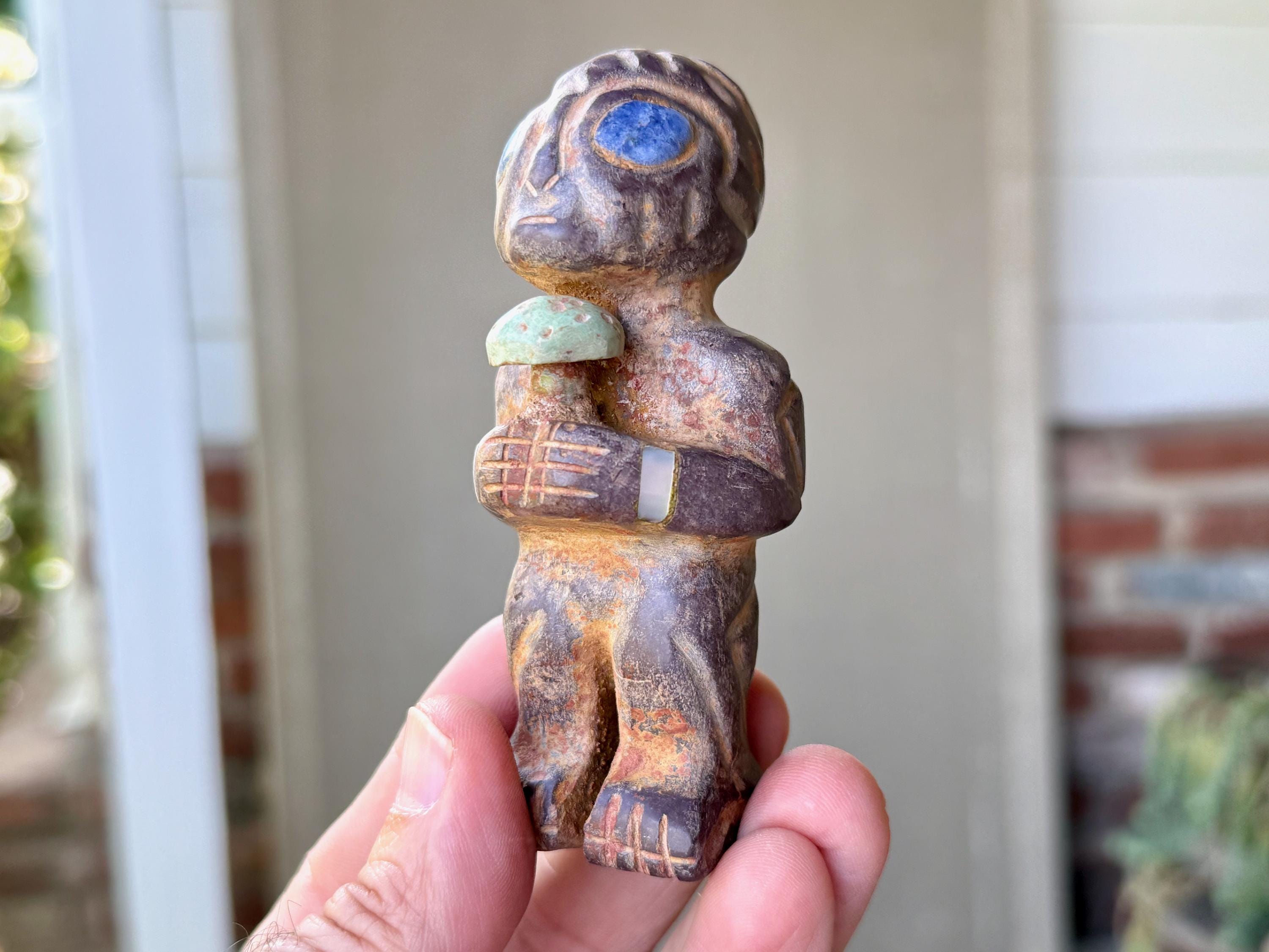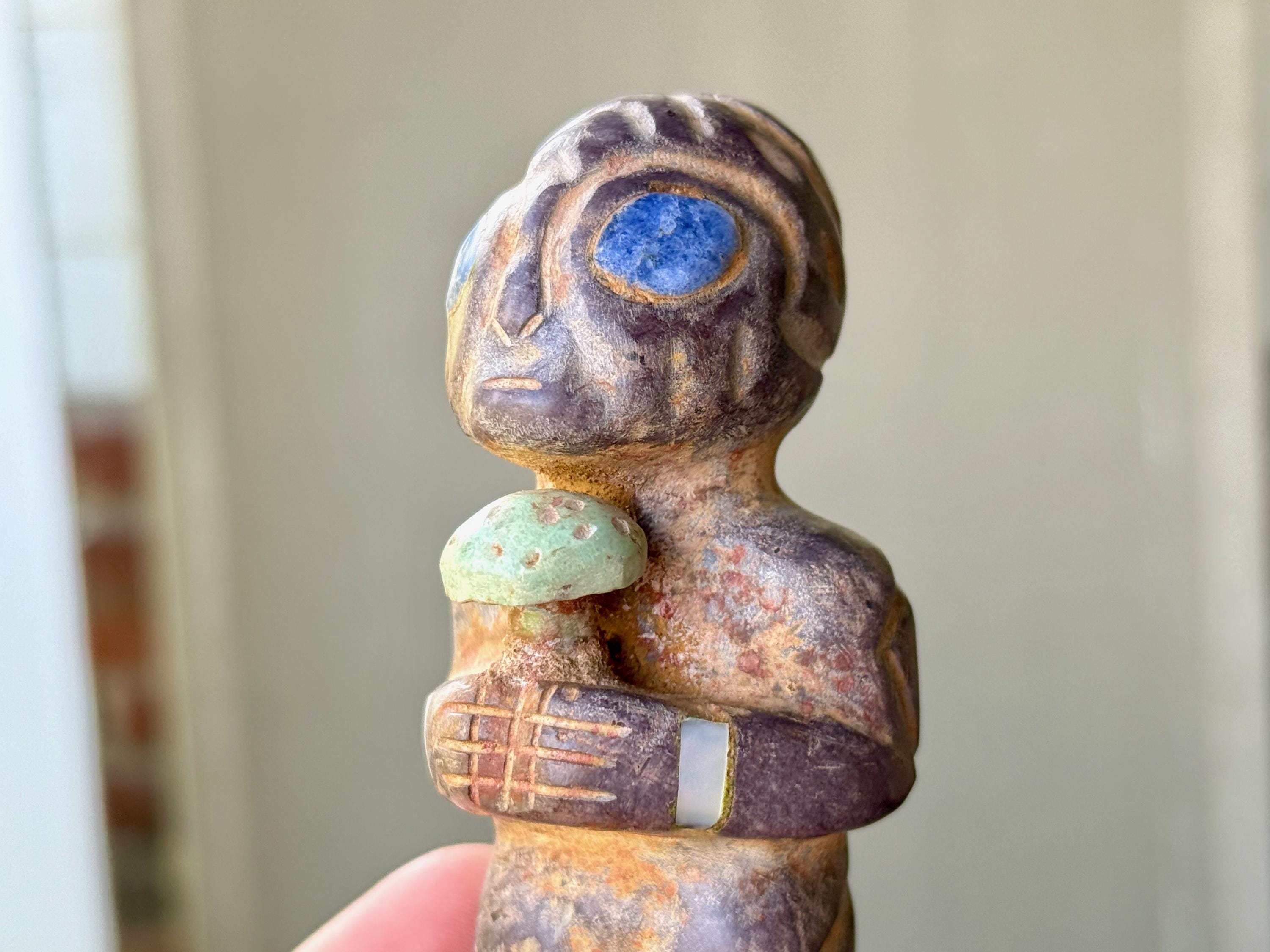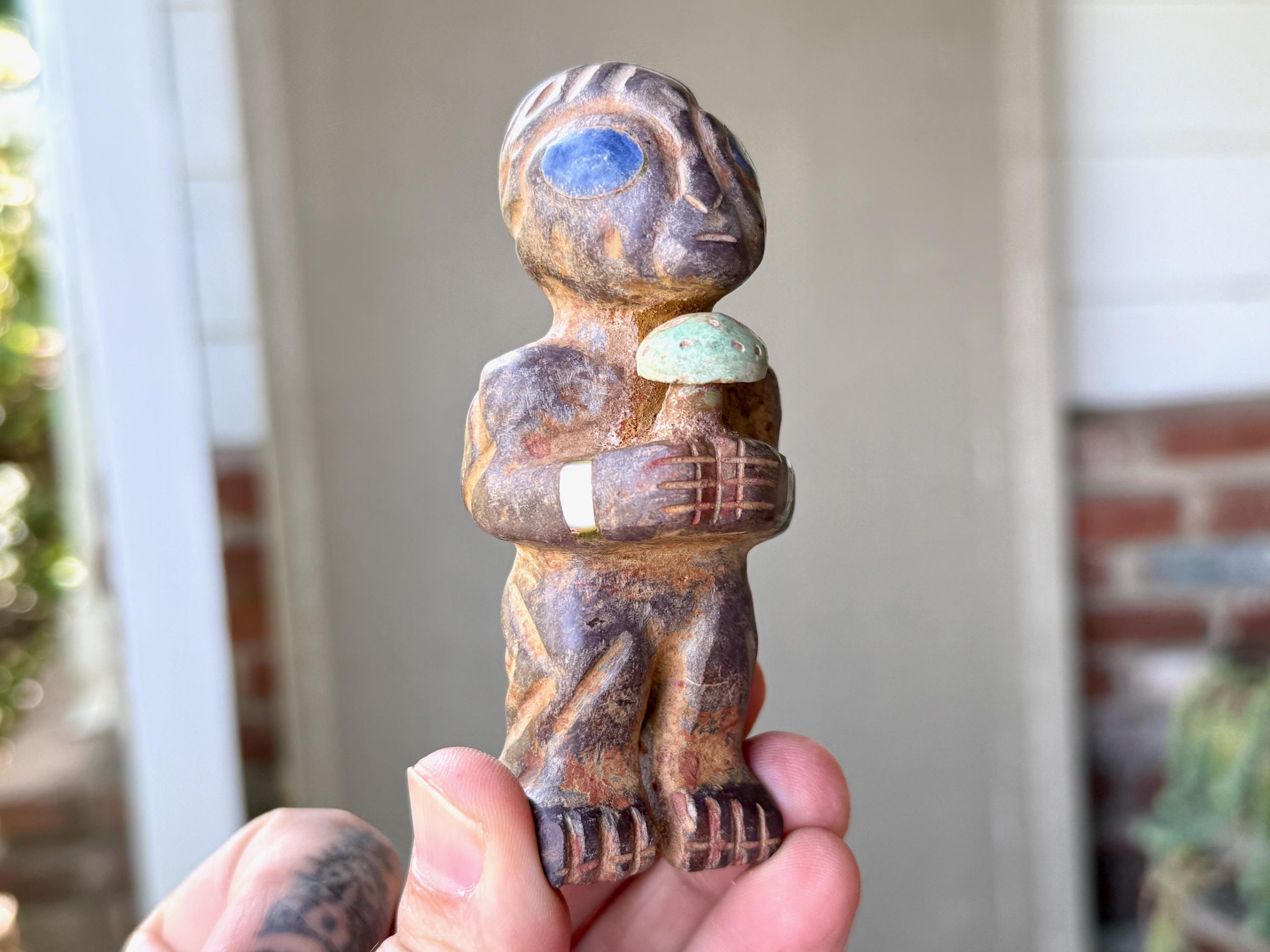 This adorable cosmic traveler is so incredibly well-articulated, blending the ancient Incan art style with a more modern extraterrestrial vision. The piece depicts a classic "Grey" alien carved entirely out of solid Ausungate Stone from the mountains surrounding Peru's Sacred Valley. The eyes are Sodalite inlays, and he holds a single mushroom carved of Amazonite. On his wrists are bands that appear to be made from some type of opalescent seashell.