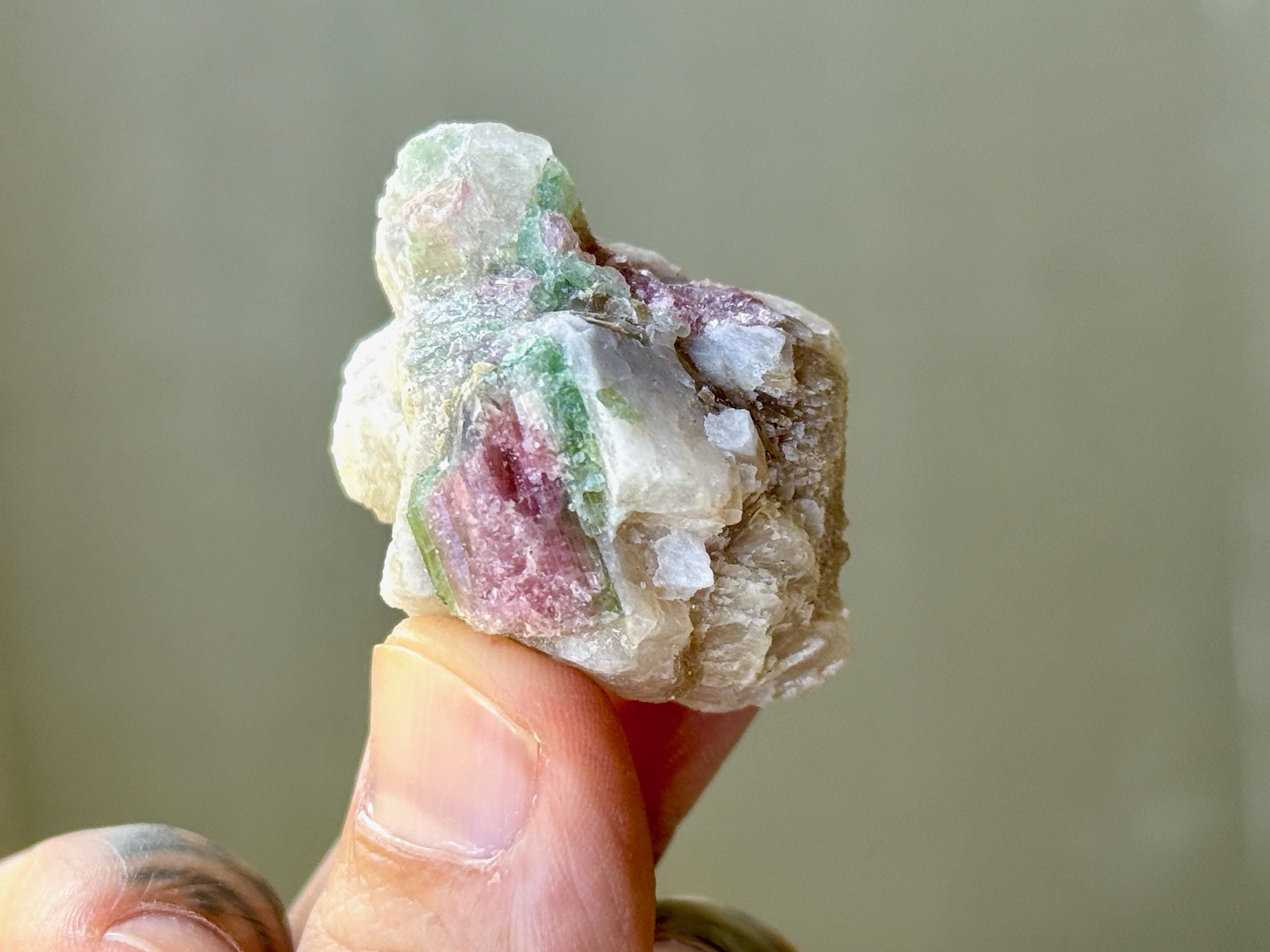 The crystals from this find include unique combinations of Quartz, Lepidolite, Citrine, Cleavelandite, Albite and Feldspar, with vividly colored Tourmalines in lovely hues of green, pink, purple and blue. Crystals with combinations of these minerals are sometimes referred to as "Unicorn Stones."