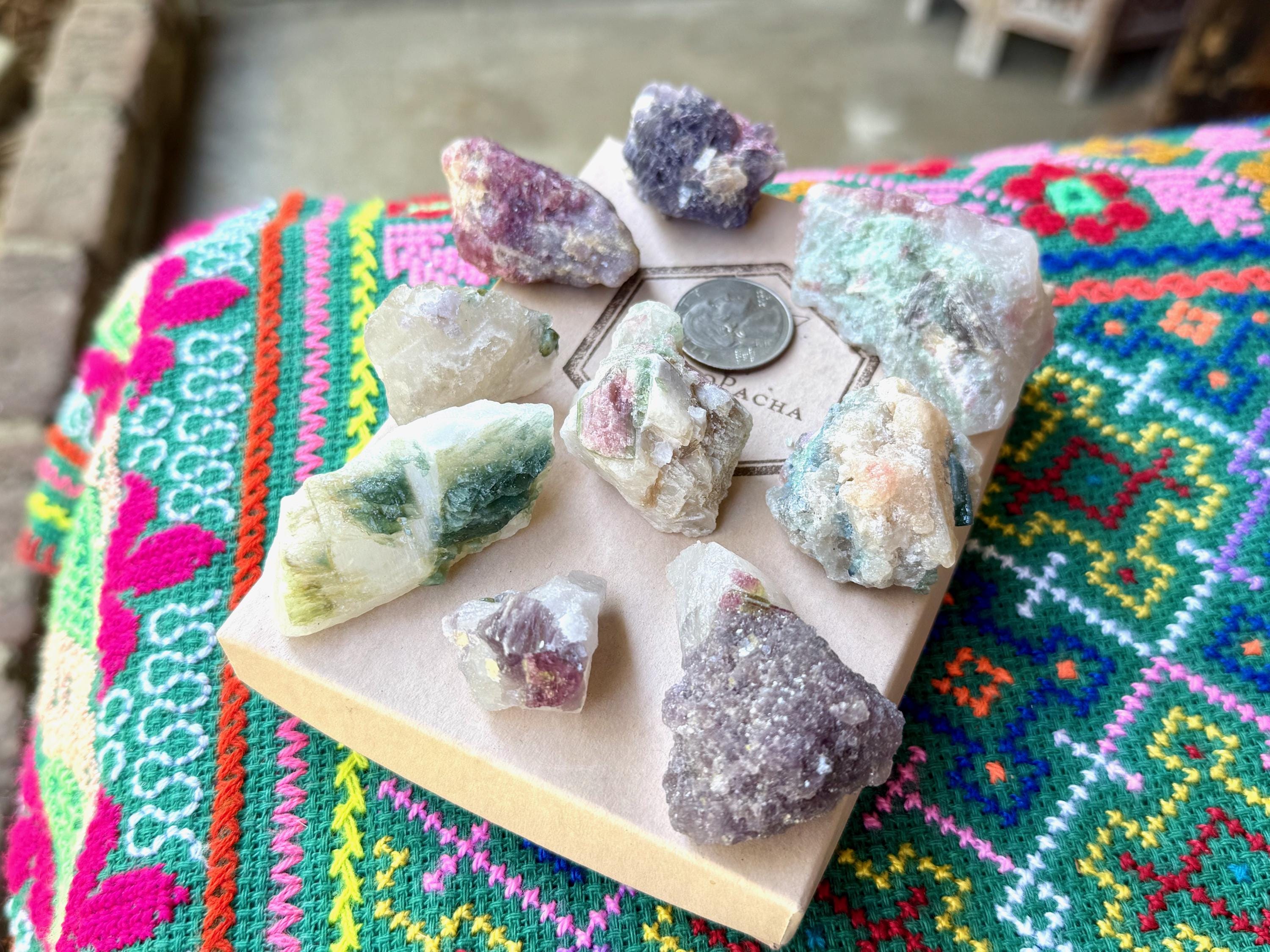 A beautiful lot of Unicorn Stone Quartz featuring vibrant inclusions of Pink & Green Tourmaline and Purple Lepidolite. The color on these is super vibrant and when backlit, we can see just how gemmy and translucent these tourmaline inclusions are.