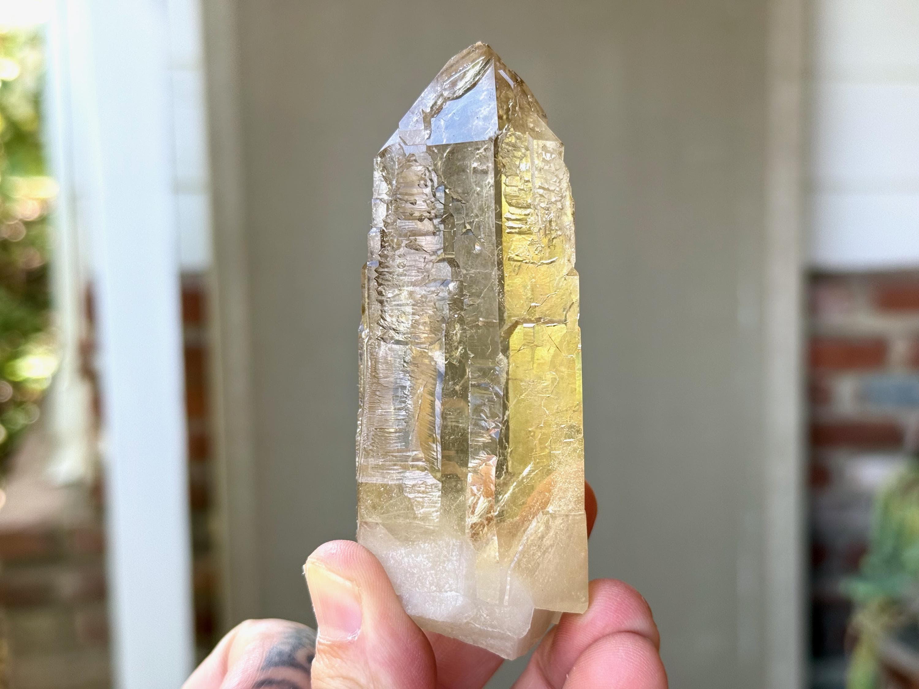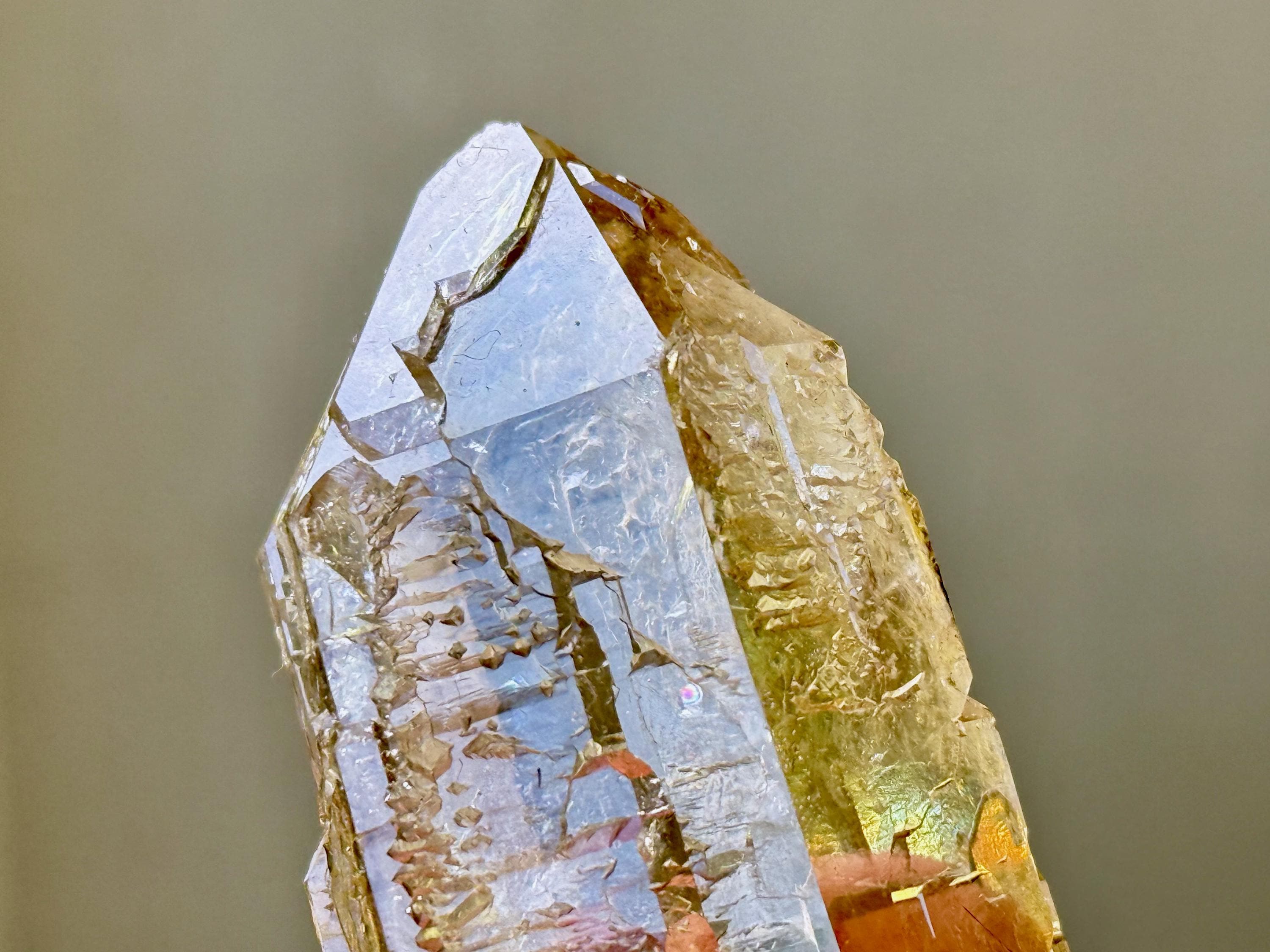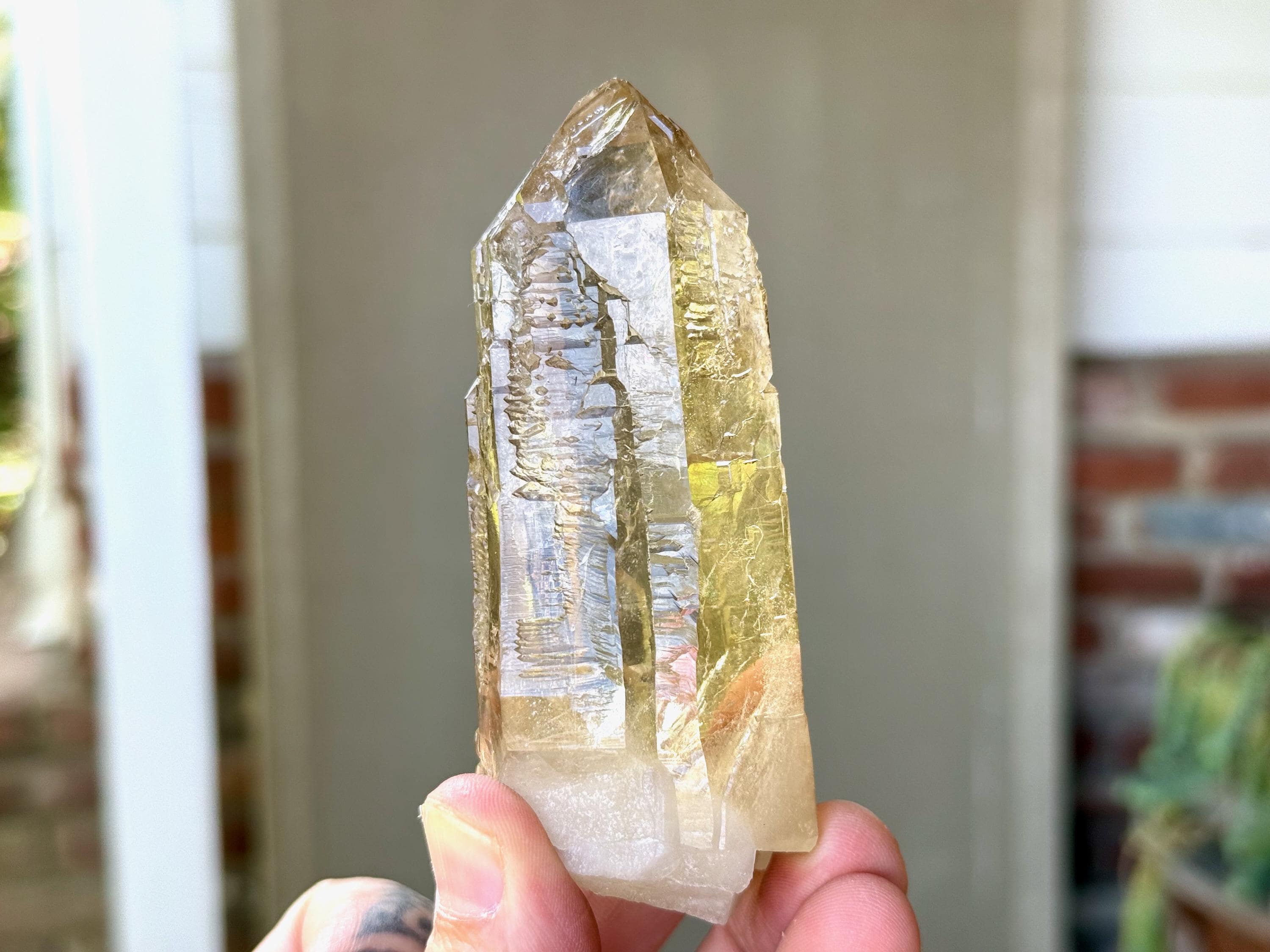 This natural Elestial Citrine crystal comes from a recent find in the Aracuai region of Minas Gerais, Brazil. Citrine activates, opens, and energizes the Solar Plexus and Navel Chakras, releasing personal power, creativity and most importantly the ability to manifest.