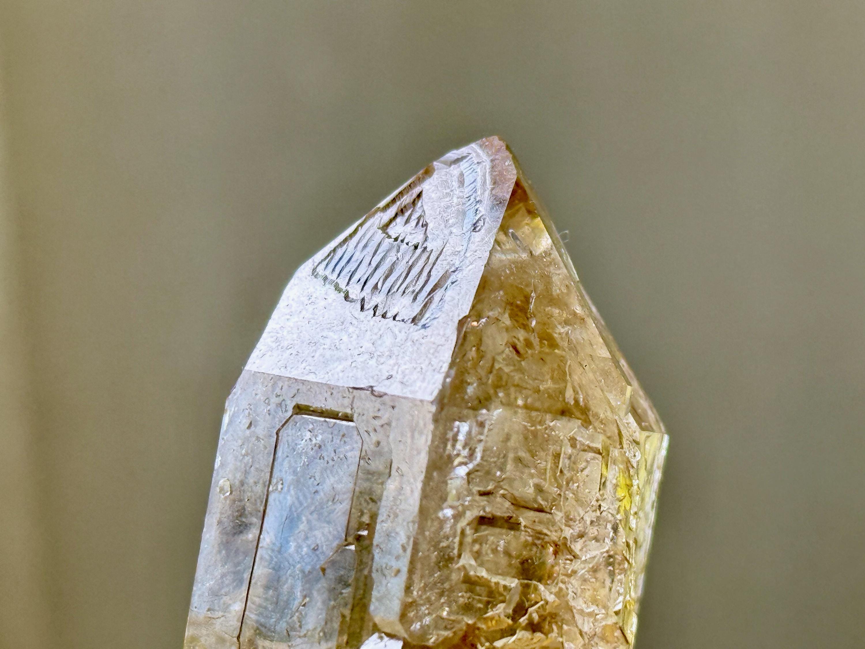 Sublime champagne-golden color to this exquisite Elestial Citrine with vitreous luster and water-clear clarity. This crystal is covered in natural etched textures on its sides and main facet area, which combined with the naturally high luster of the crystal makes for a stunning display!