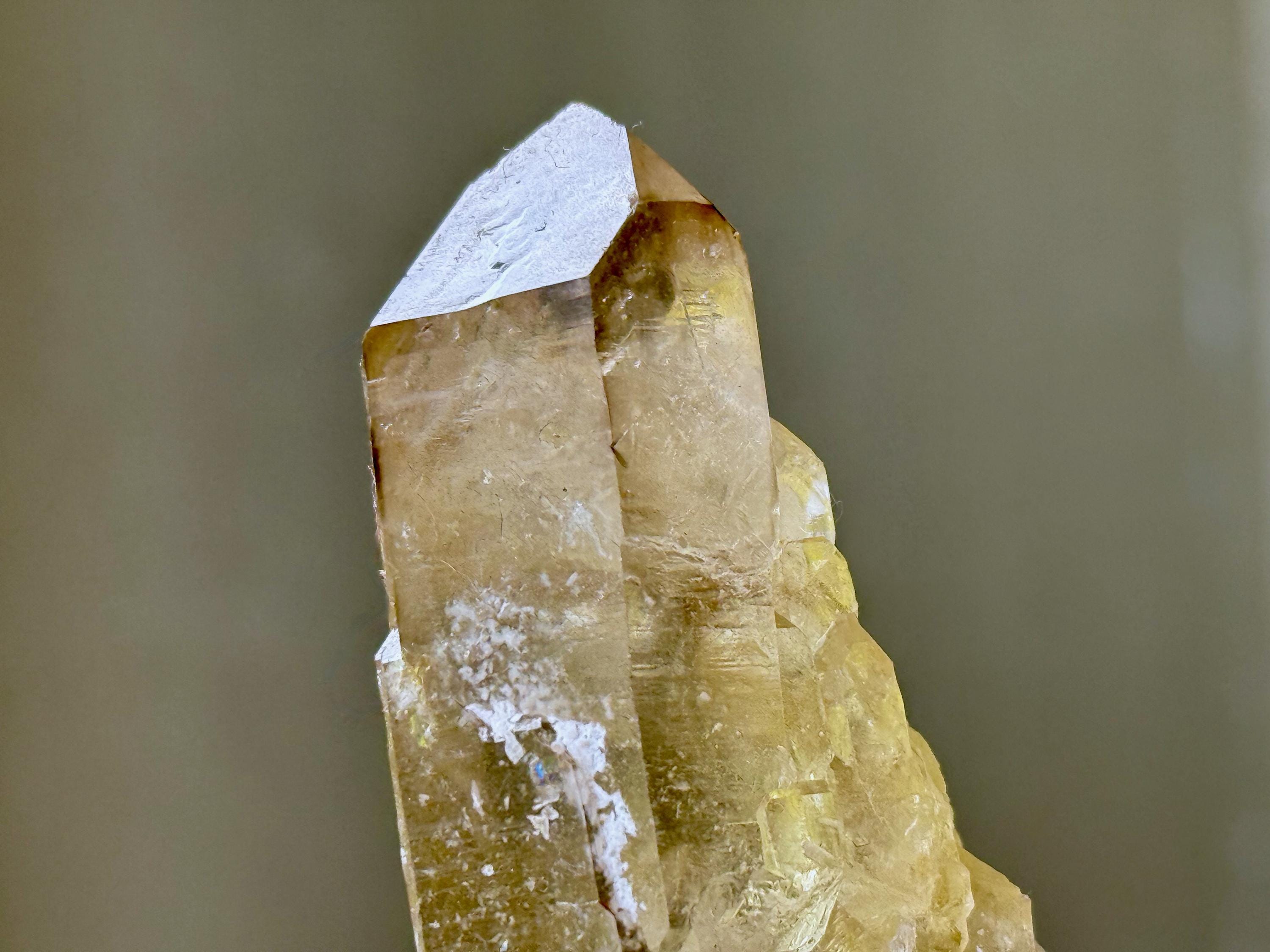 Outstanding quality to this lustrous Cathedral Citrine with a vibrant golden-yellow color, that begins pale at the base and blends into a bit more robust at the top. On the right side, we see some mild cathedral textures, and on the left we can see a partial contact area of secondary growth.