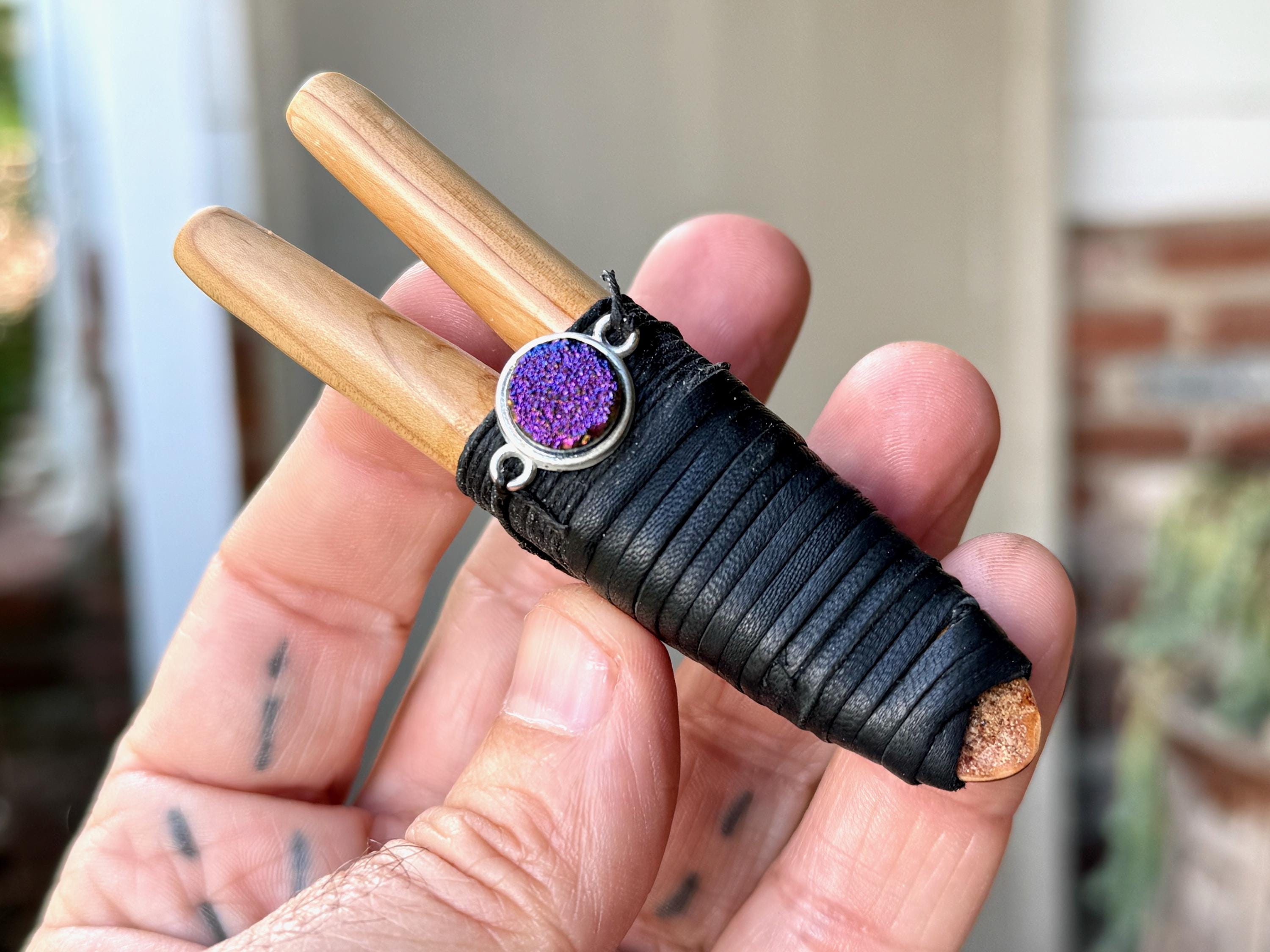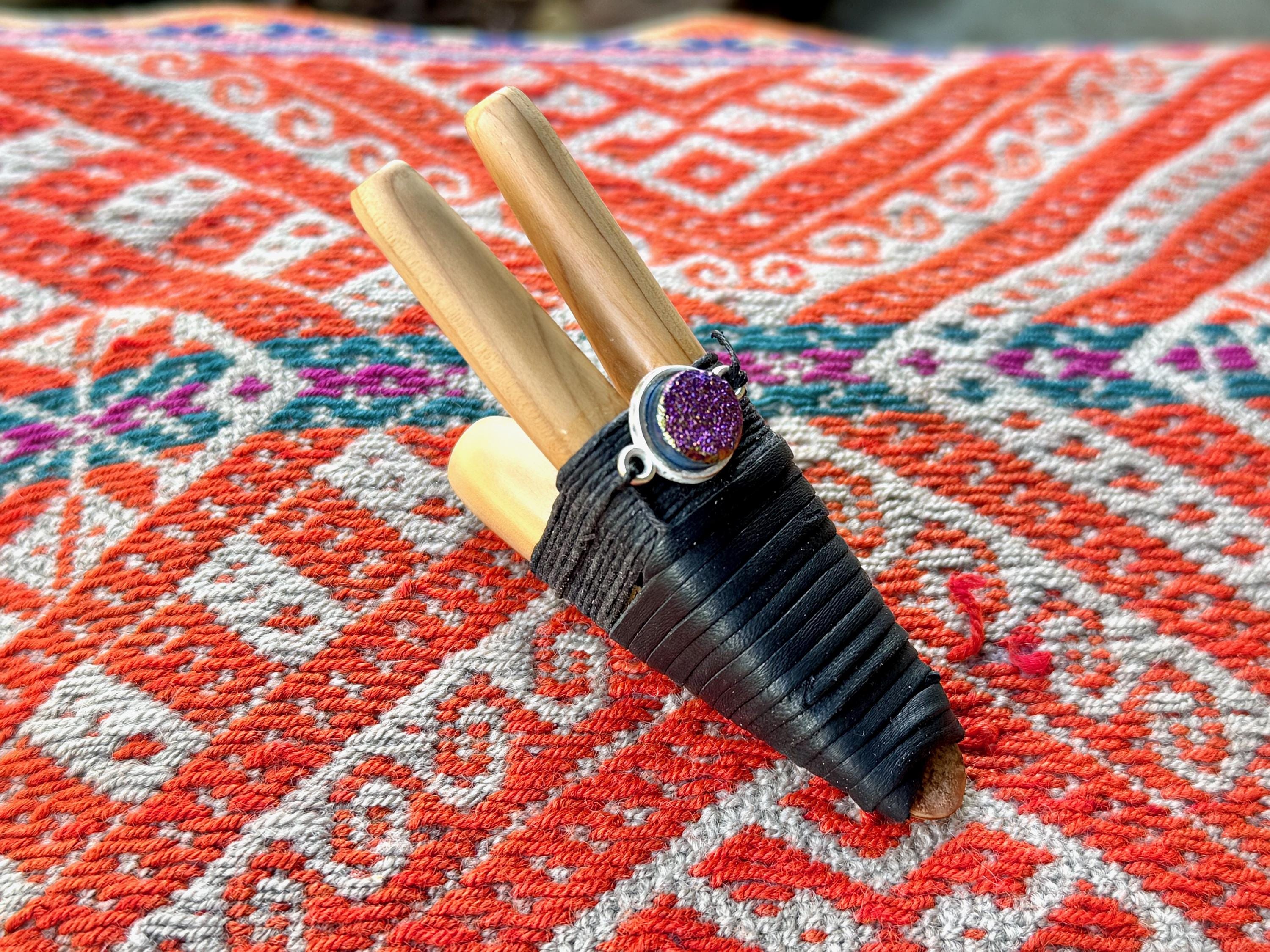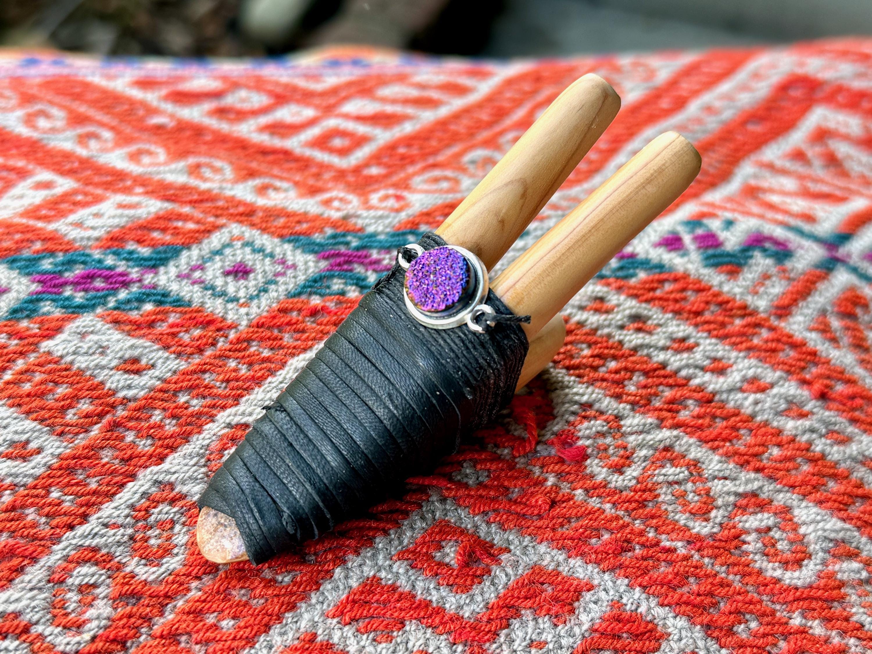 This Double Kuripe Pipe was handcrafted from natural Cemara Wood. It is adorned with waxed thread, leather and a Titanium Aura Quartz cabochon.