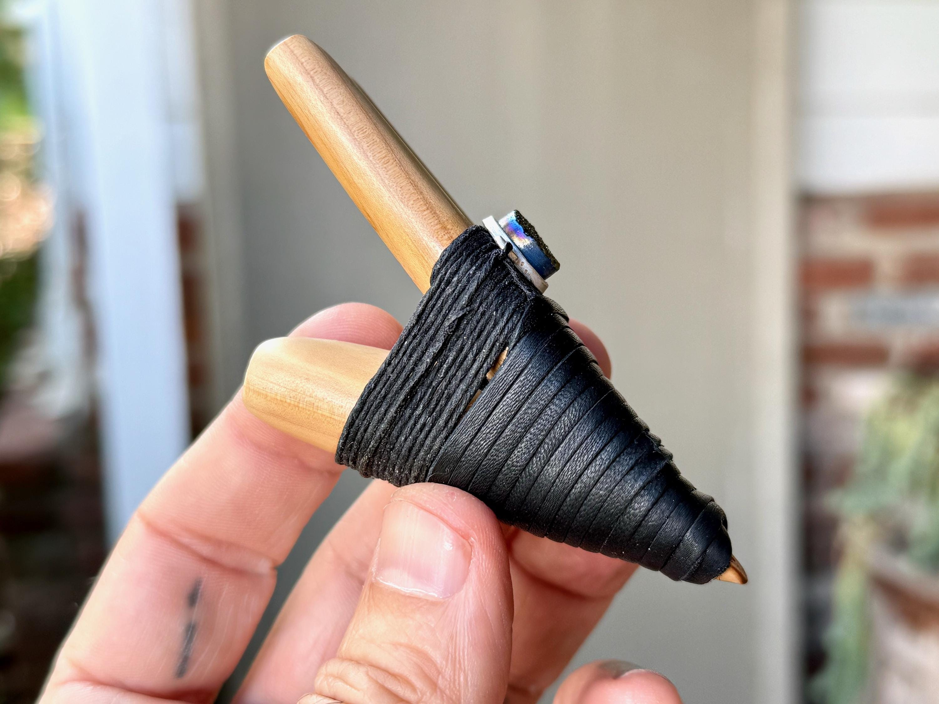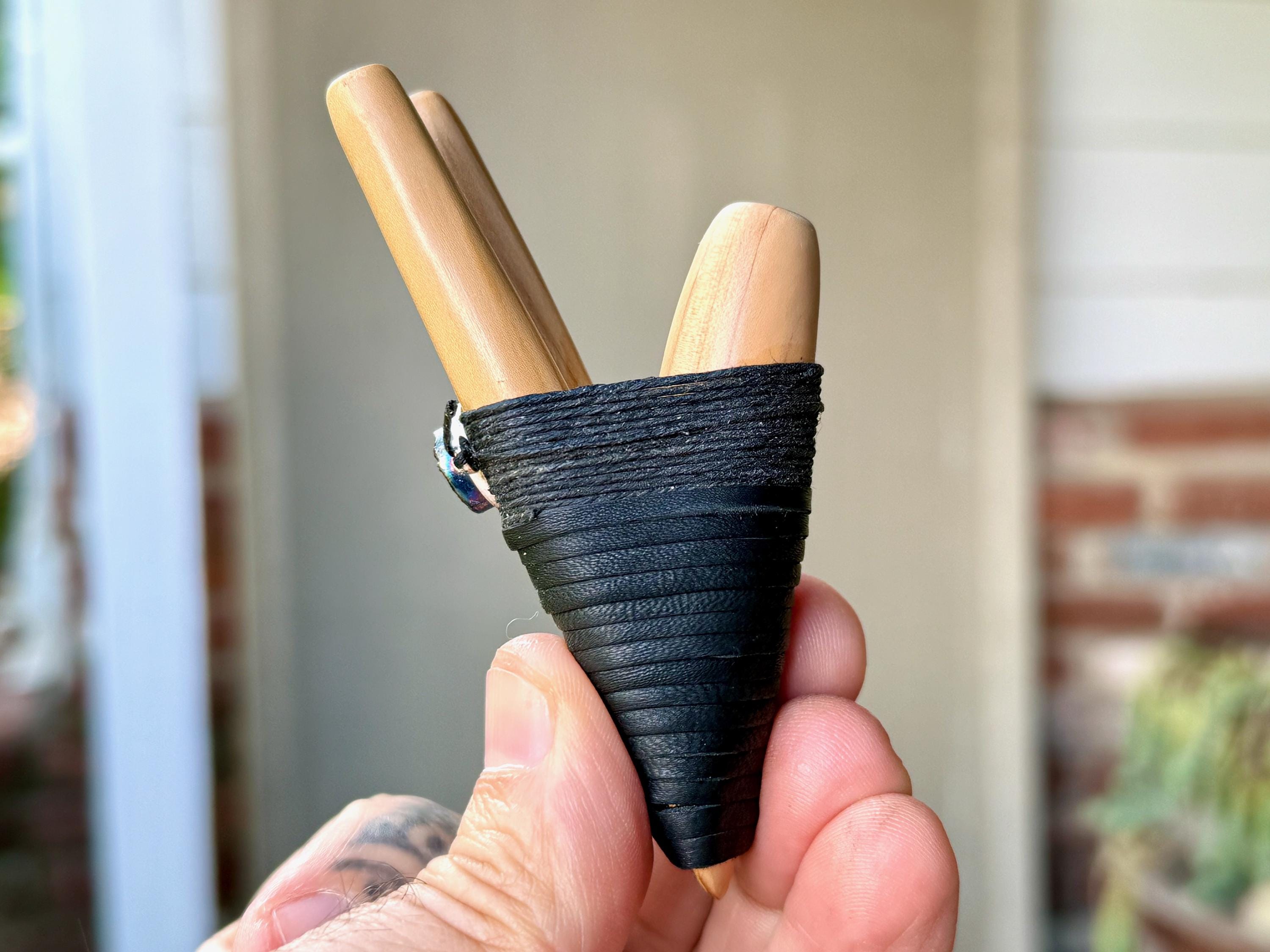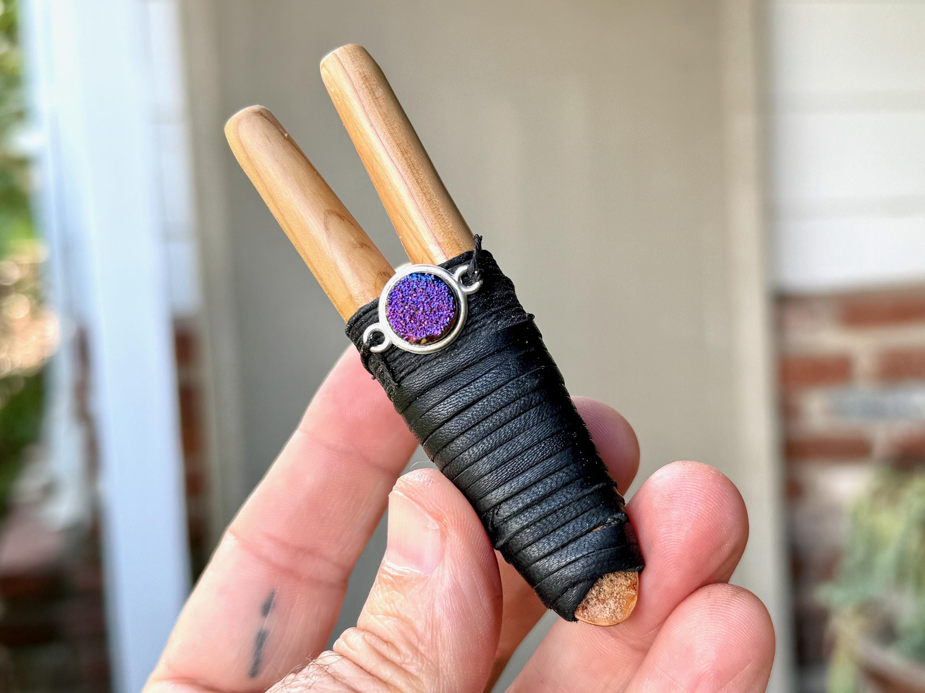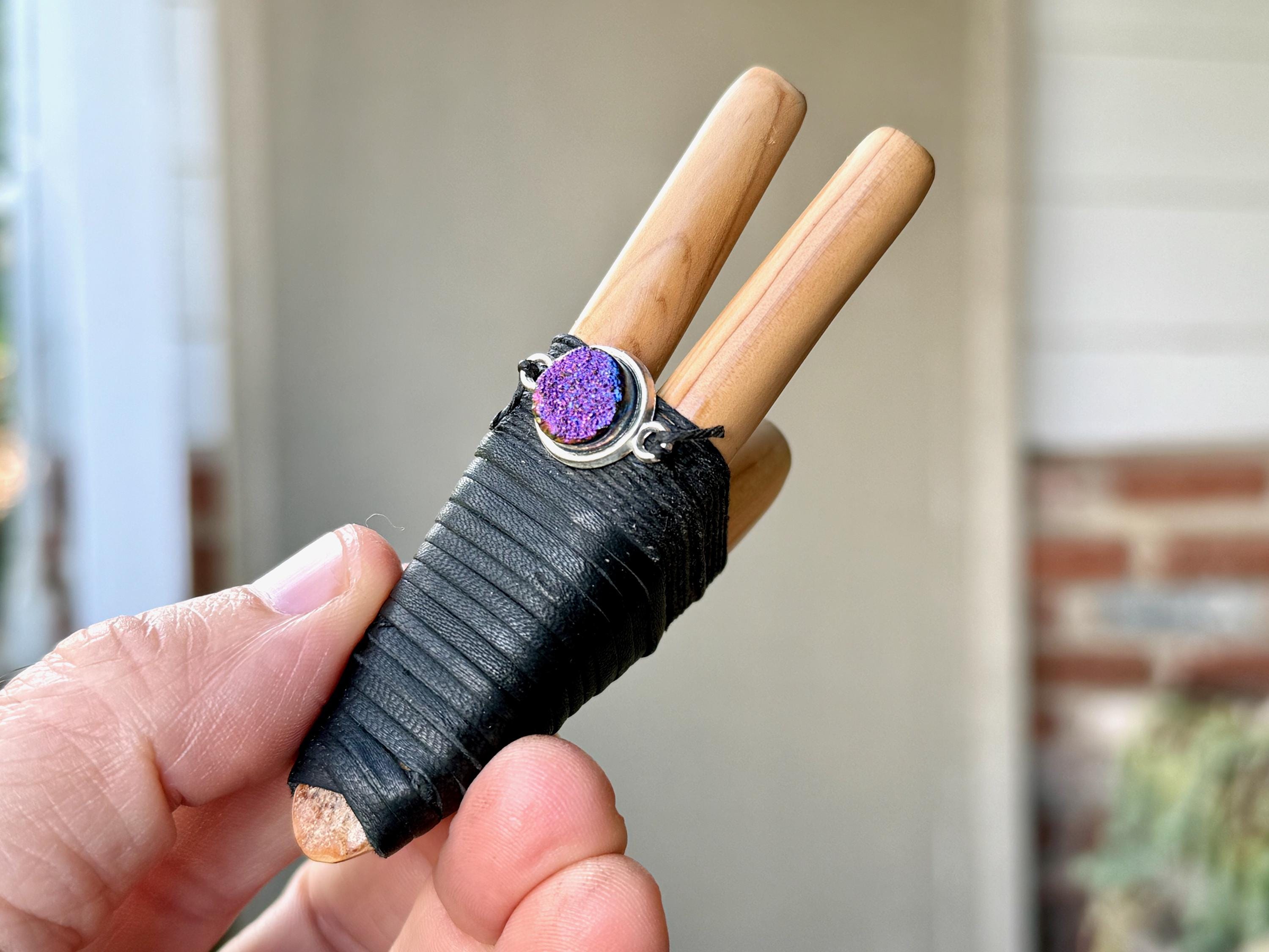 This Double Kuripe Pipe was handcrafted from natural Cemara Wood. It is adorned with waxed thread, leather and a Titanium Aura Quartz cabochon.