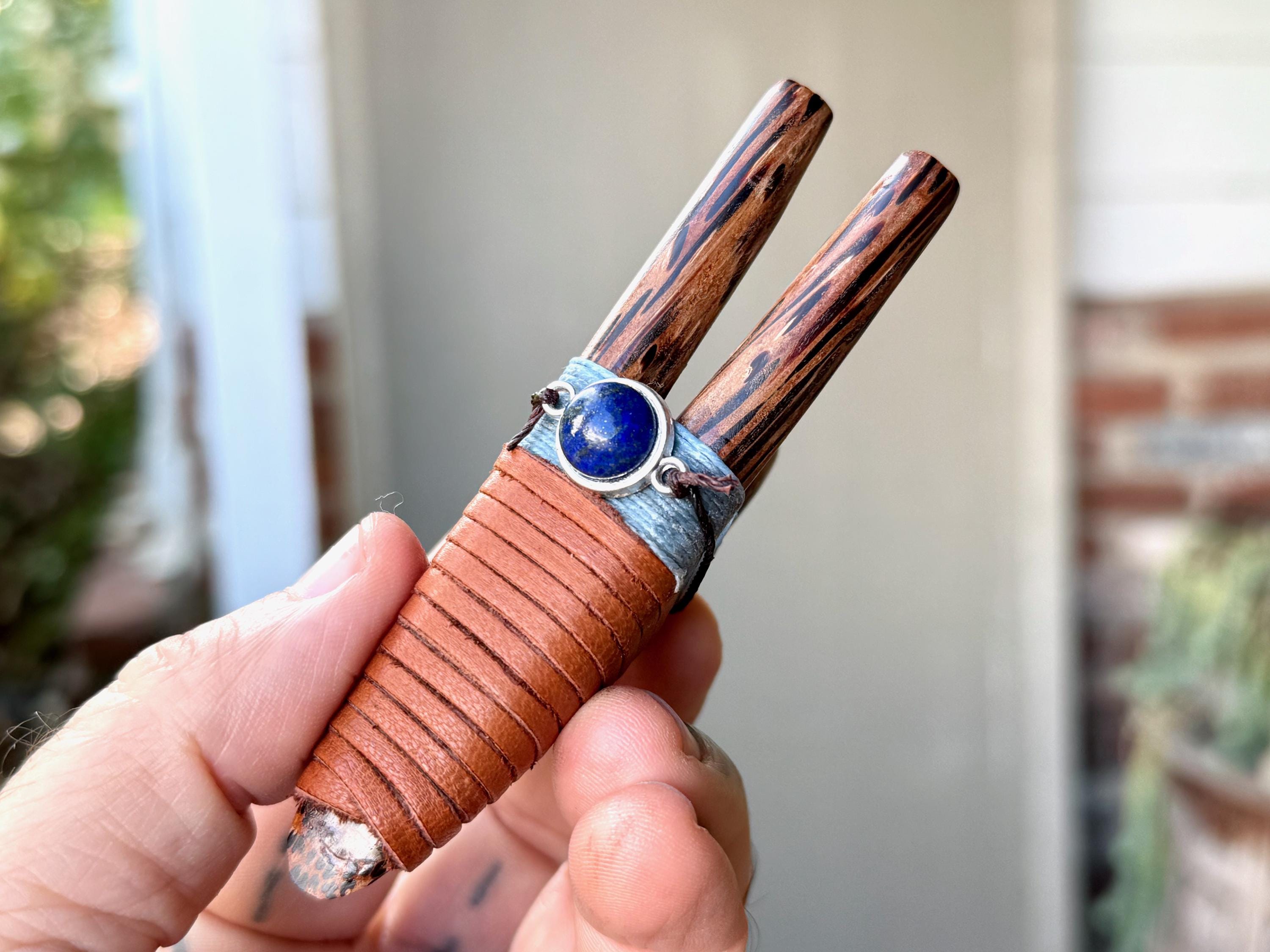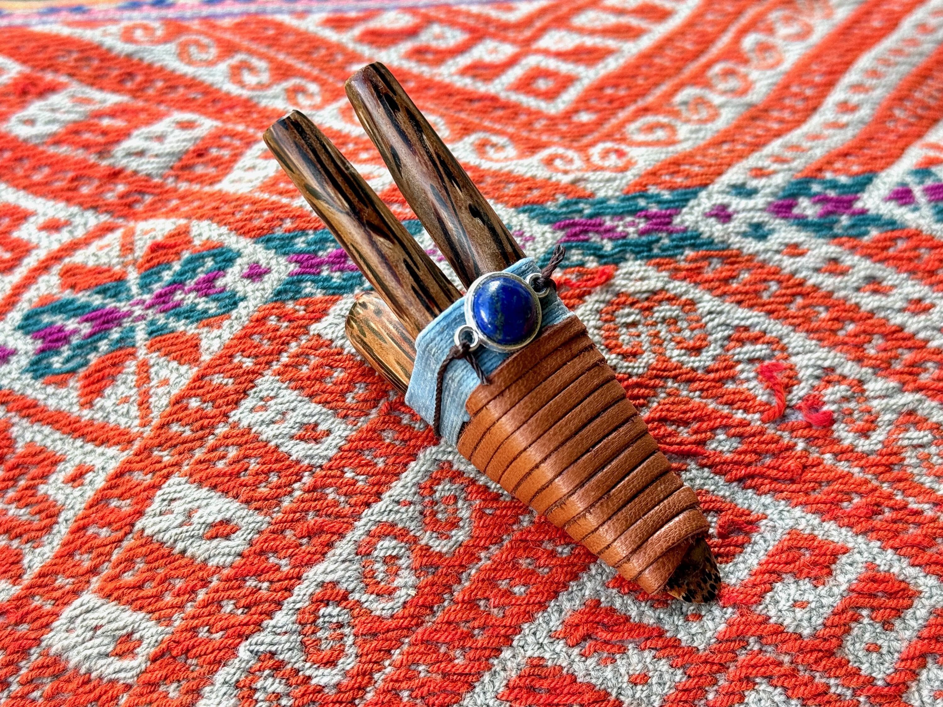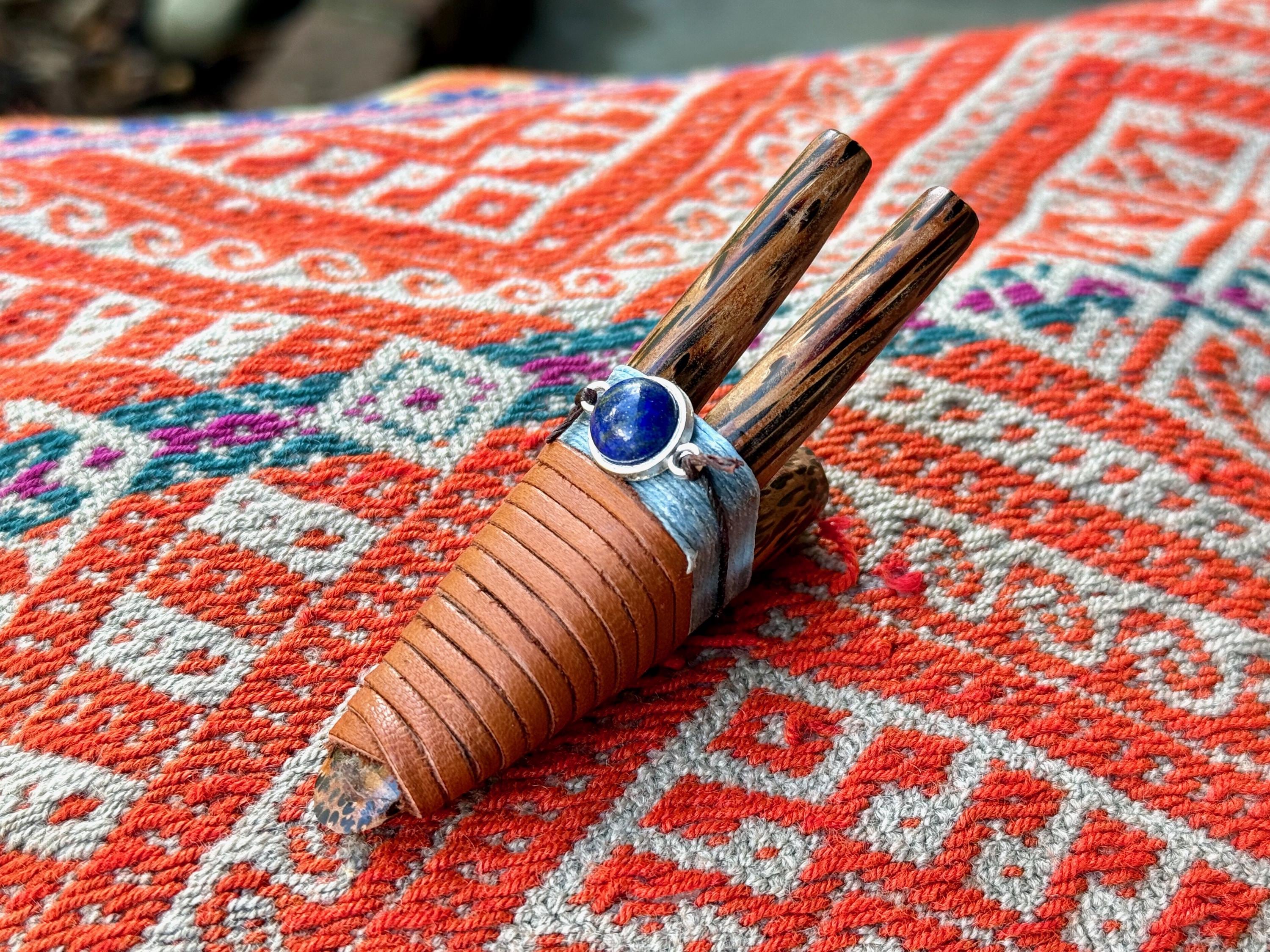 This beautiful Double Kuripe with Lapis Lazuli was handcrafted from natural Coconut Wood and adorned with leather and threaded wrapping.