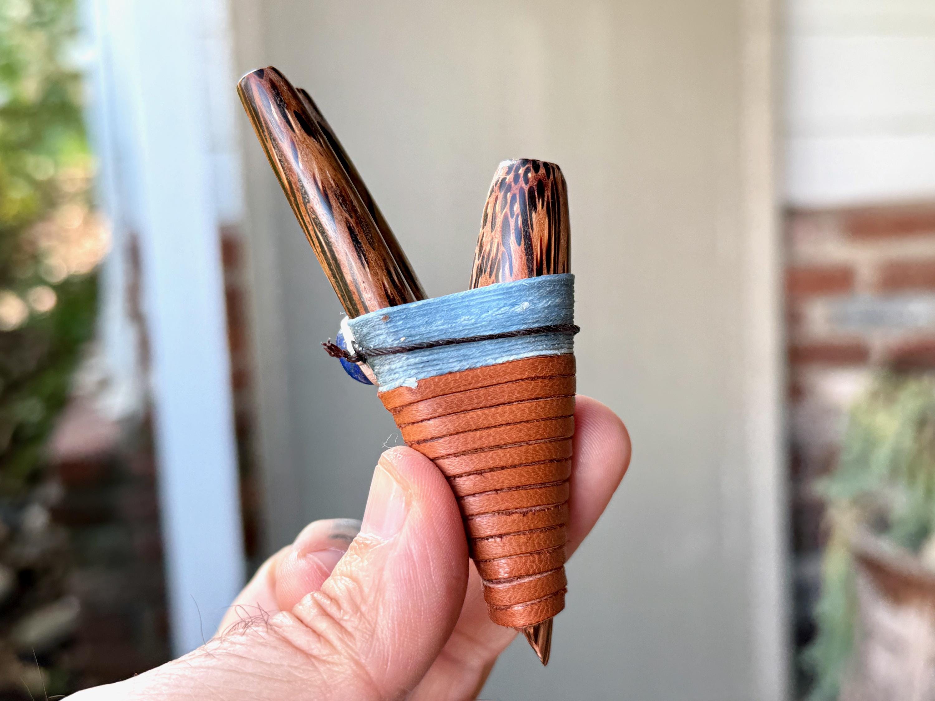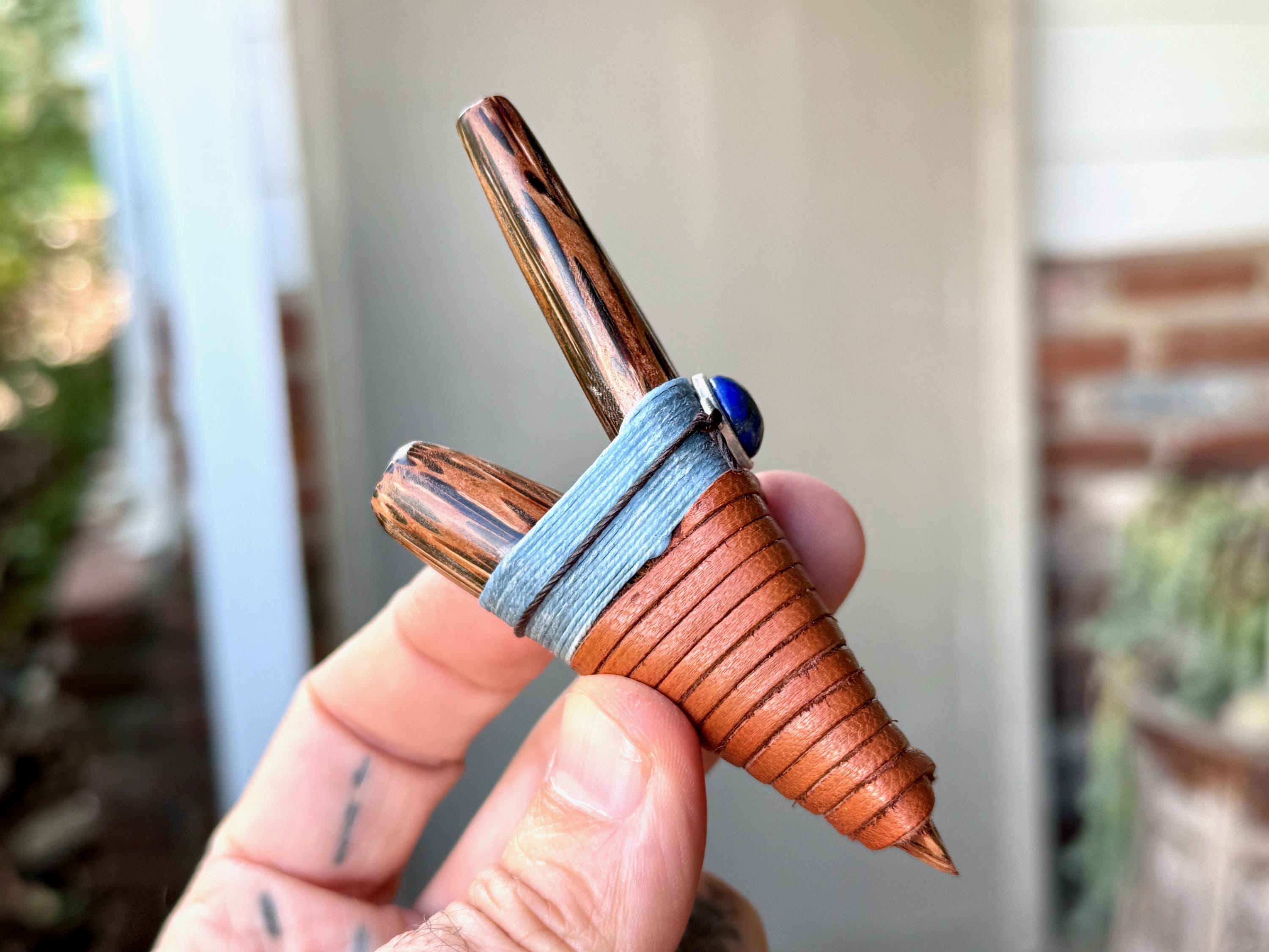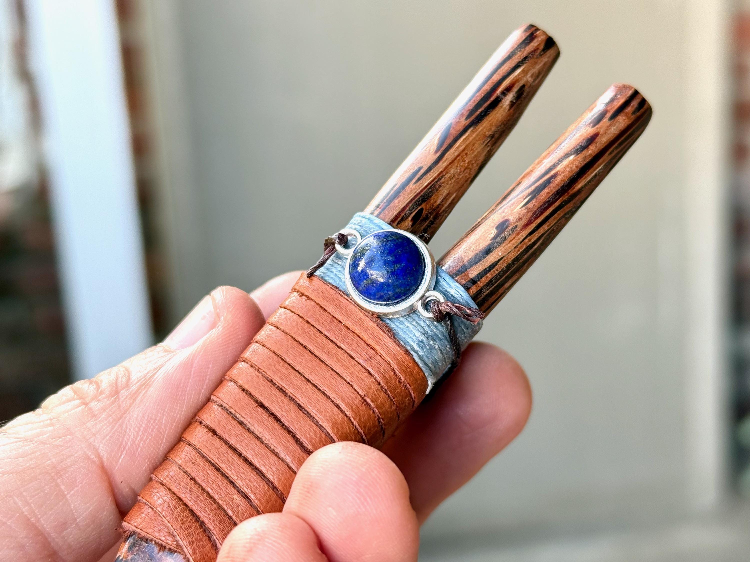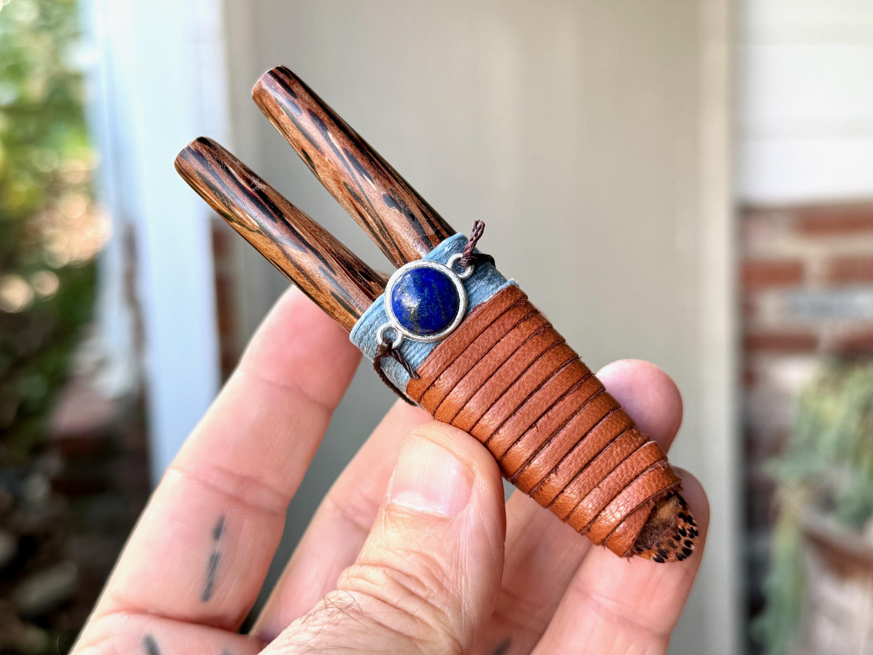 This beautiful Double Kuripe with Lapis Lazuli was handcrafted from natural Coconut Wood and adorned with leather and threaded wrapping.