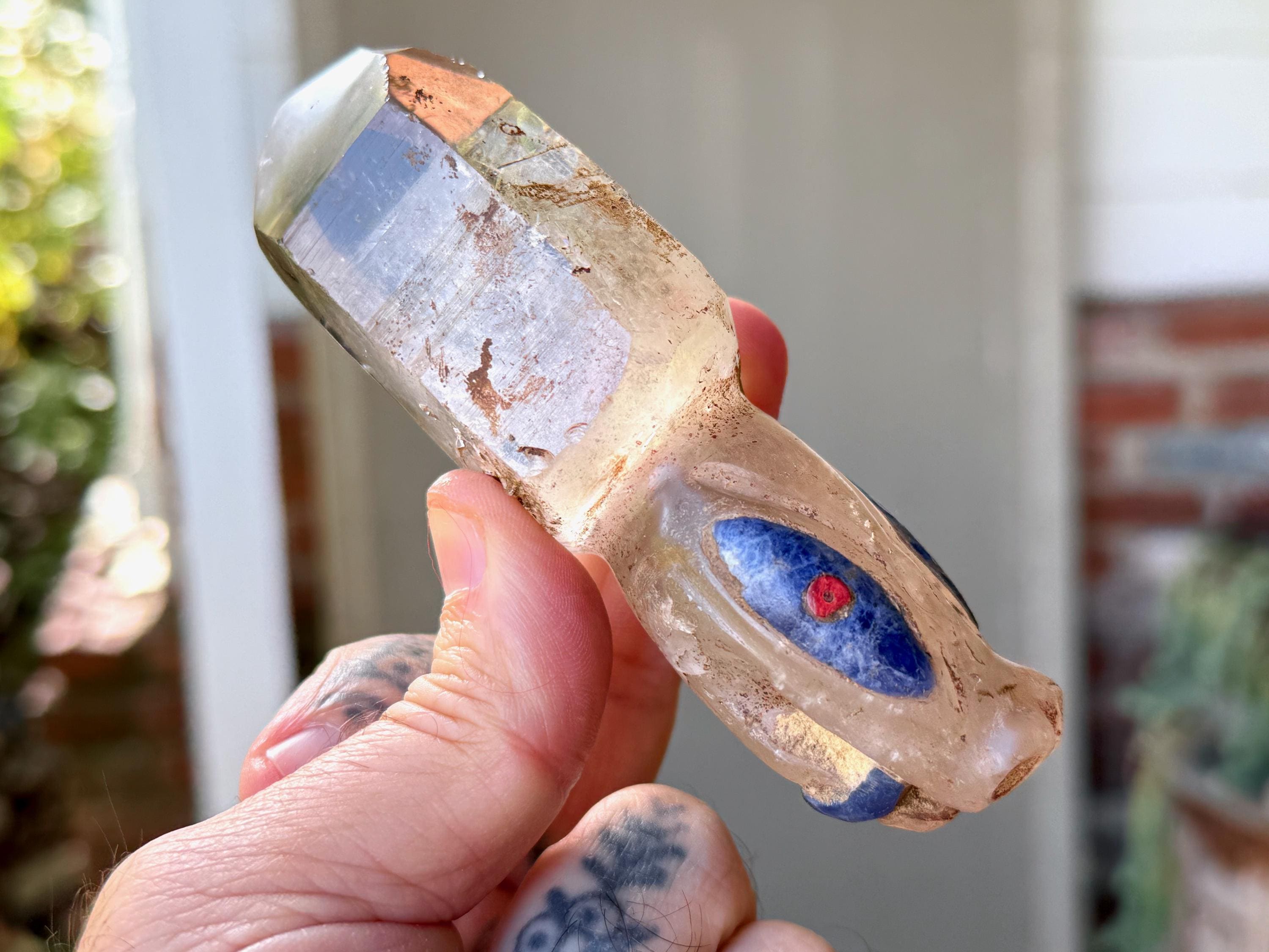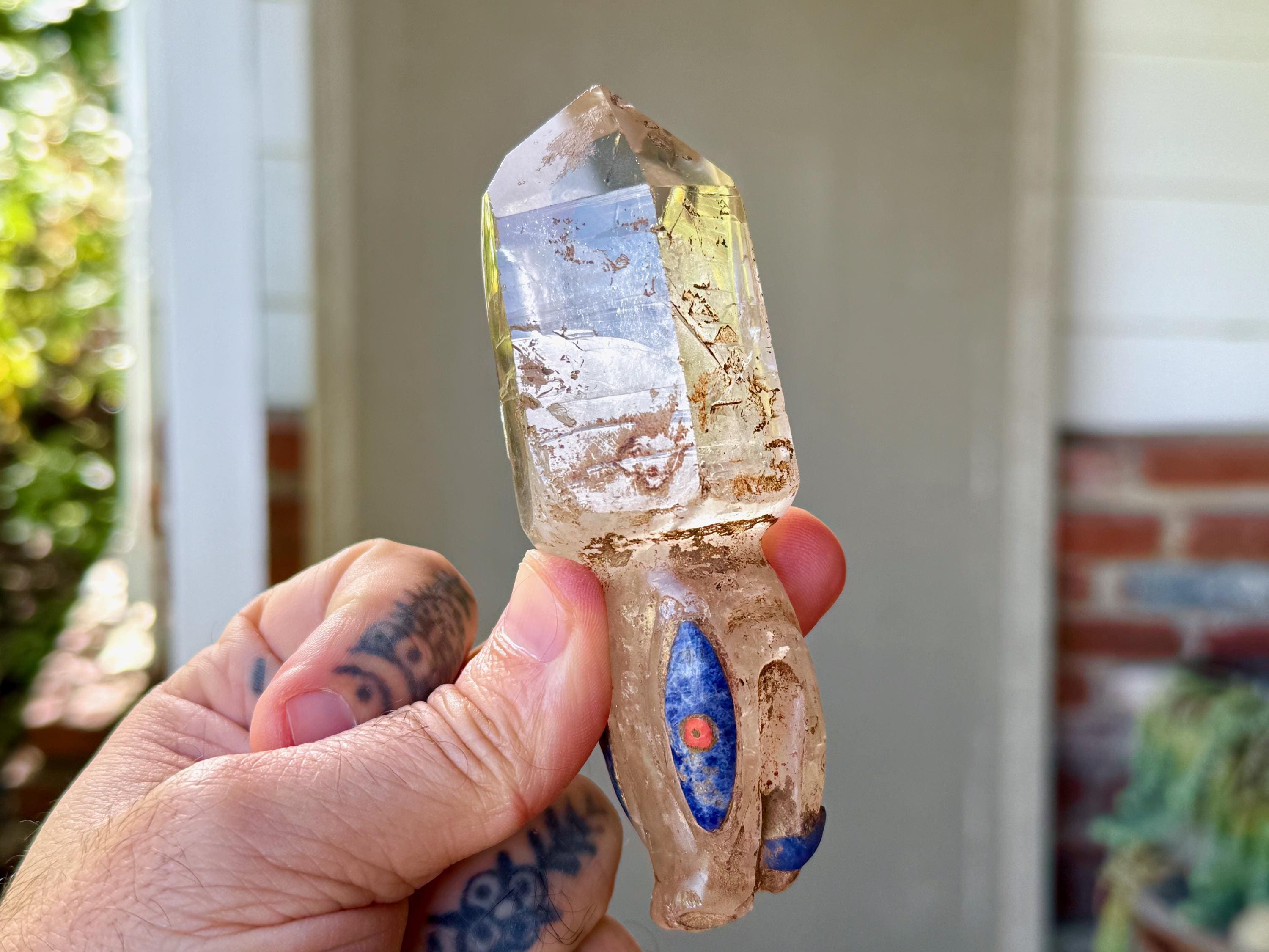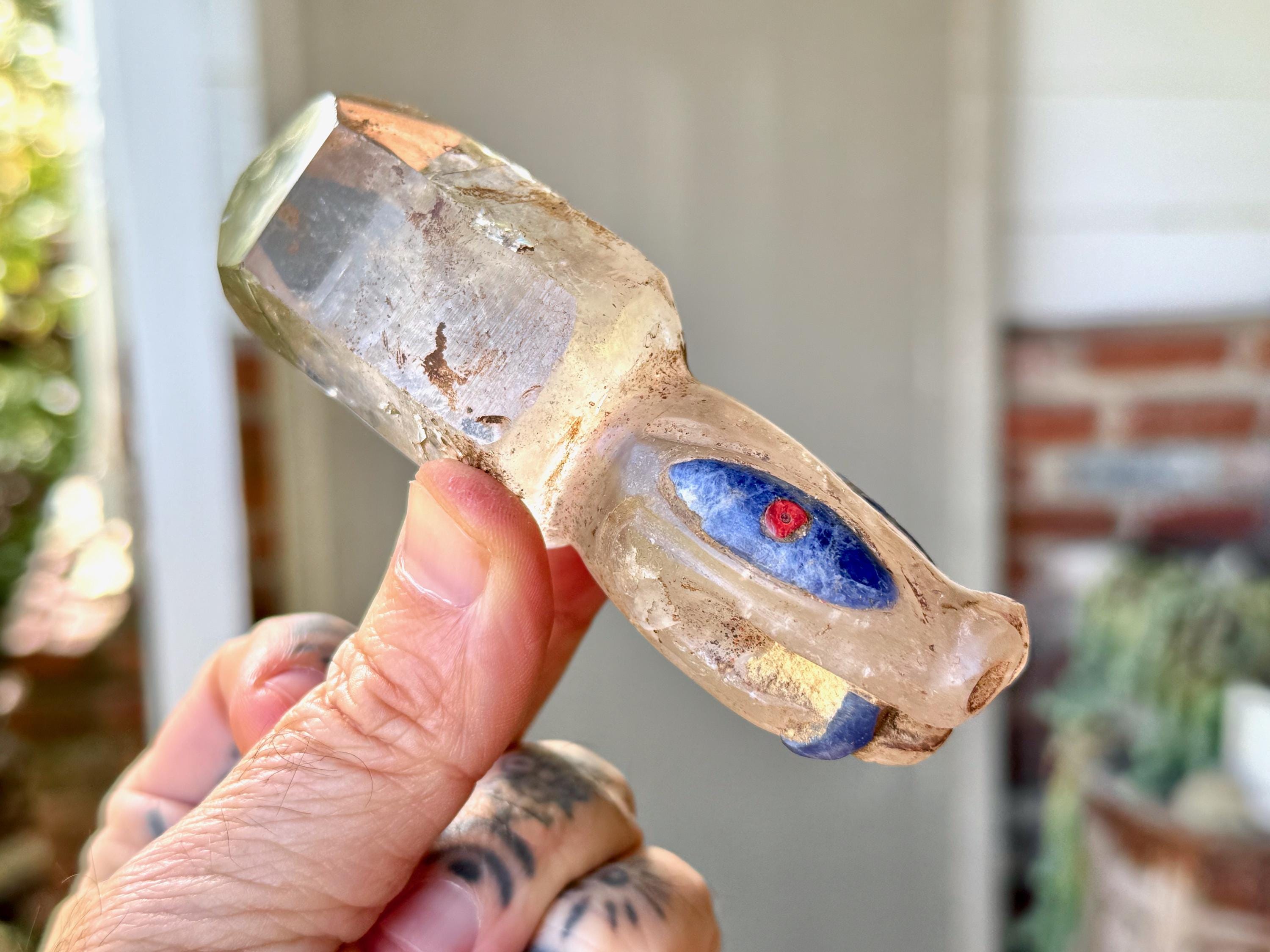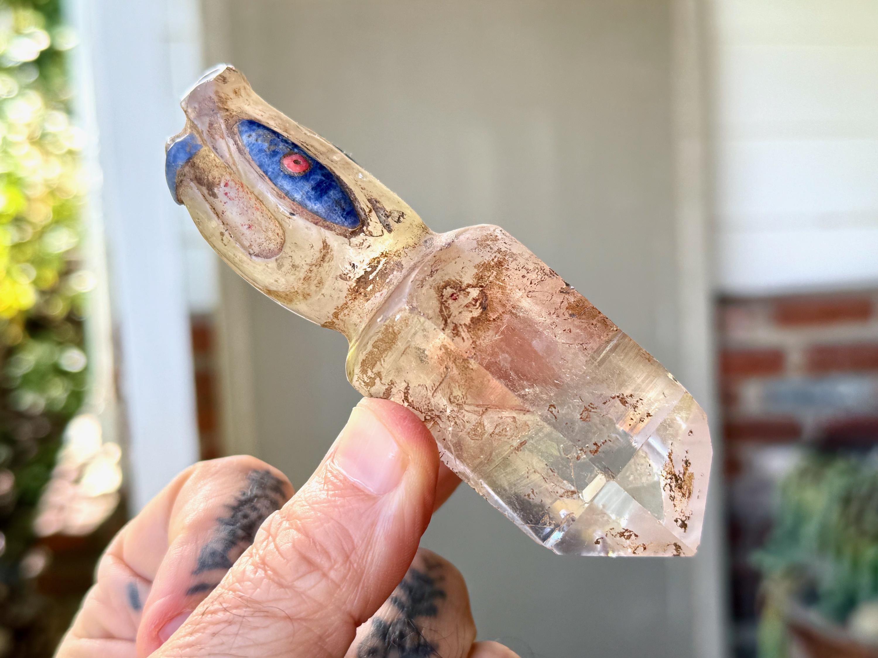 Exceptional beauty to this crystal Serpent, meticulously hand carved into the base of a water-clear, native Quartz crystal! The design is inspired by Incan artifacts found in the area surrounding Peru's Sacred Valley. Here the artist has utilized the natural formation of the Quartz and kept the "point" formation. Please note the crystal has been polished on portions of the sides and main facets. He has also used a special "weathering" process to give it an ancient looking patina.