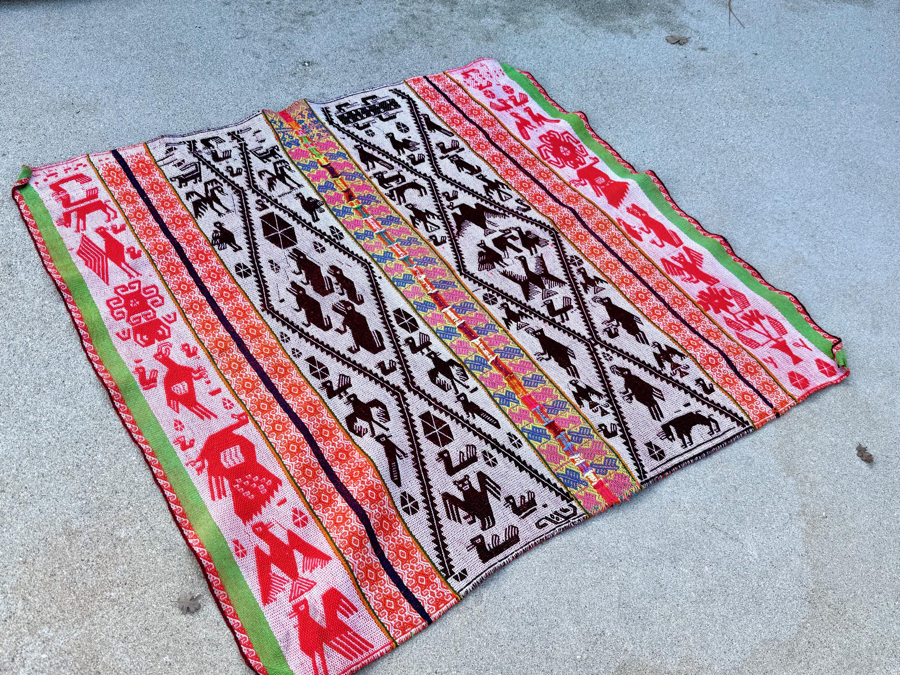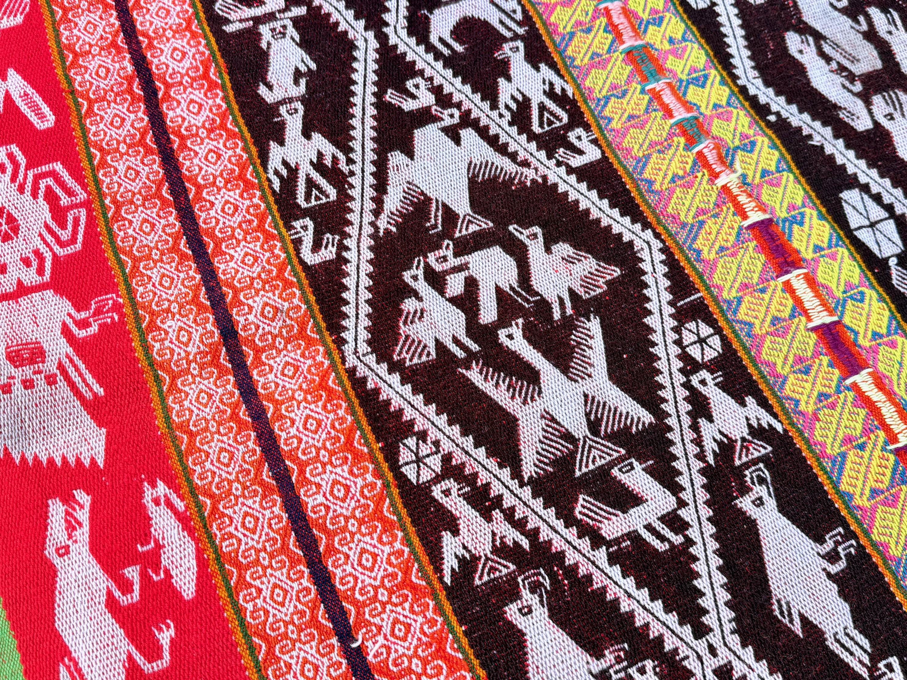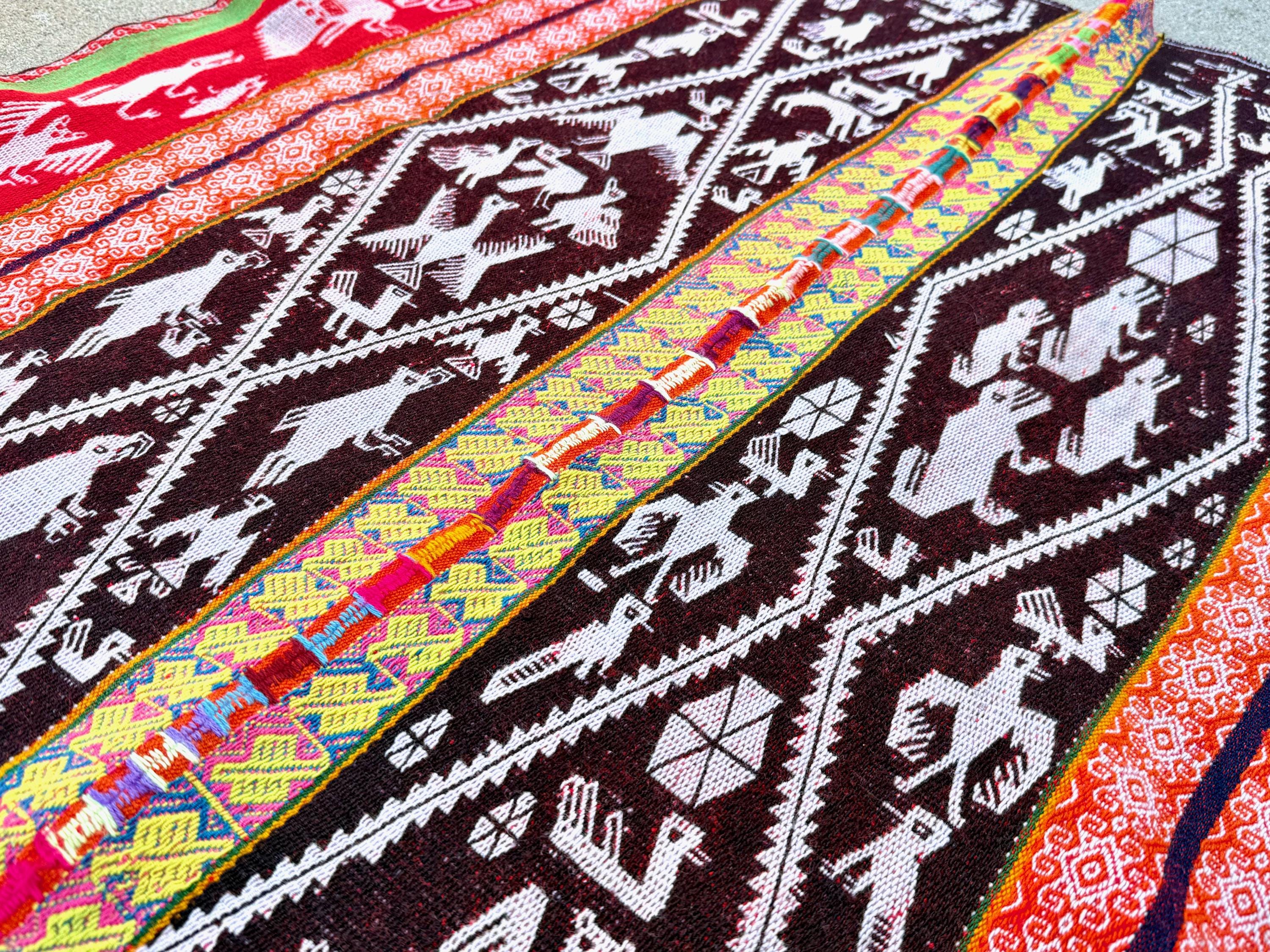 This manta is one of the largest we're currently offering and one of the finest. It checks all the boxes for what we love to see in these vintage mantas: vibrant colors, an extremely high level of artisanship, wonderful condition, and subject matter that is intriguing and characteristic of the region and its traditions.