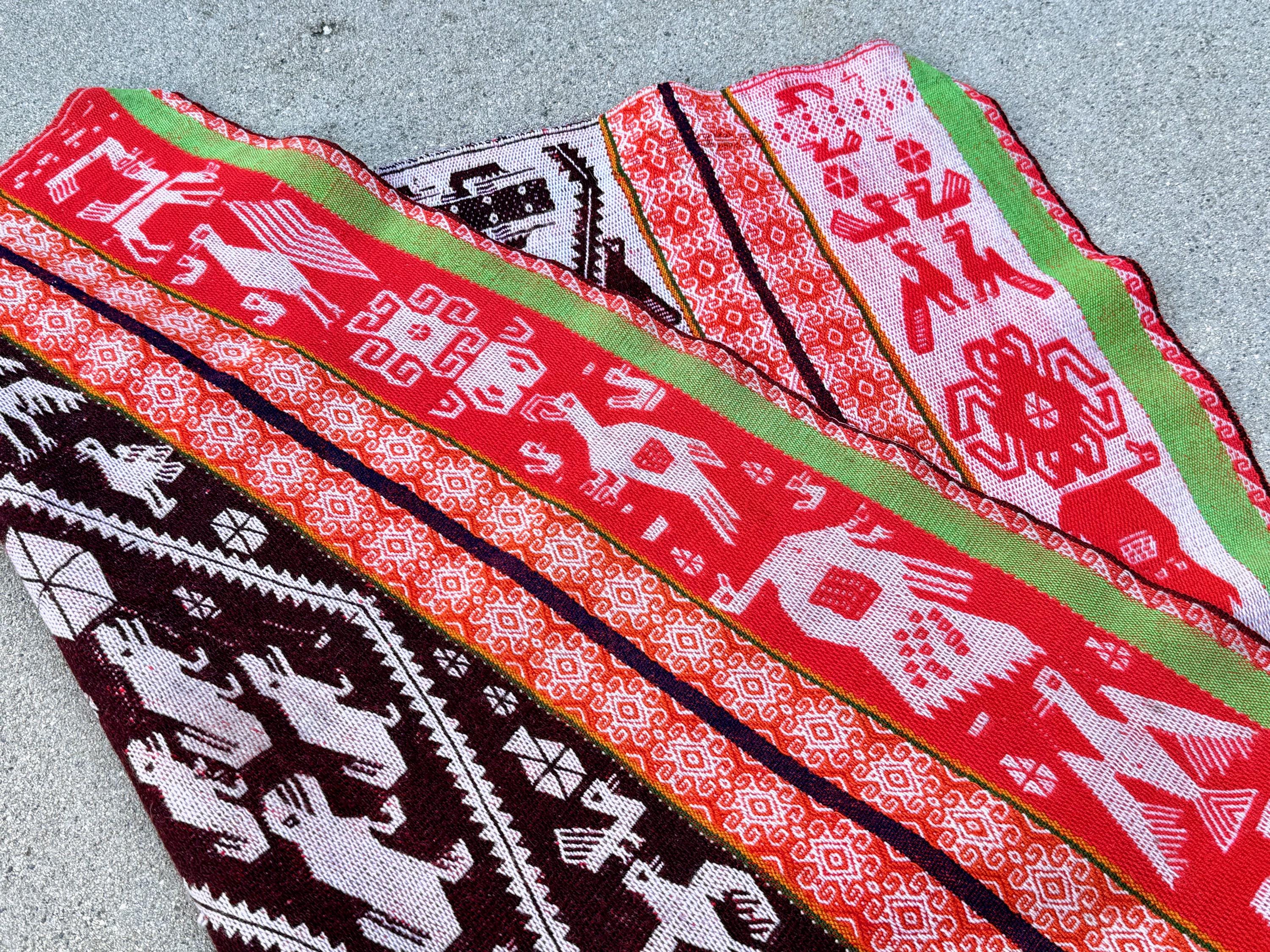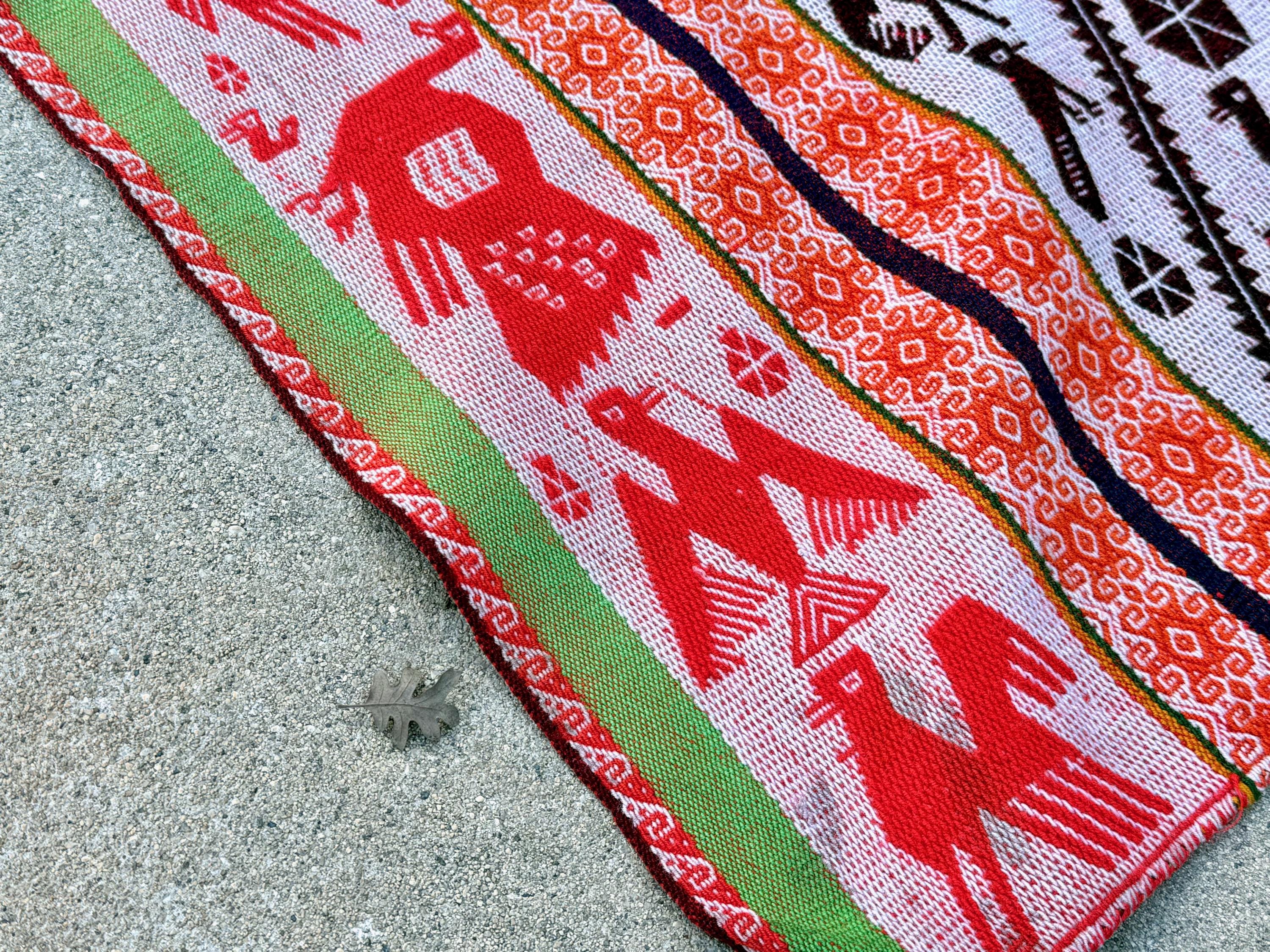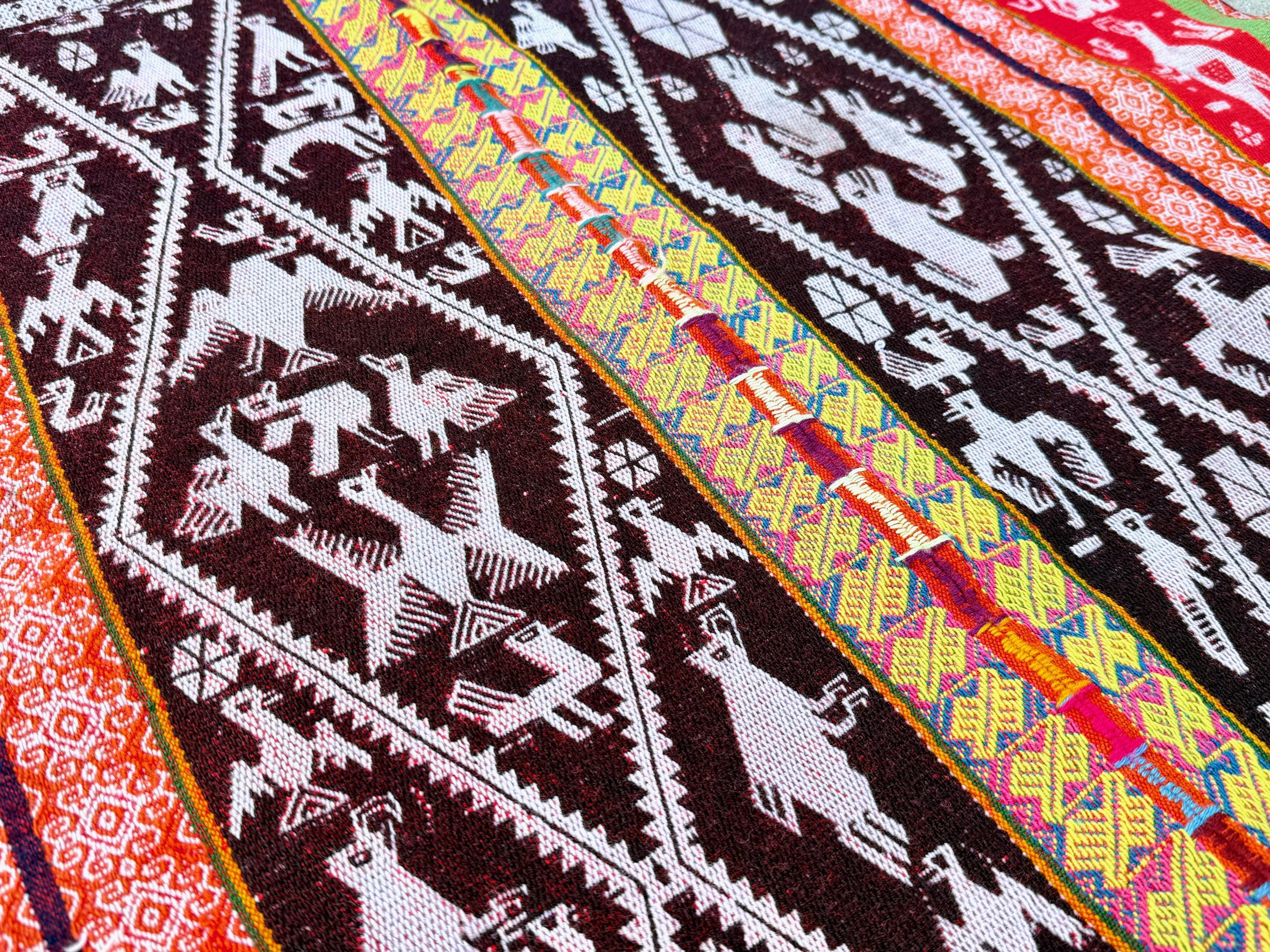 This manta is one of the largest we're currently offering and one of the finest. It checks all the boxes for what we love to see in these vintage mantas: vibrant colors, an extremely high level of artisanship, wonderful condition, and subject matter that is intriguing and characteristic of the region and its traditions.