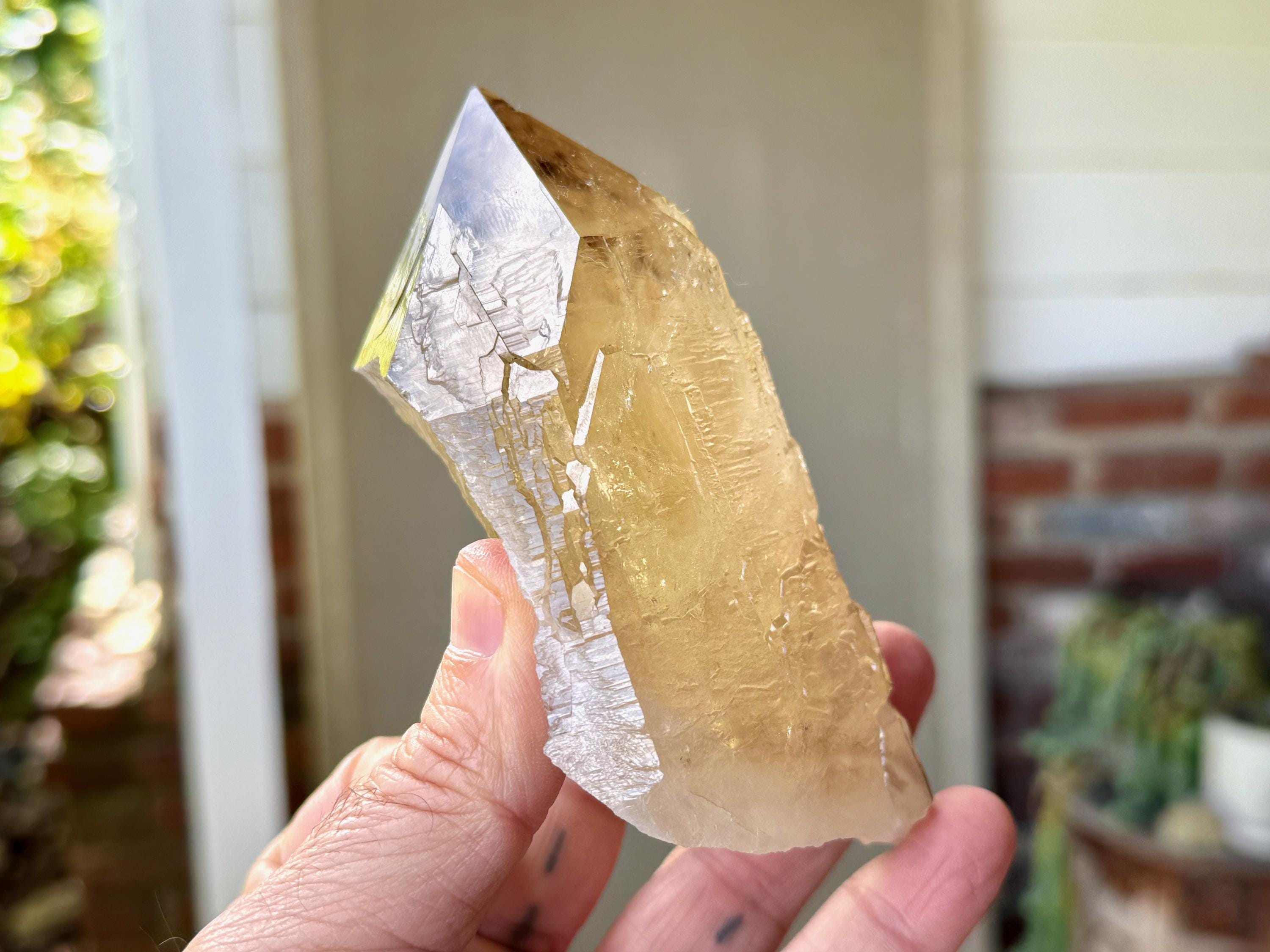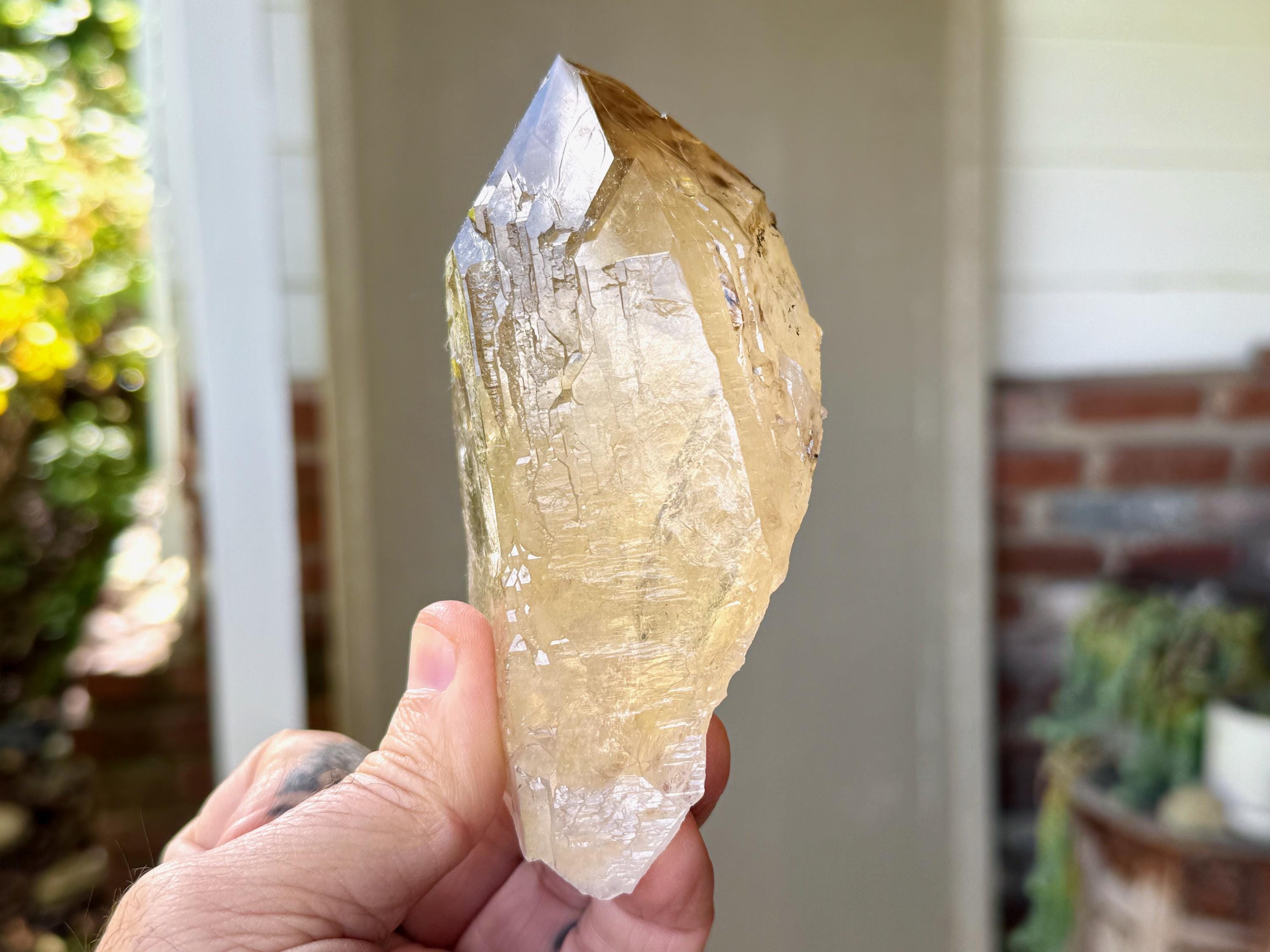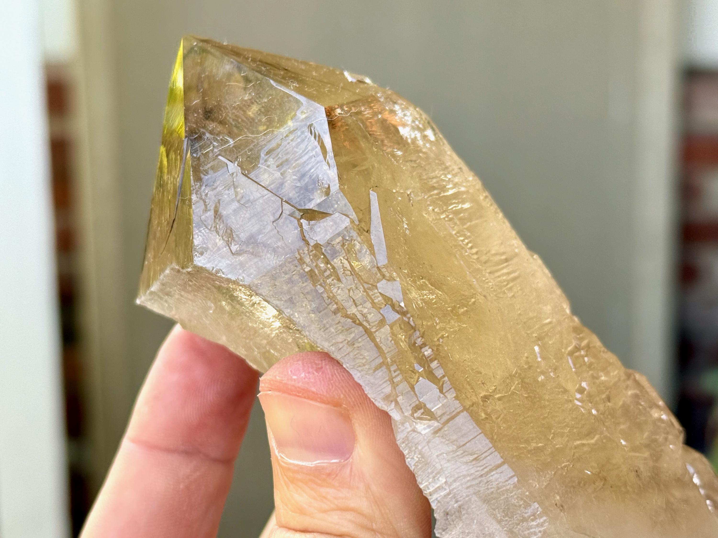 This natural Elestial Citrine crystal comes from a recent find in the Aracuai region of Minas Gerais, Brazil. Citrine activates, opens, and energizes the Solar Plexus and Navel Chakras, releasing personal power, creativity and most importantly the ability to manifest.