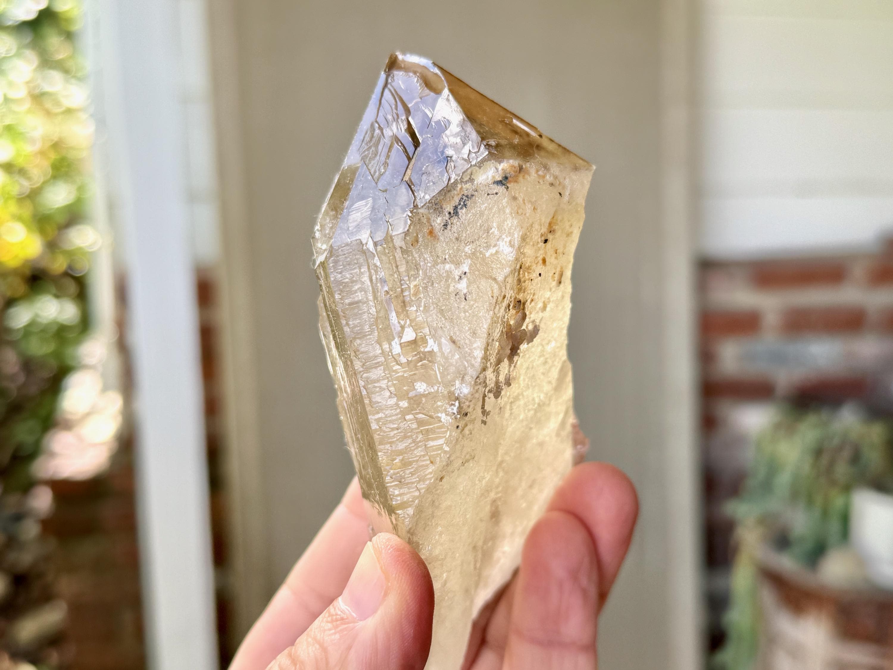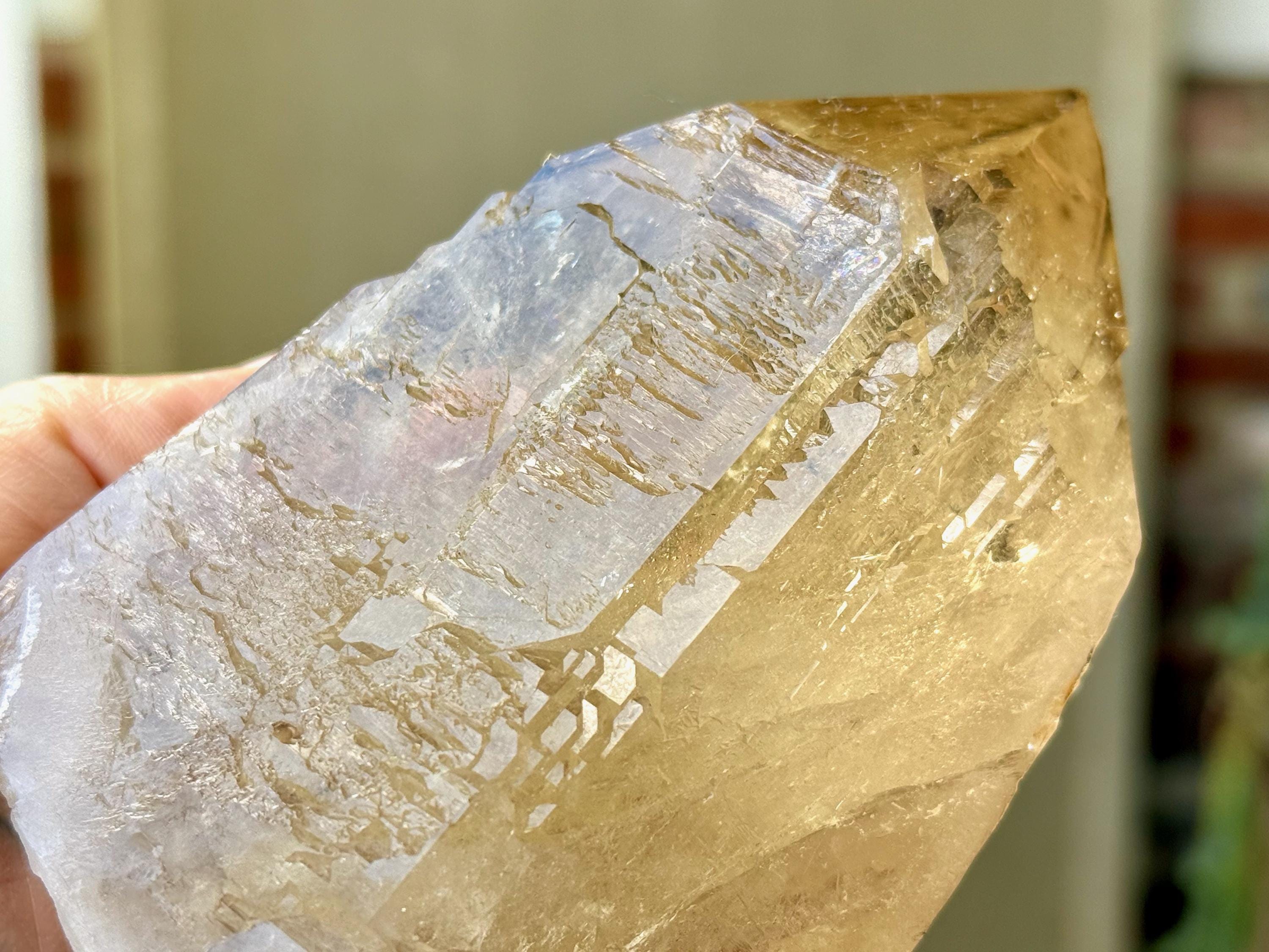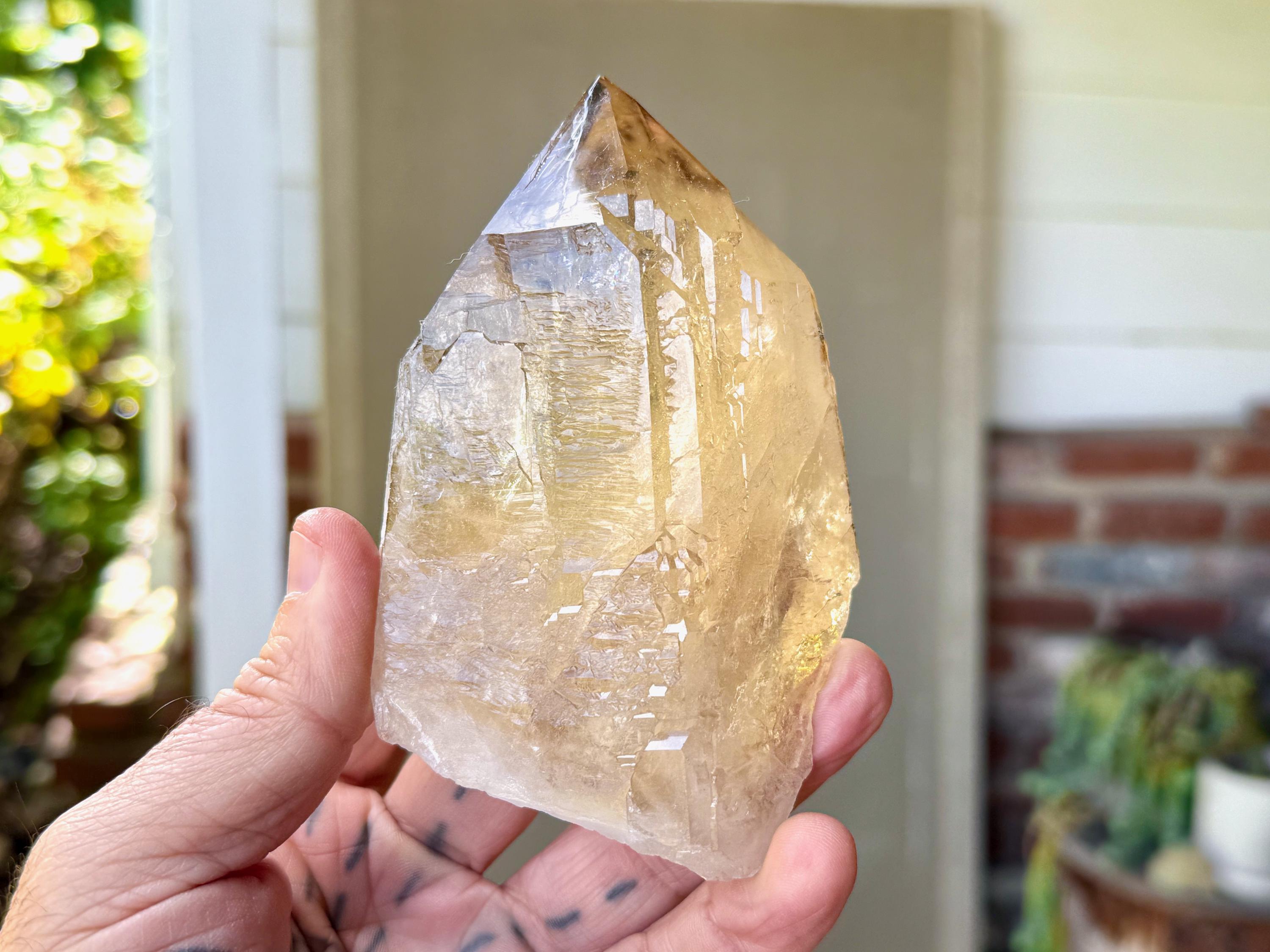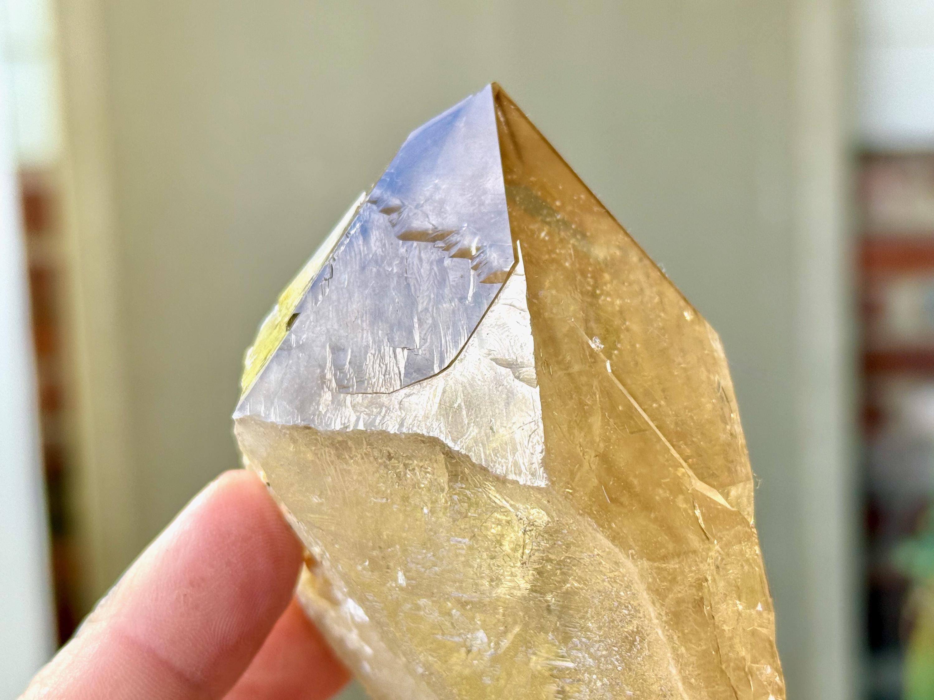 This natural Elestial Citrine crystal comes from a recent find in the Aracuai region of Minas Gerais, Brazil. Citrine activates, opens, and energizes the Solar Plexus and Navel Chakras, releasing personal power, creativity and most importantly the ability to manifest.