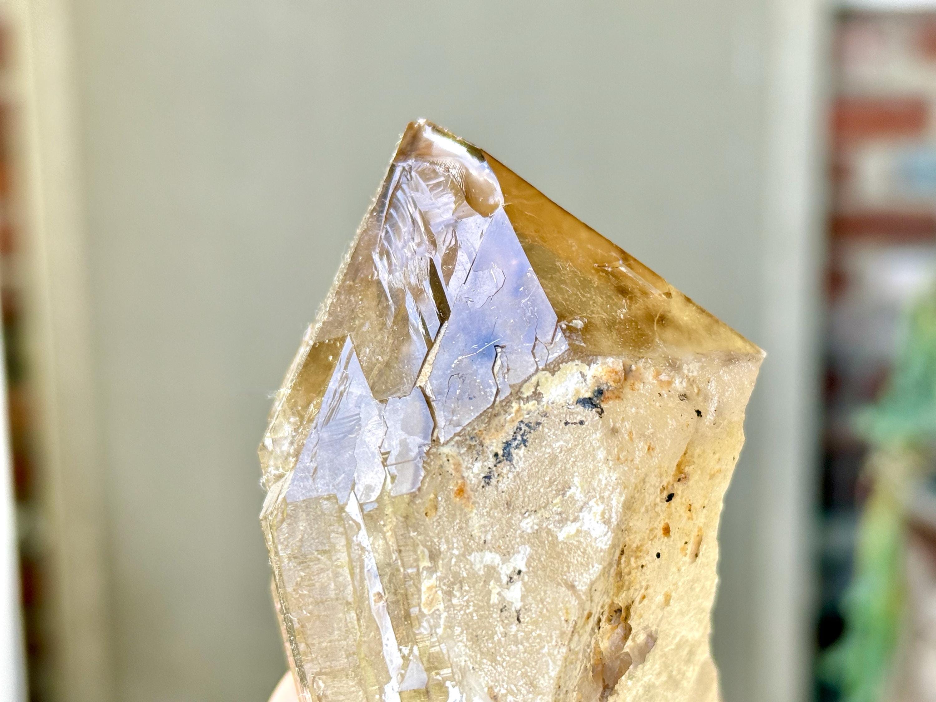 This is a bit of an Elestial/Cathedral hybrid, as we do see signs of cathedralization in the lower portion of the main facet area, with the first signs of individual "spires" and barcode-like textures. The main facet area is marvelously clear and you will find some flashing rainbows here in low light. We love the smoky "hot spots" on the back left facet.