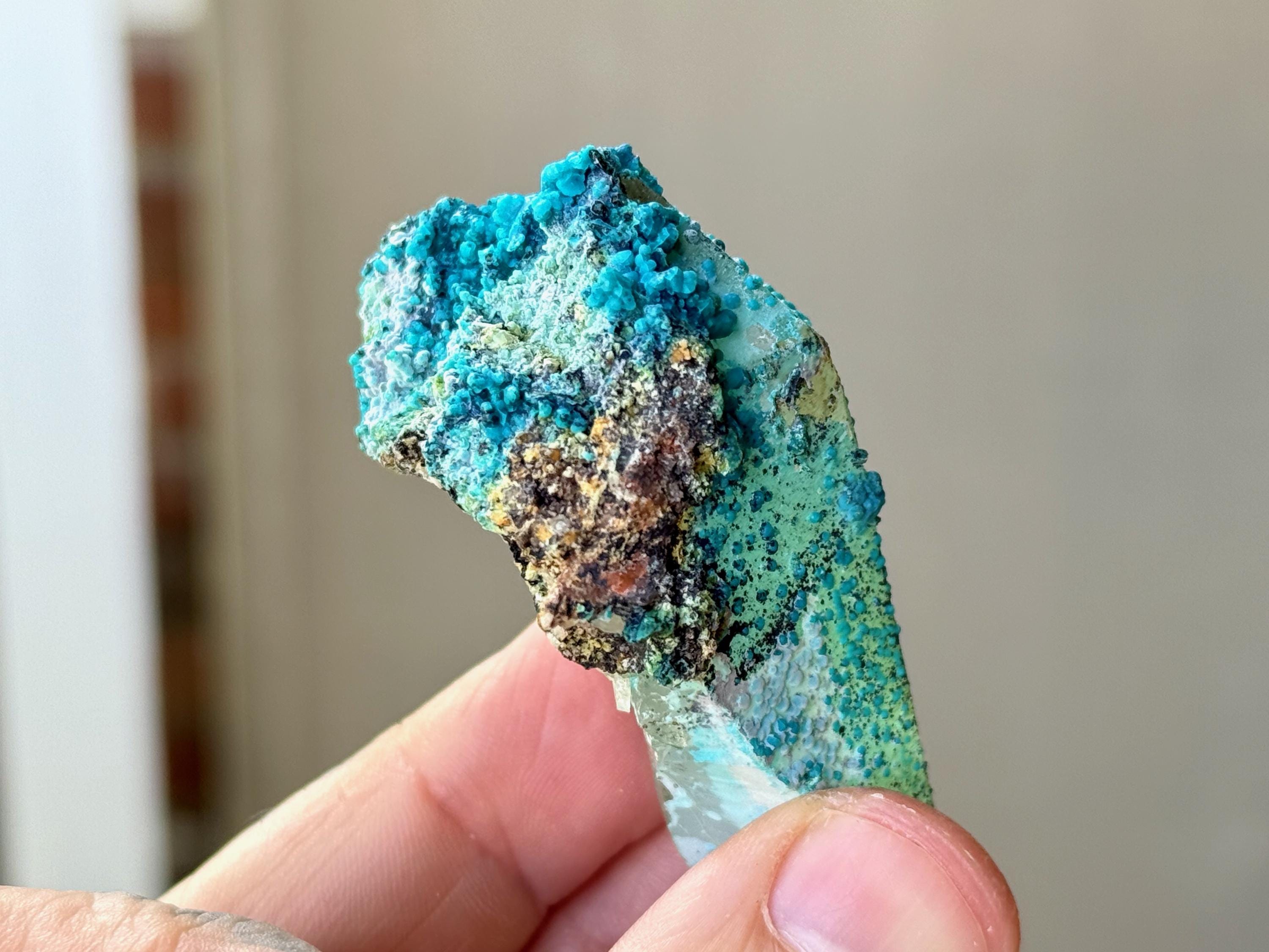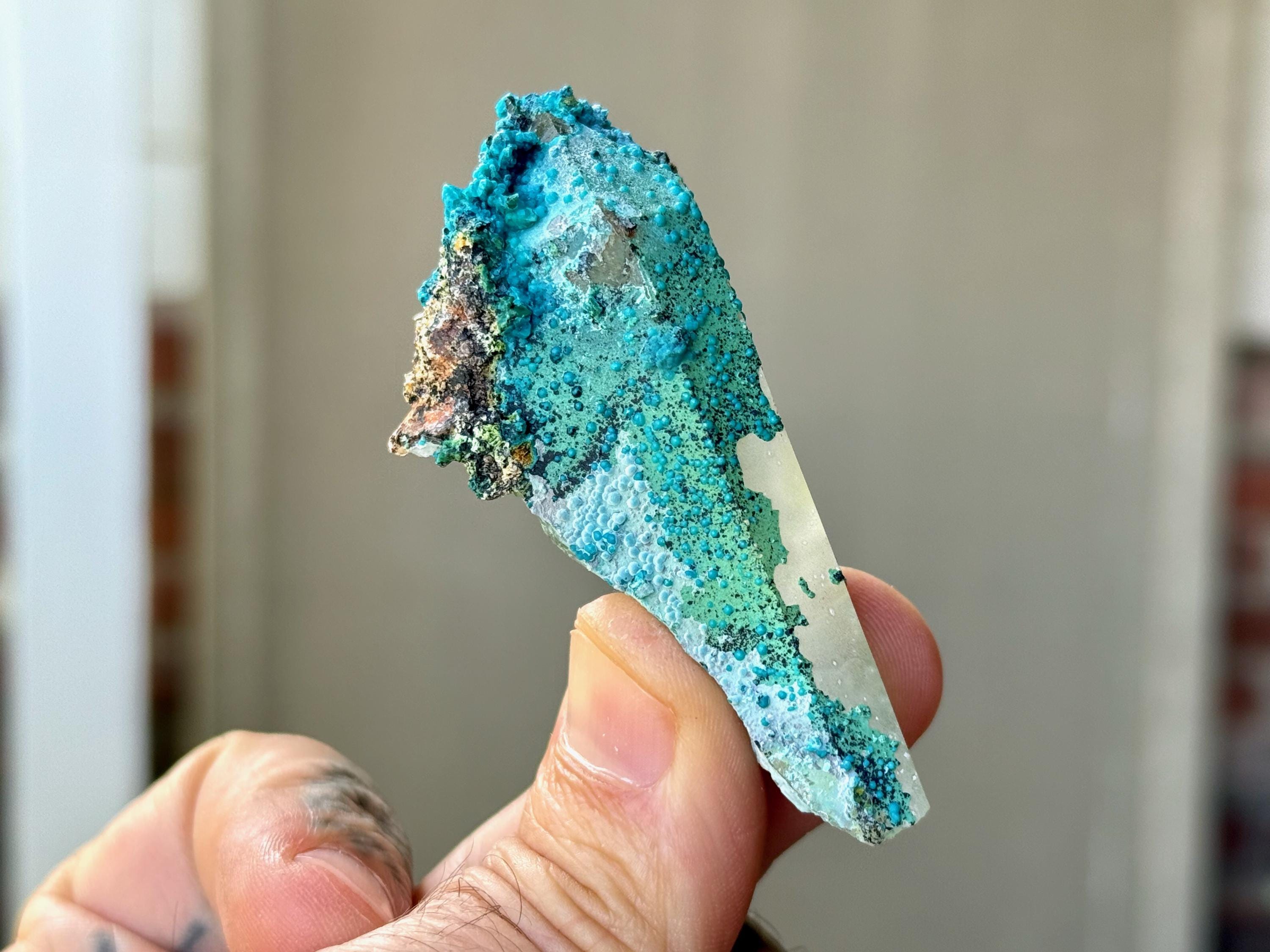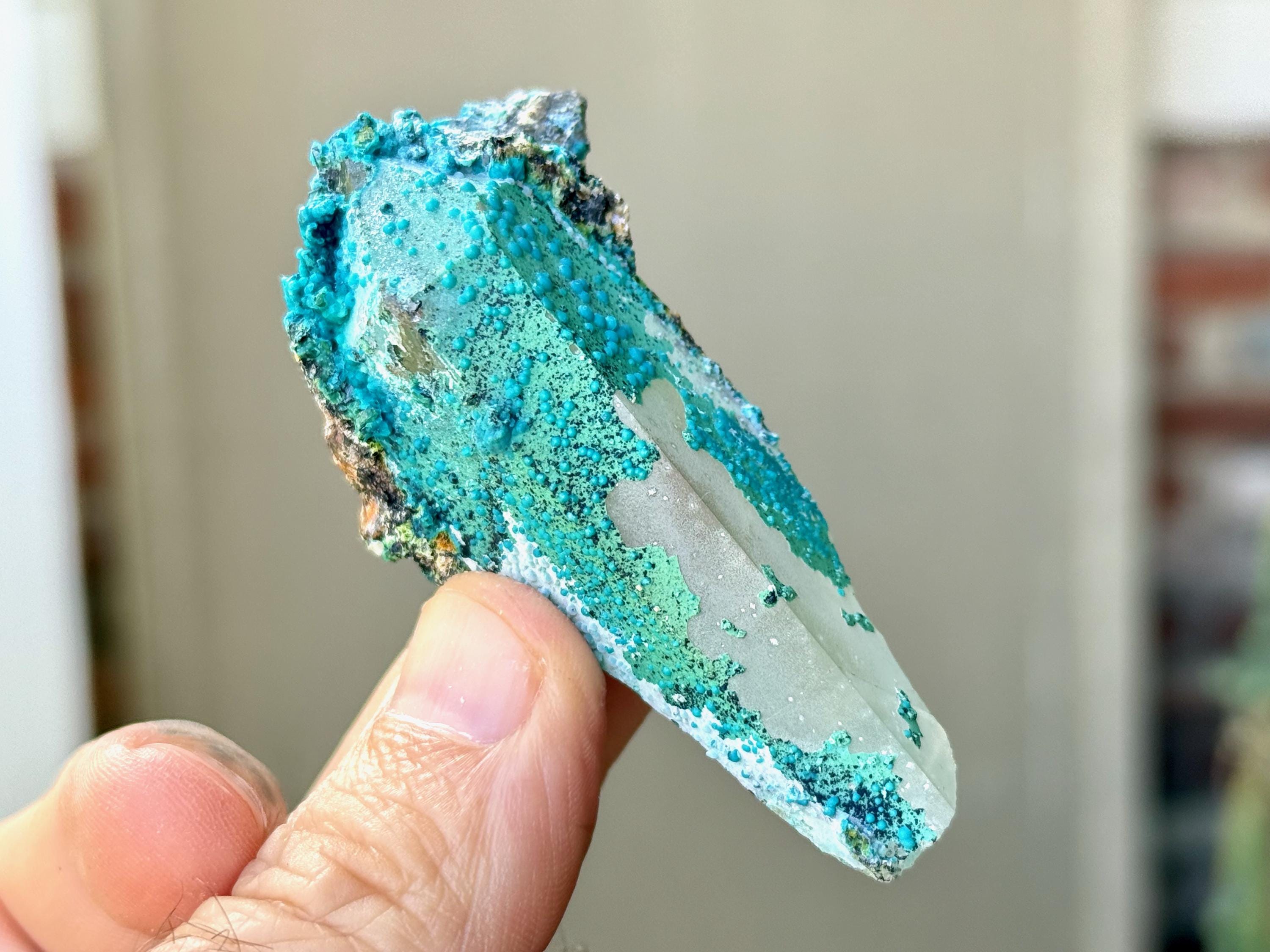 Vibrant teal blue hues to this exquisite Chrysocolla Quartz crystal! This crystal features a fully formed Quartz point with a frosting of Chrysocolla covering most of its body. At the top, there is a larger Chrysocolla inclusion attached, that likely also includes Limonite as well. We love the tiny, "bubbly" botryoidal forms we see throughout much of this piece!