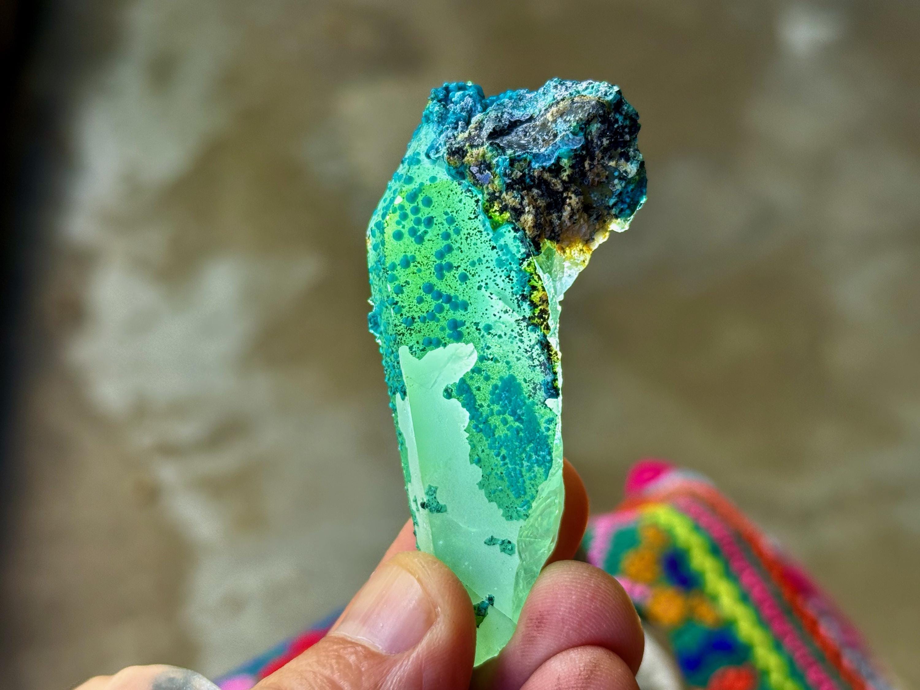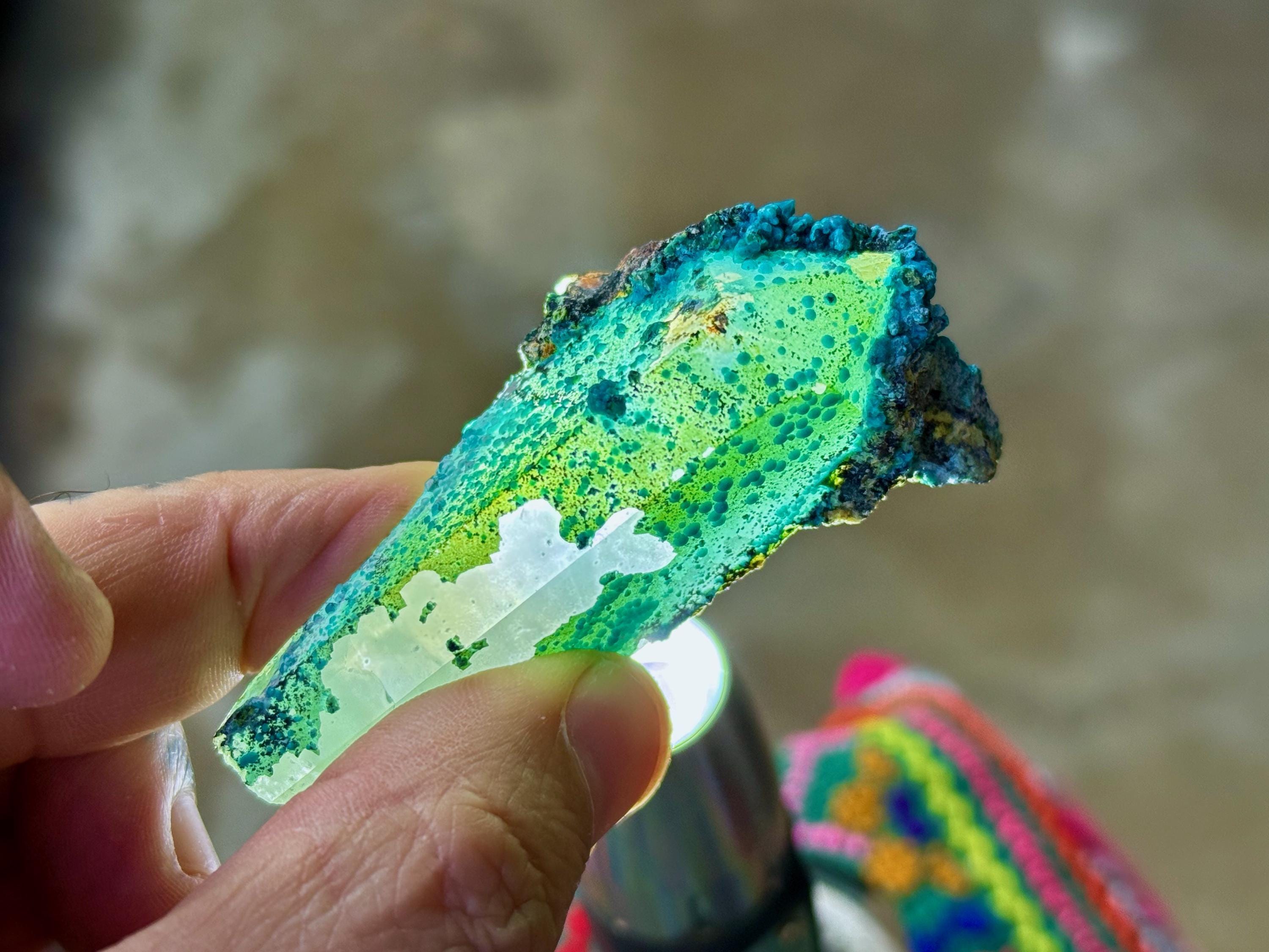 This superb Chrysocolla Quartz comes from a recent find in the famed Tentadora Mine, Tricapo District, Huancavelica, Peru. Chrysocolla is considered to be one of the most powerful communication crystals, encouraging self-expression, empowerment and compassion.